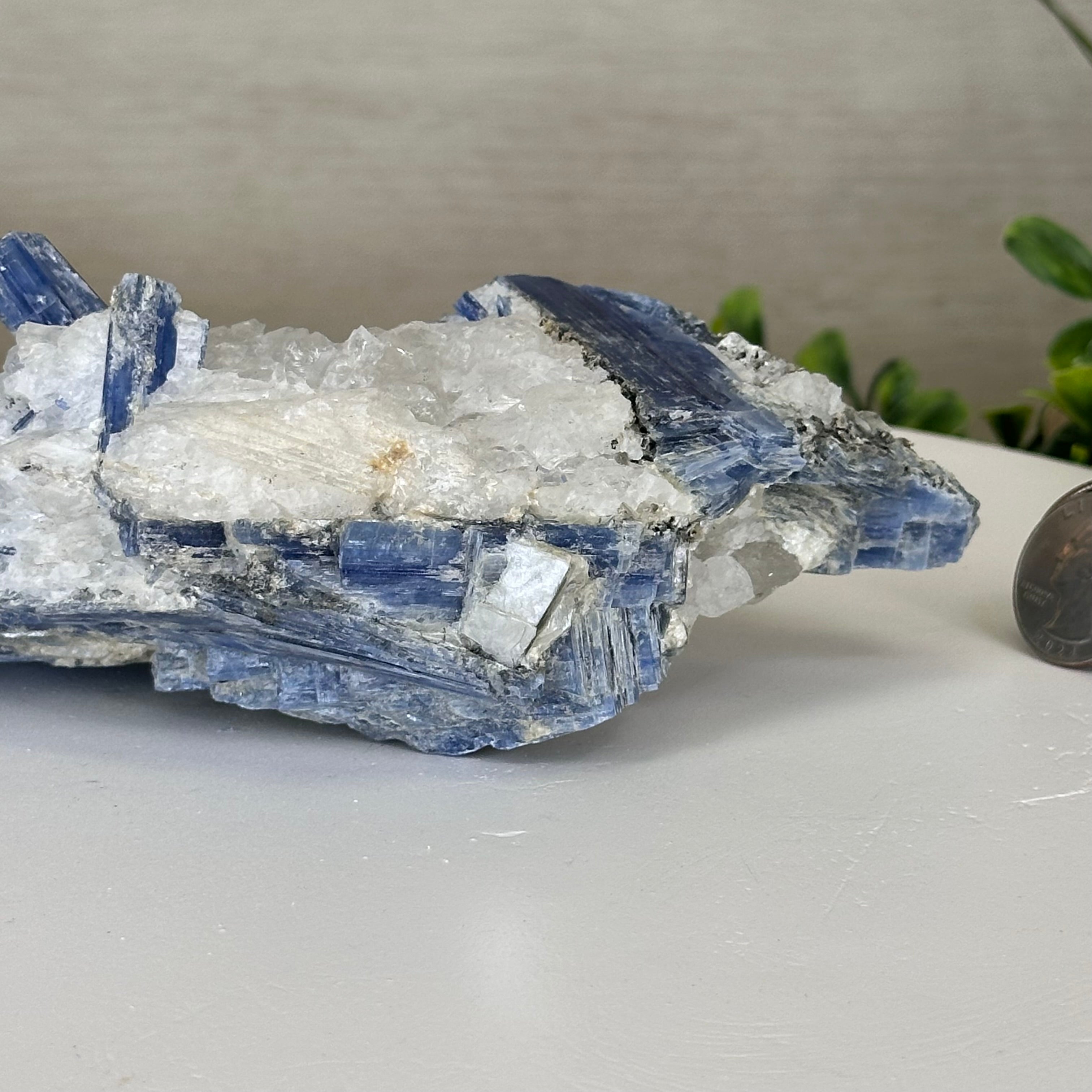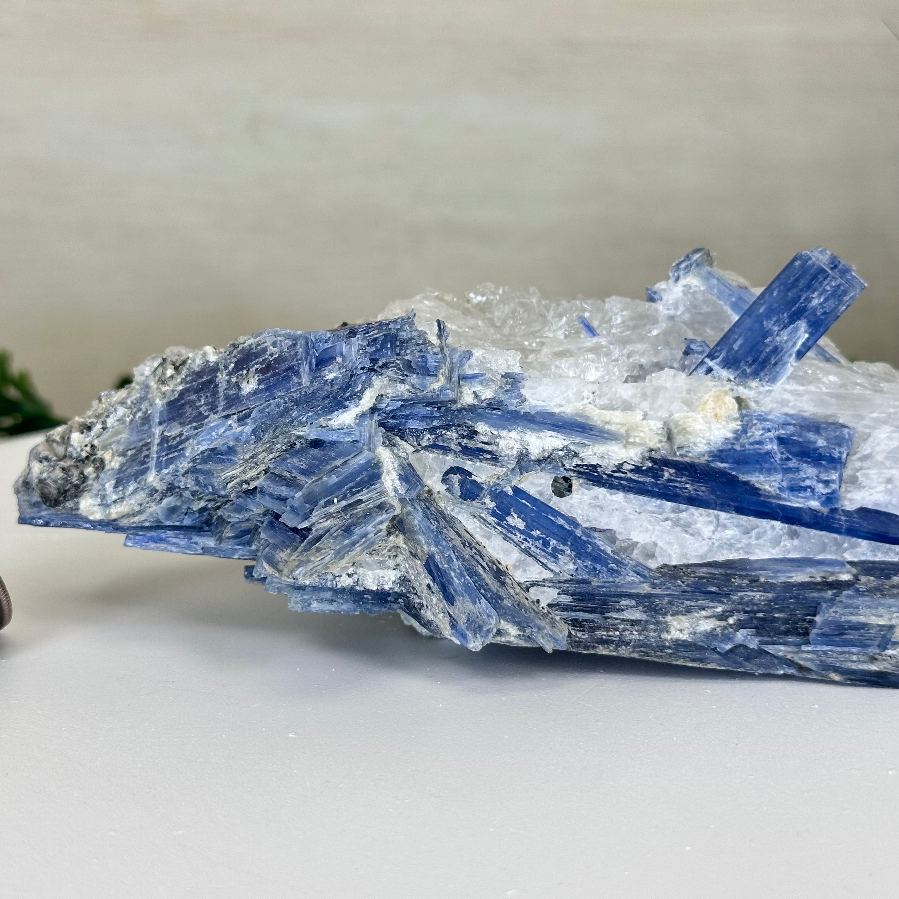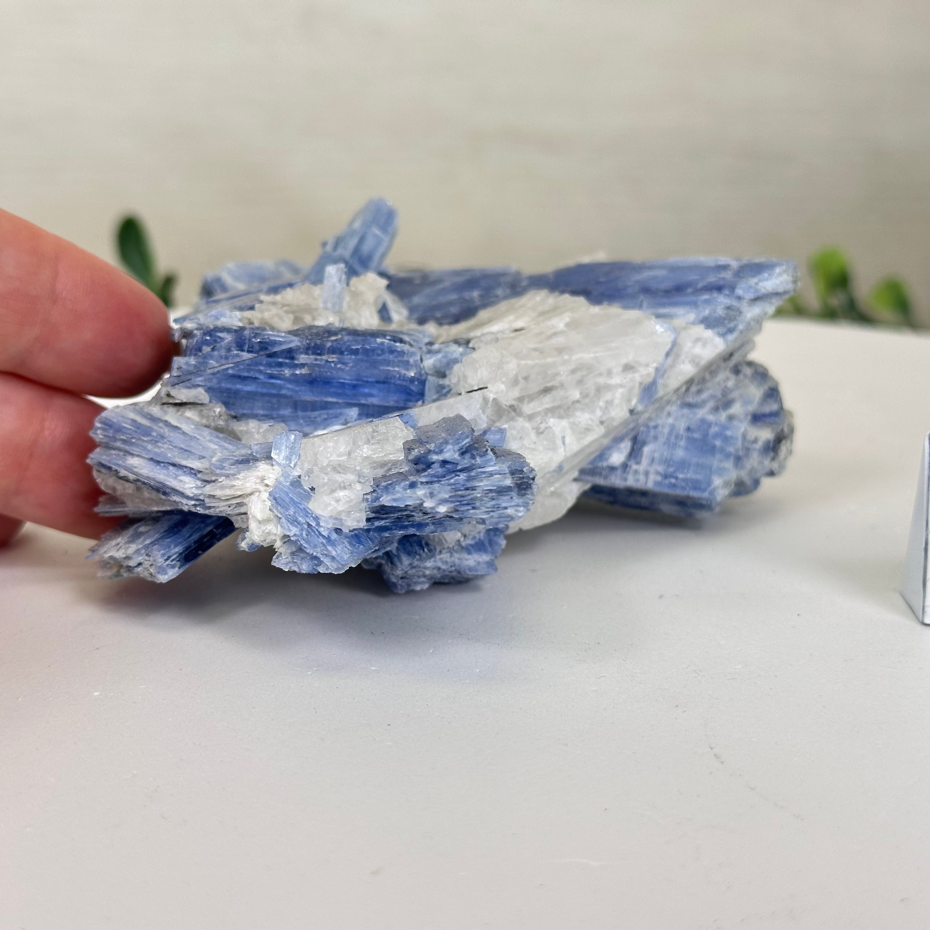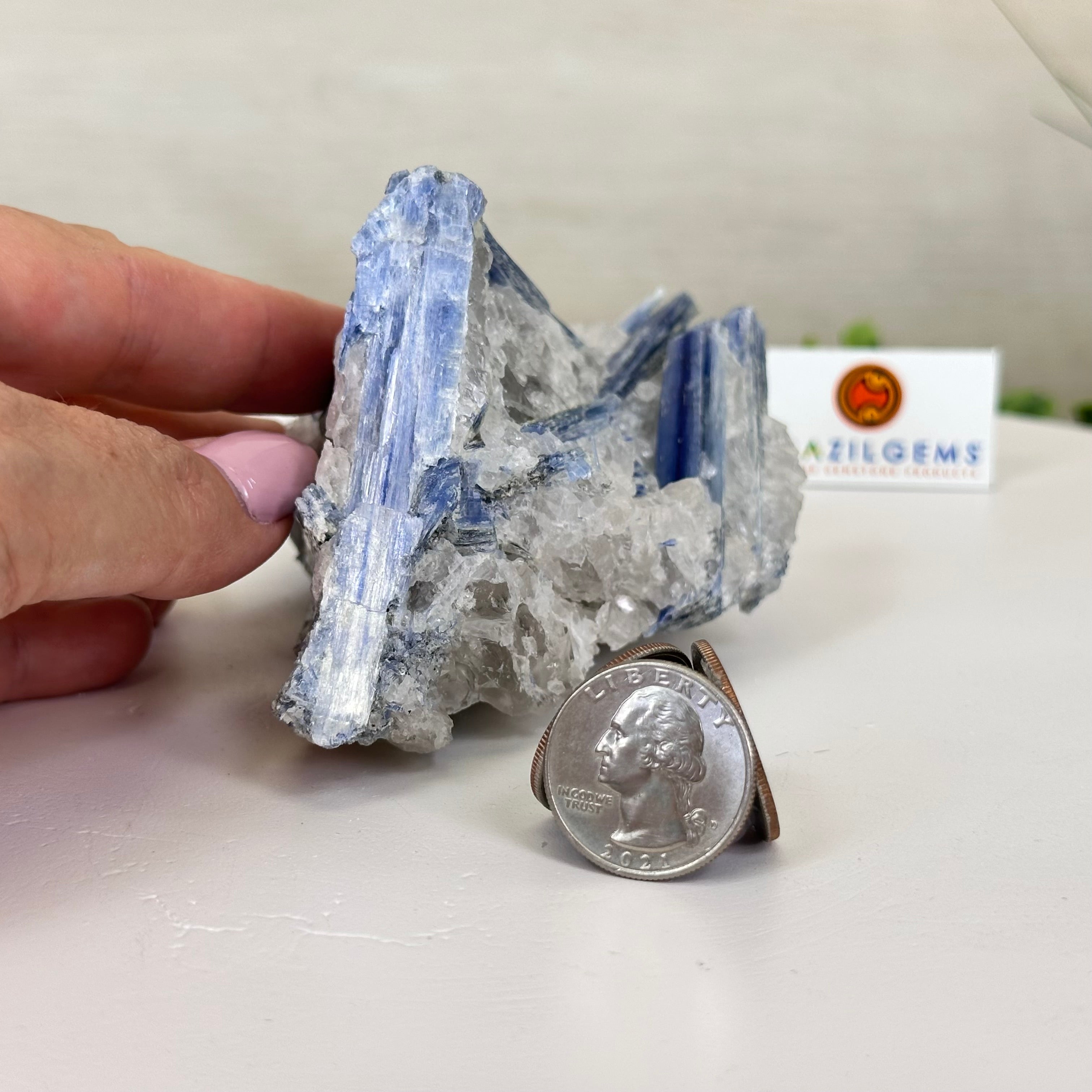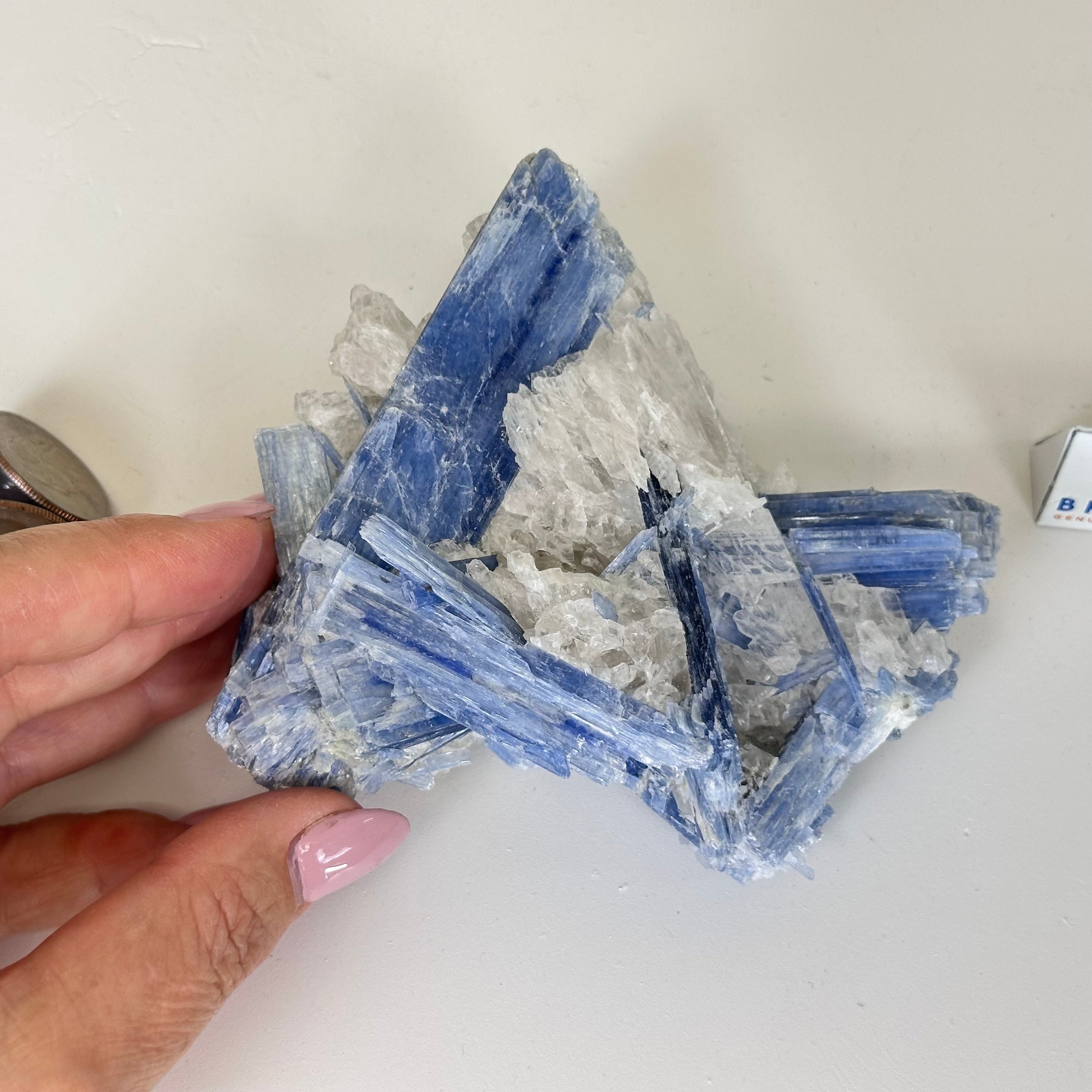 Kyanite clusters, characterized by their vivid blue hues and distinctive blade-like crystal formations, serve as striking natural accents in home décor.