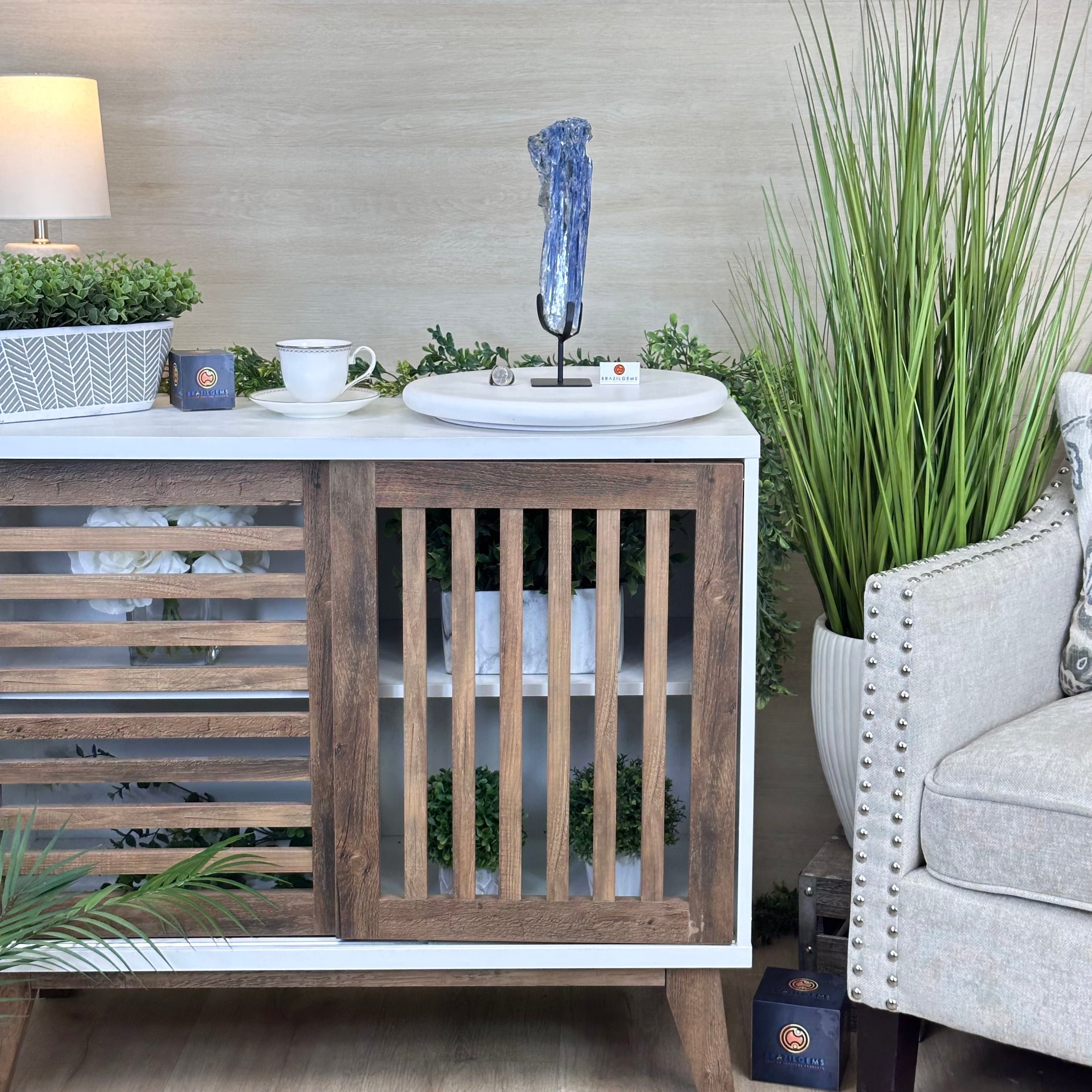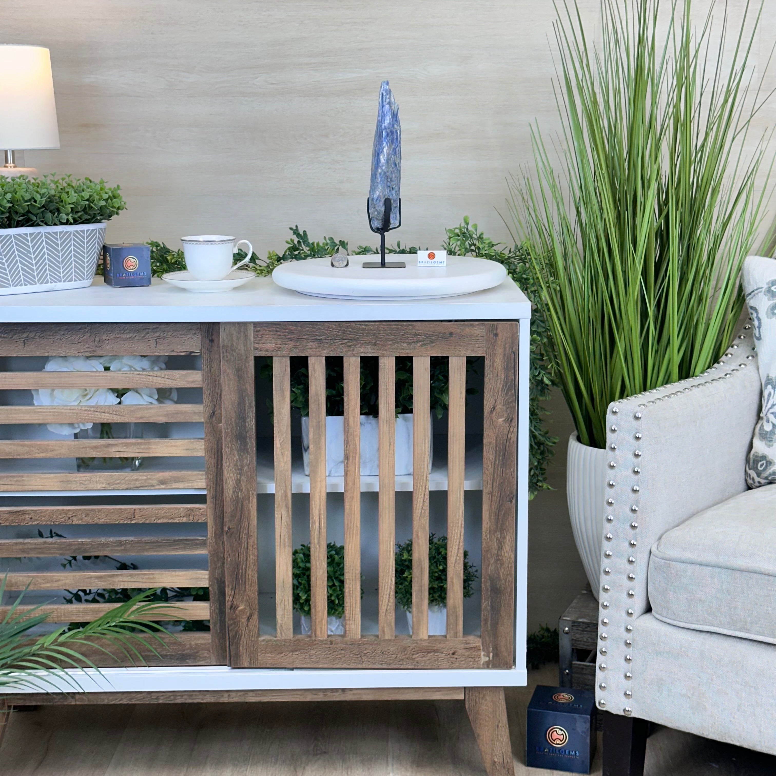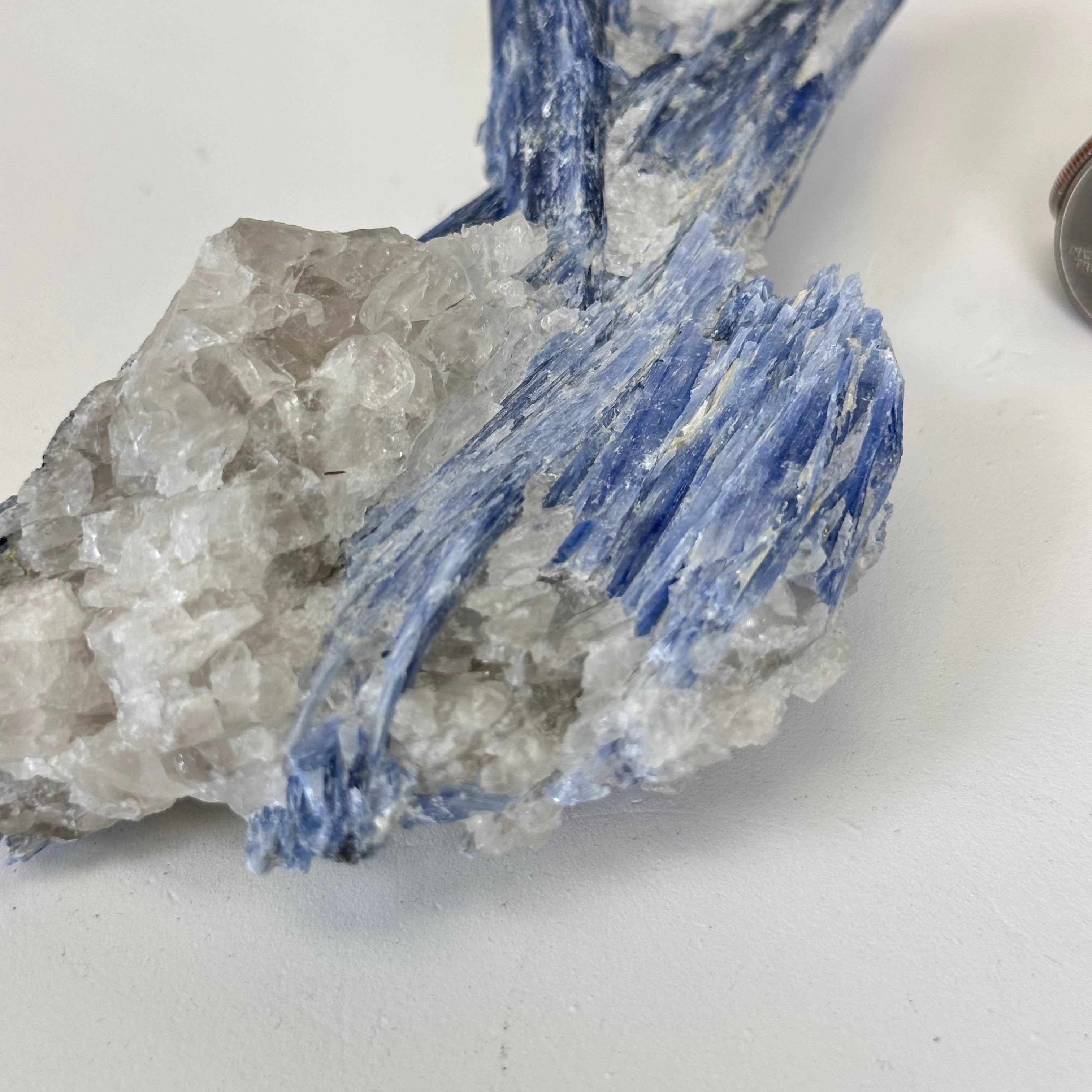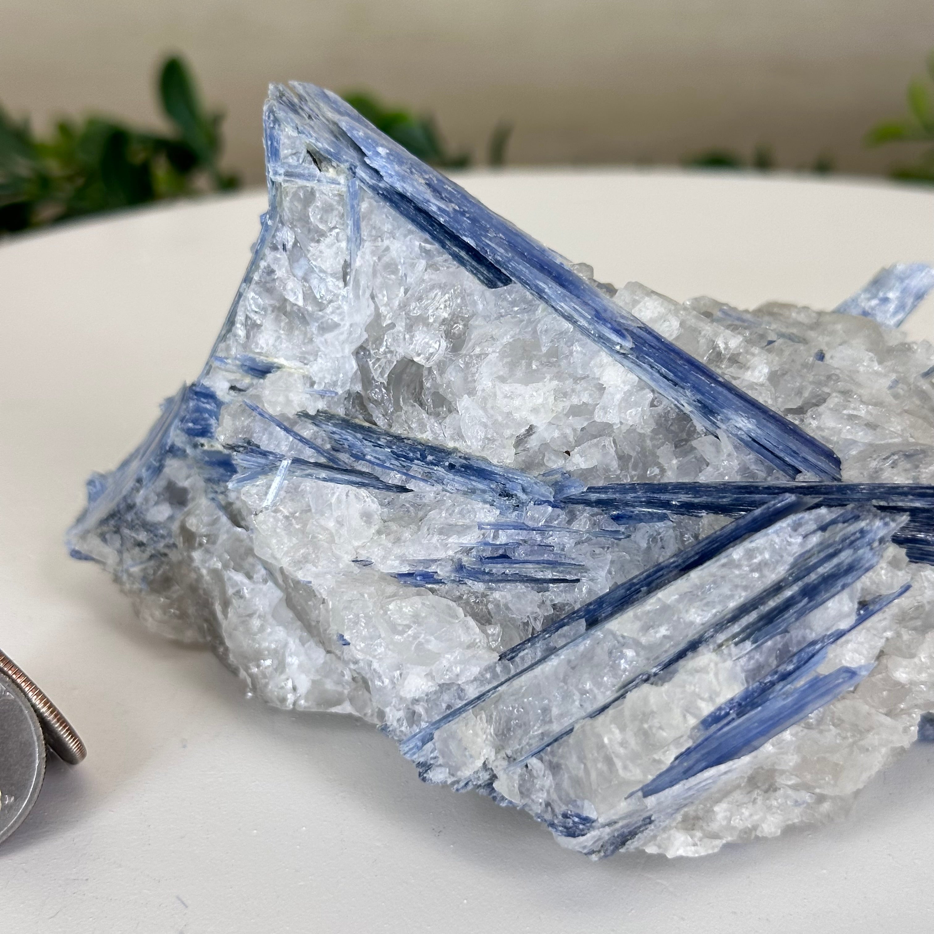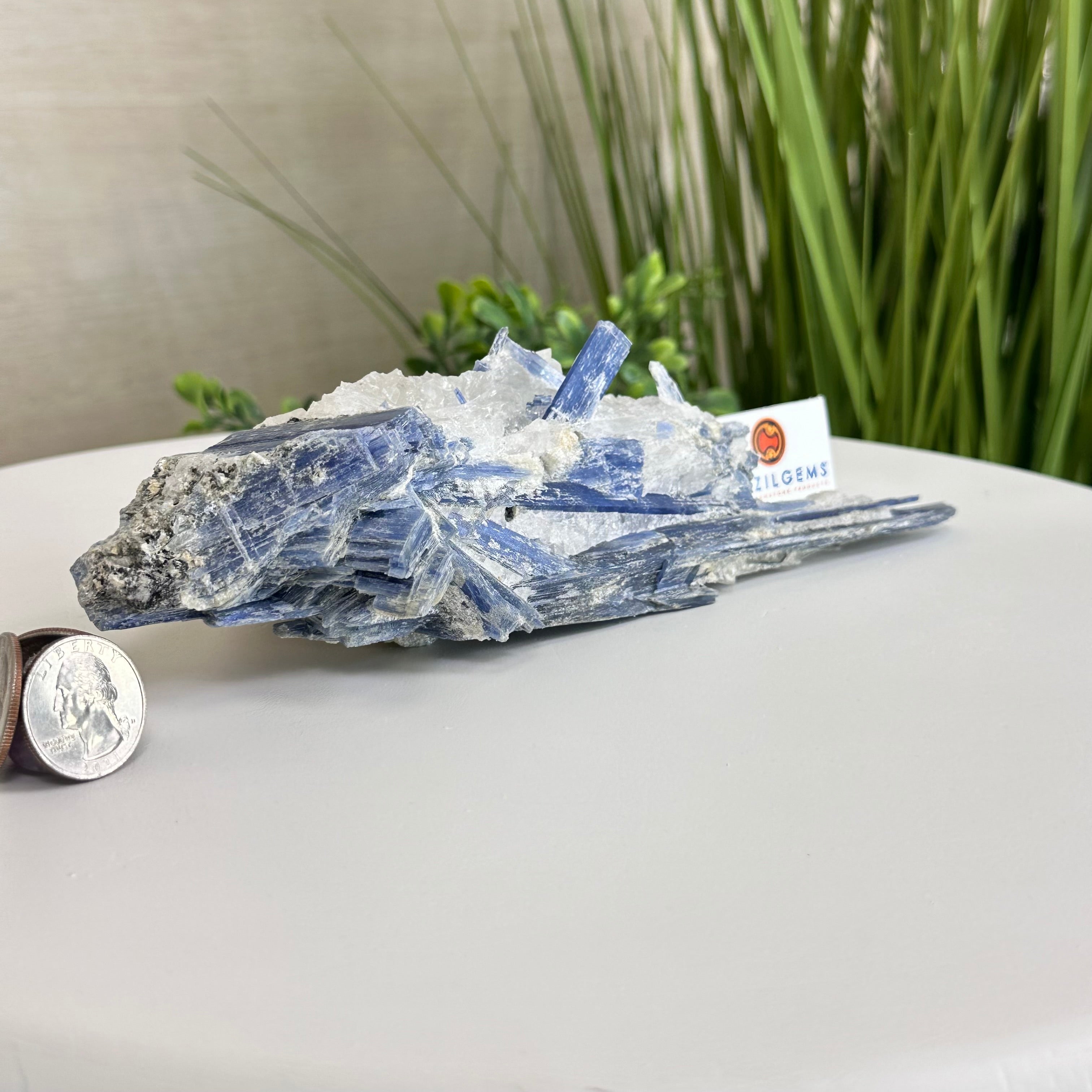 Kyanite clusters, characterized by their vivid blue hues and distinctive blade-like crystal formations, serve as striking natural accents in home décor.