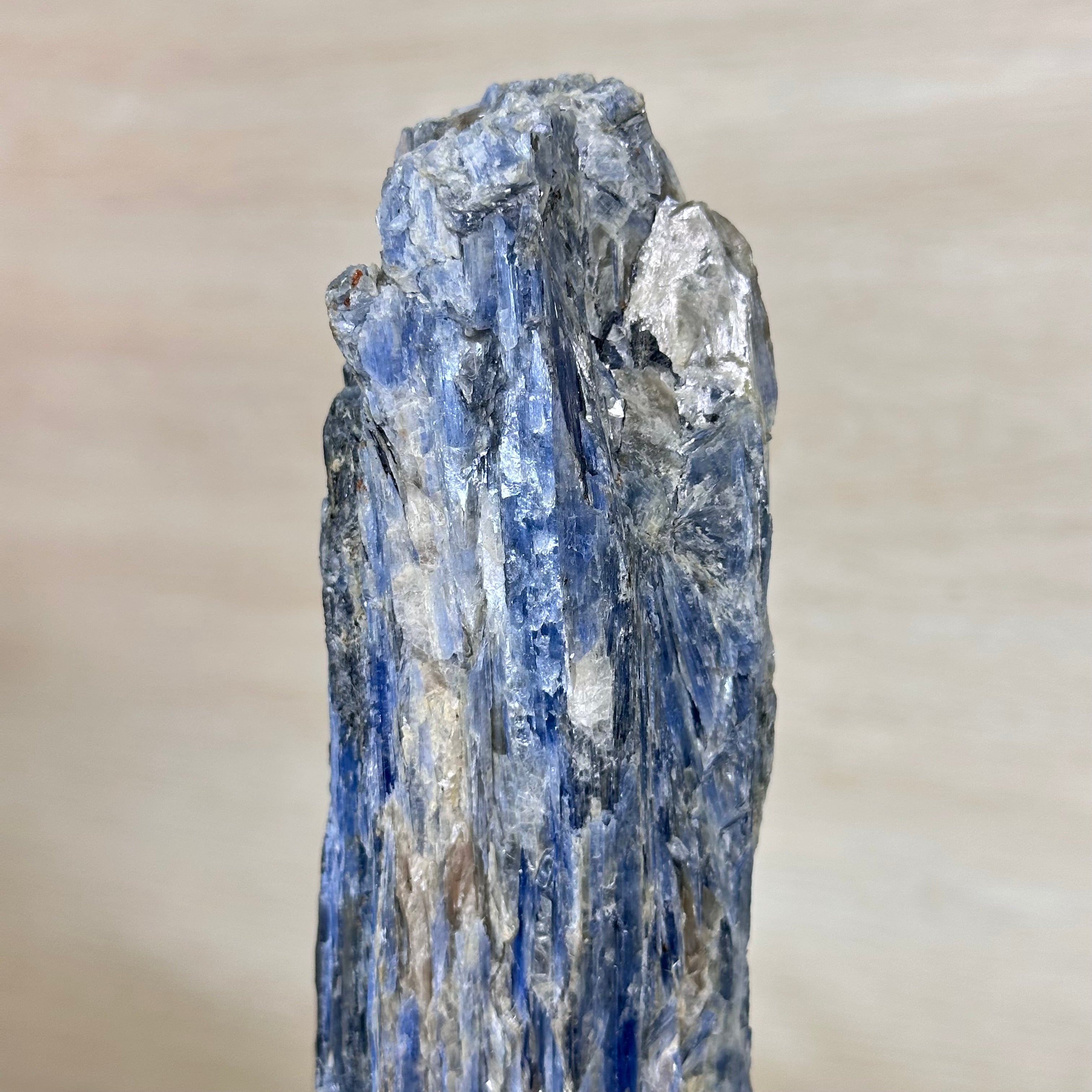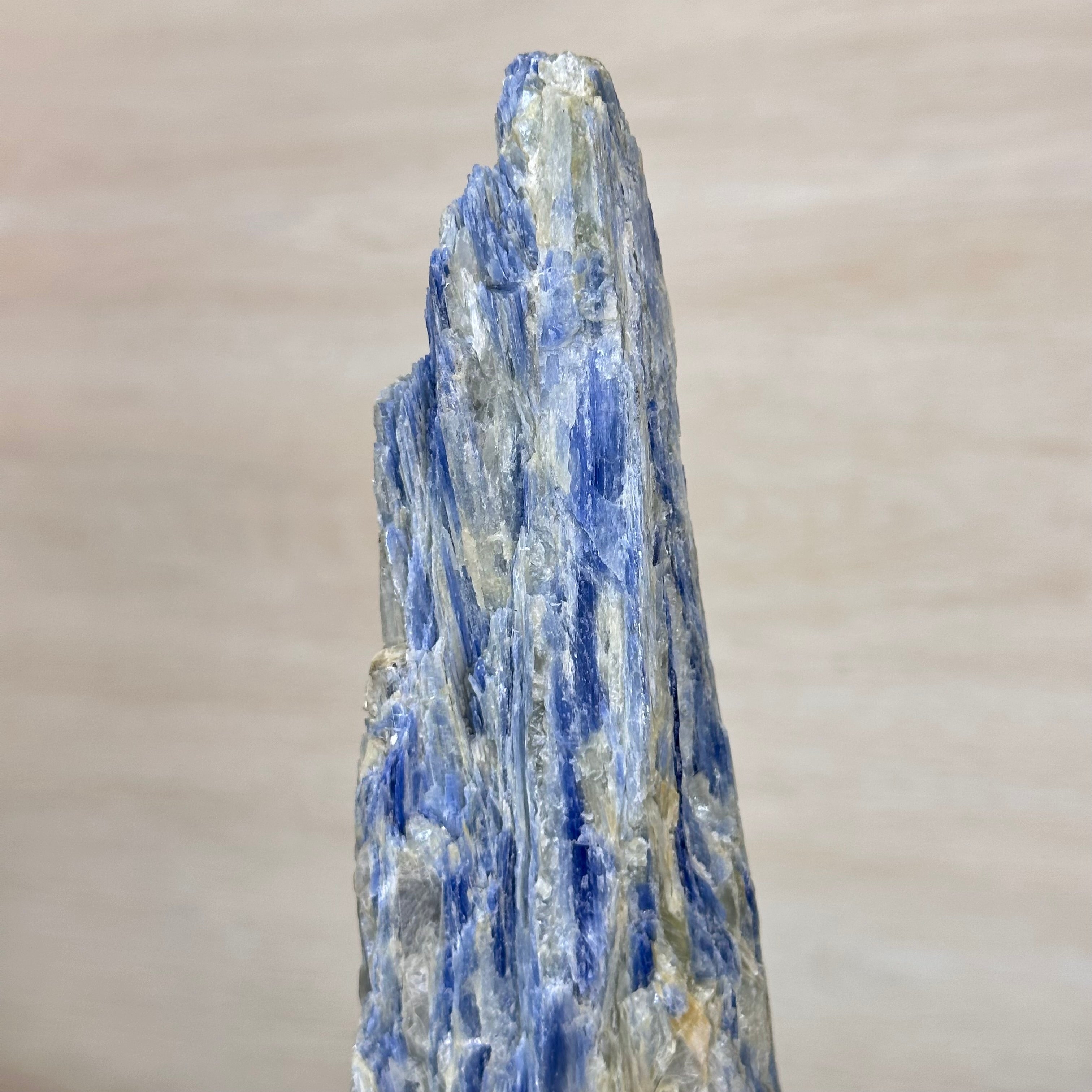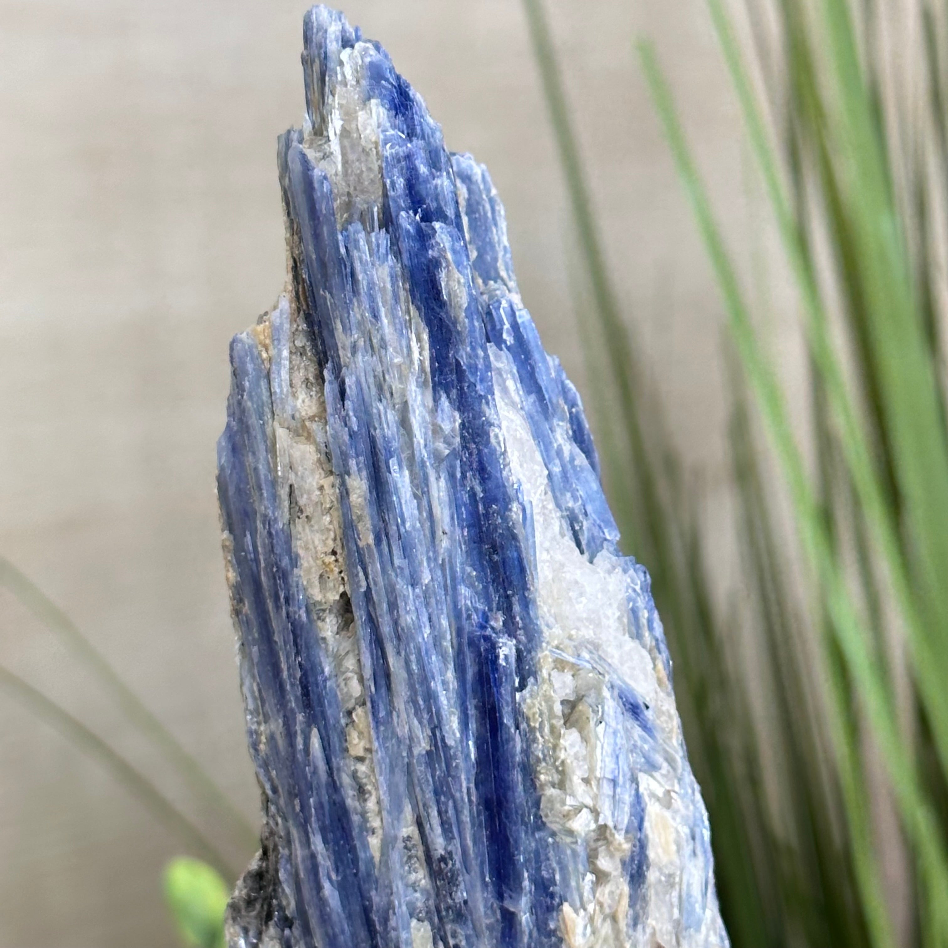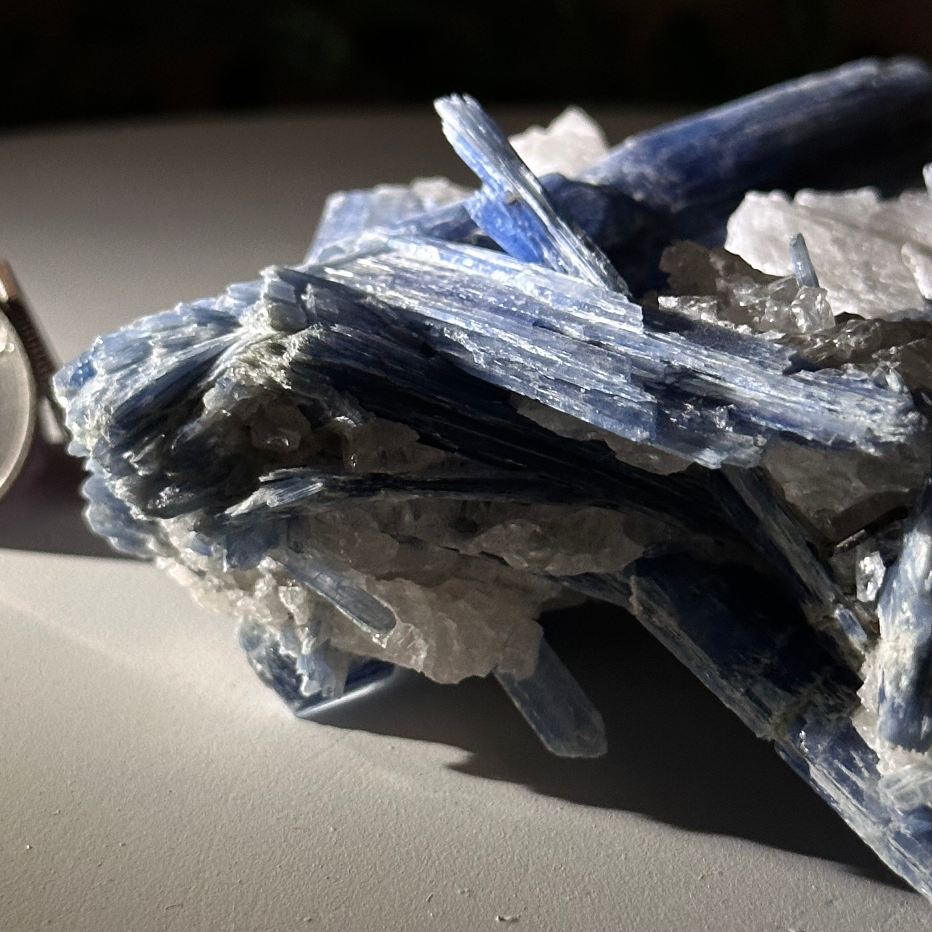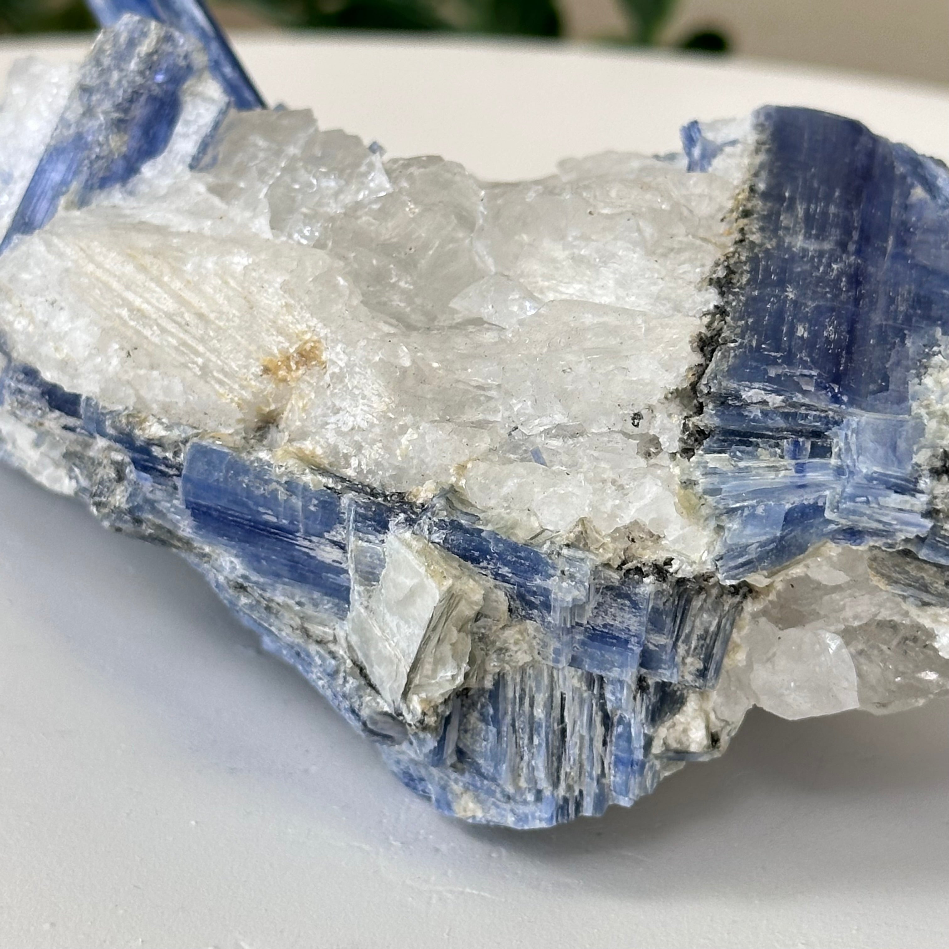 Believers in tantra value and venerate kyanite with the belief it can align chakras, particularly the throat chakra, and encourage psychic abilities. As a focus for meditation, many associate it with high vibrations and repelling negative energy, creating flow through your body and mind. The river of energy that flows through kyanite may reduce inflammation and aid in communication. Kyanite, often present in quartz, is an aluminosilicate mineral, which gives it its shiny, metallic look. Its fibrous characteristics can make it brittle and flaky to the touch.
