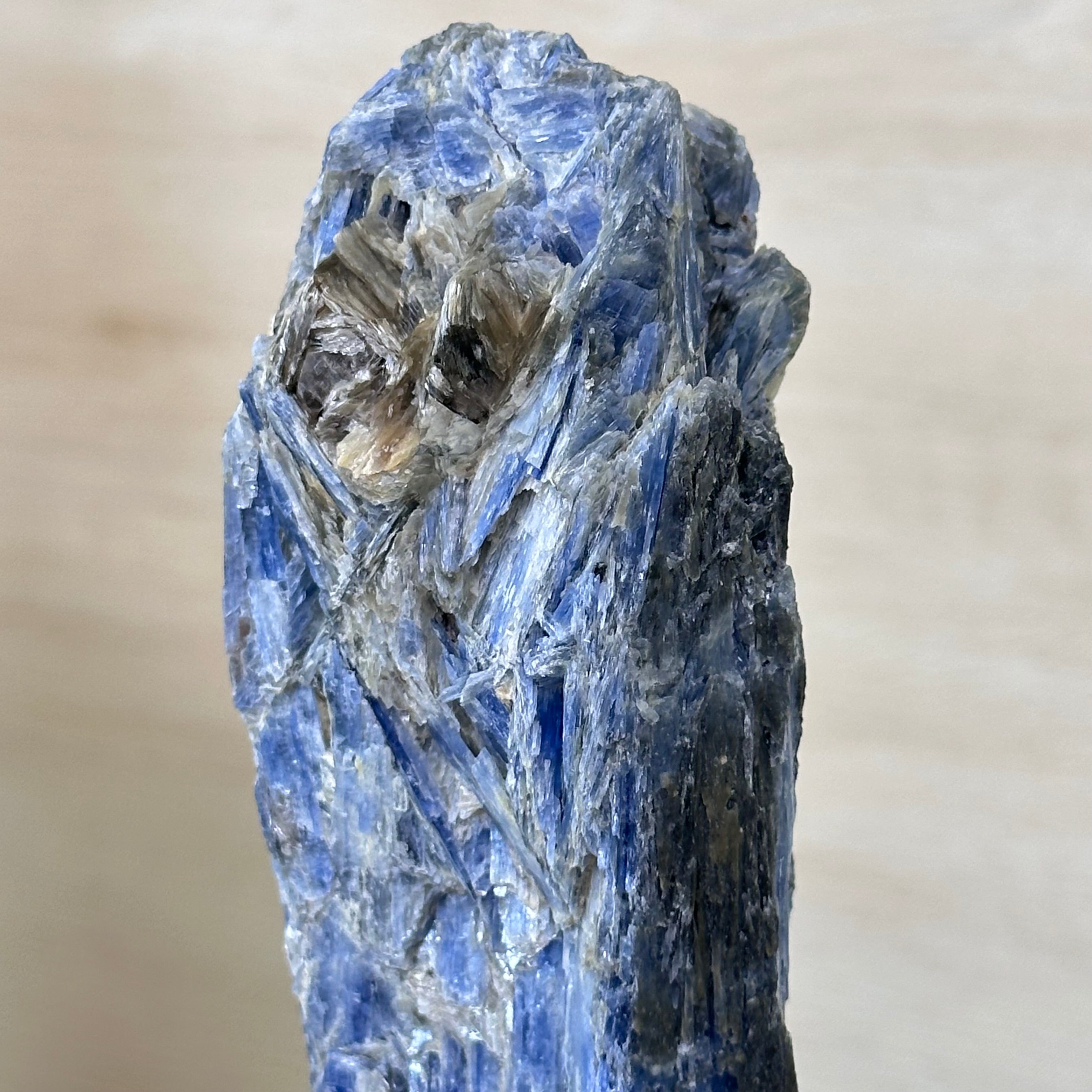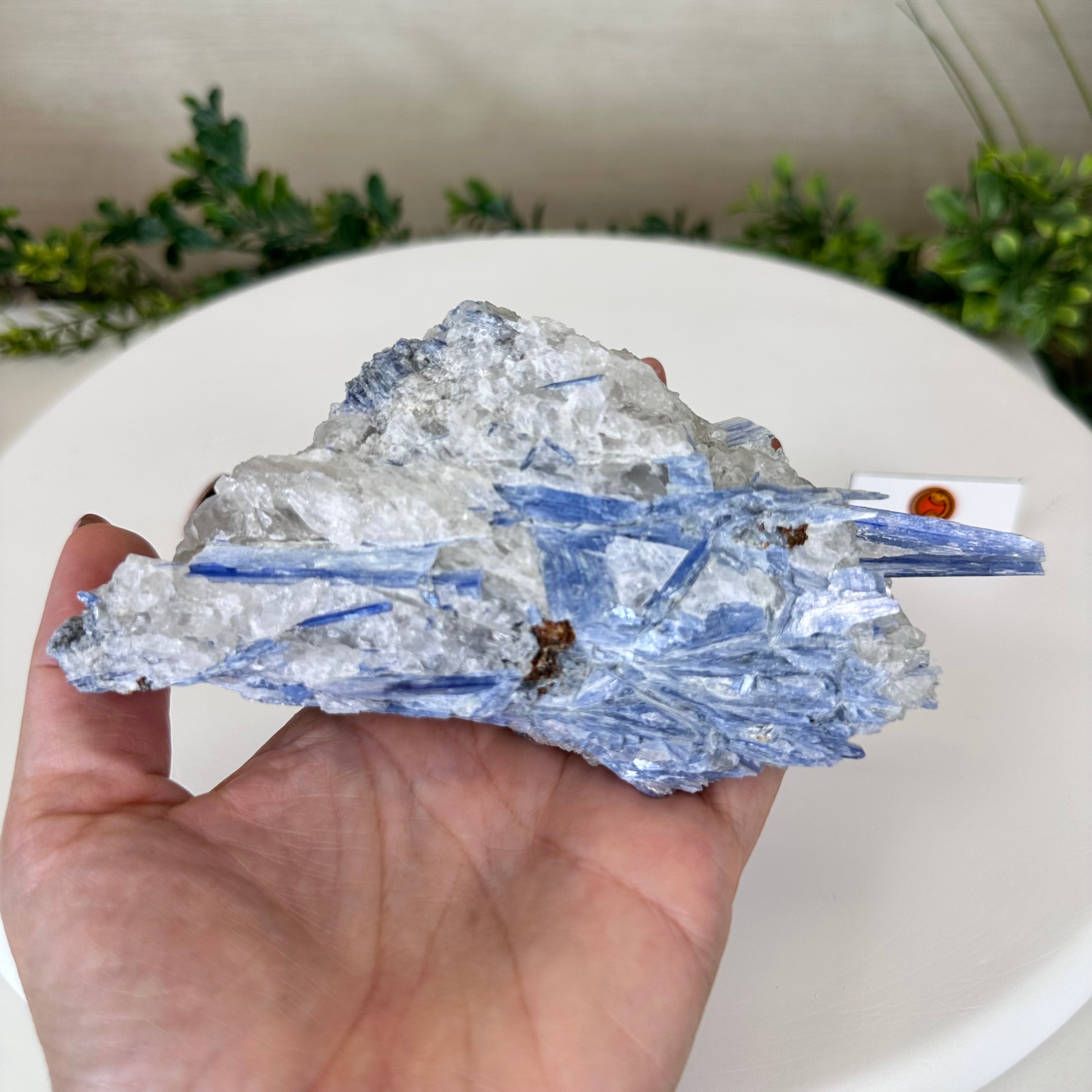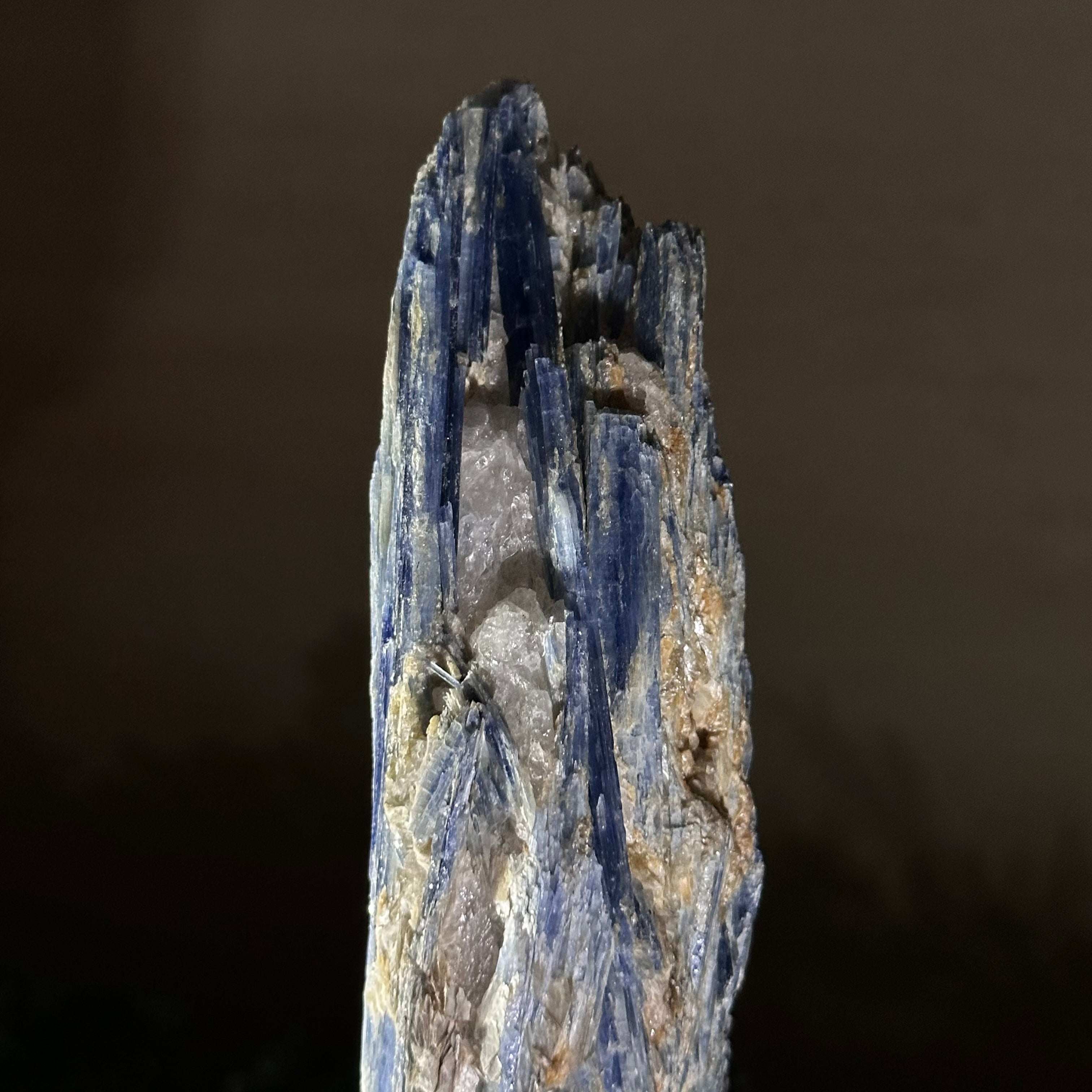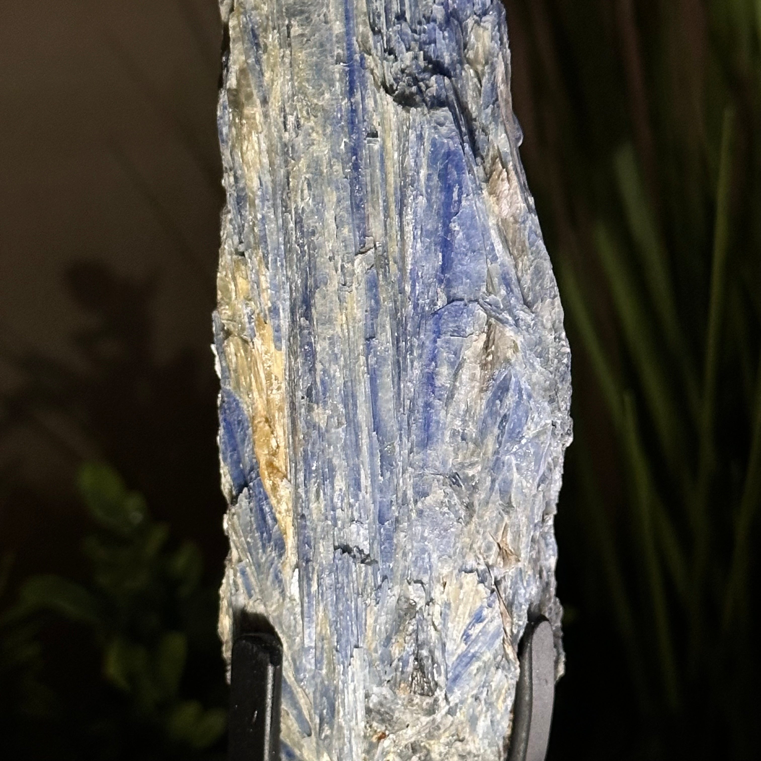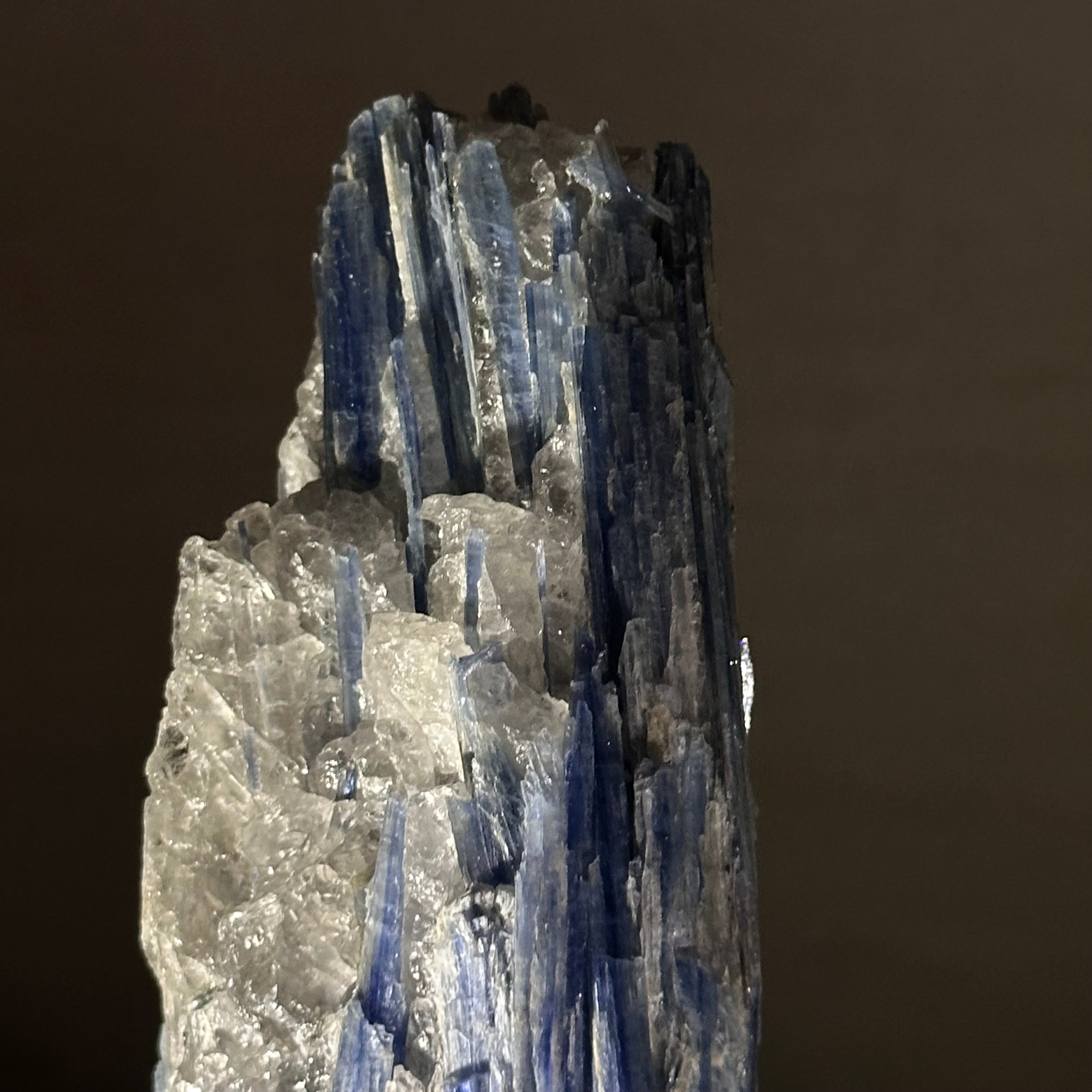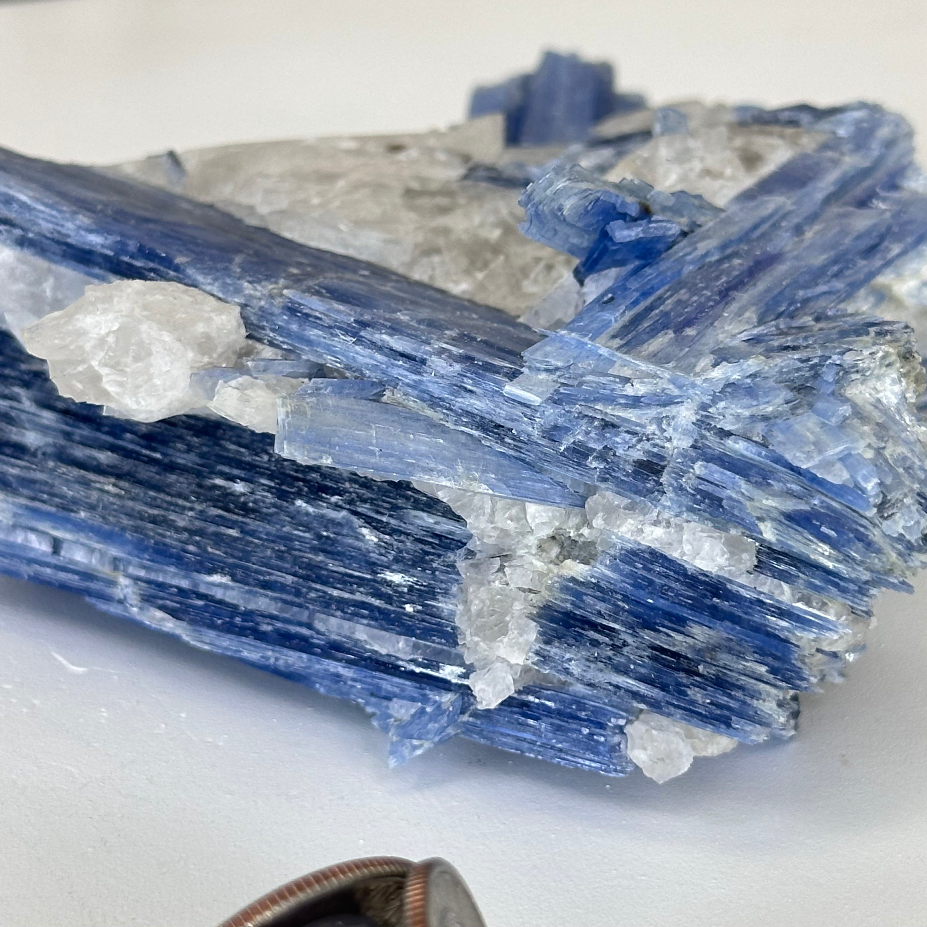 Believers in tantra value and venerate kyanite with the belief it can align chakras, particularly the throat chakra, and encourage psychic abilities. As a focus for meditation, many associate it with high vibrations and repelling negative energy, creating flow through your body and mind. The river of energy that flows through kyanite may reduce inflammation and aid in communication. Kyanite, often present in quartz, is an aluminosilicate mineral, which gives it its shiny, metallic look. Its fibrous characteristics can make it brittle and flaky to the touch.