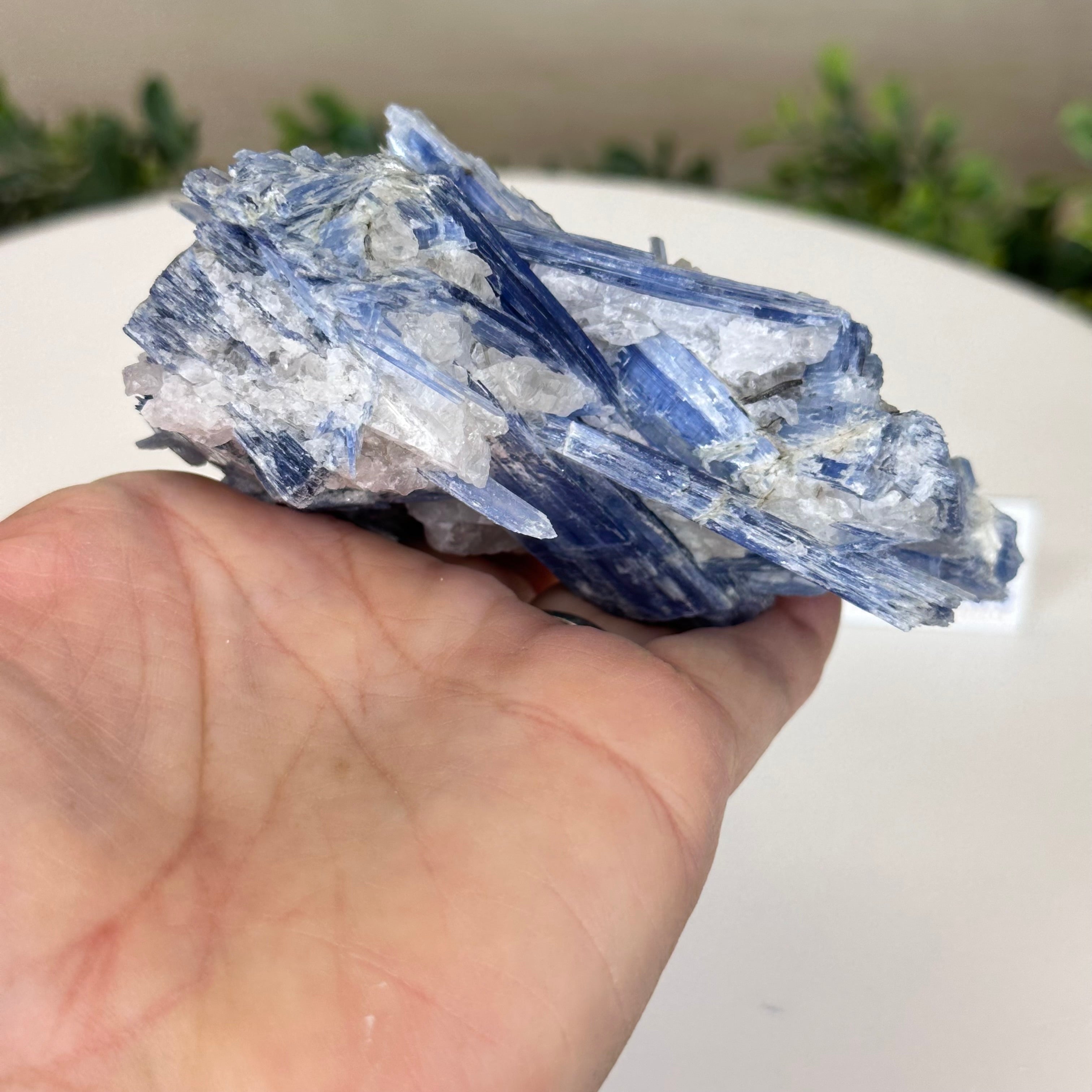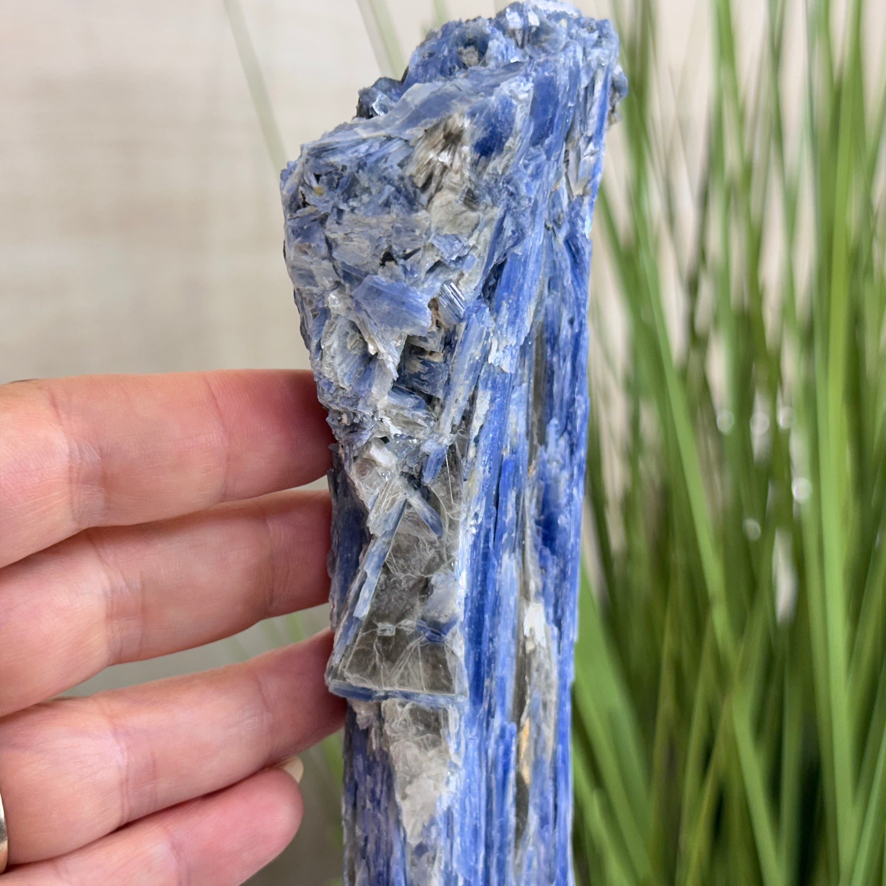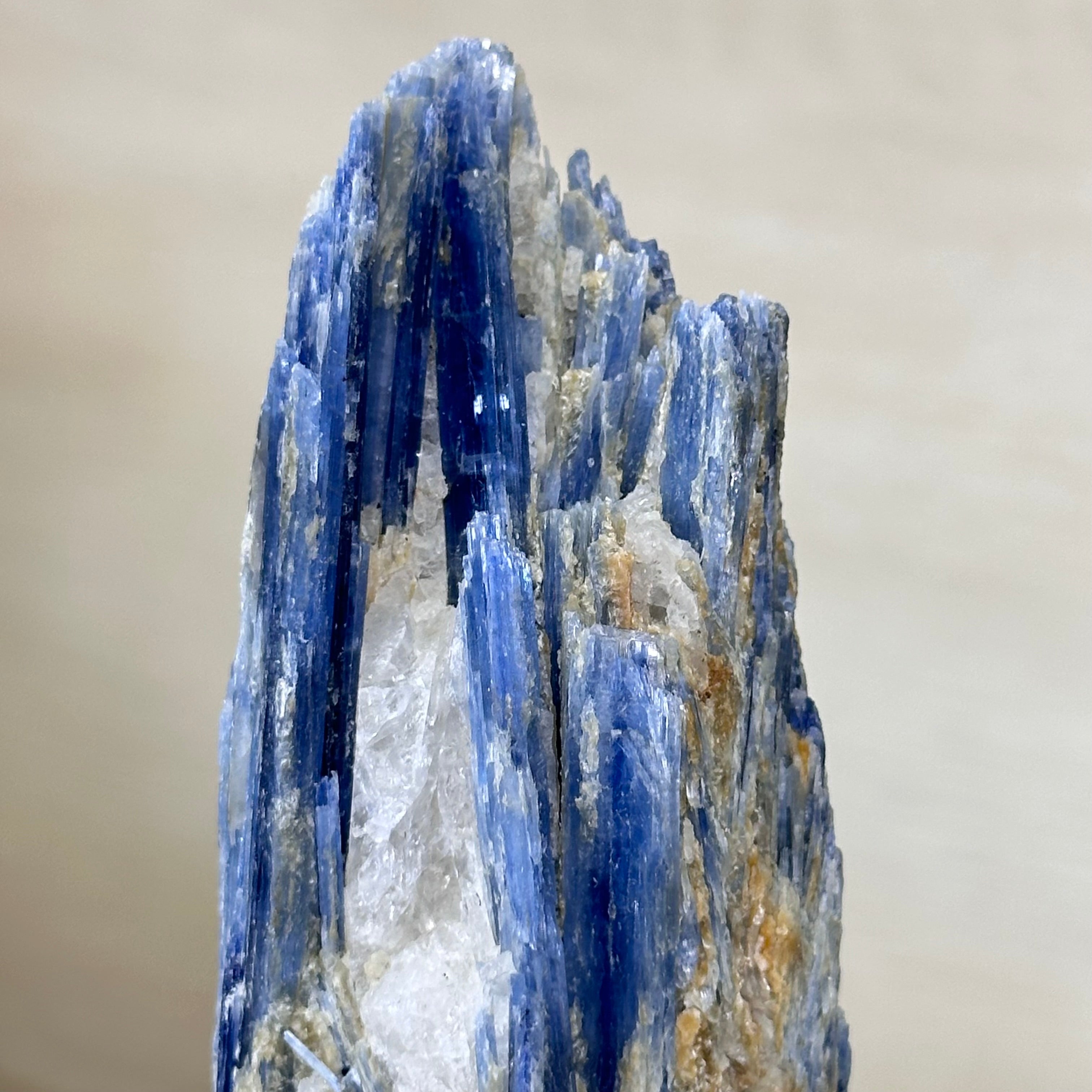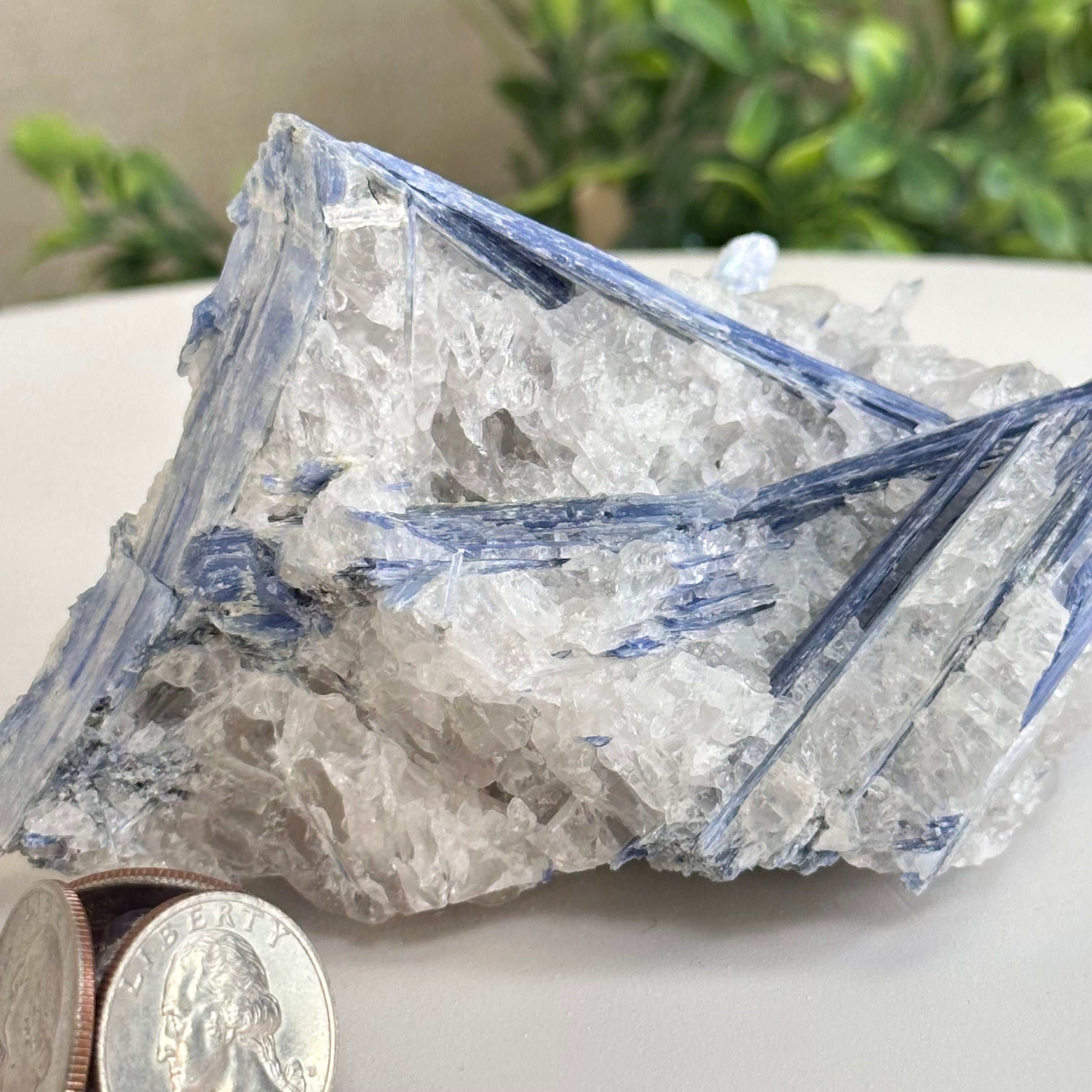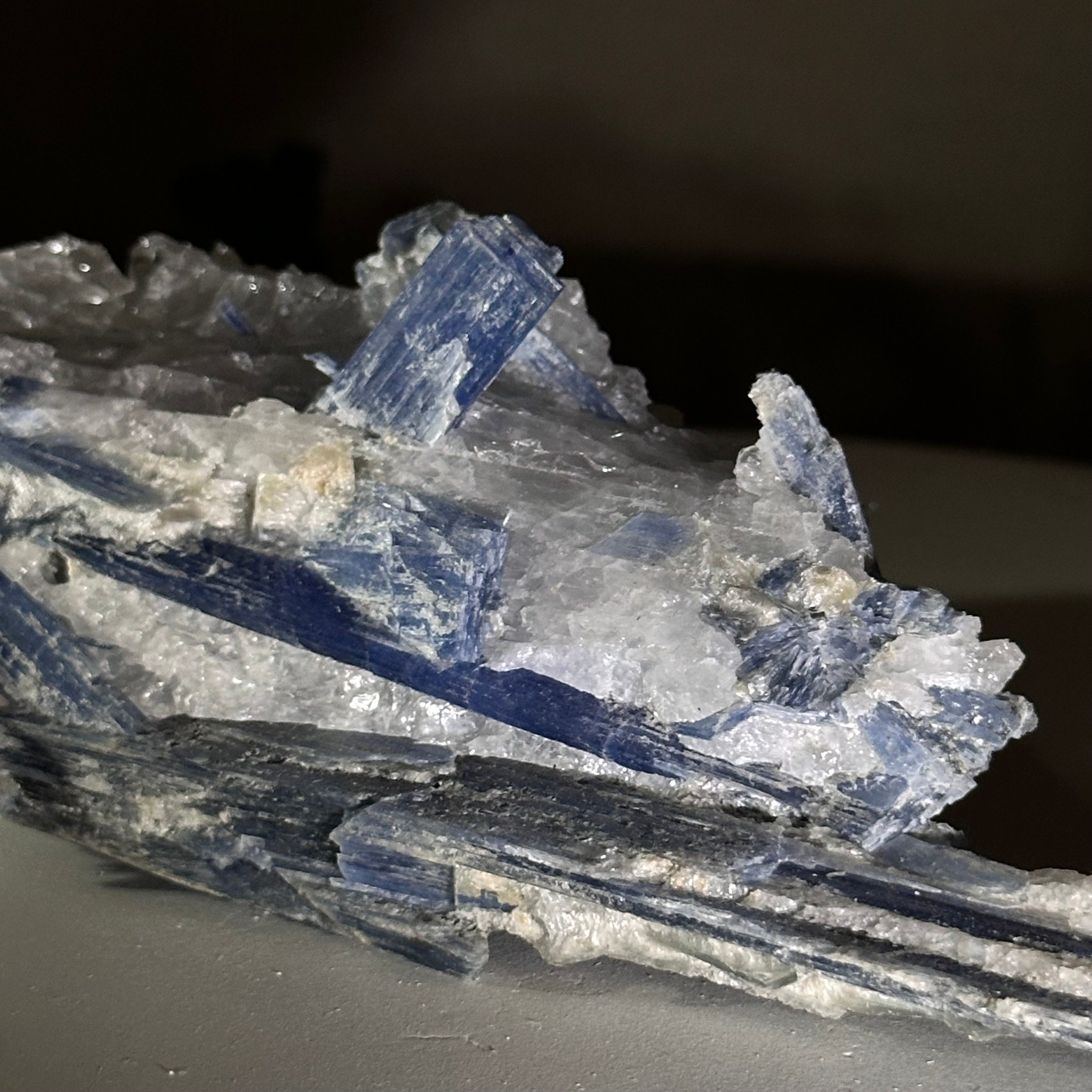 Believers in tantra value and venerate kyanite with the belief it can align chakras, particularly the throat chakra, and encourage psychic abilities. As a focus for meditation, many associate it with high vibrations and repelling negative energy, creating flow through your body and mind. The river of energy that flows through kyanite may reduce inflammation and aid in communication. Kyanite, often present in quartz, is an aluminosilicate mineral, which gives it its shiny, metallic look. Its fibrous characteristics can make it brittle and flaky to the touch.