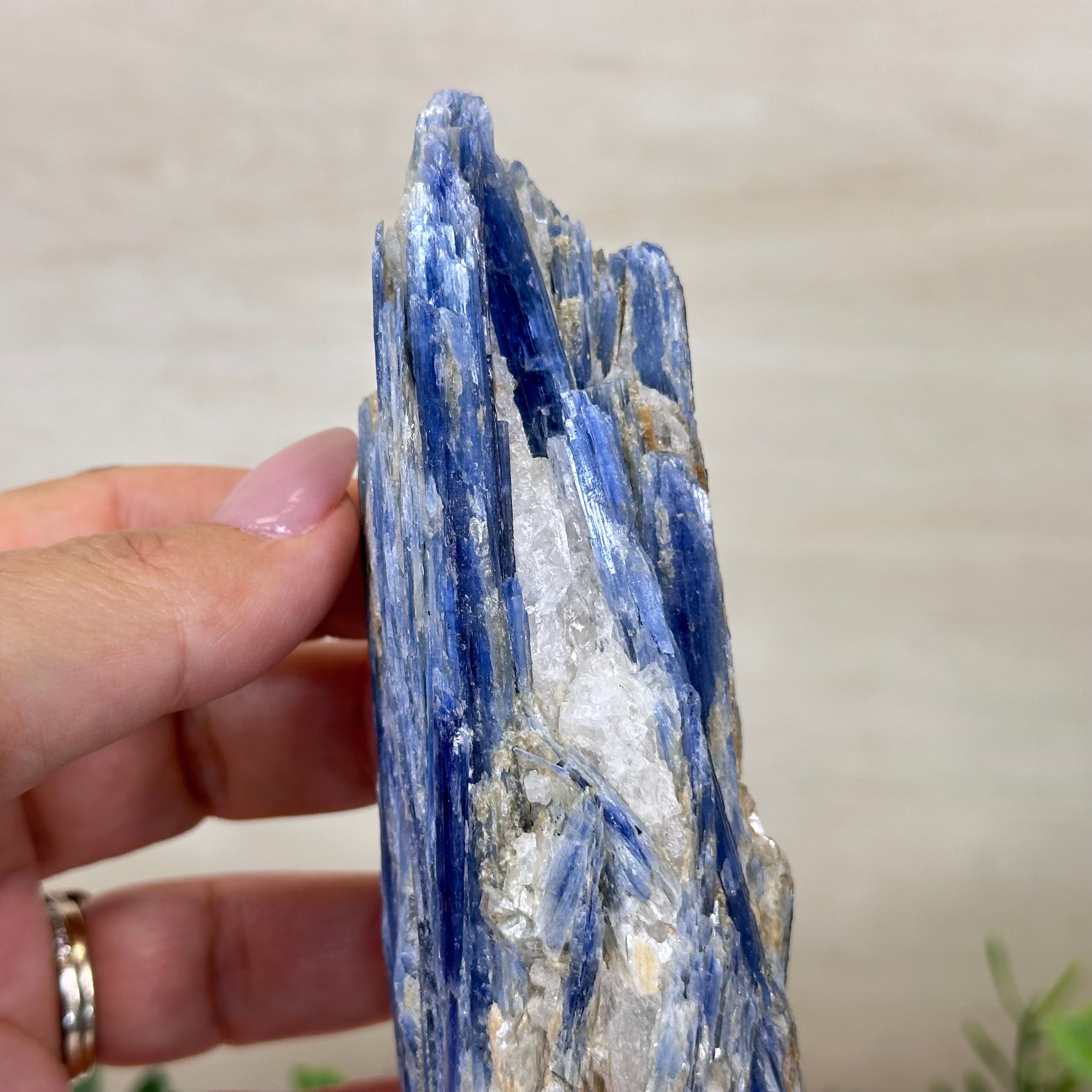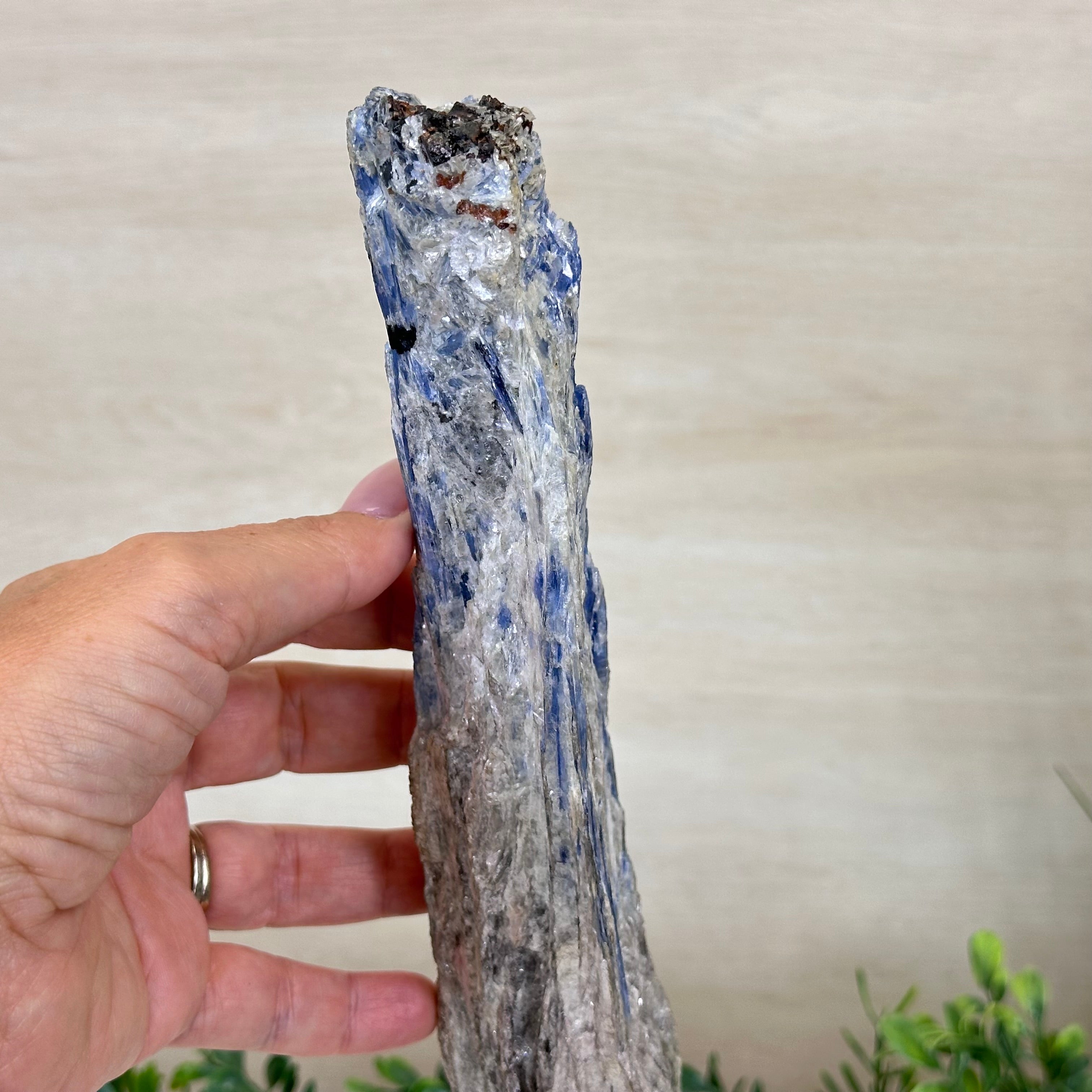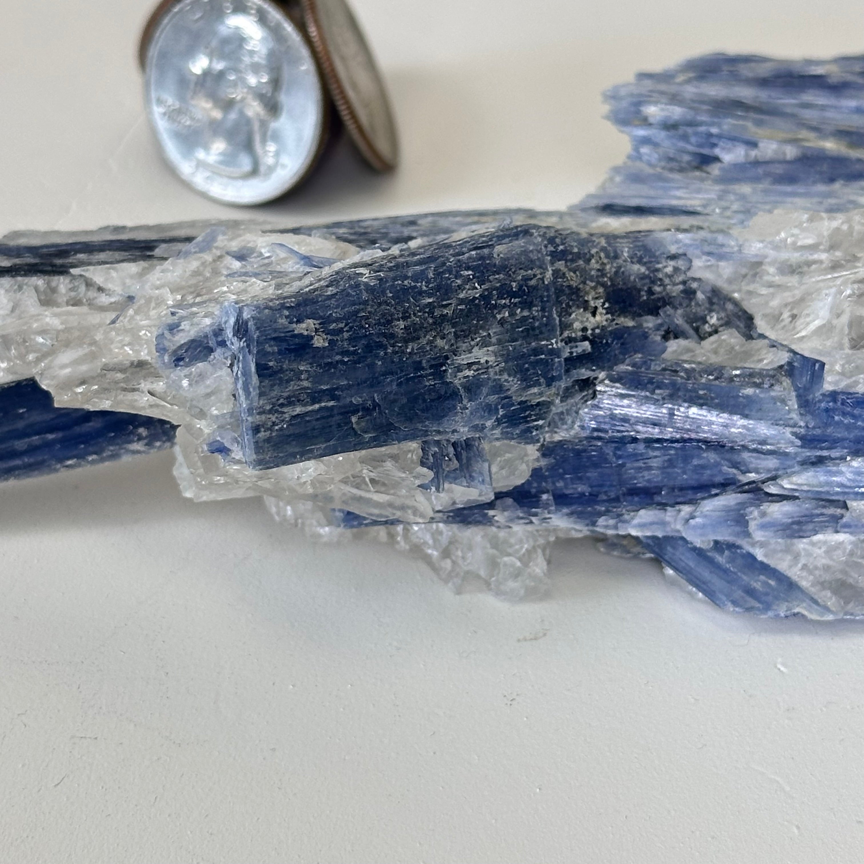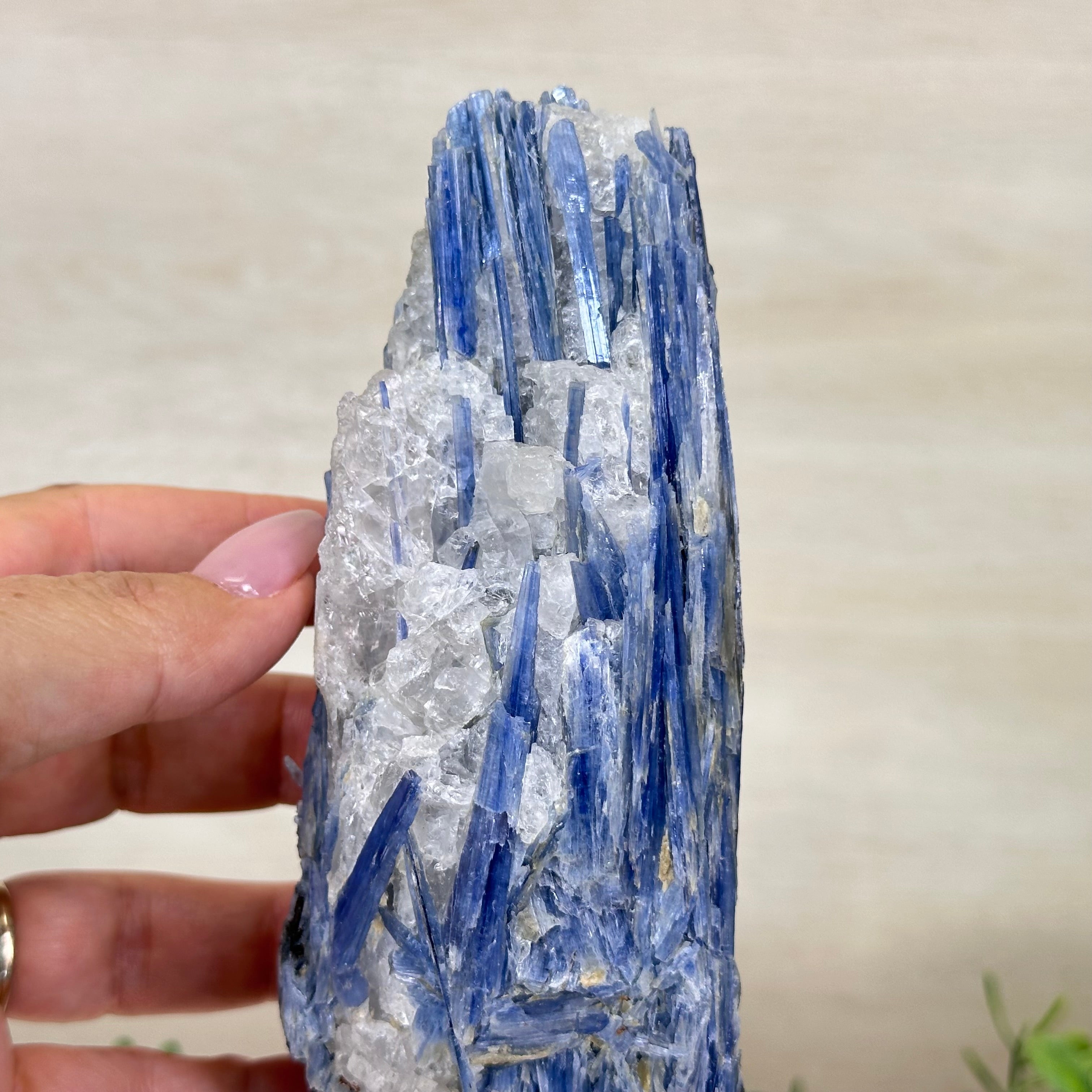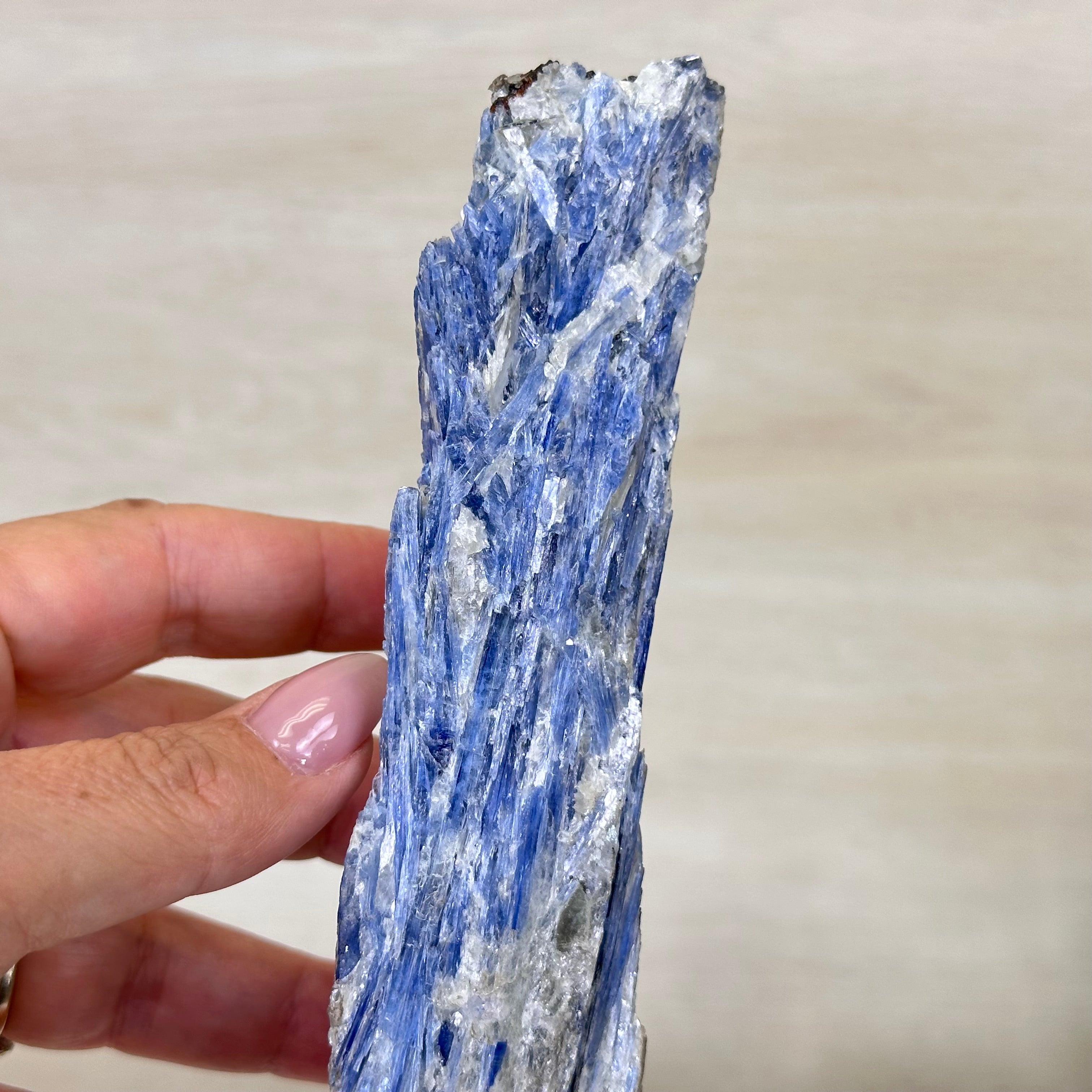 Believers in tantra value and venerate kyanite with the belief it can align chakras, particularly the throat chakra, and encourage psychic abilities. As a focus for meditation, many associate it with high vibrations and repelling negative energy, creating flow through your body and mind. The river of energy that flows through kyanite may reduce inflammation and aid in communication. Kyanite, often present in quartz, is an aluminosilicate mineral, which gives it its shiny, metallic look. Its fibrous characteristics can make it brittle and flaky to the touch.