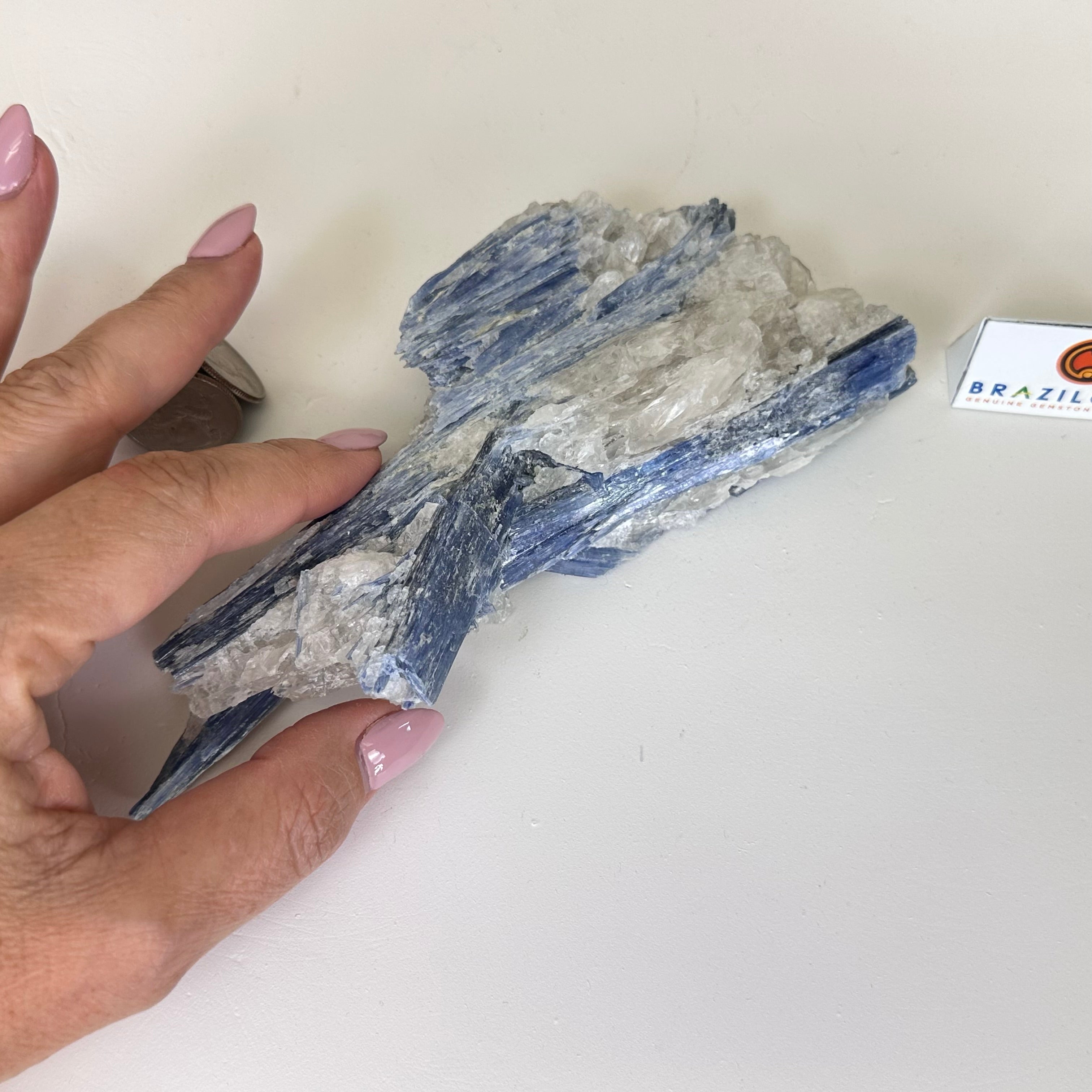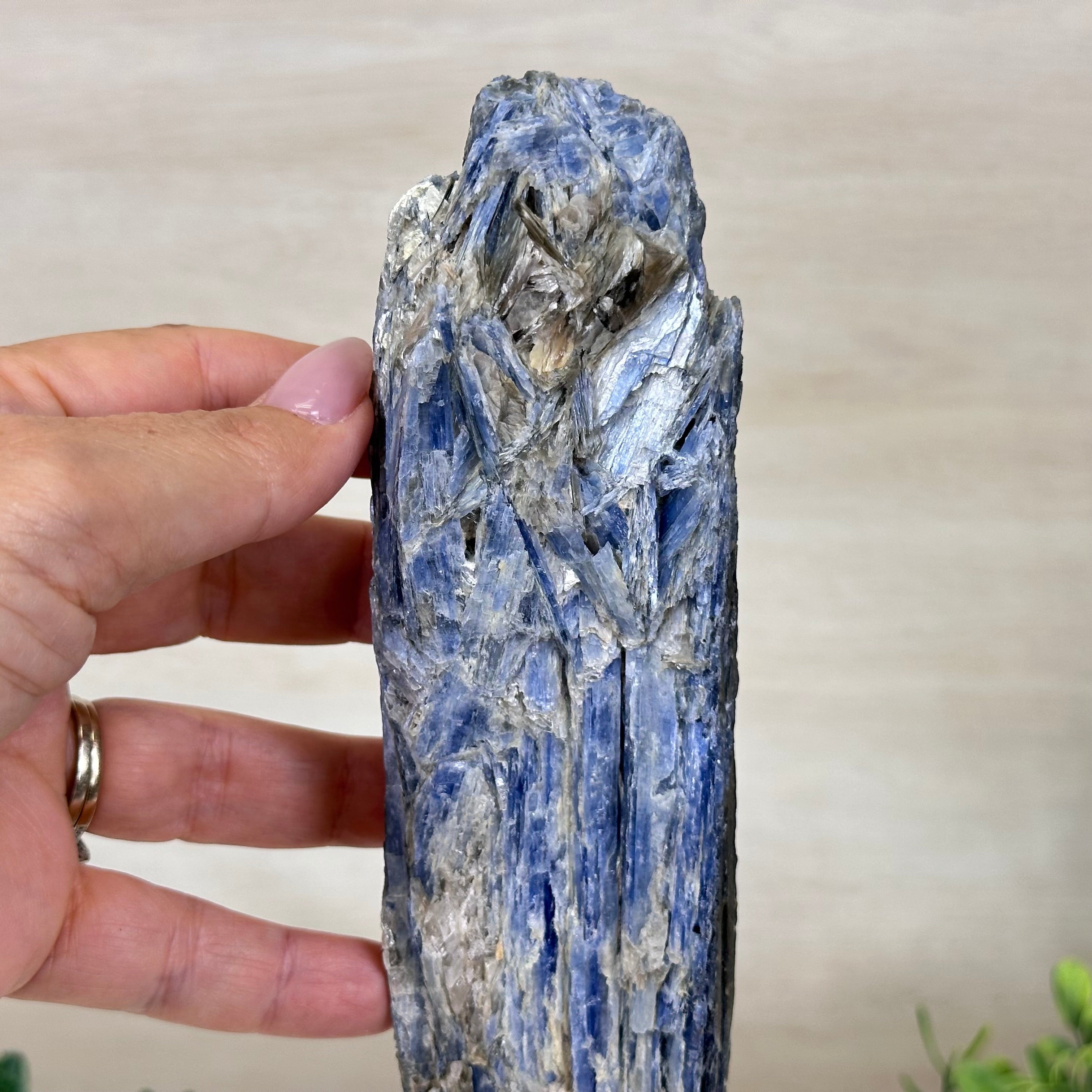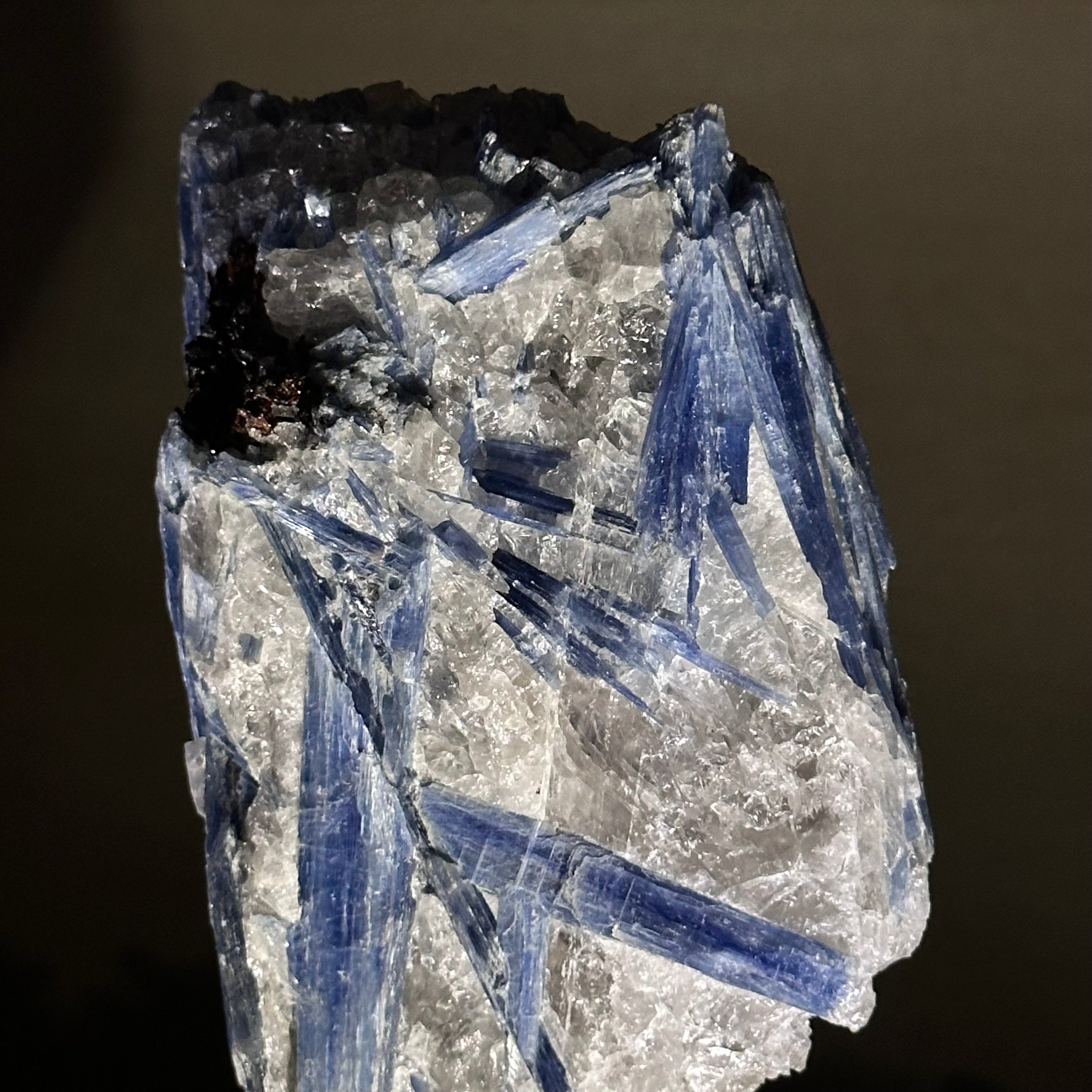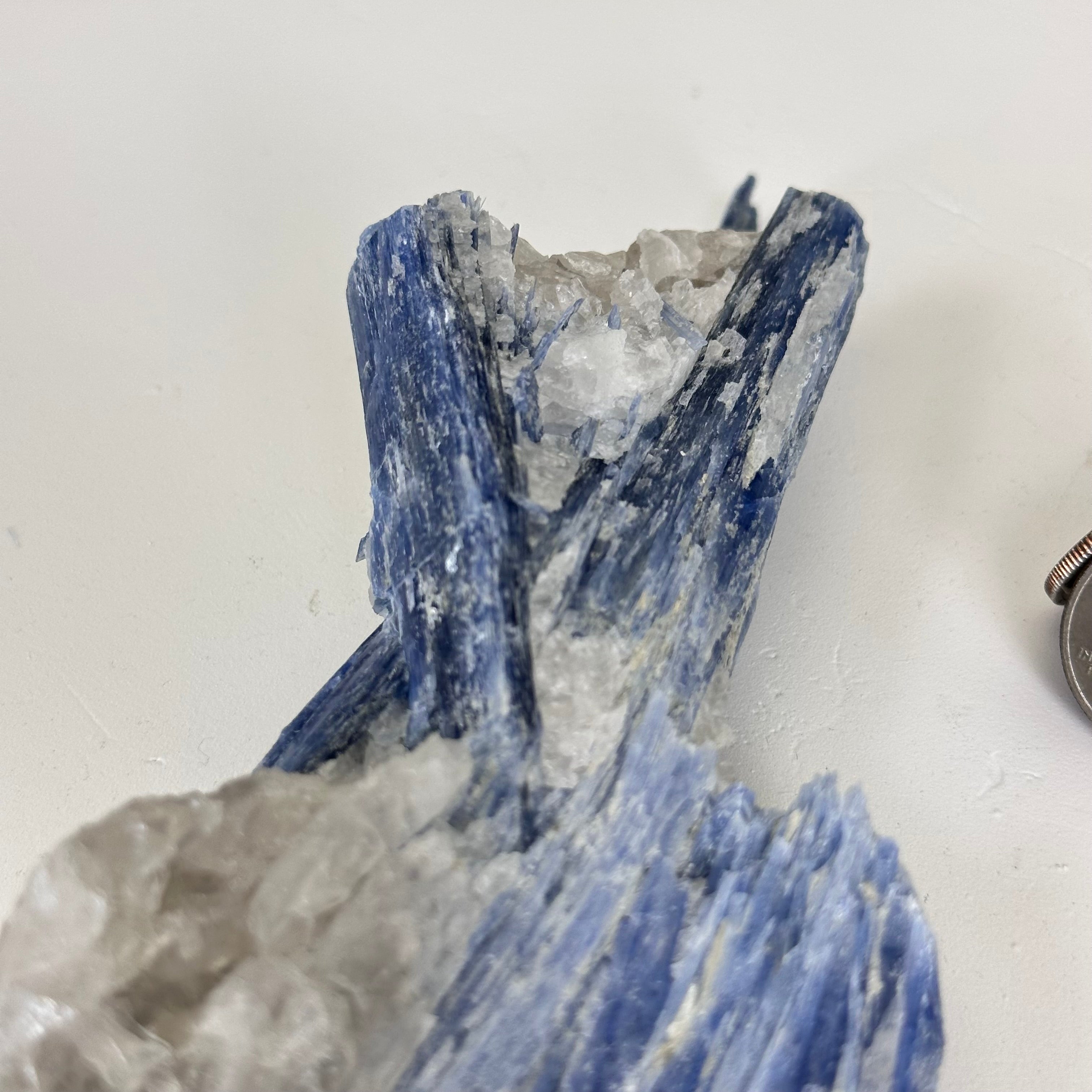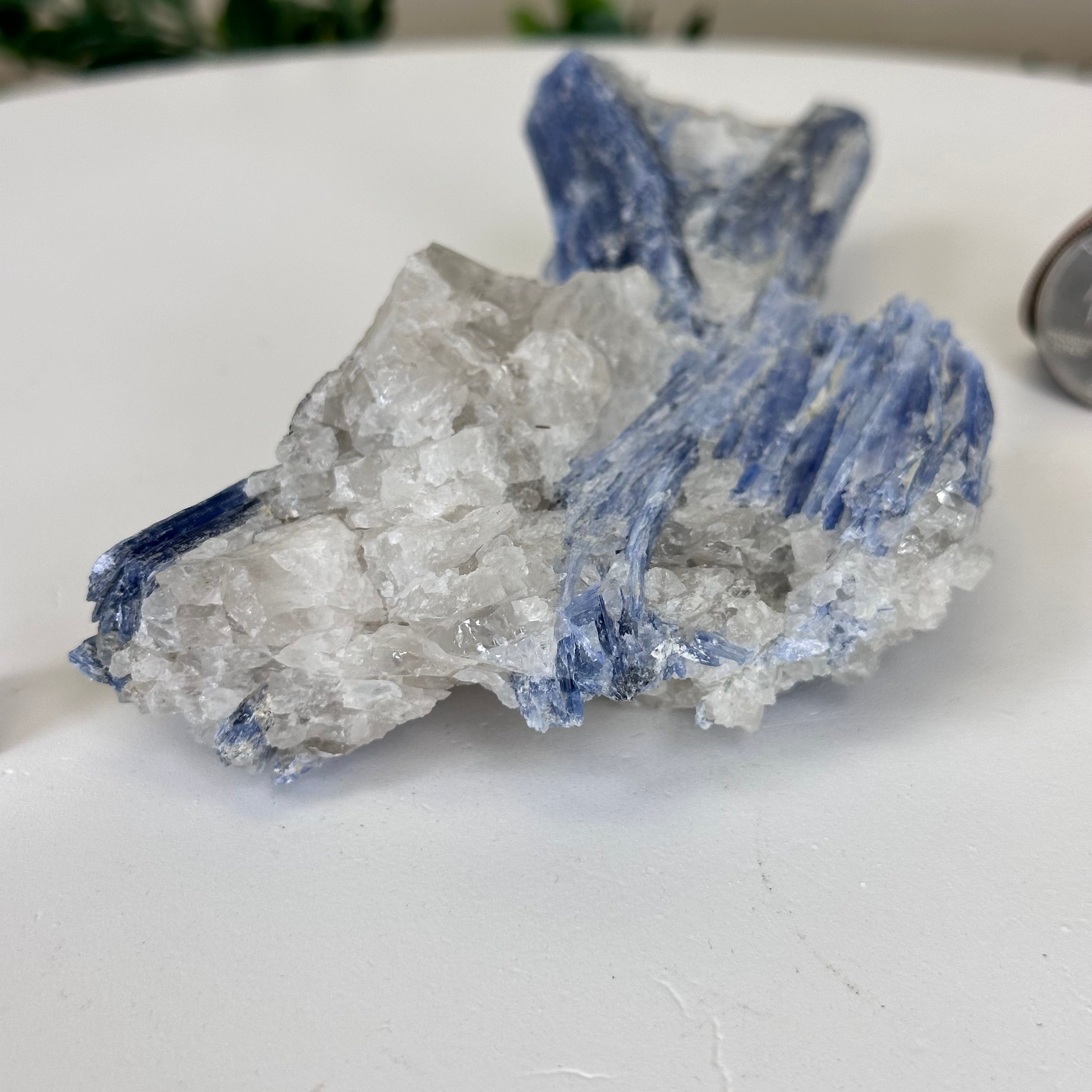 Believers in tantra value and venerate kyanite with the belief it can align chakras, particularly the throat chakra, and encourage psychic abilities. As a focus for meditation, many associate it with high vibrations and repelling negative energy, creating flow through your body and mind. The river of energy that flows through kyanite may reduce inflammation and aid in communication. Kyanite, often present in quartz, is an aluminosilicate mineral, which gives it its shiny, metallic look. Its fibrous characteristics can make it brittle and flaky to the touch.