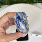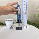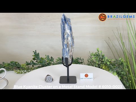 Disclaimer: This is a natural gemstone crystal sold by Brazil Gems® as is and as you see it in its images and video. It is the exact one you will receive. It may contain natural imperfections and/or imperfections, broken edges and repairs from the extraction, mounting and prepping processes. The stand is custom made to fit this piece and was painted black. Kyanite is a very delicate and brittle gemstone with delicate crystal blades jutting out and handling the piece can inevitably cause its points/blades to break off in small pieces. It's best to handle it as little as possible. At Brazil Gems® we make every effort to get measurements as exact as possible but they are done by human hands and eyes and therefore may have minor discrepancies.