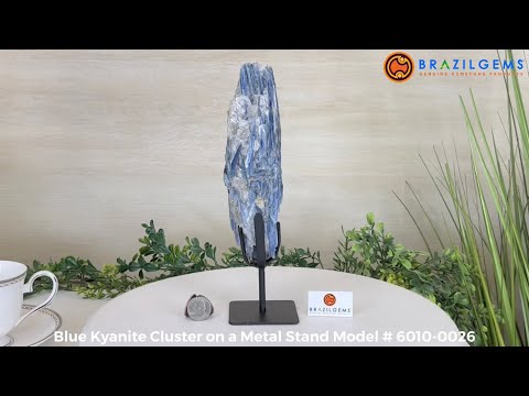 Disclaimer: This is a natural gemstone crystal sold by Brazil Gems® as is and as you see it in its images and video. It is the exact one you will receive. It may contain natural imperfections and/or imperfections, broken edges and repairs from the extraction, mounting and prepping processes. The stand is custom made to fit this piece and was painted black. Kyanite is a very delicate and brittle gemstone with delicate crystal blades jutting out and handling the piece can inevitably cause its points/blades to break off in small pieces. It's best to handle it as little as possible. At Brazil Gems® we make every effort to get measurements as exact as possible but they are done by human hands and eyes and therefore may have minor discrepancies.