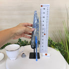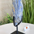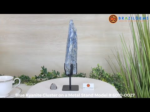 Disclaimer: This is a natural gemstone crystal sold by Brazil Gems® as is and as you see it in its images and video. It is the exact one you will receive. It may contain natural imperfections and/or imperfections, broken edges and repairs from the extraction, mounting and prepping processes. The stand is custom made to fit this piece and was painted black. Kyanite is a very delicate and brittle gemstone with delicate crystal blades jutting out and handling the piece can inevitably cause its points/blades to break off in small pieces. It's best to handle it as little as possible. At Brazil Gems® we make every effort to get measurements as exact as possible but they are done by human hands and eyes and therefore may have minor discrepancies.