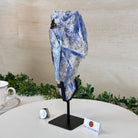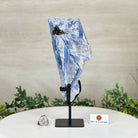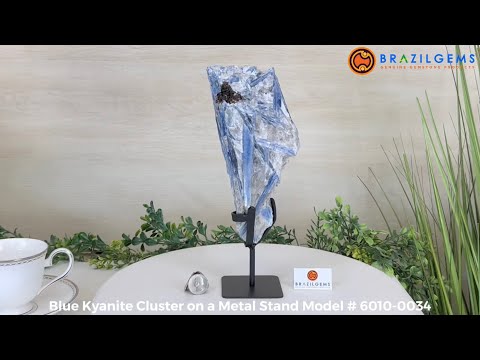 Disclaimer: This is a natural gemstone crystal sold by Brazil Gems® as is and as you see it in its images and video. It is the exact one you will receive. It may contain natural imperfections and/or imperfections, broken edges and repairs from the extraction, mounting and prepping processes. The stand is custom made to fit this piece and was painted black. Kyanite is a very delicate and brittle gemstone with delicate crystal blades jutting out and handling the piece can inevitably cause its points/blades to break off in small pieces. It's best to handle it as little as possible. At Brazil Gems® we make every effort to get measurements as exact as possible but they are done by human hands and eyes and therefore may have minor discrepancies.