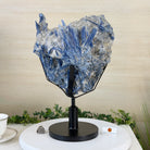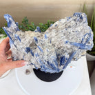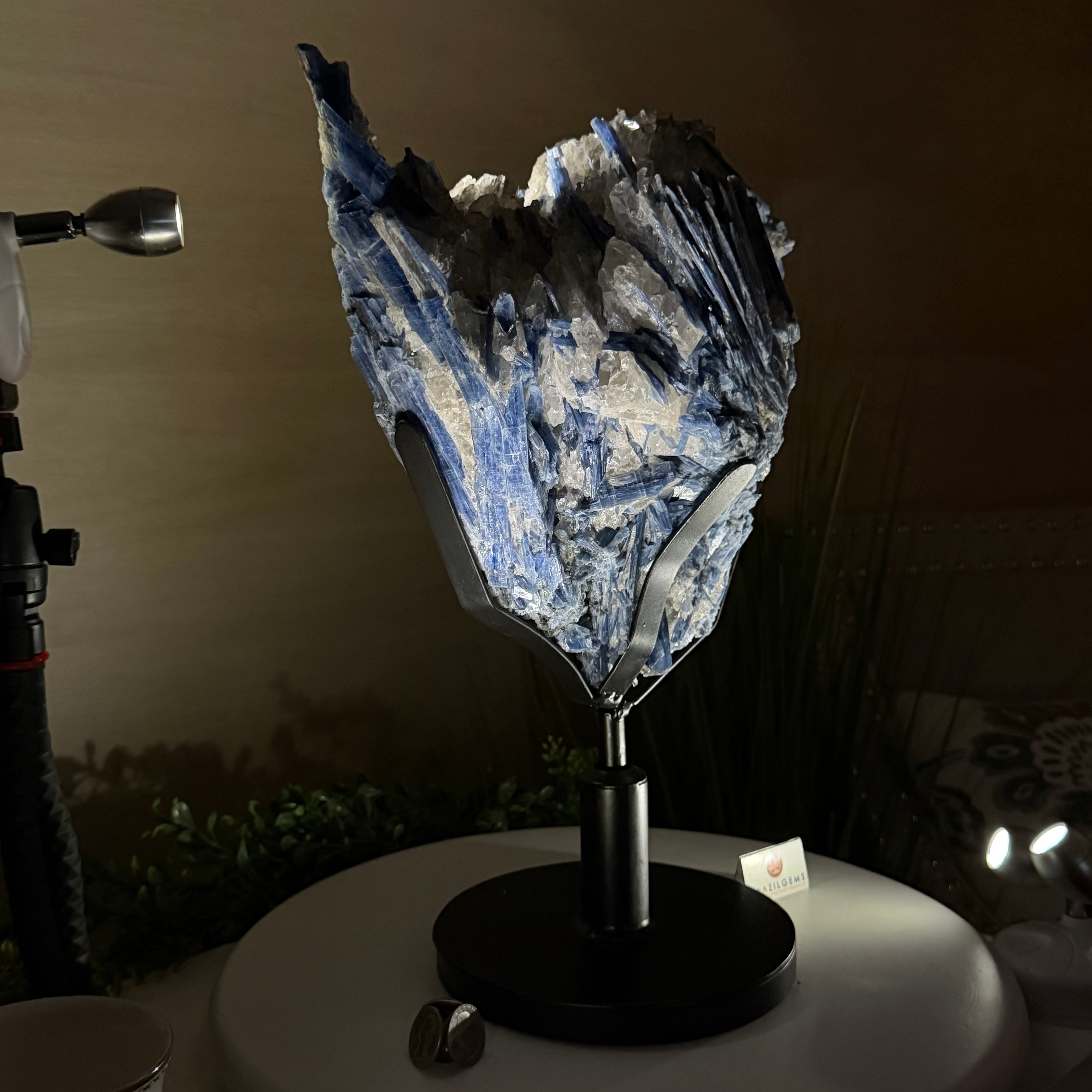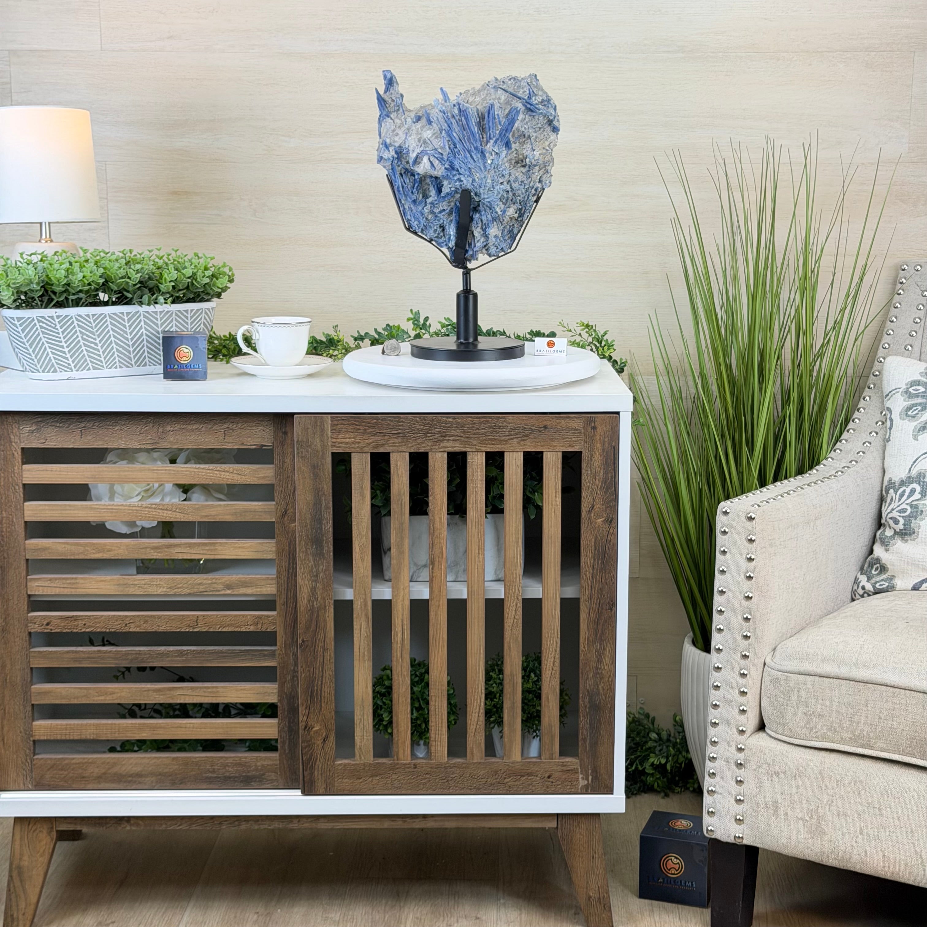The vibrant blue hues and unique, blade-like structure of the Kyanite catch the light with every turn, revealing its mesmerizing natural patterns and depth. The rotating stand allows you to admire every angle of this one-of-a-kind gemstone, making it an eye-catching centerpiece for collectors, decorators, or crystal enthusiasts alike.