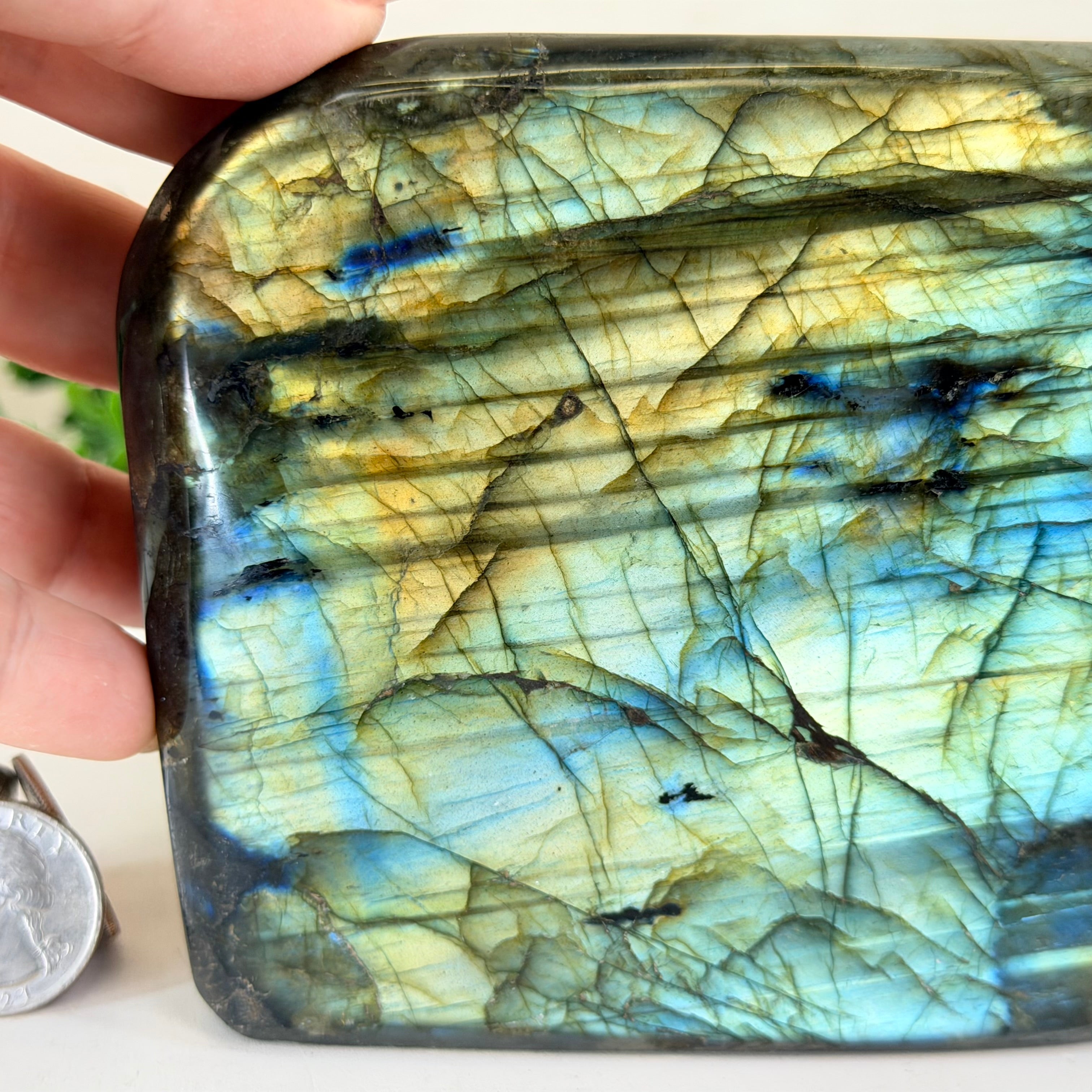 At first glance, Labradorite may appear like a dark, grayish stone, but as light catches its surface, a mesmerizing transformation takes place. An exquisite display of vivid flashes and shimmering lights emerges, creating an otherworldly spectacle known as "labradorescence." This captivating optical effect manifests in hues of blues, greens, yellows, and oranges, with occasional hints of purple and pink, producing an ethereal and almost magical appearance.