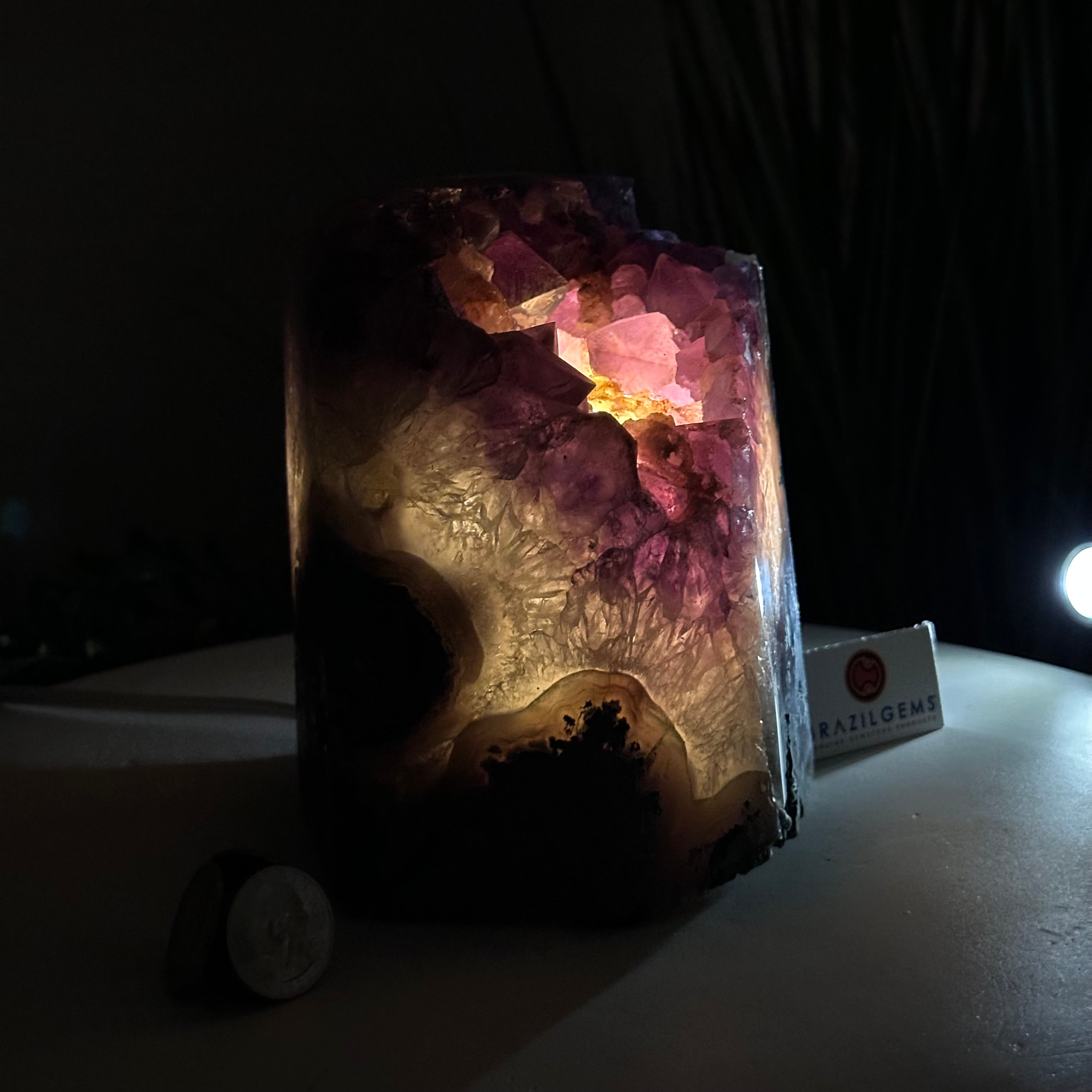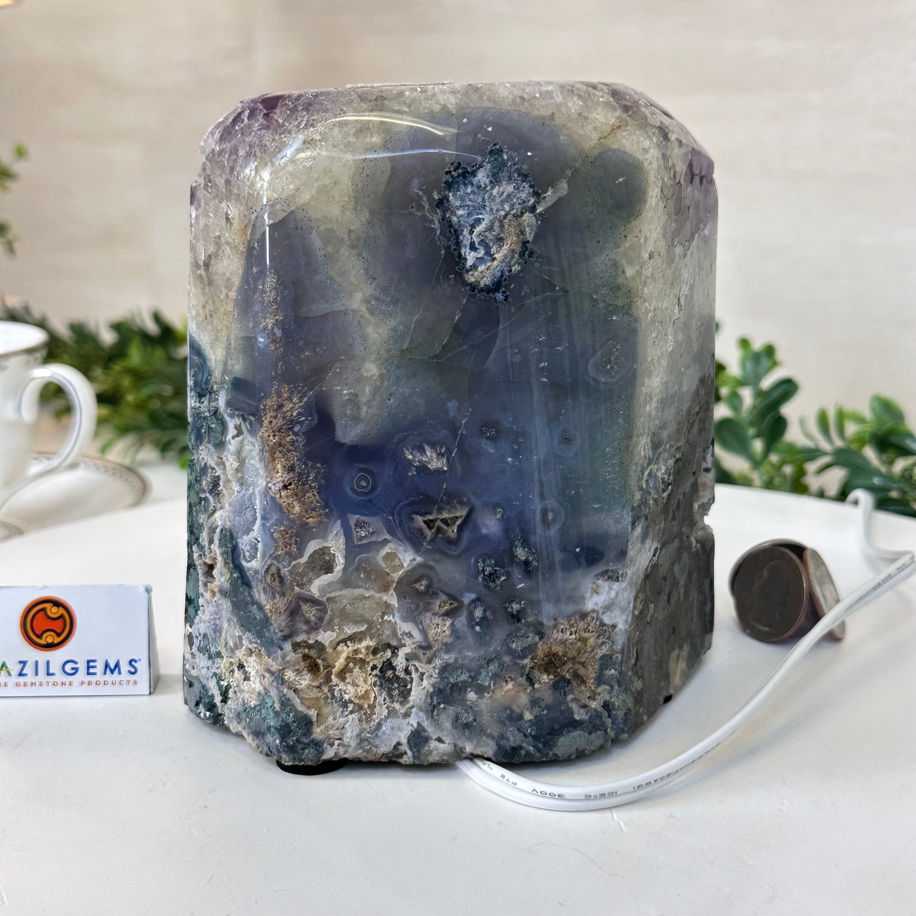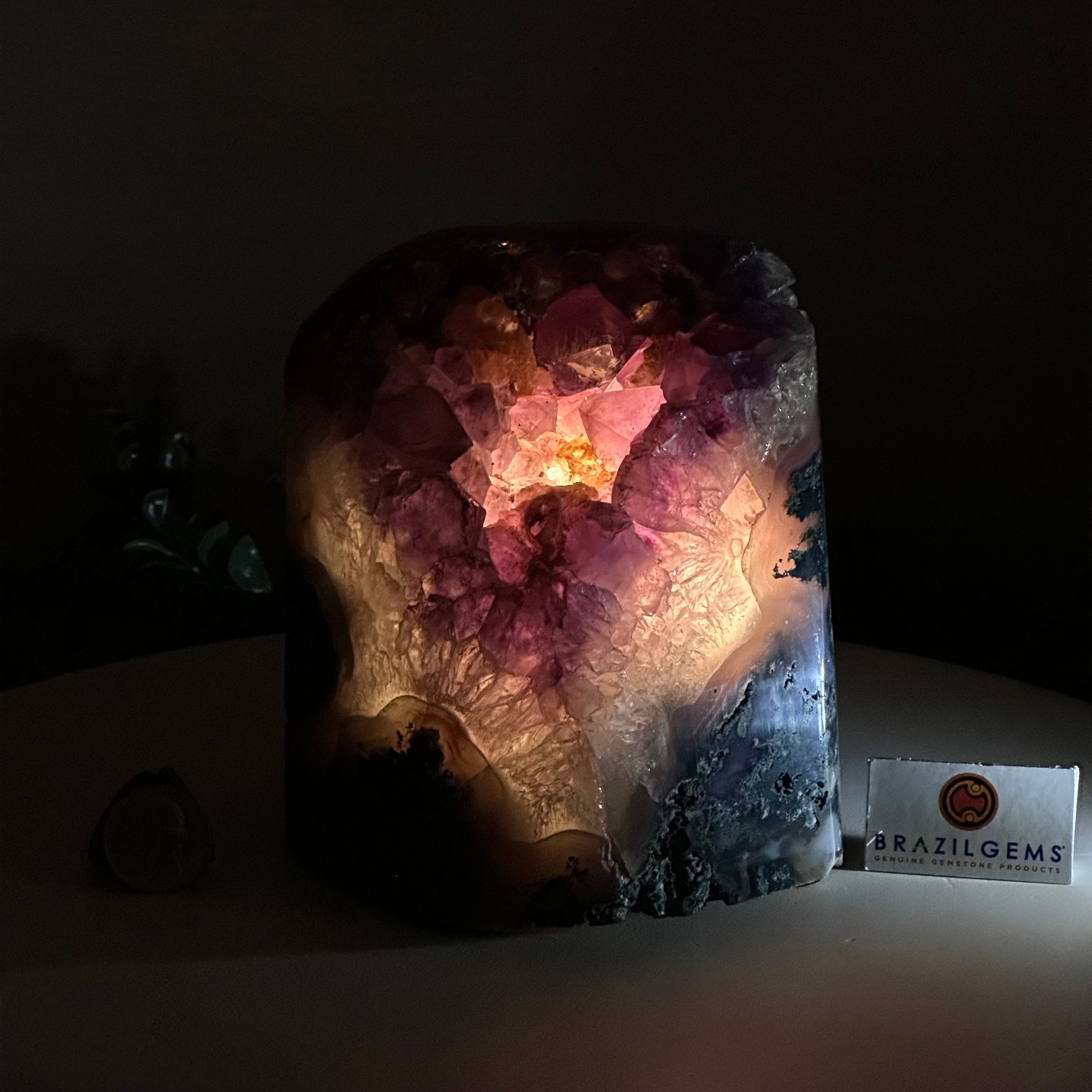 Disclaimer: This is a natural gemstone crystal sold by Brazil Gems® as is and as you see it in its images and video. It is the exact one you will receive. It may contain natural imperfections and/or imperfections, broken edges and repairs from the extraction, polishing, drilling and prepping processes. The underside has a drilled hole to accommodate a typical sized corded C7 LED light (included and removable) or battery operated LED tea light (not included). At Brazil Gems® we make every effort to get measurements as exact as possible but they are done by human hands and eyes and therefore may have minor discrepancies.