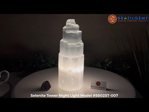 Discover the enchanting Selenite Tower Crystal Night Light from Brazil Gems®, featuring a concealed corded LED light with an on/off switch. This exquisite piece showcases a distinctive rough tiered texture in translucent white.
