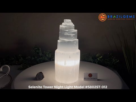 Discover the enchanting Selenite Tower Crystal Night Light from Brazil Gems®, featuring a concealed corded LED light with an on/off switch. This exquisite piece showcases a distinctive rough tiered texture in translucent white.