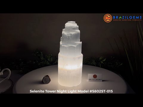 Discover the enchanting Selenite Tower Crystal Night Light from Brazil Gems®, featuring a concealed corded LED light with an on/off switch. This exquisite piece showcases a distinctive rough tiered texture in translucent white.