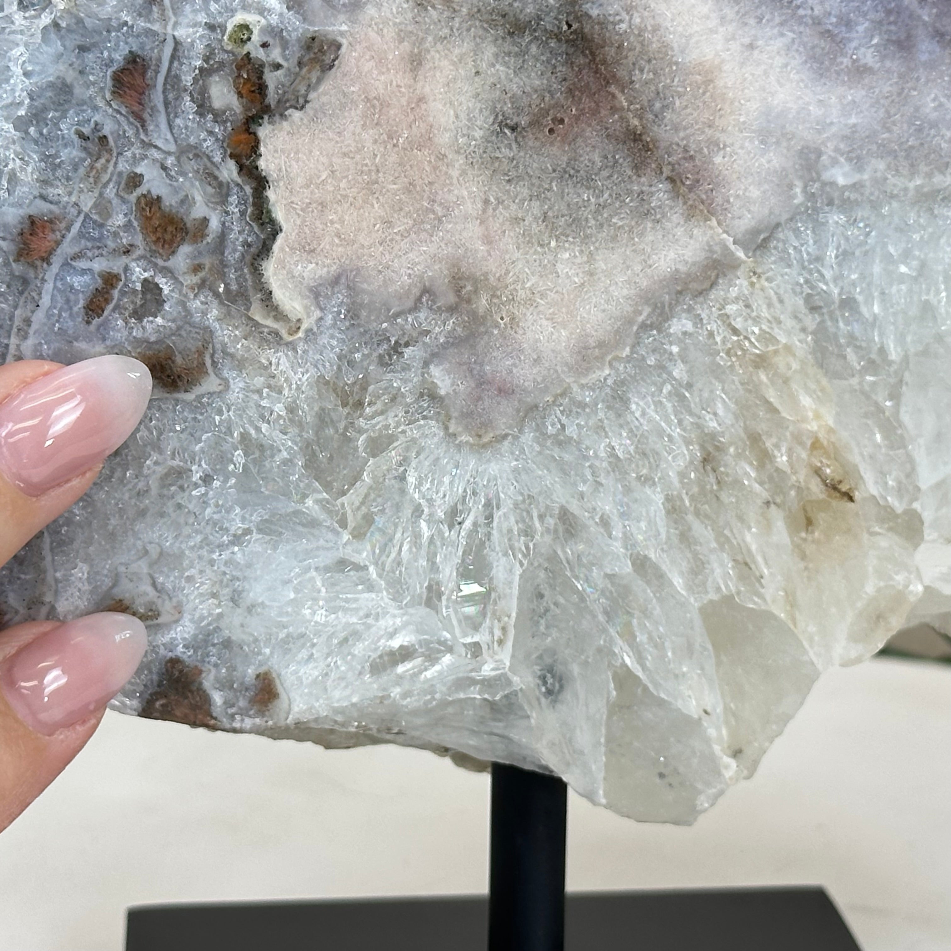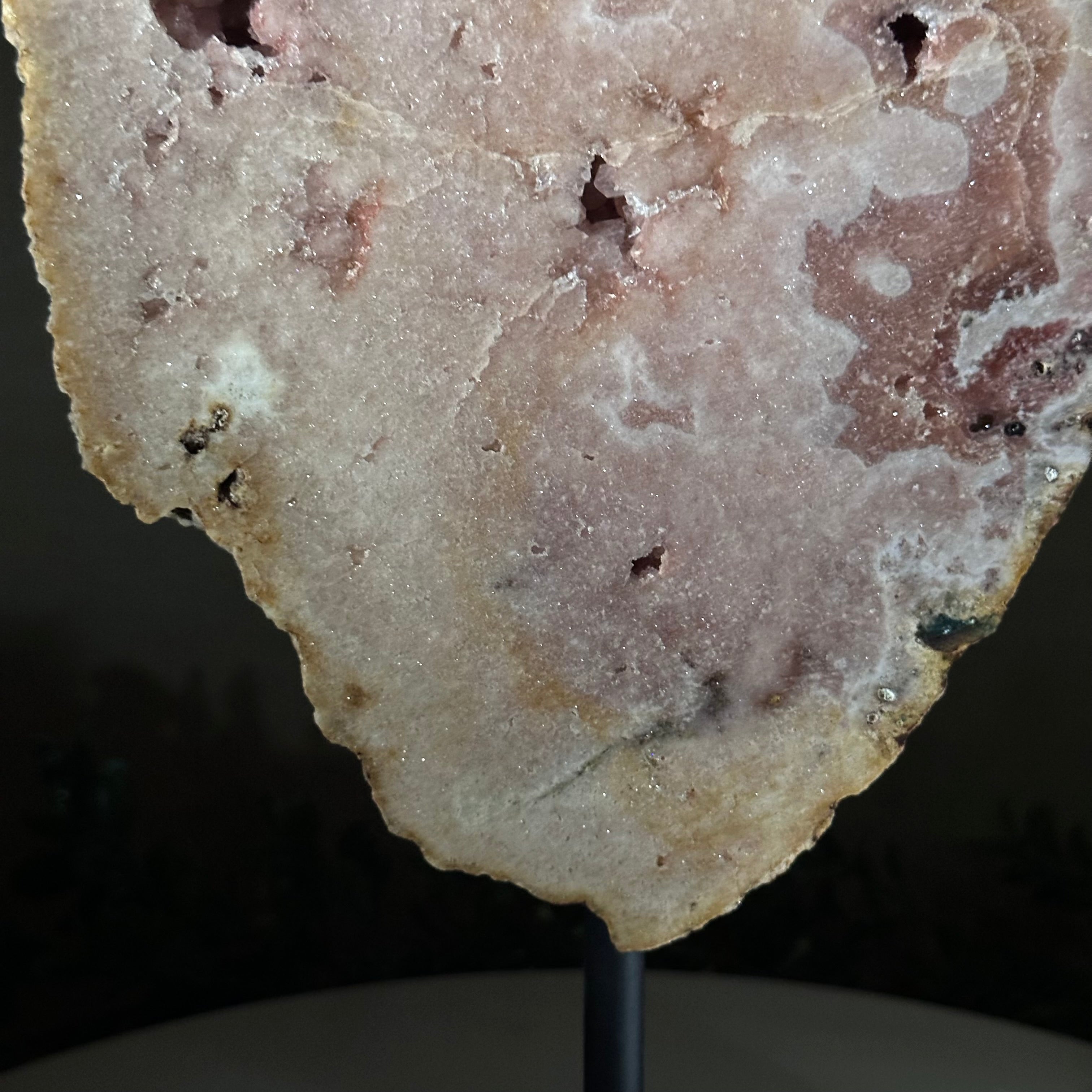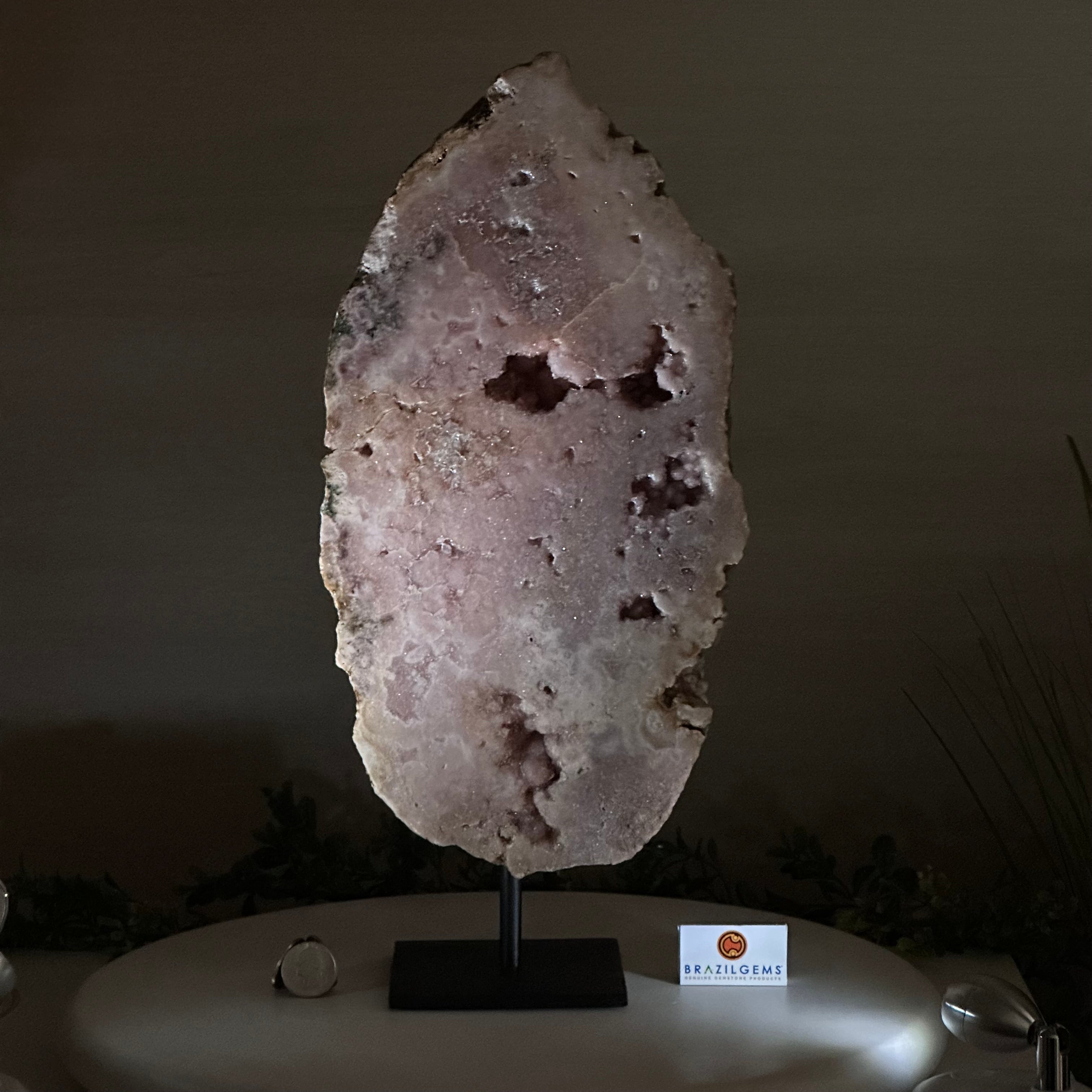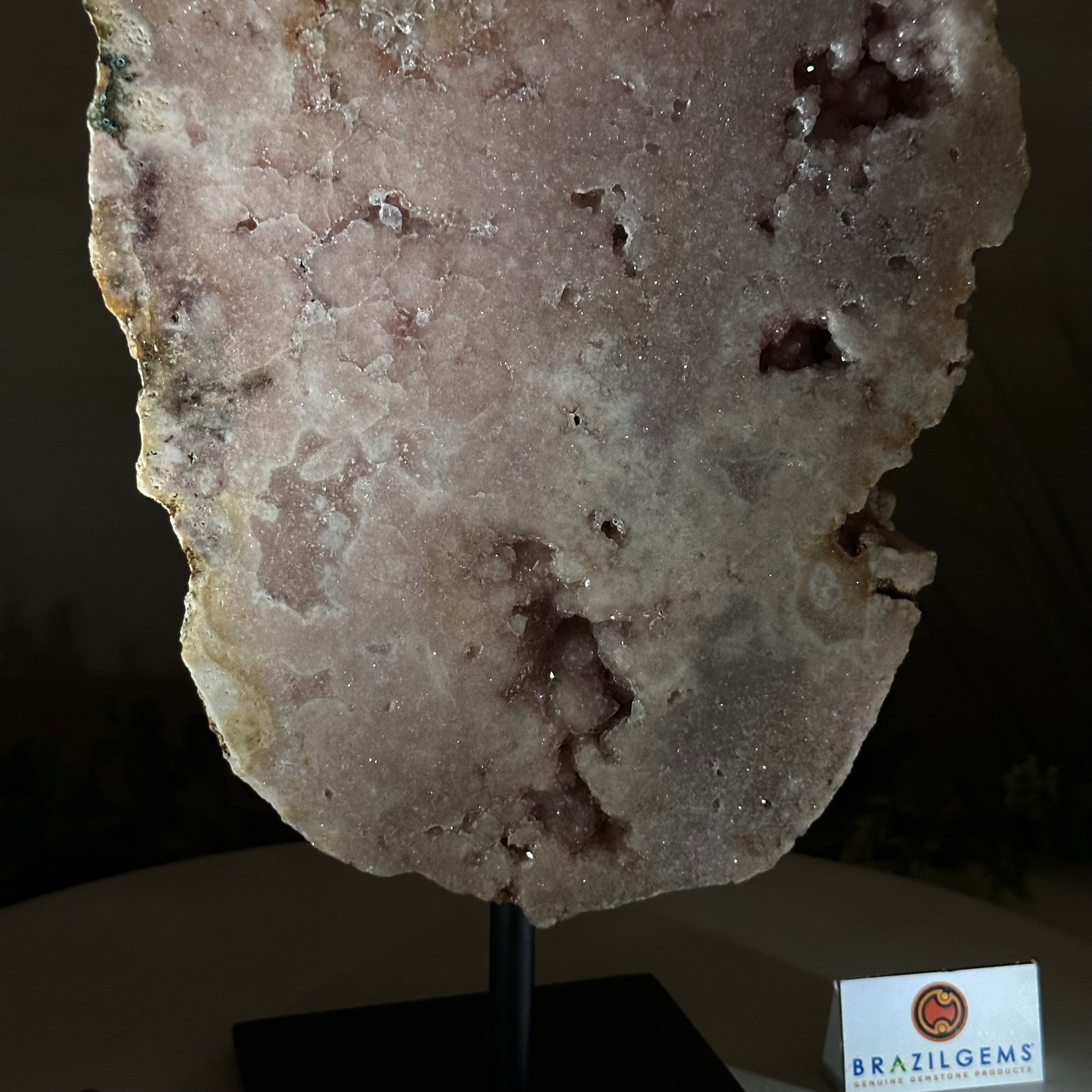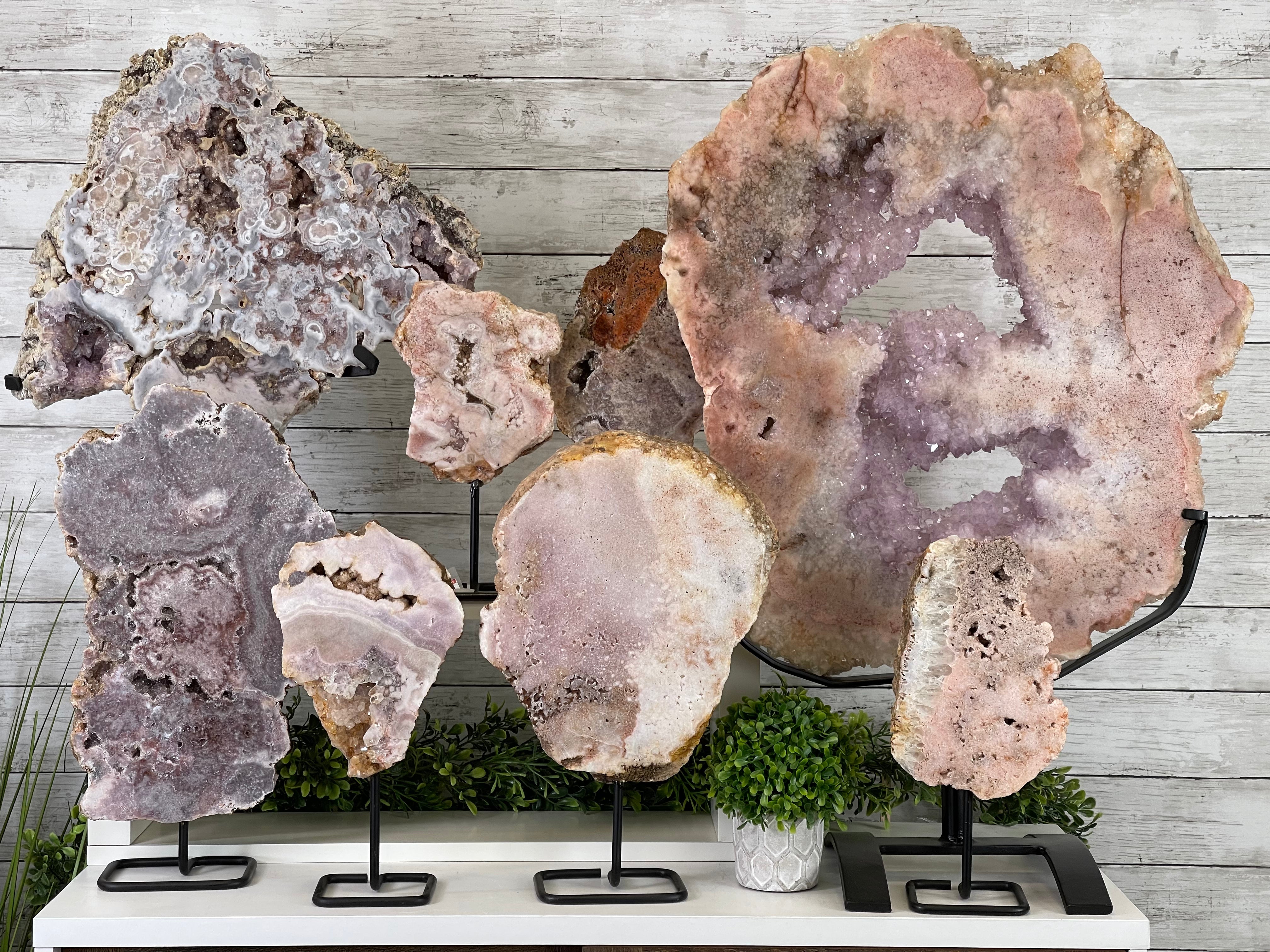Natural Brazilian Pink Amethyst Slices on metal bases will accent the decor of your home or office. Discover our collection of Pink Amethyst Slices.