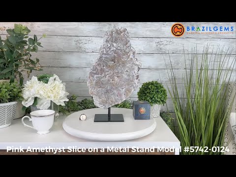 This is a Polished Brazilian Pink Amethyst Slice on a metal stand. This natural piece will accent the décor of any room and can be enjoyed on a shelf or desk. One side has been polished smooth and the other side is still in its natural rough form.