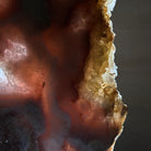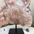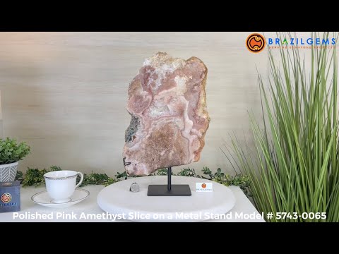 Enhance your room's decor with this beautiful Polished Pink Amethyst Slice, featuring both a smooth front and back with natural rough edges. Display it on a table, shelf, or desk for a stunning and unique addition to any space. This natural slice on a stand will surely impress as a one-of-a-kind statement piece.