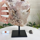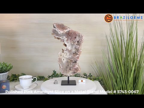 Enhance your room's decor with this beautiful Polished Pink Amethyst Slice, featuring both a smooth front and back with natural rough edges. Display it on a table, shelf, or desk for a stunning and unique addition to any space. This natural slice on a stand will surely impress as a one-of-a-kind statement piece.
