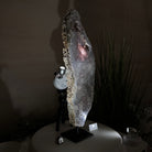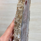 Enhance your room's decor with this beautiful Polished Pink Amethyst Slice, featuring both a smooth front and back with natural rough edges. Display it on a table, shelf, or desk for a stunning and unique addition to any space. This natural slice on a stand will surely impress as a one-of-a-kind statement piece.