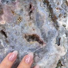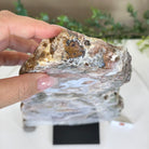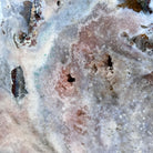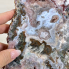 Enhance your room's decor with this beautiful Polished Pink Amethyst Slice, featuring both a smooth front and back with natural rough edges. Display it on a table, shelf, or desk for a stunning and unique addition to any space. This natural slice on a stand will surely impress as a one-of-a-kind statement piece.