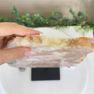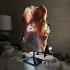 Enhance your room's decor with this beautiful Polished Pink Amethyst Slice, featuring both a smooth front and back with natural rough edges. Display it on a table, shelf, or desk for a stunning and unique addition to any space. This natural slice on a stand will surely impress as a one-of-a-kind statement piece.