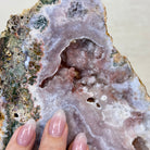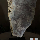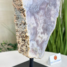 Enhance your room's decor with this beautiful Polished Pink Amethyst Slice, featuring both a smooth front and back with natural rough edges. Display it on a table, shelf, or desk for a stunning and unique addition to any space. This natural slice on a stand will surely impress as a one-of-a-kind statement piece.