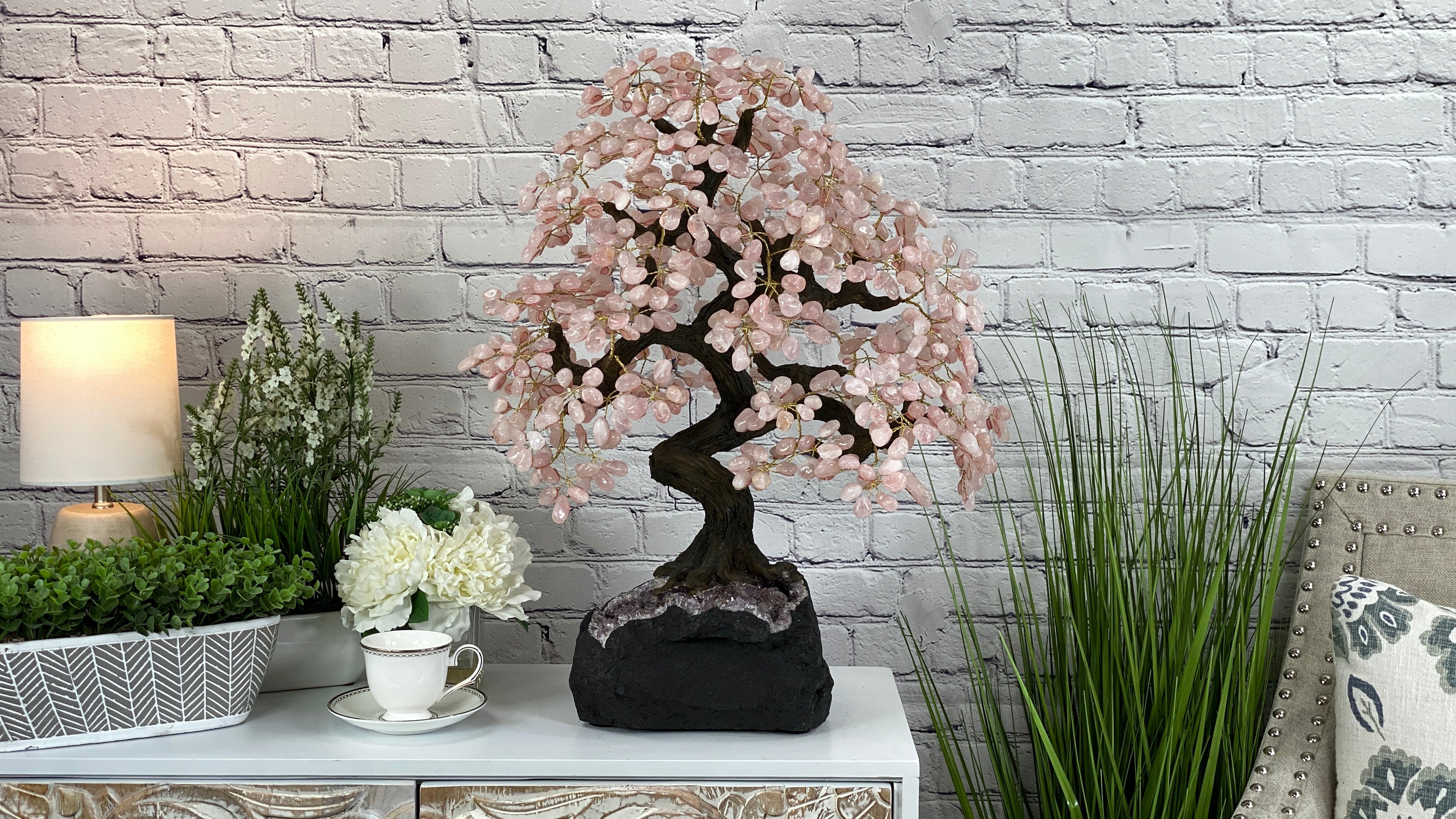 Their bases have a hand-selected crystal cluster, chosen for its size and beauty, commanding attention and admiration. Crafted with meticulous care by skilled artisans, the resin trunk and delicately wired branches gracefully emerge, each branch meticulously adorned with lustrous tumbled Rose Quartz gemstones.