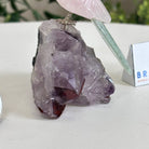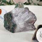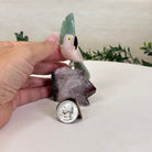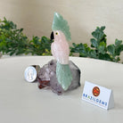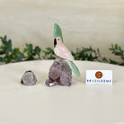 Marvel at our exquisite hand-carved X-Small Size Cockatoo gemstone bird perched on a captivating Amethyst cluster base, a harmonious blend of nature, art, and elegance. Crafted from premium Rose Quartz for its body, Black Onyx for its beak, Green Quartz for its crest and its tail and adorned with cute little metal feet, this stunning sculpture captures the essence of nature's beauty.