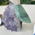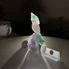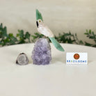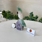 Marvel at our exquisite hand-carved X-Small Size Cockatoo gemstone bird perched on a captivating Amethyst cluster base, a harmonious blend of nature, art, and elegance. Crafted from premium Rose Quartz for its body, Black Onyx for its beak, Green Quartz for its crest and its tail and adorned with cute little metal feet, this stunning sculpture captures the essence of nature's beauty.