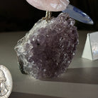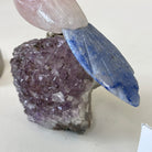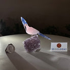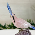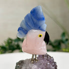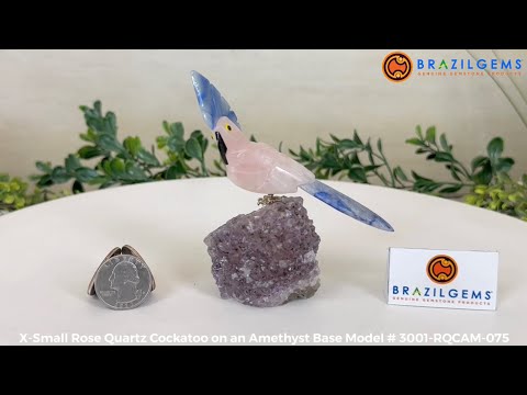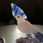Marvel at our exquisite hand-carved X-Small Size Cockatoo gemstone bird perched on a captivating Amethyst cluster base, a harmonious blend of nature, art, and elegance. Crafted from premium Rose Quartz for its body, Black Quartz for its beak, Blue Quartz for its crest, Blue Quartz for its tail and adorned with cute little metal feet, this stunning sculpture captures the essence of nature's beauty.