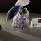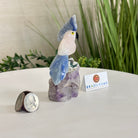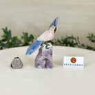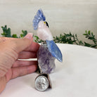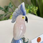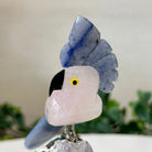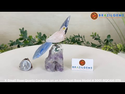 Marvel at our exquisite hand-carved X-Small Size Cockatoo gemstone bird perched on a captivating Amethyst cluster base, a harmonious blend of nature, art, and elegance. Crafted from premium Rose Quartz for its body, Black Onyx for its beak, Blue Quartz for its crest, Blue Quartz for its tail and adorned with cute little metal feet, this stunning sculpture captures the essence of nature's beauty.