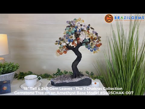7-Chakra Gemstone Tree on Crystal Cluster Base Handcrafted in Brazil, this striking gemstone tree stands approximately 18" tall and features a sturdy resin trunk with 48 gracefully arched wire branches. Adorned with 240 polished chakra gemstones, it beautifully represents these seven chakras: