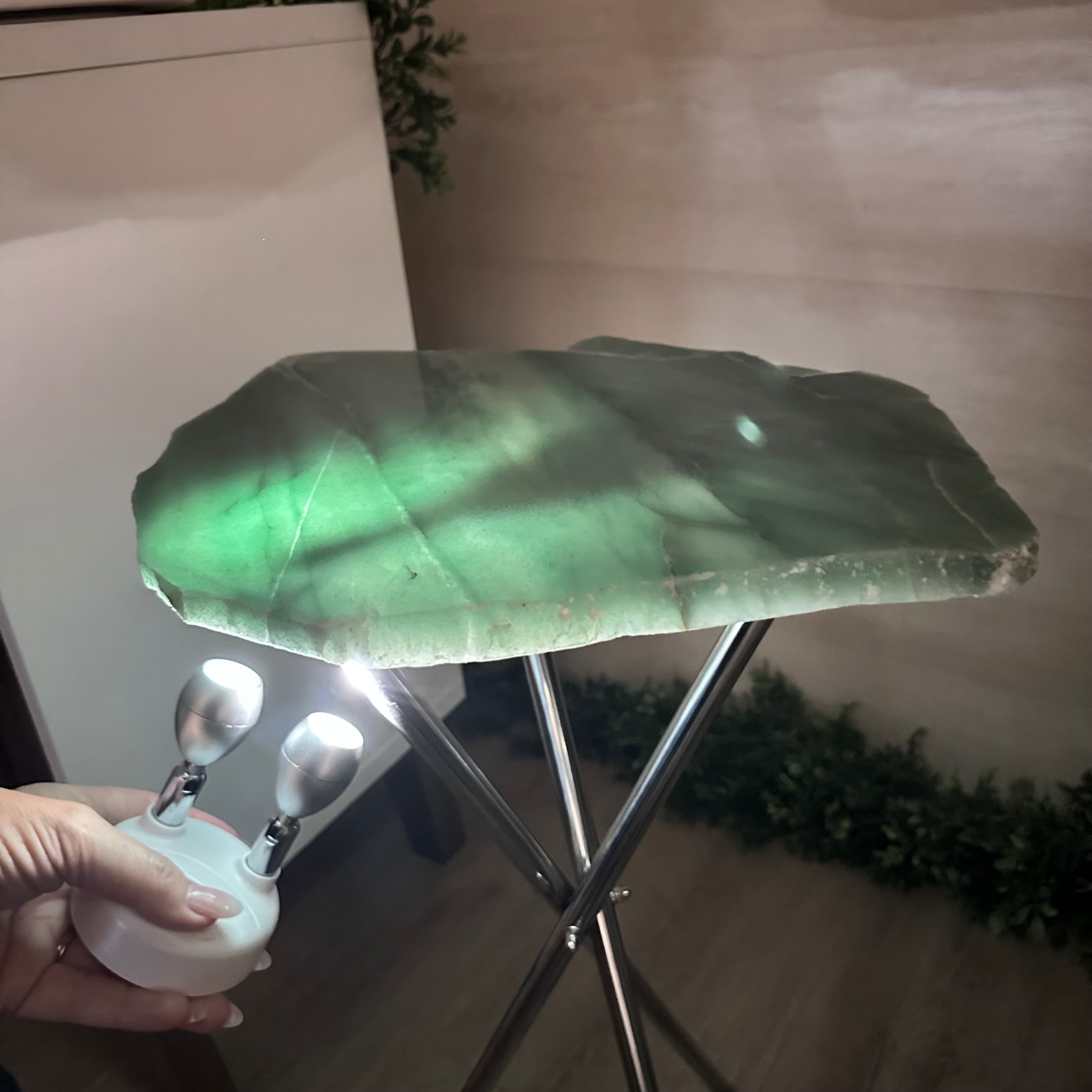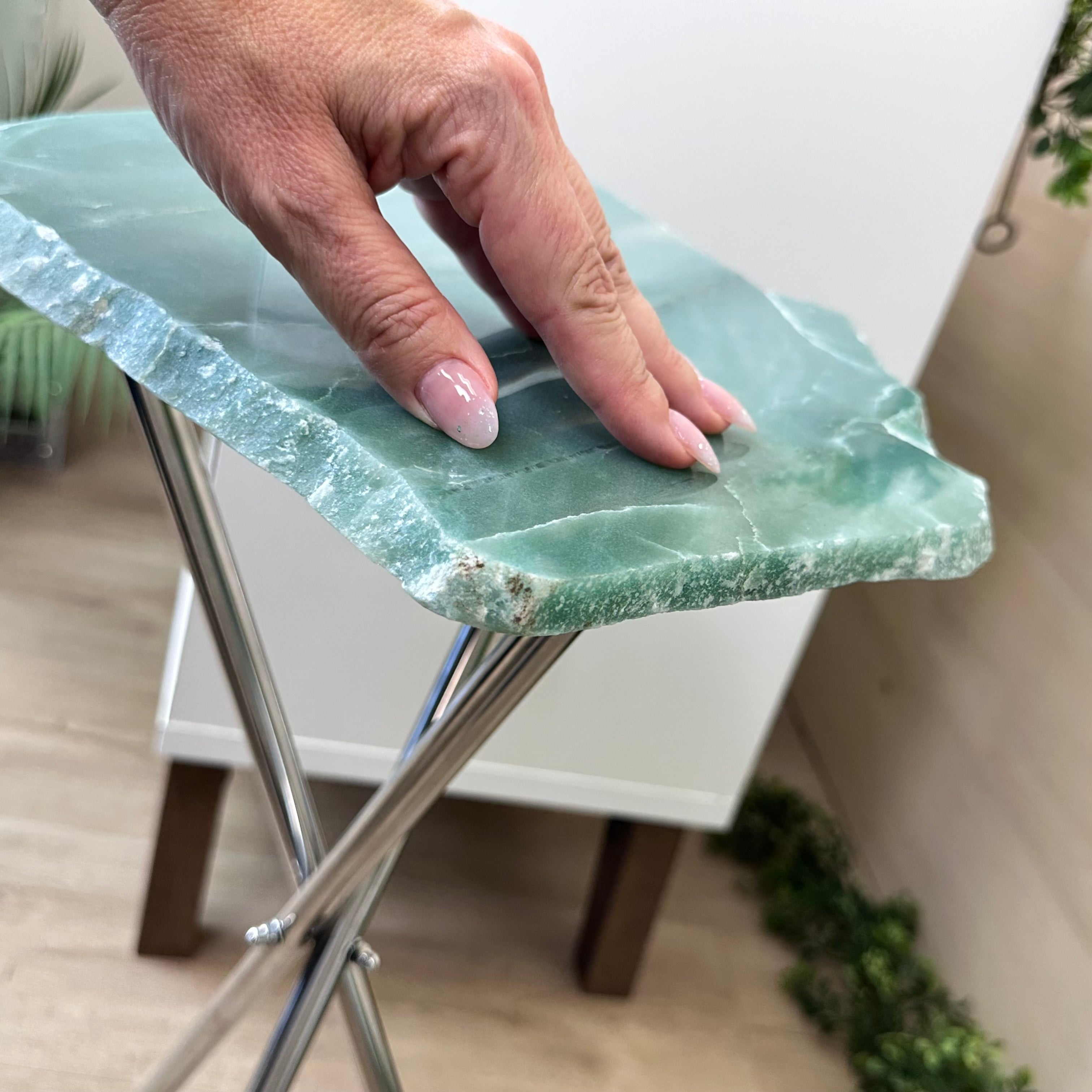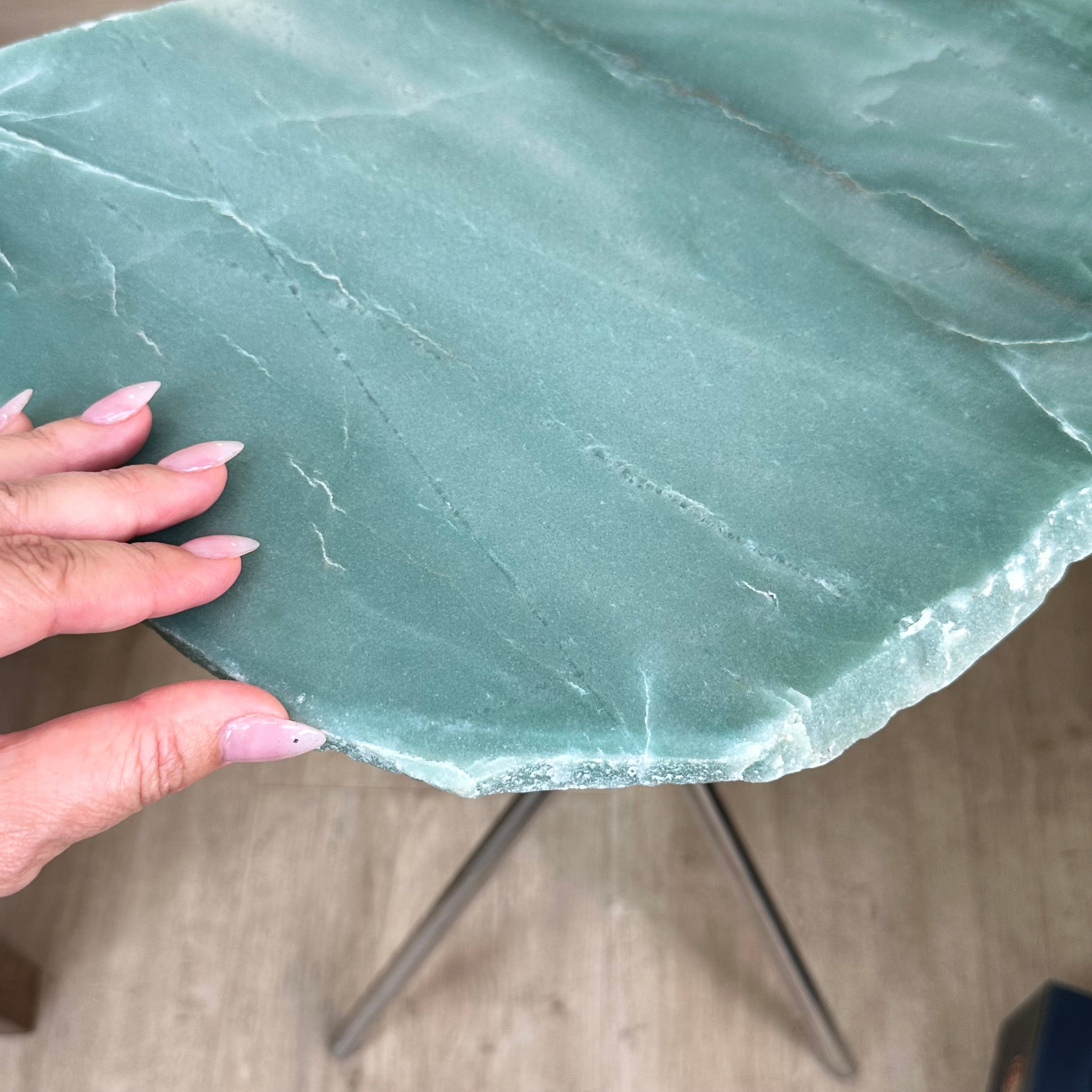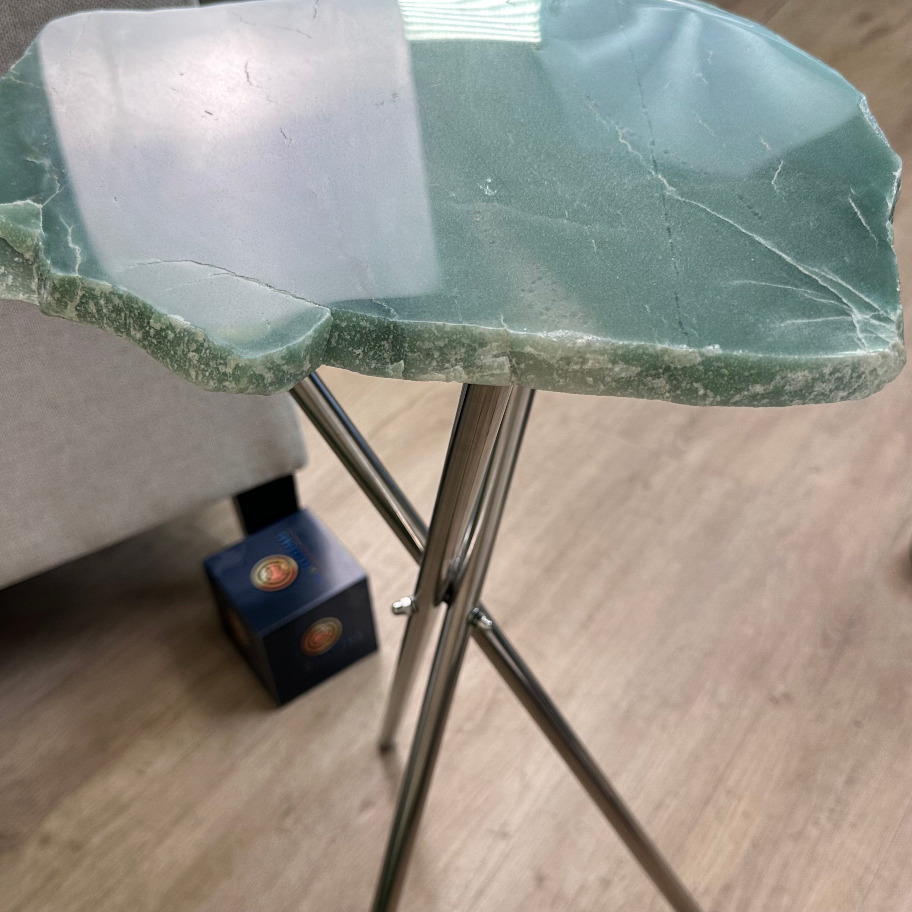 Large Natural Green Quartz Side Table w/ one slice of stone on a chrome metal base. An amazing vibrant specimen to accent the decor of your home.