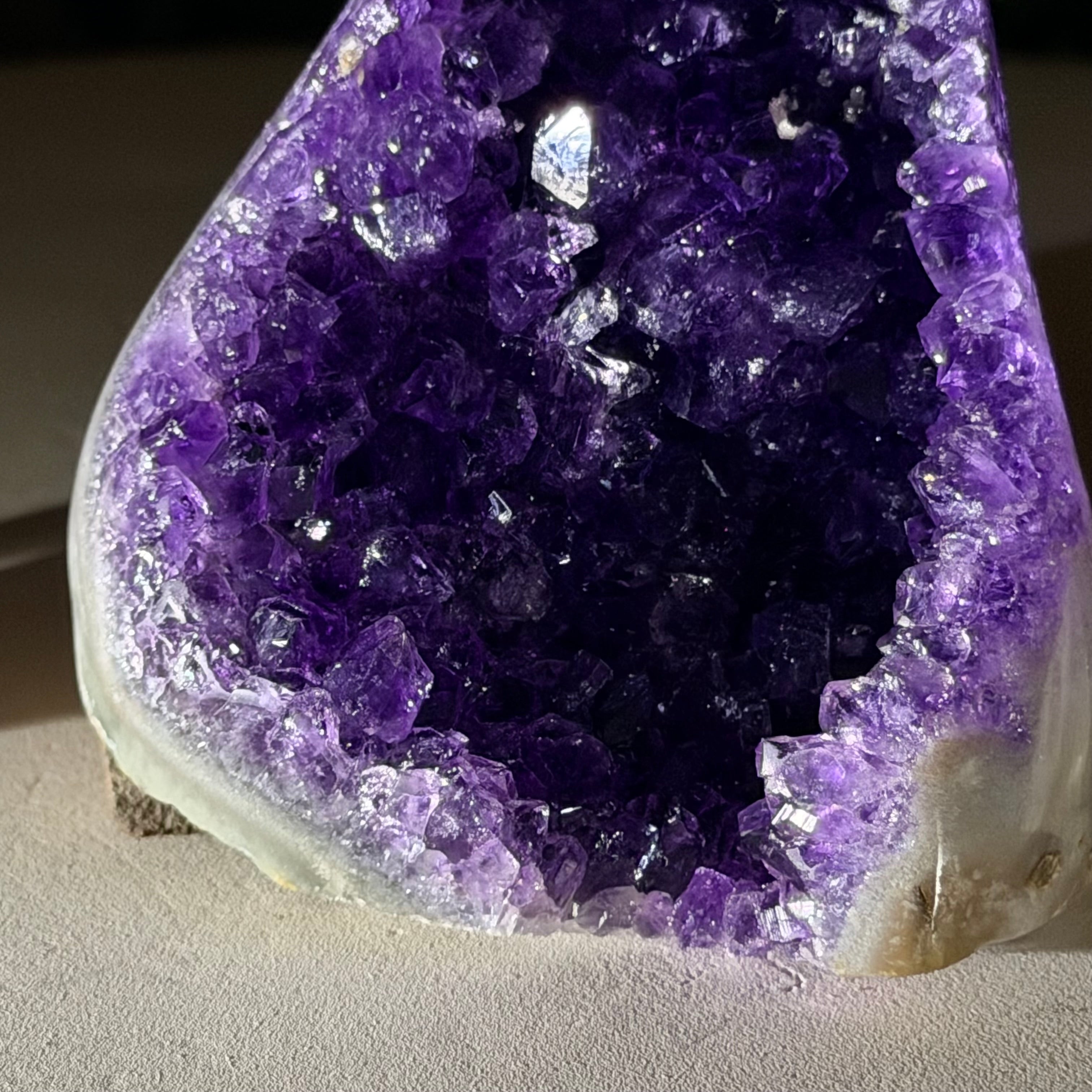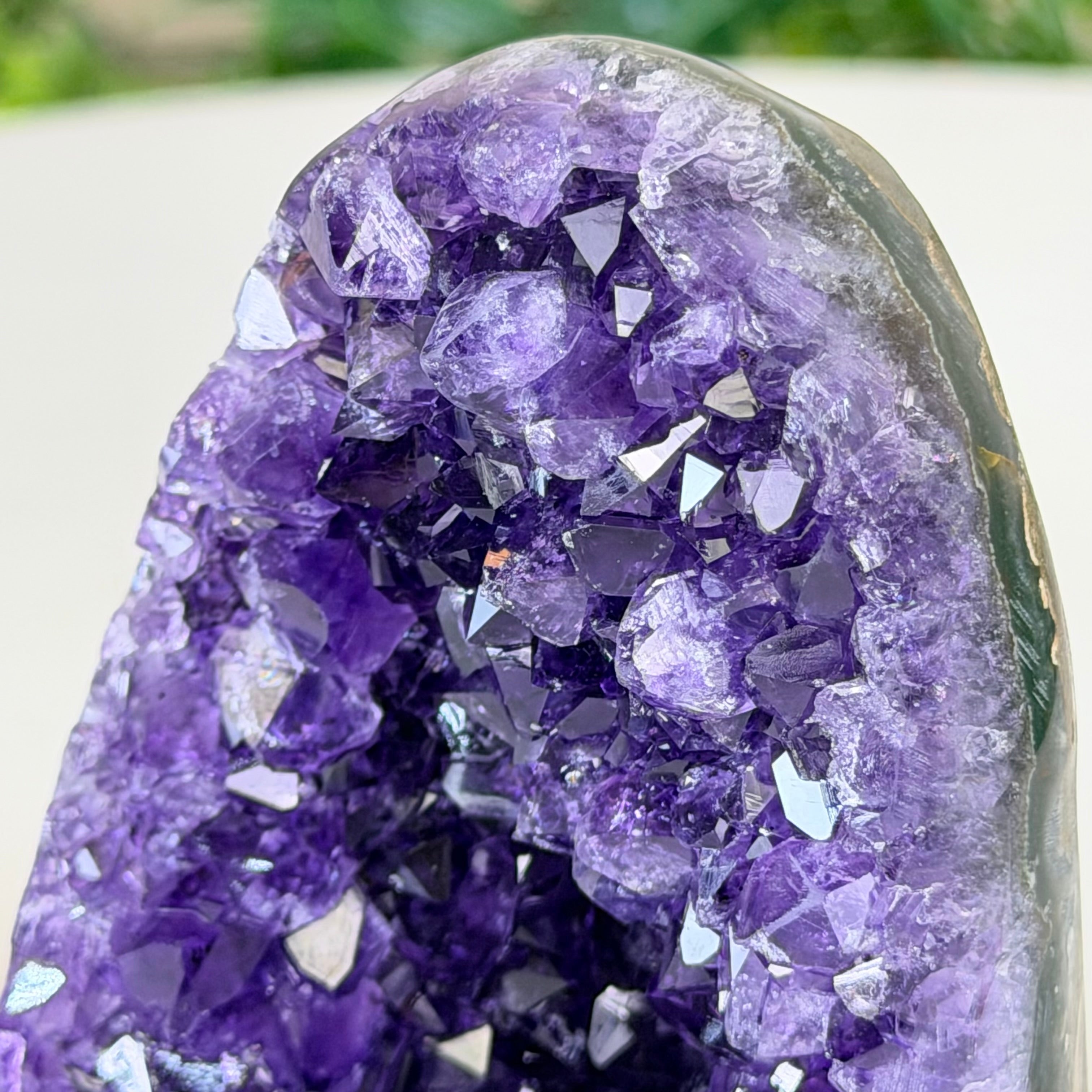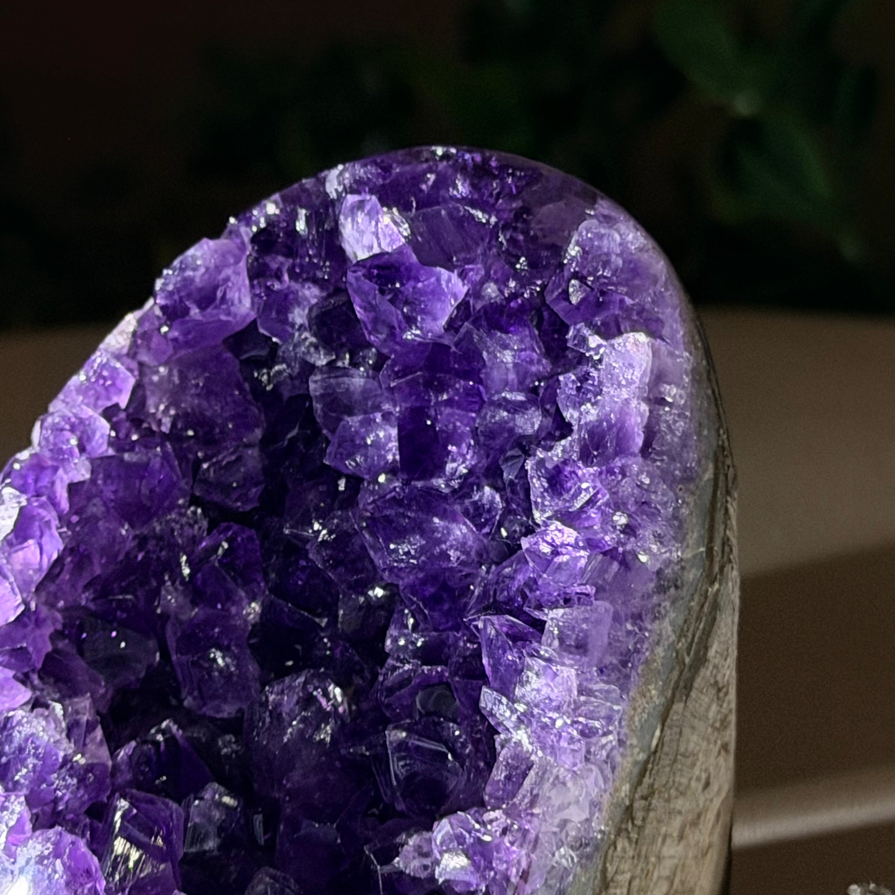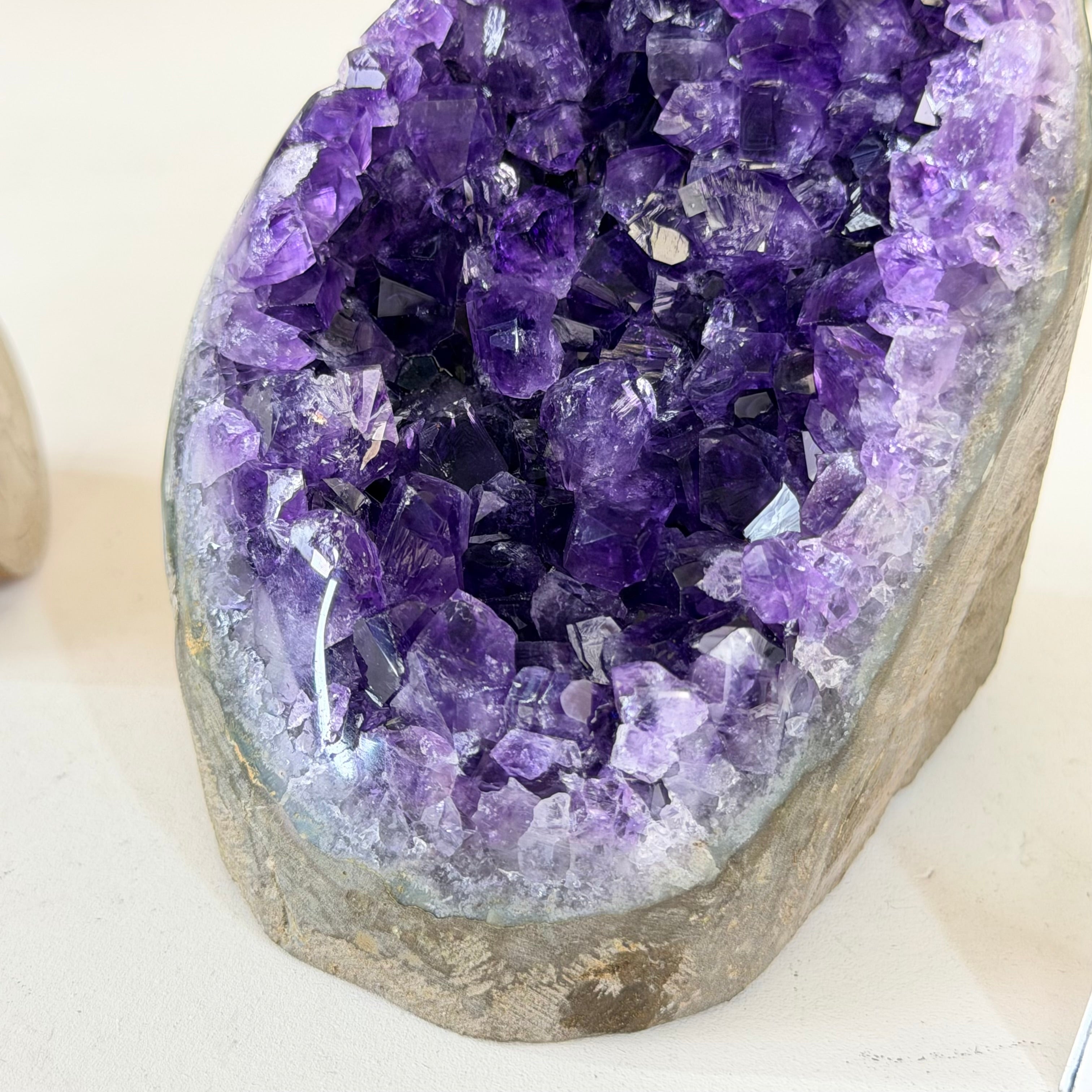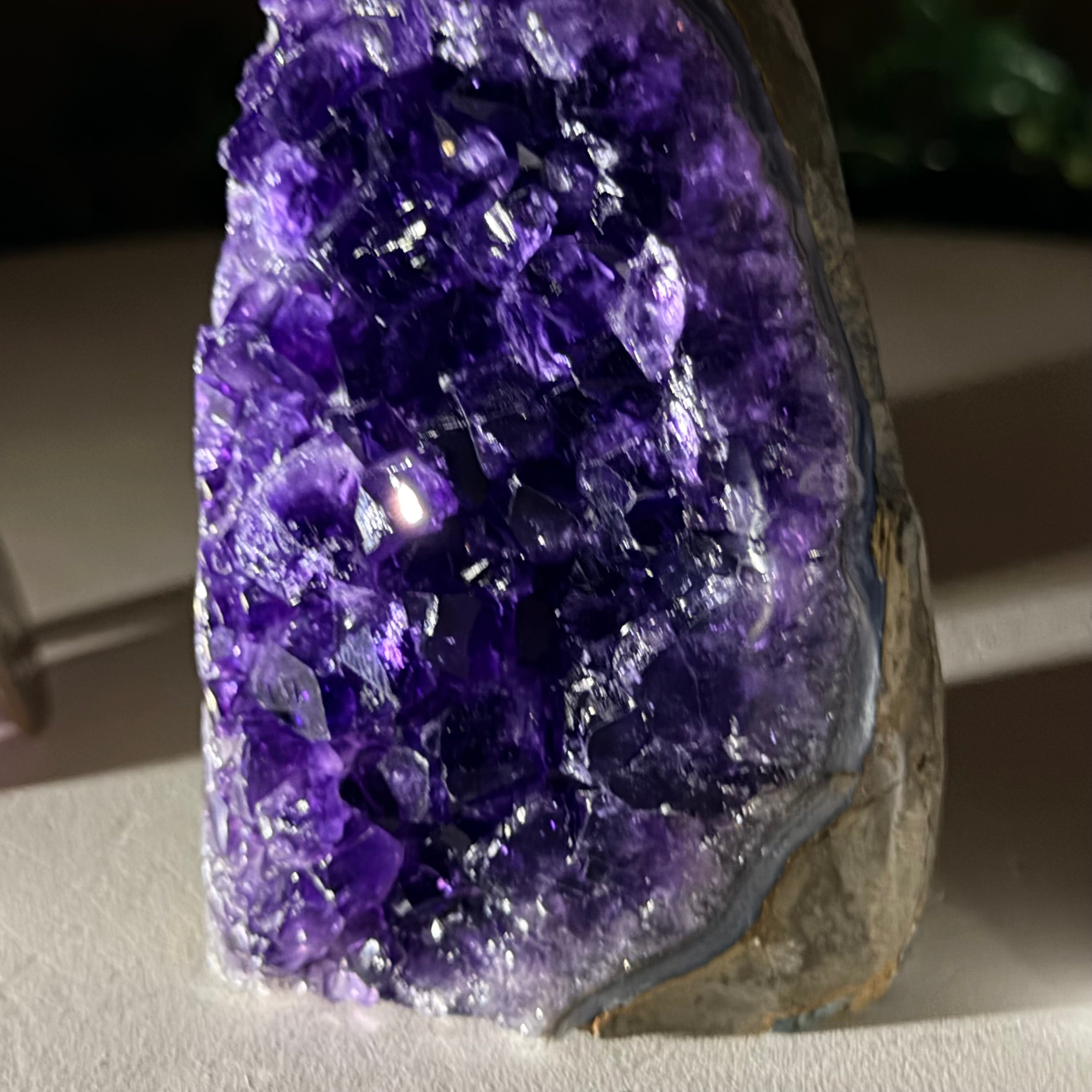 These clusters grow inside geodes–where mineral-rich water slowly deposits crystals over time. The result is a captivating arrangement of pointed amethyst crystals that can beautify any space.