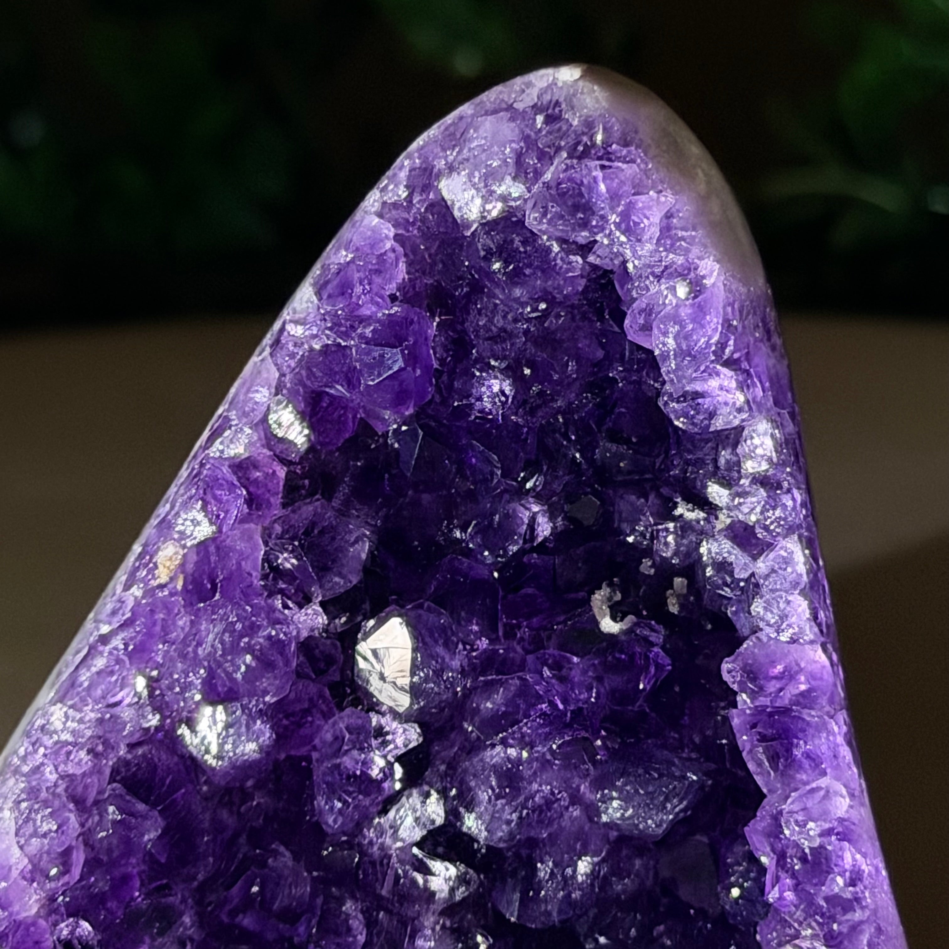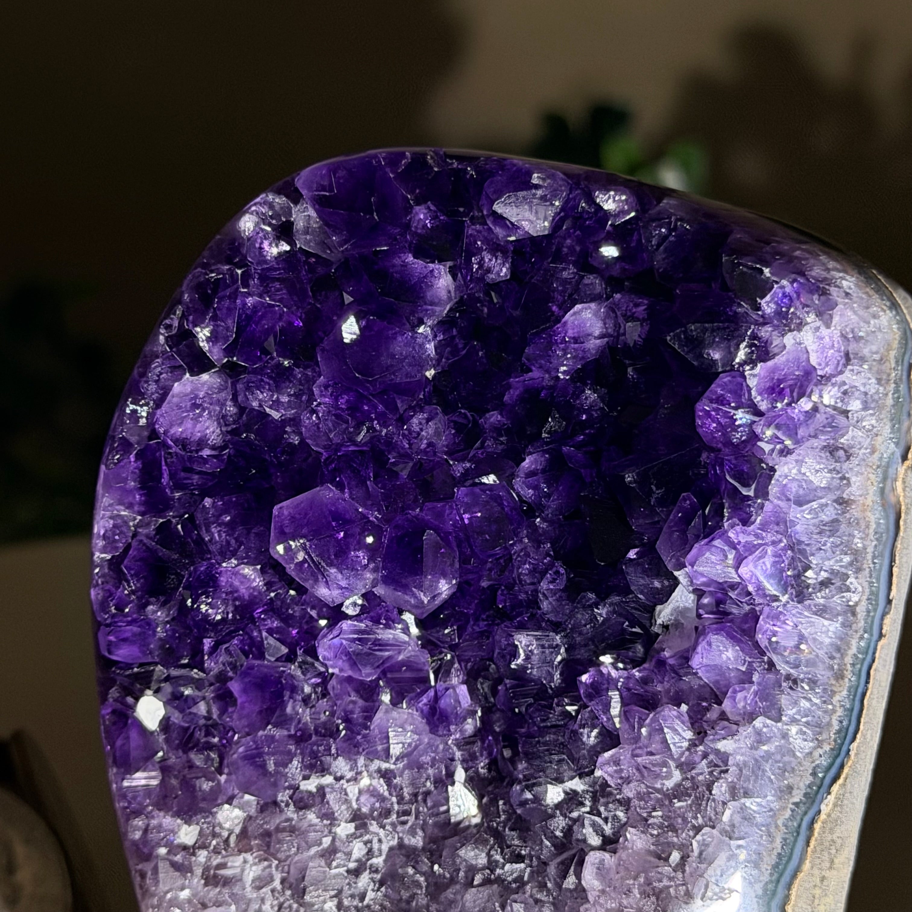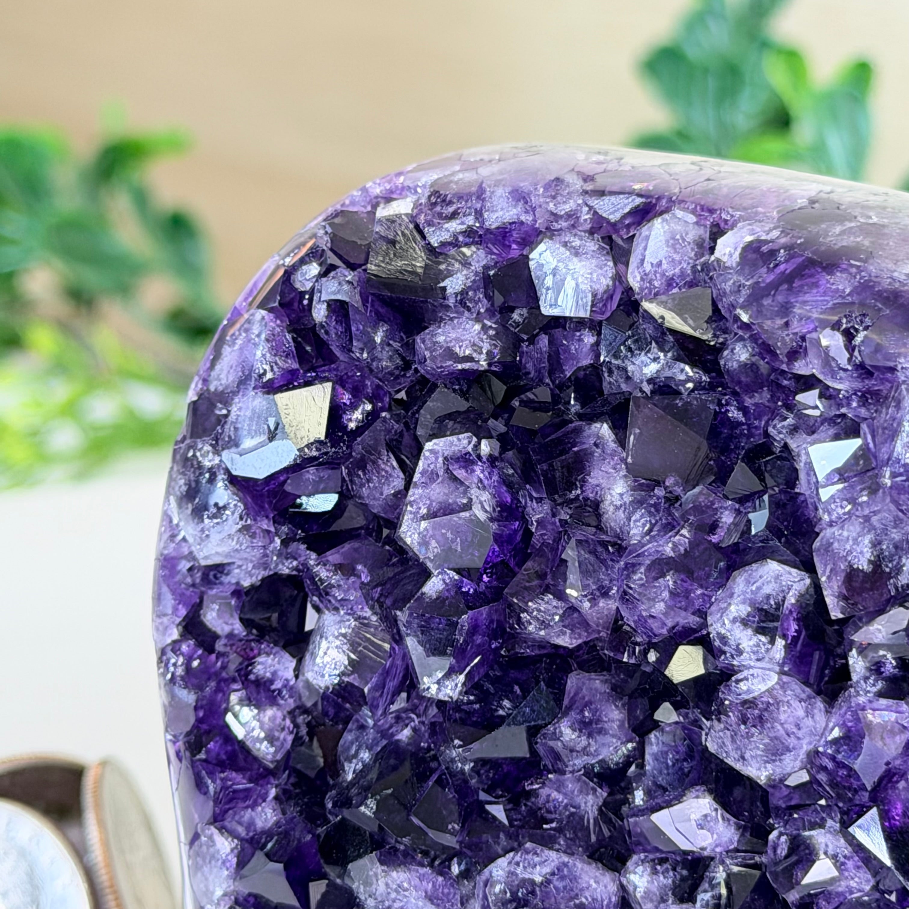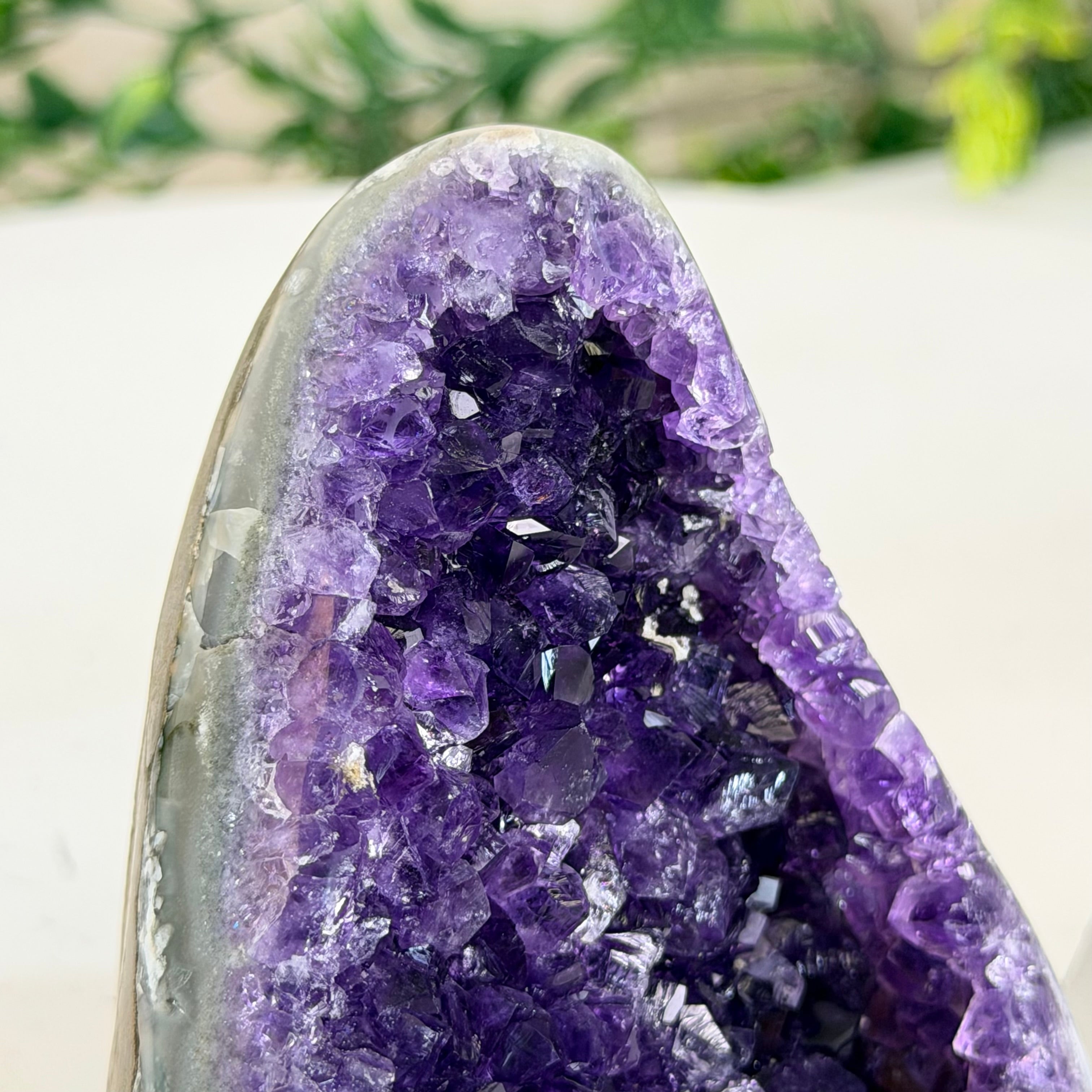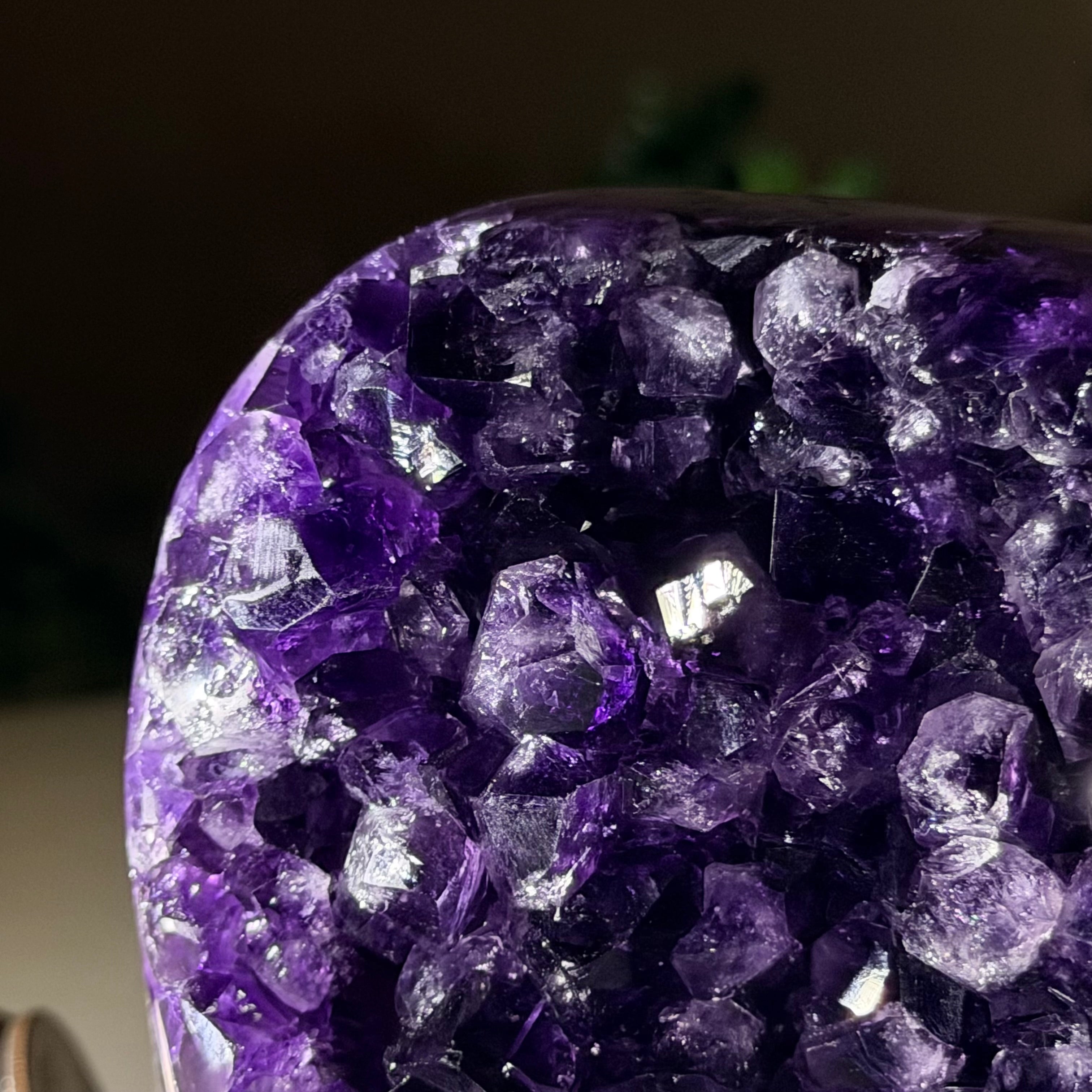 These clusters grow inside geodes–where mineral-rich water slowly deposits crystals over time. The result is a captivating arrangement of pointed amethyst crystals that can beautify any space.