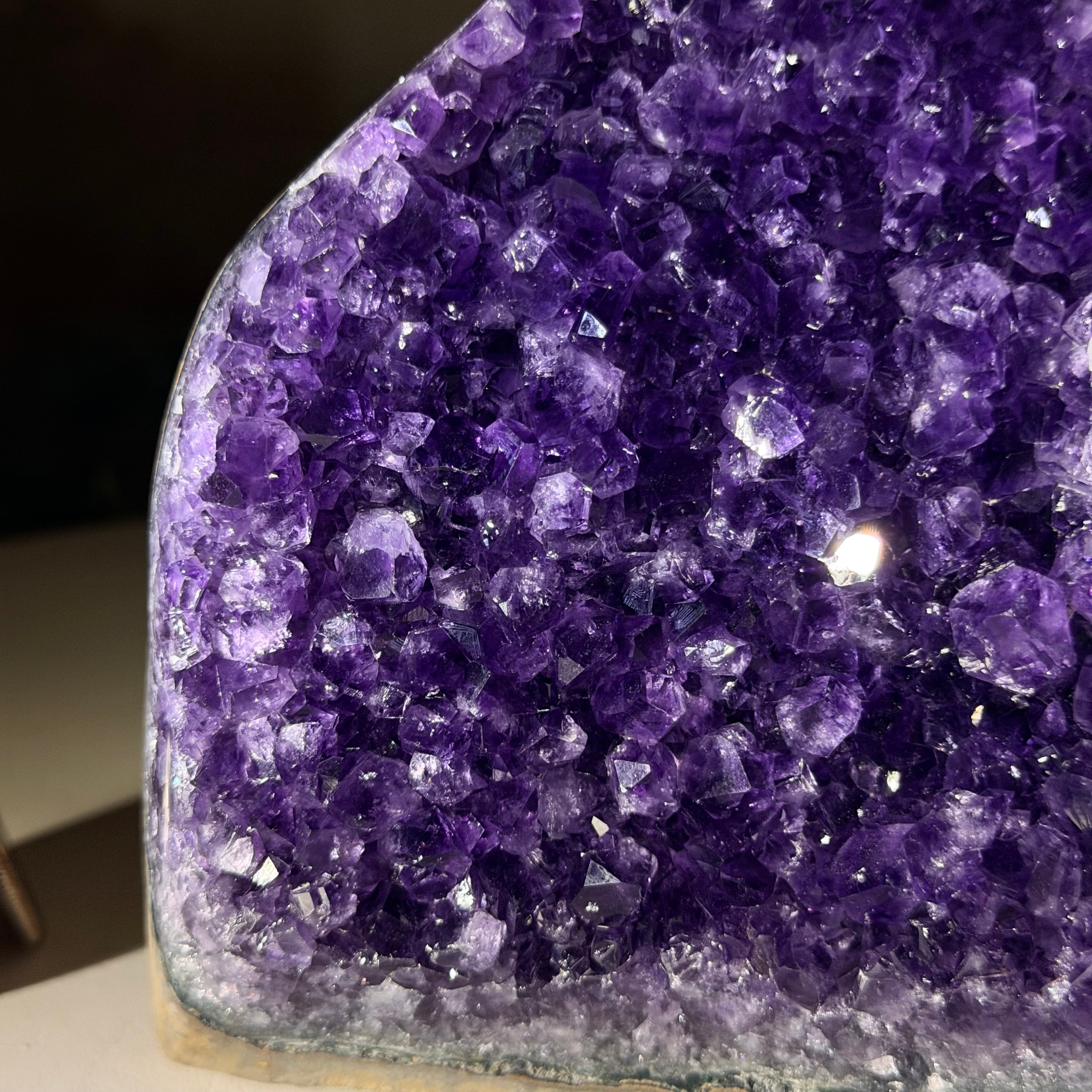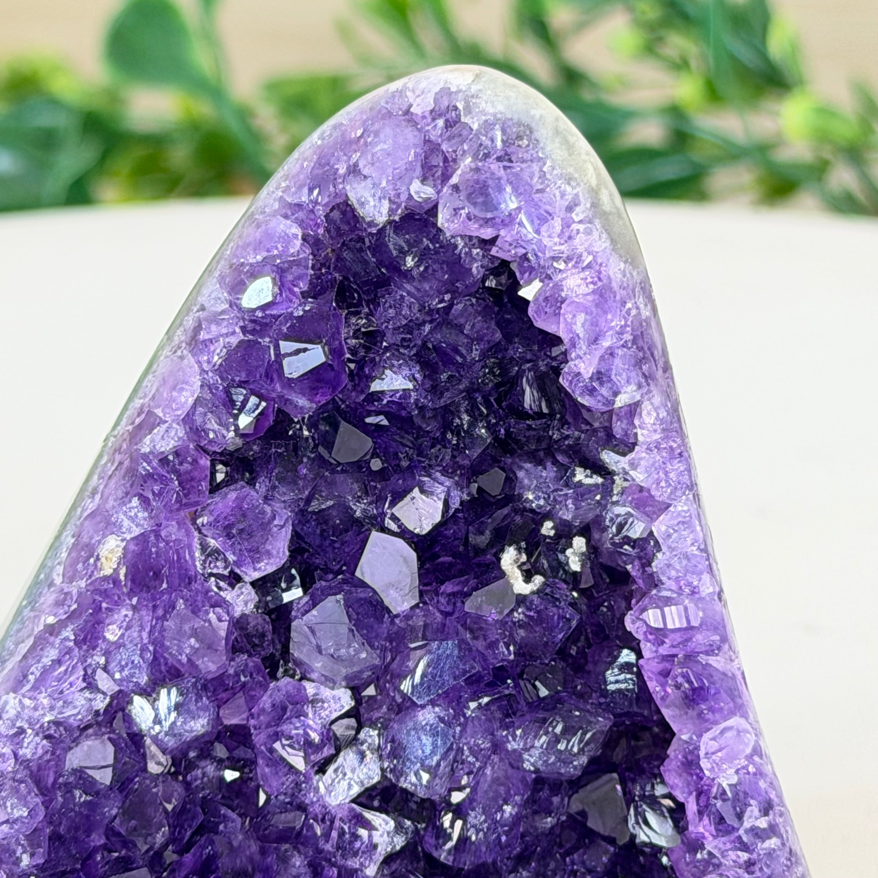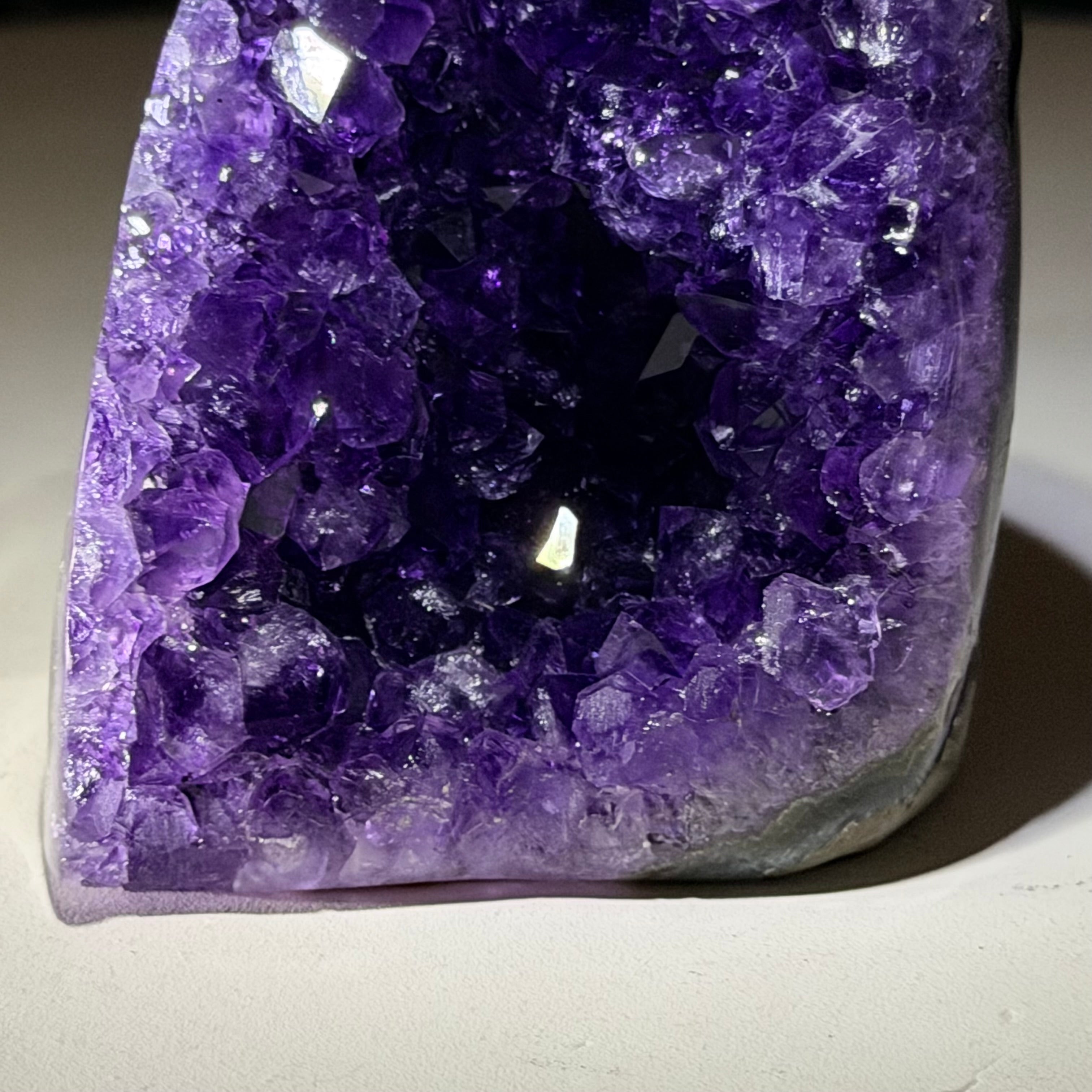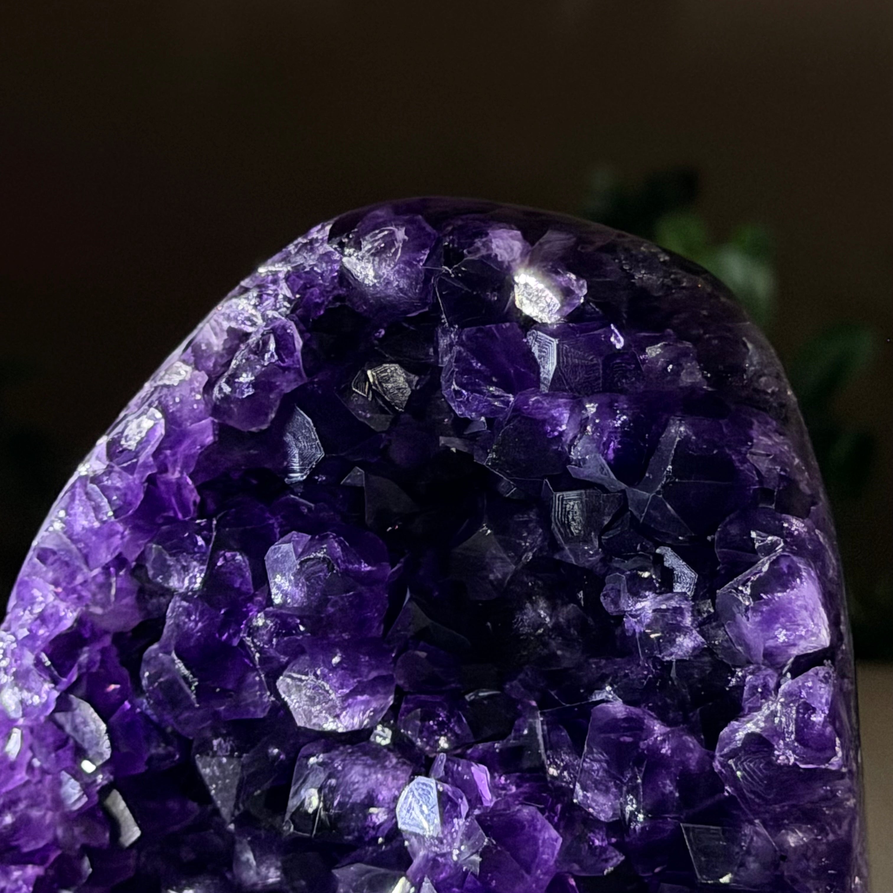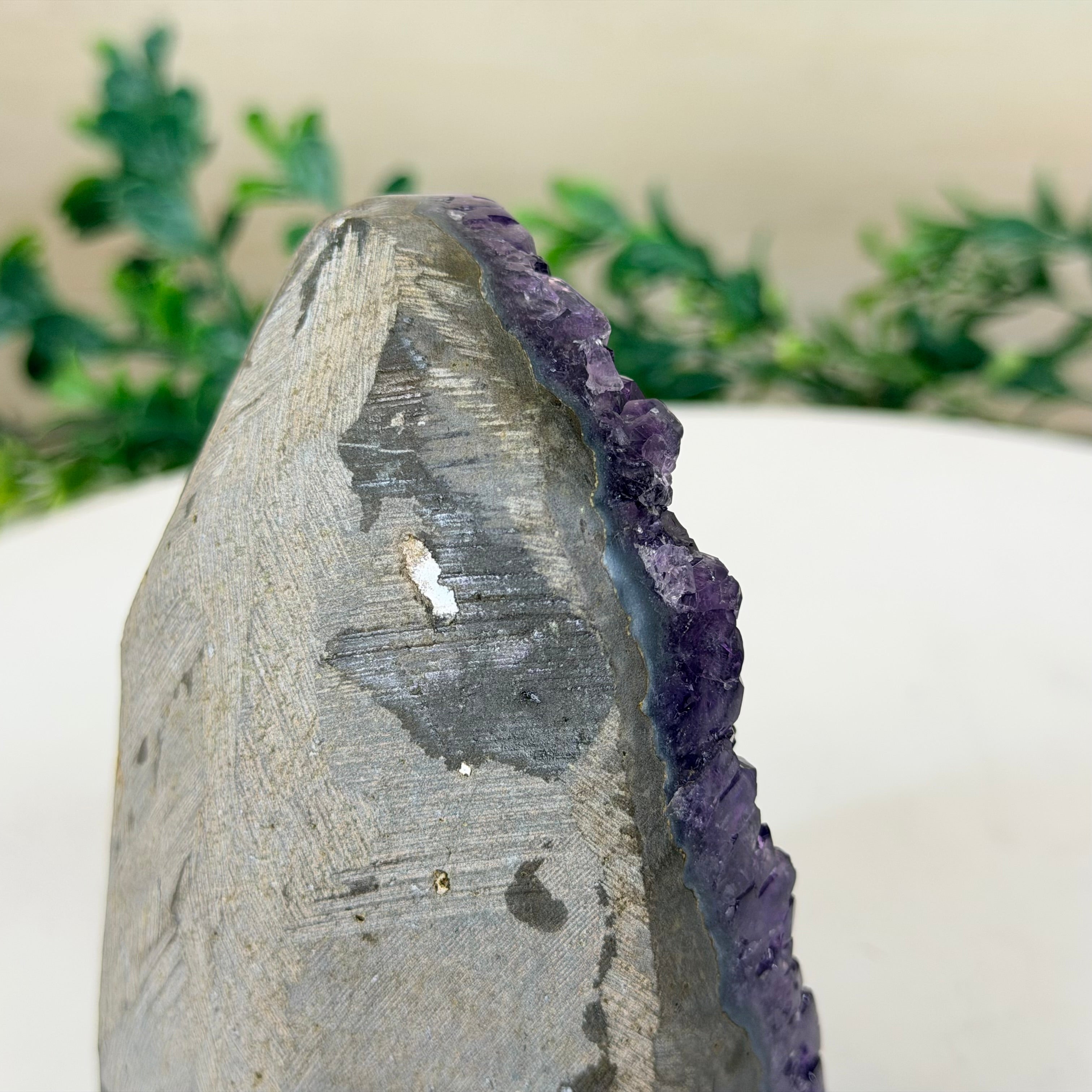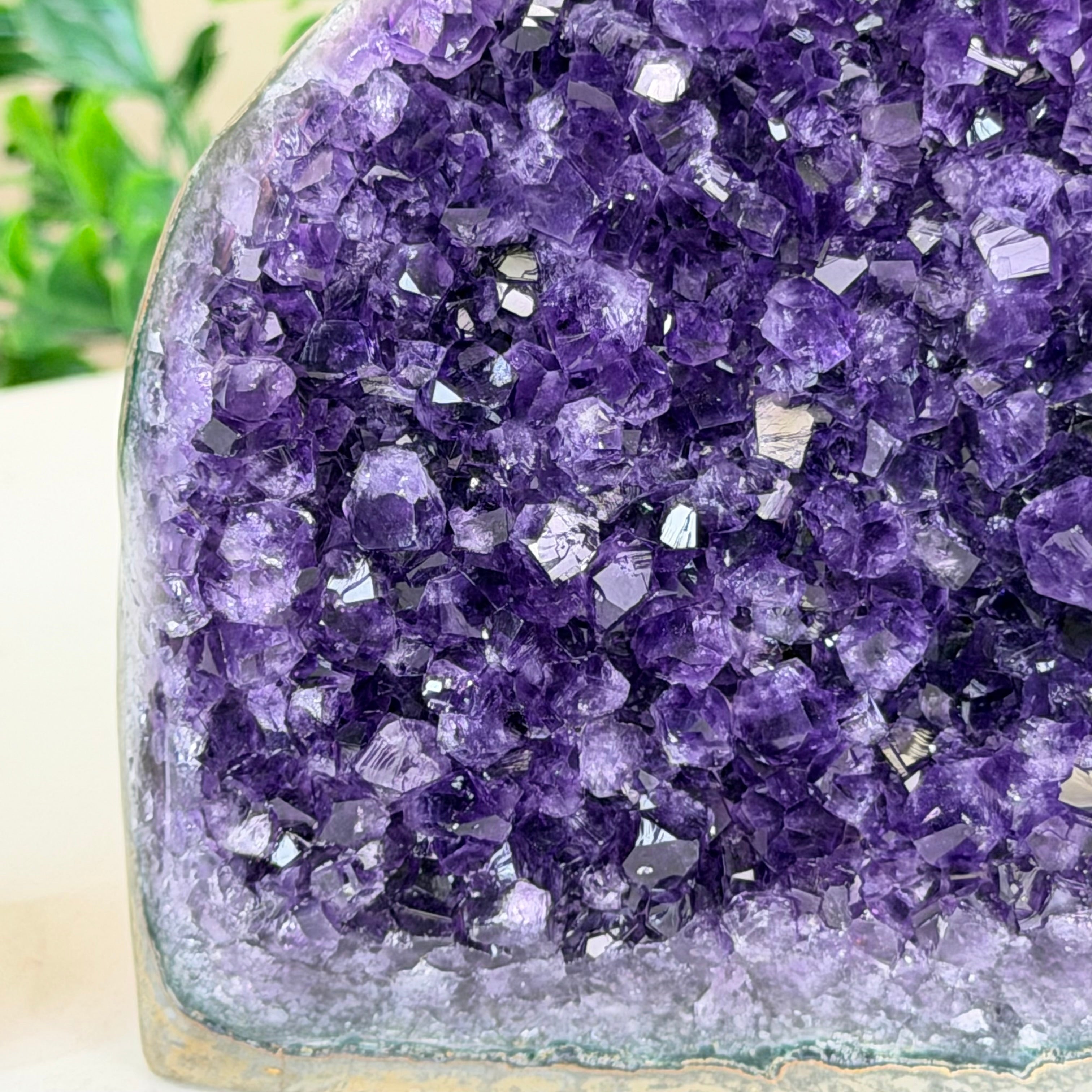 These clusters grow inside geodes–where mineral-rich water slowly deposits crystals over time. The result is a captivating arrangement of pointed amethyst crystals that can beautify any space.