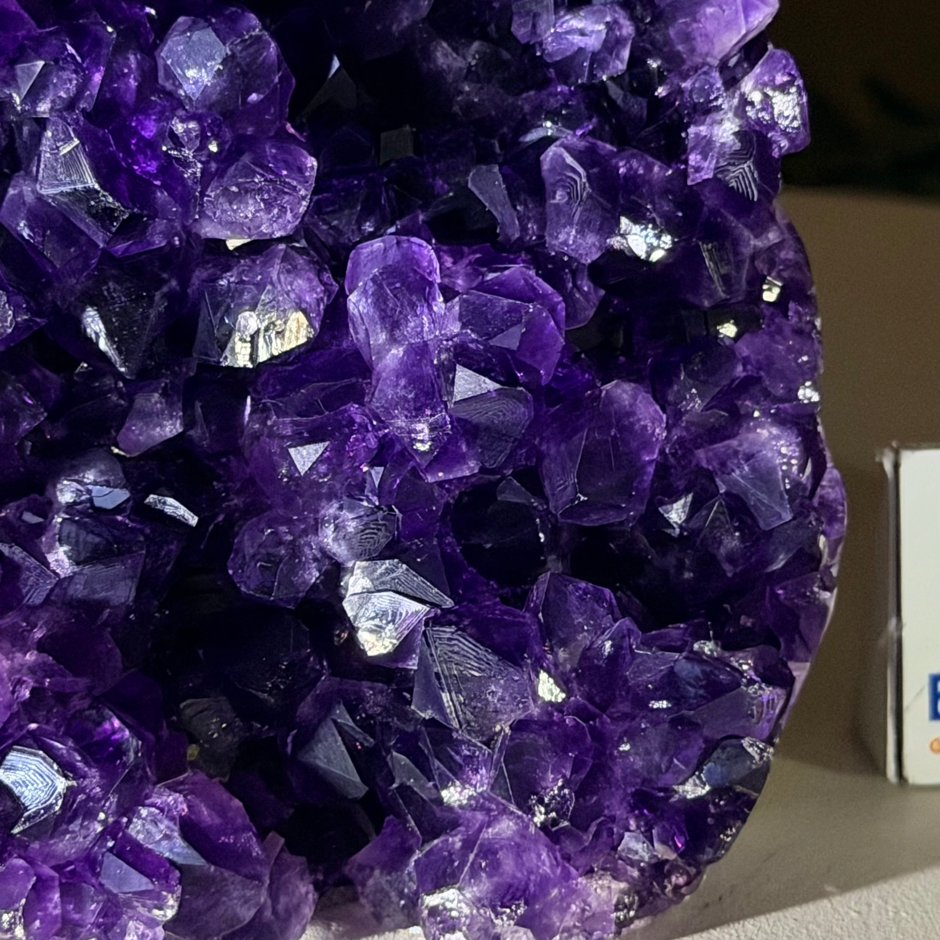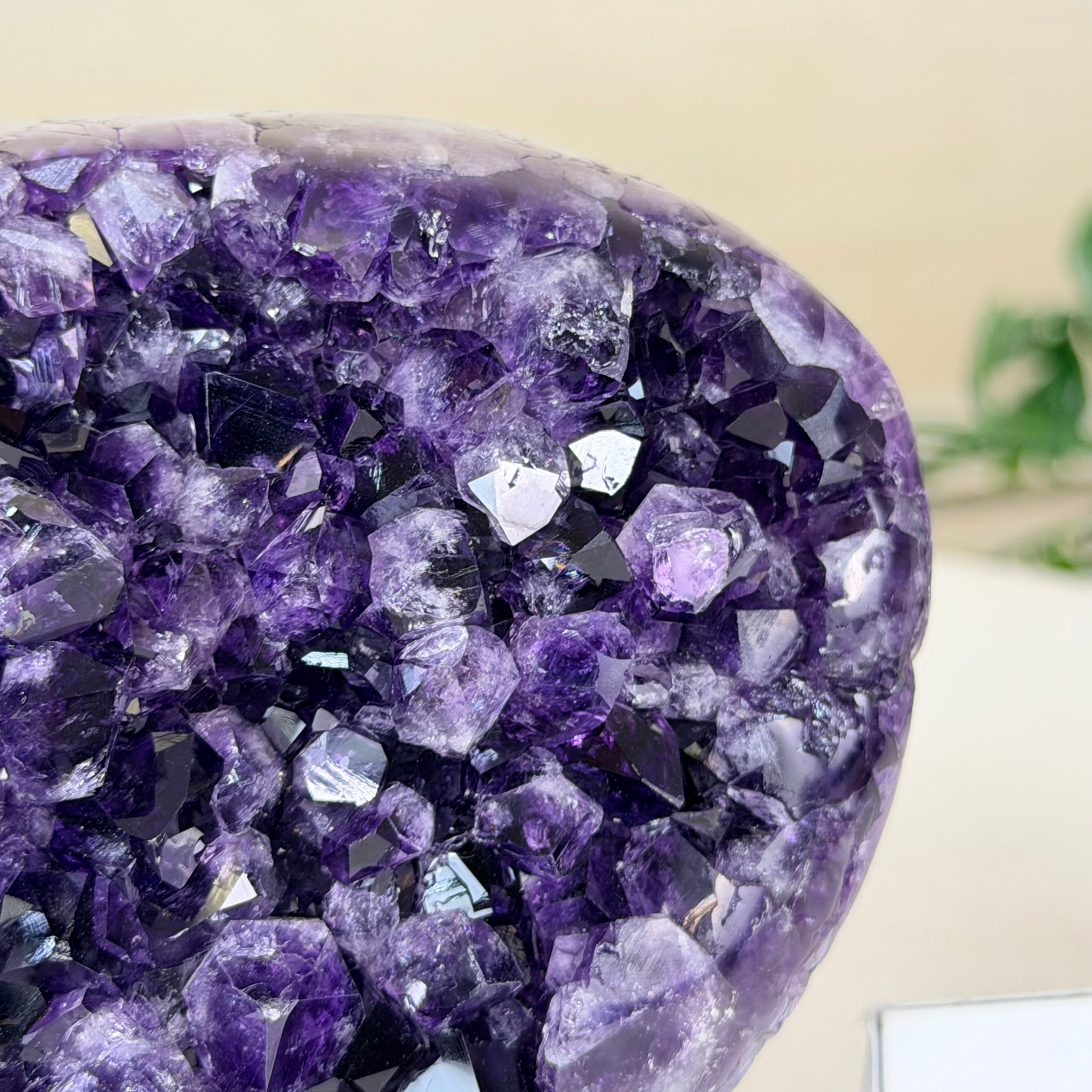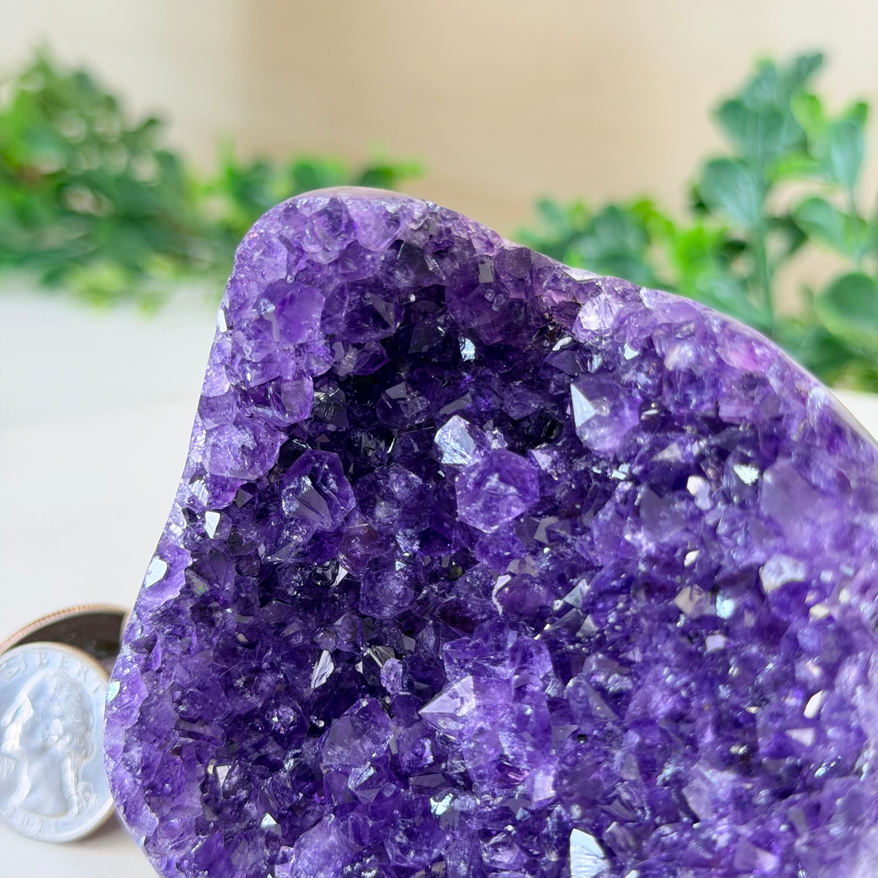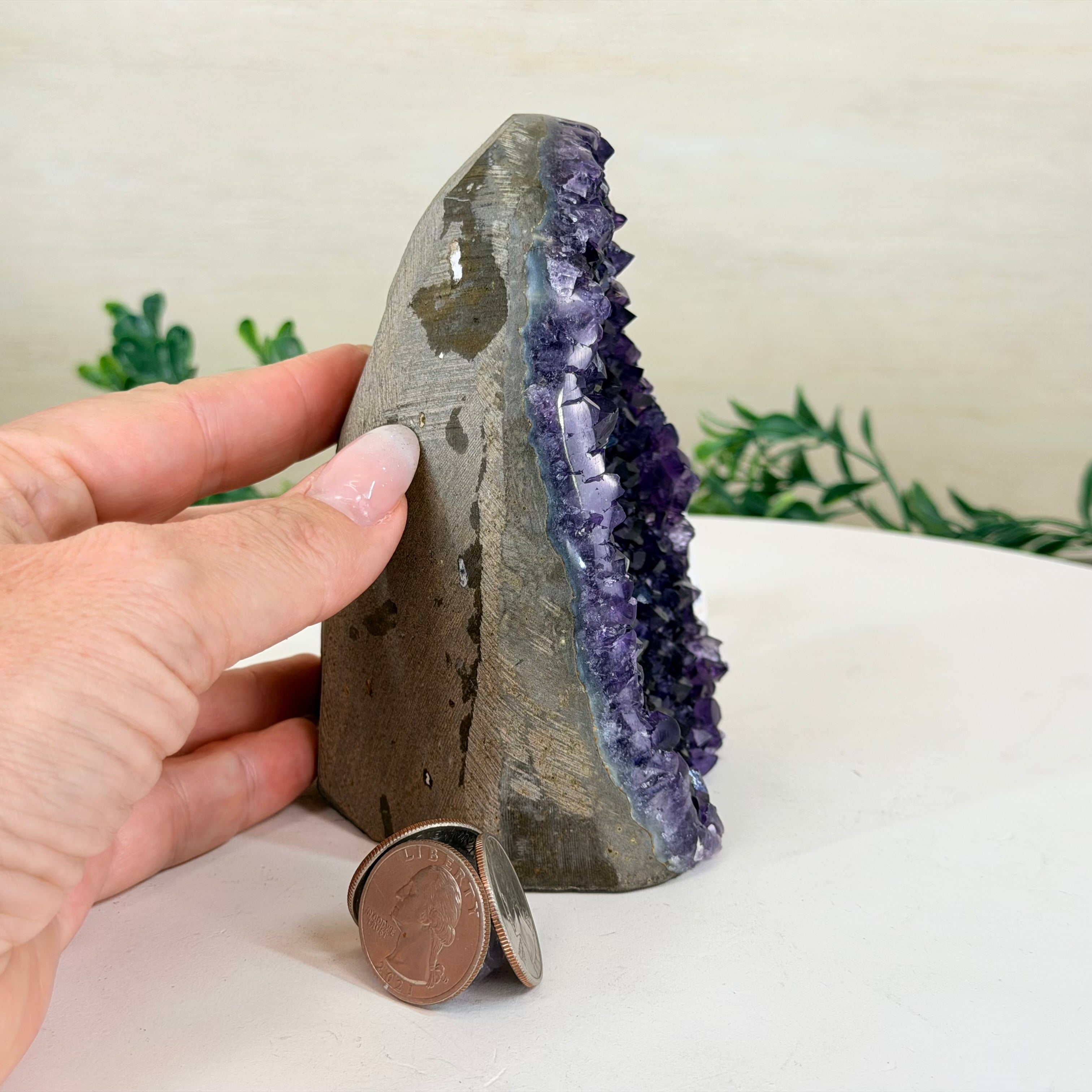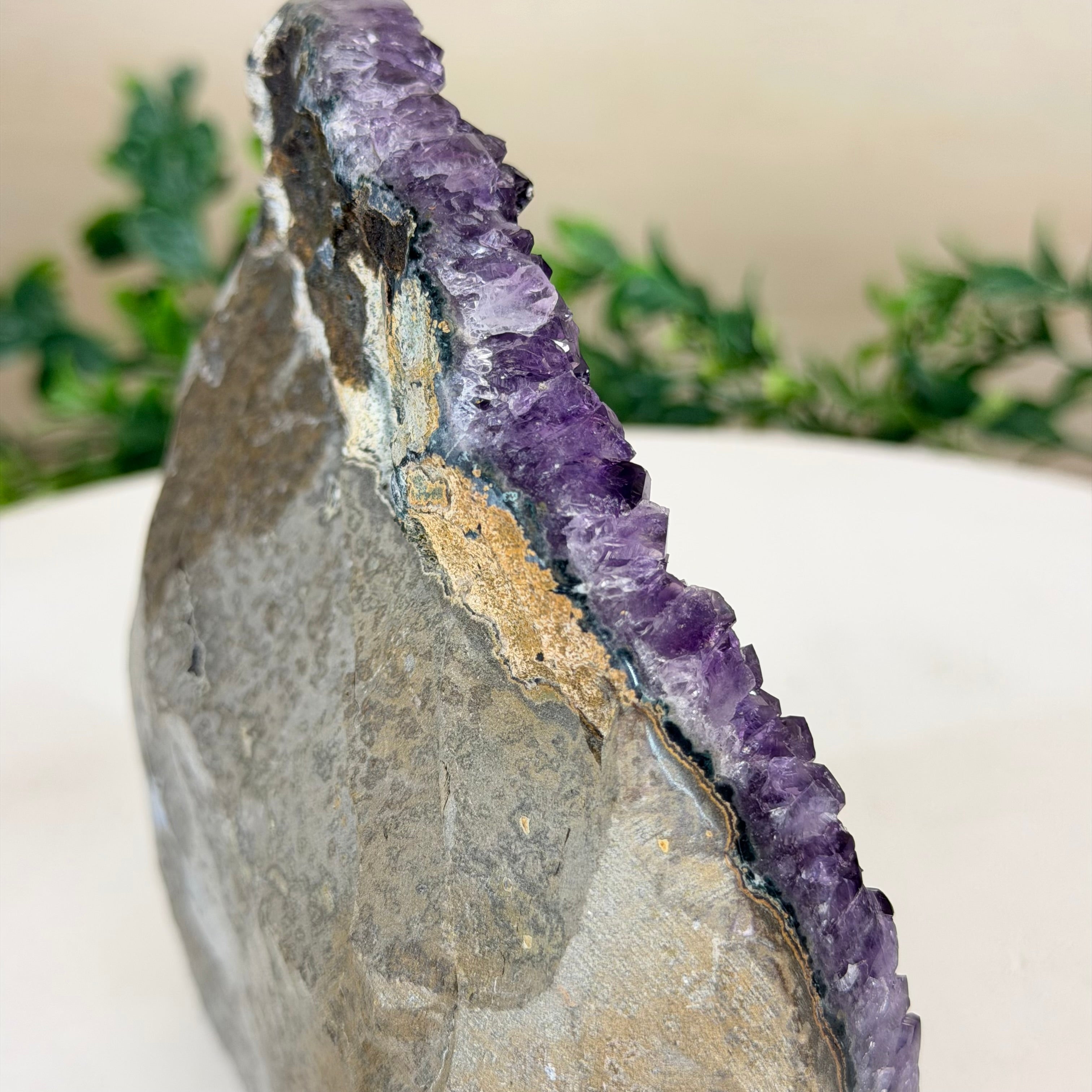 These clusters grow inside geodes–where mineral-rich water slowly deposits crystals over time. The result is a captivating arrangement of pointed amethyst crystals that can beautify any space.