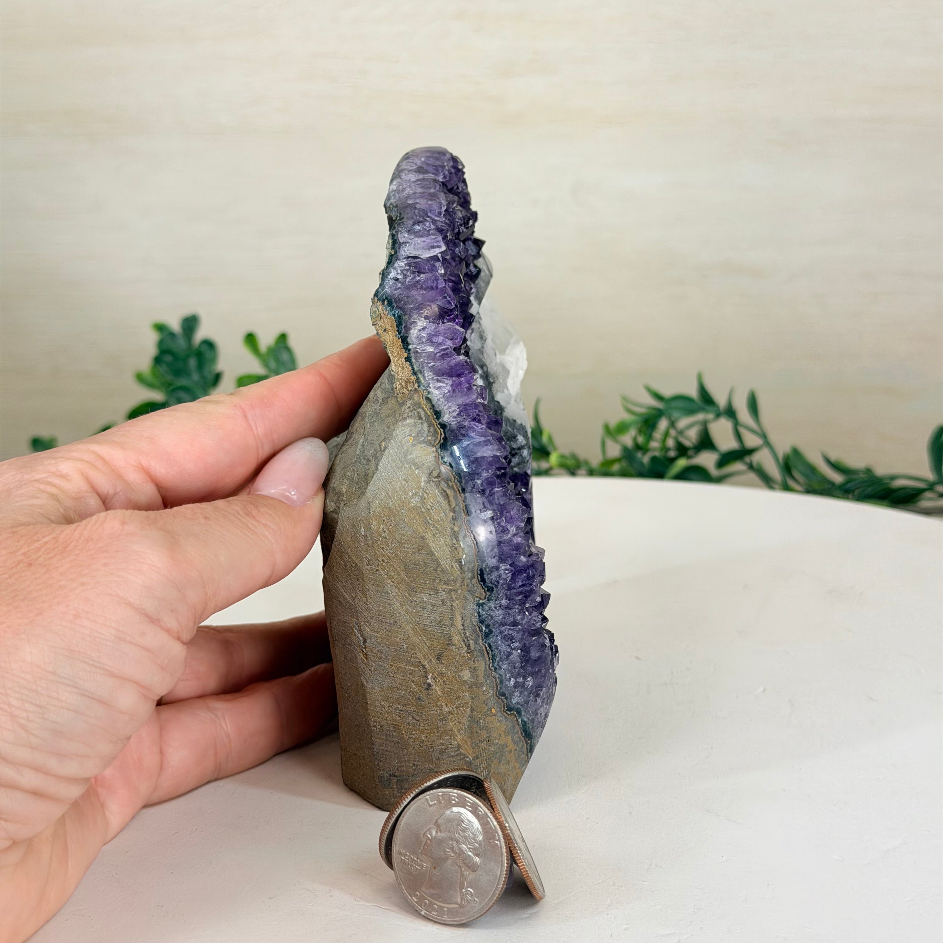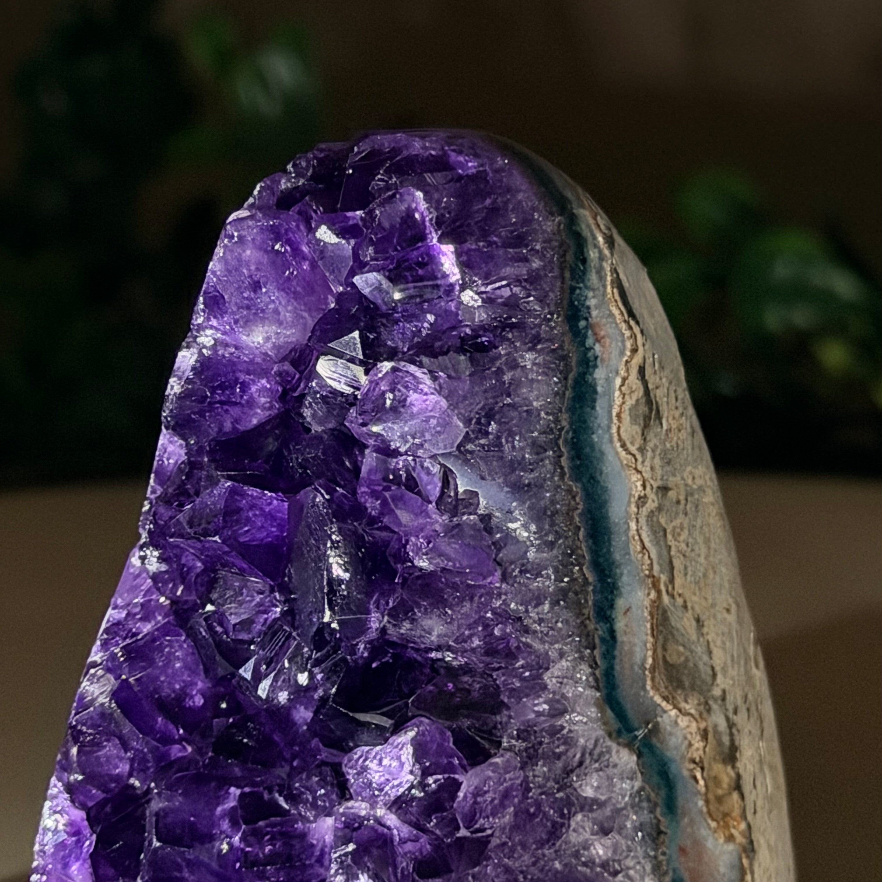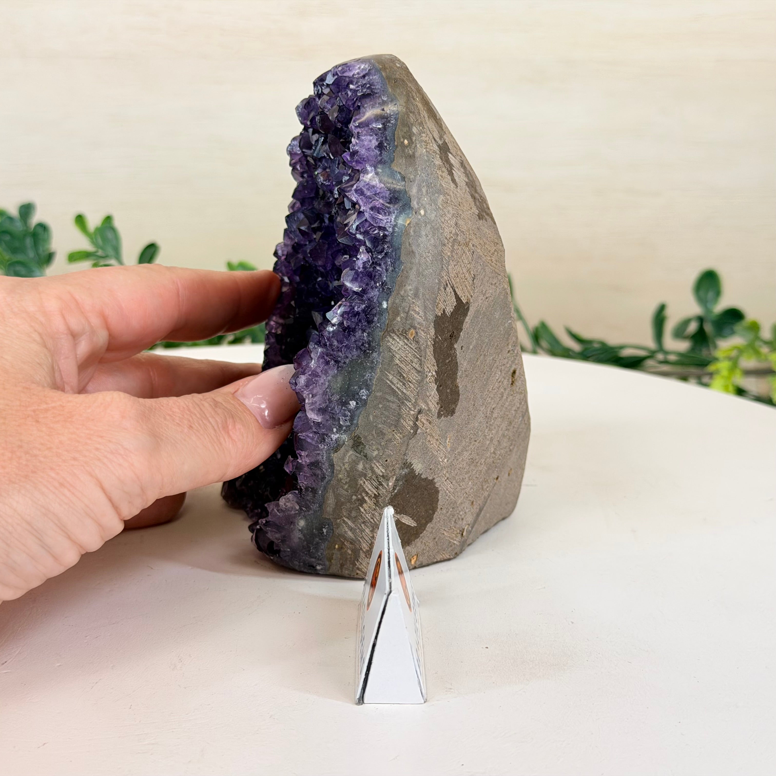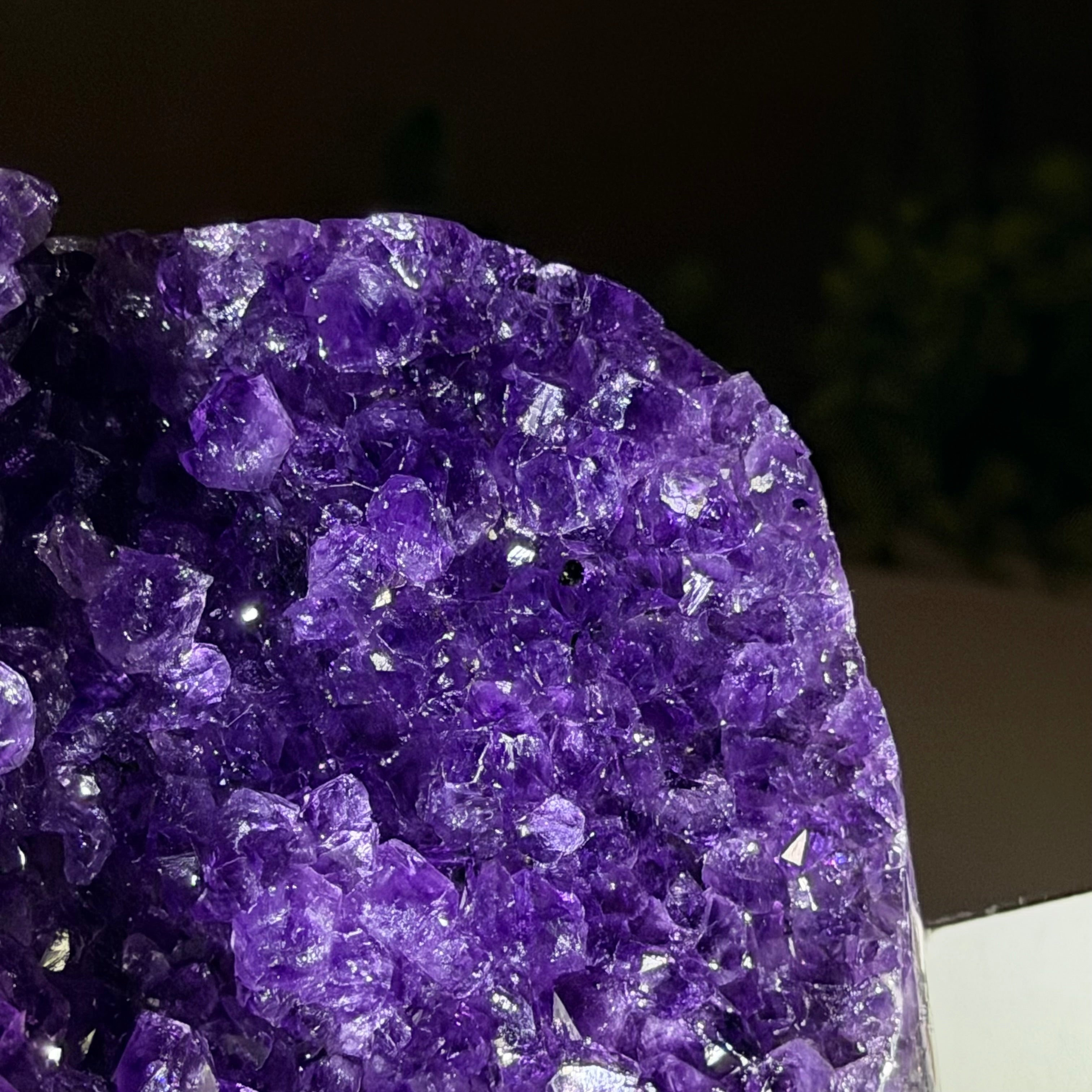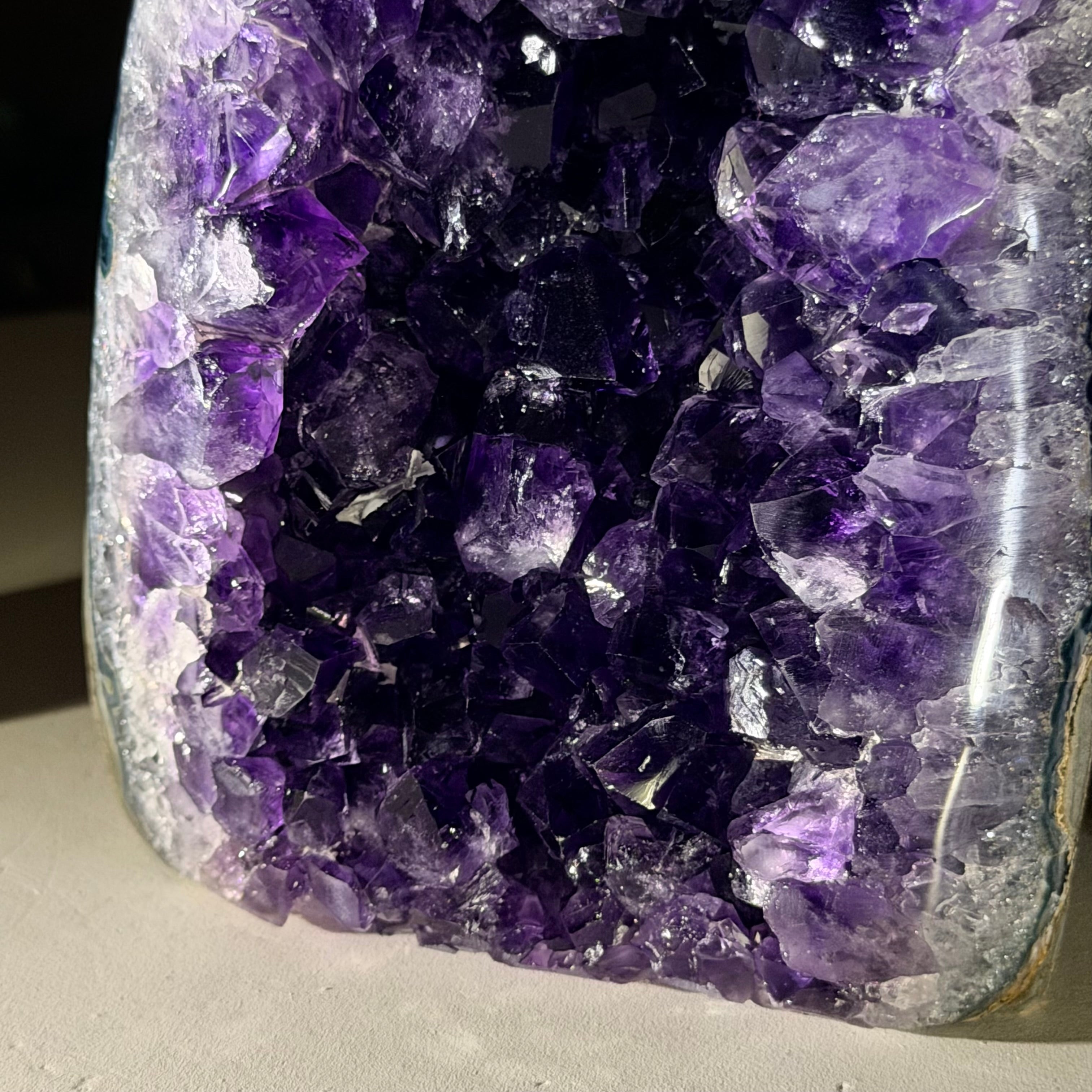 These clusters grow inside geodes–where mineral-rich water slowly deposits crystals over time. The result is a captivating arrangement of pointed amethyst crystals that can beautify any space.