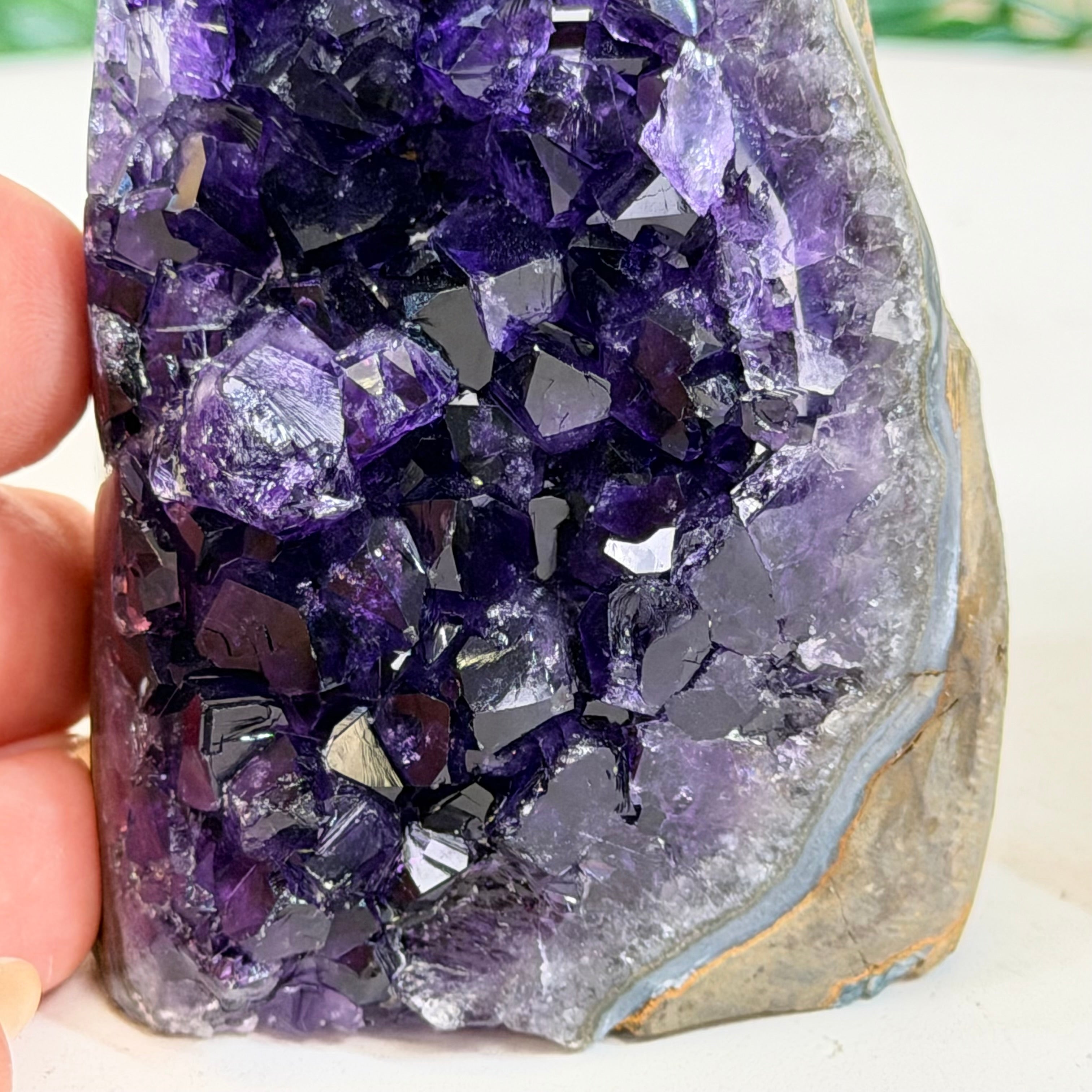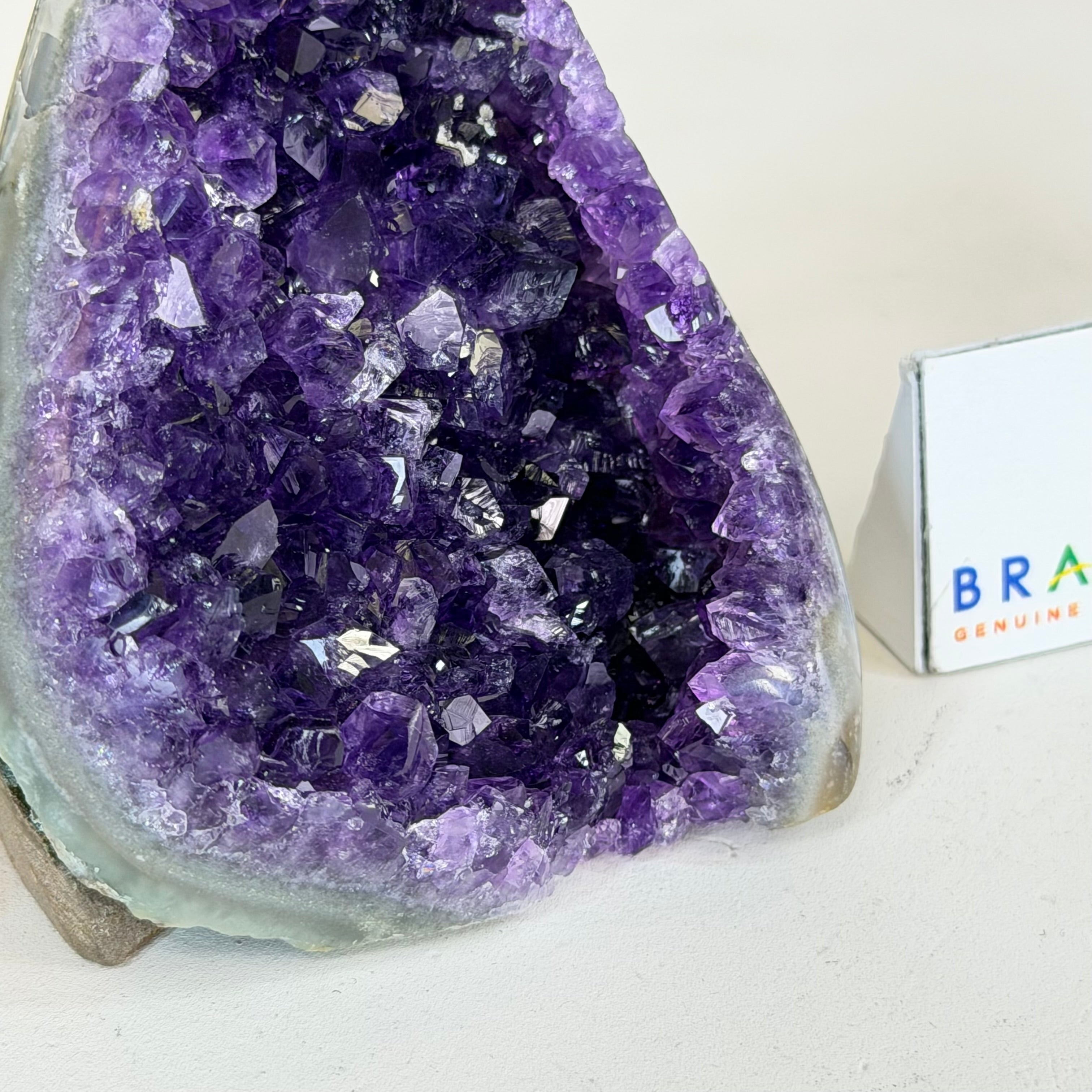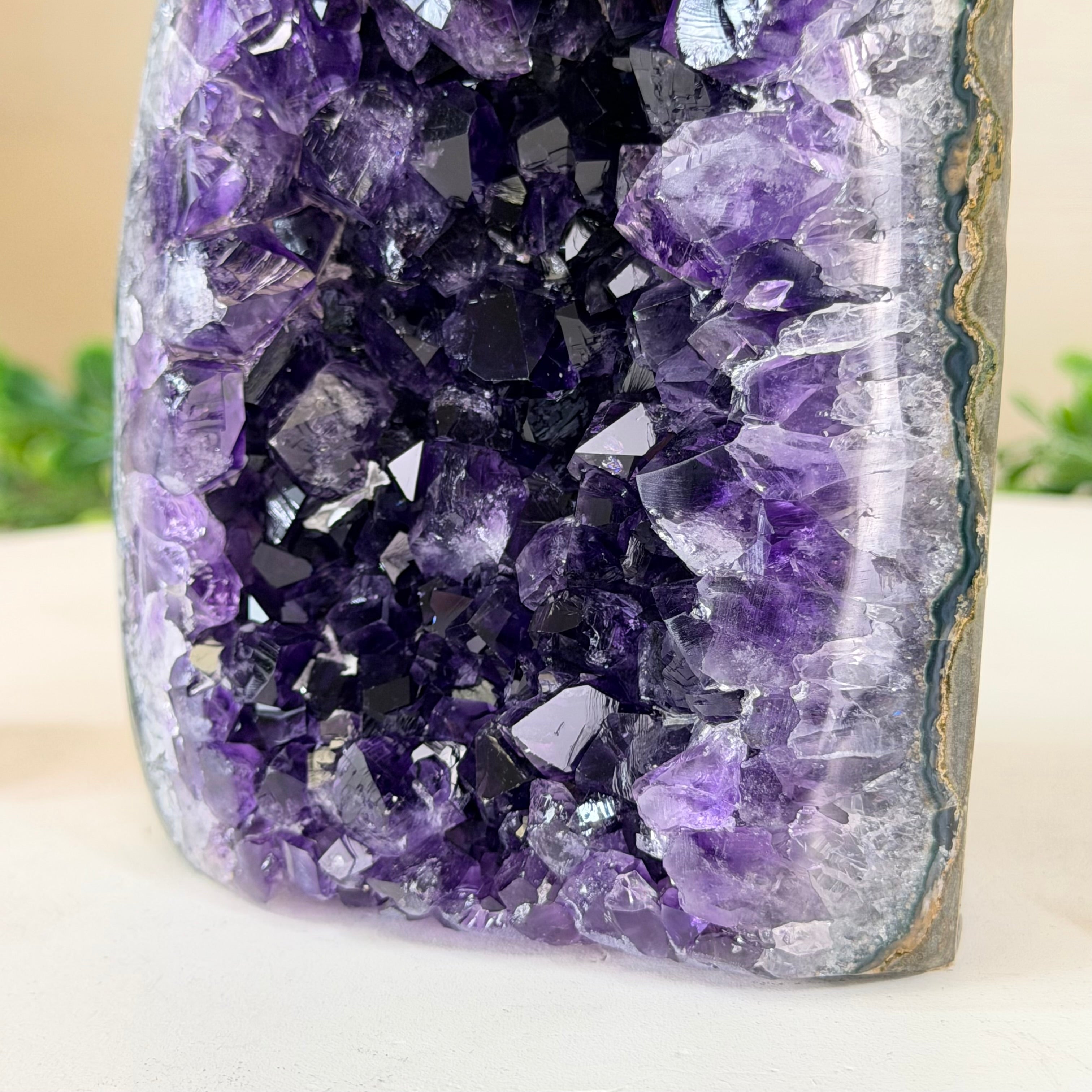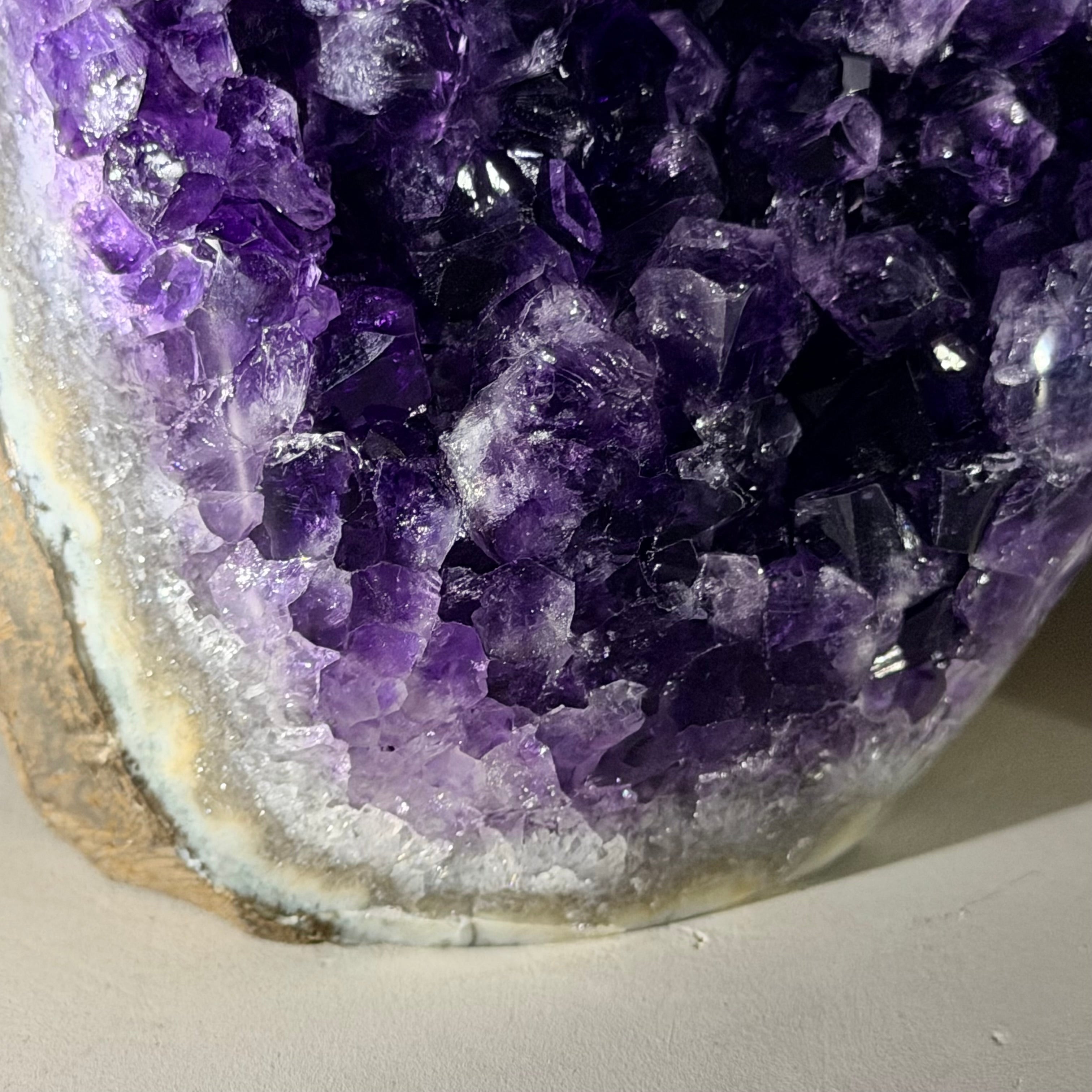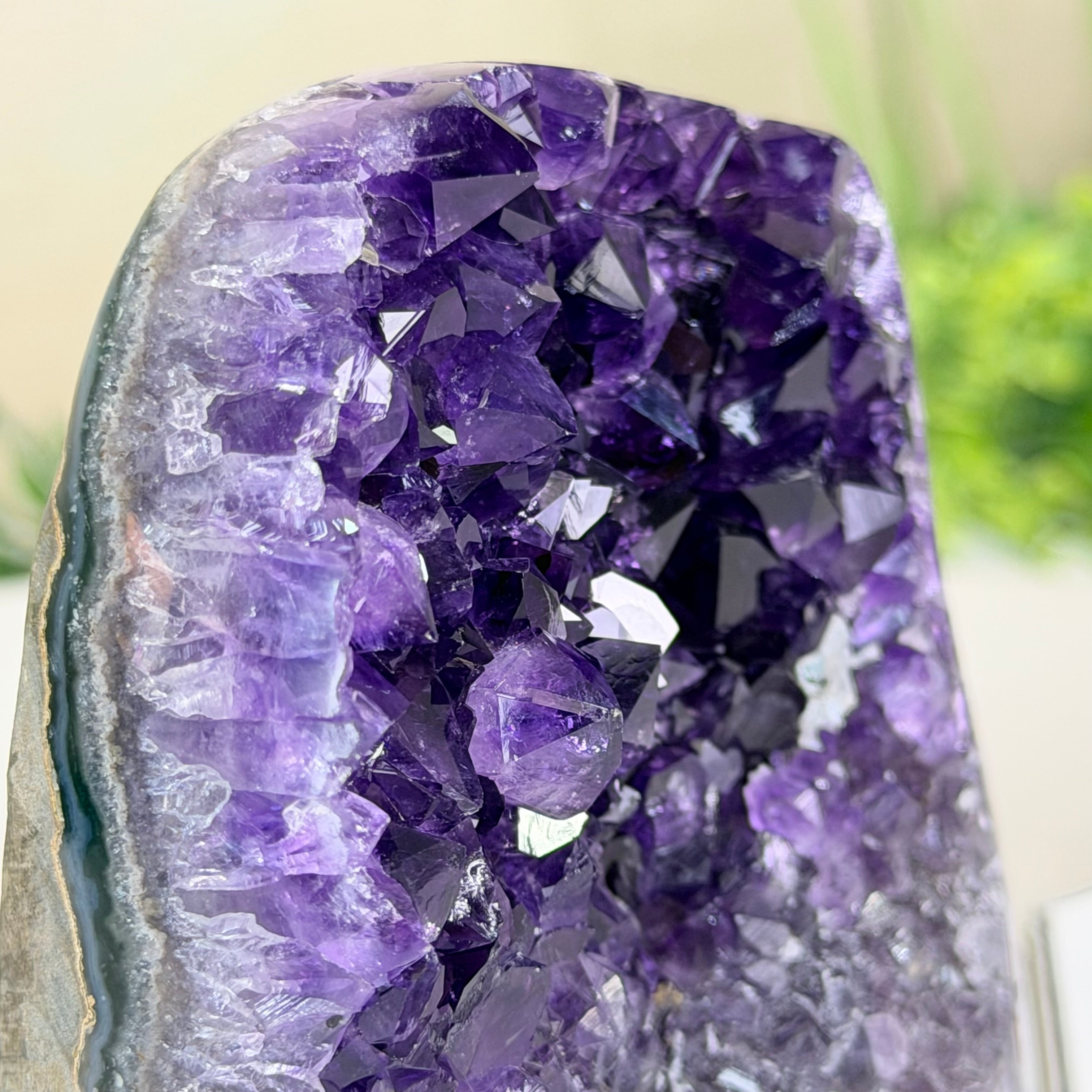 These clusters grow inside geodes–where mineral-rich water slowly deposits crystals over time. The result is a captivating arrangement of pointed amethyst crystals that can beautify any space.