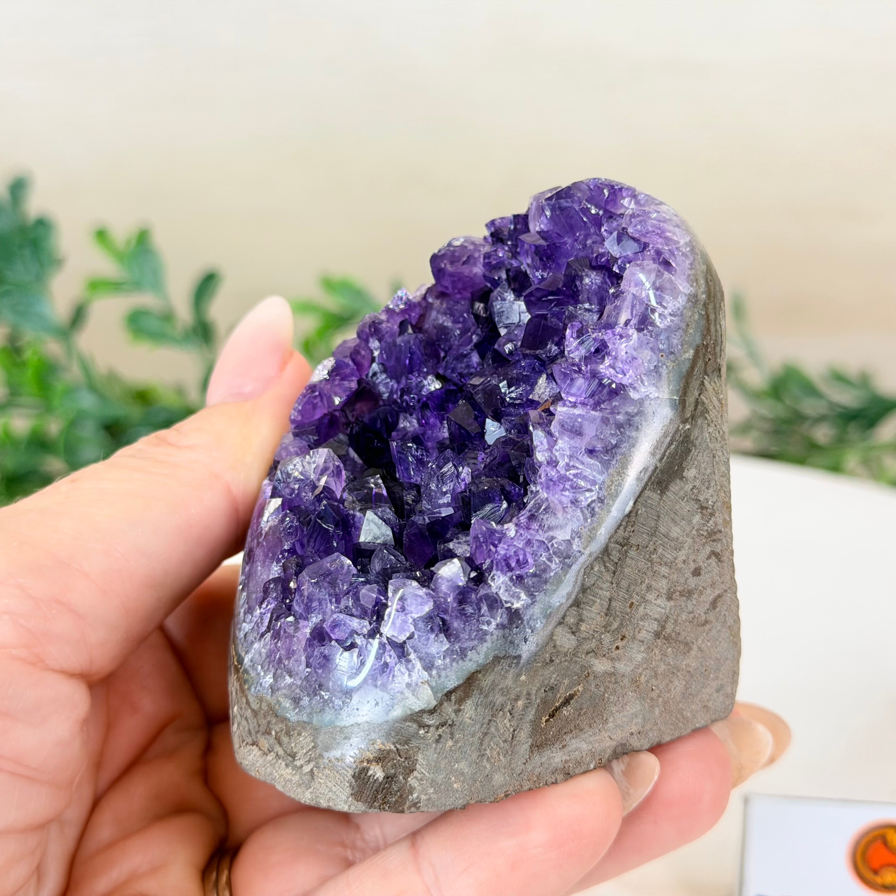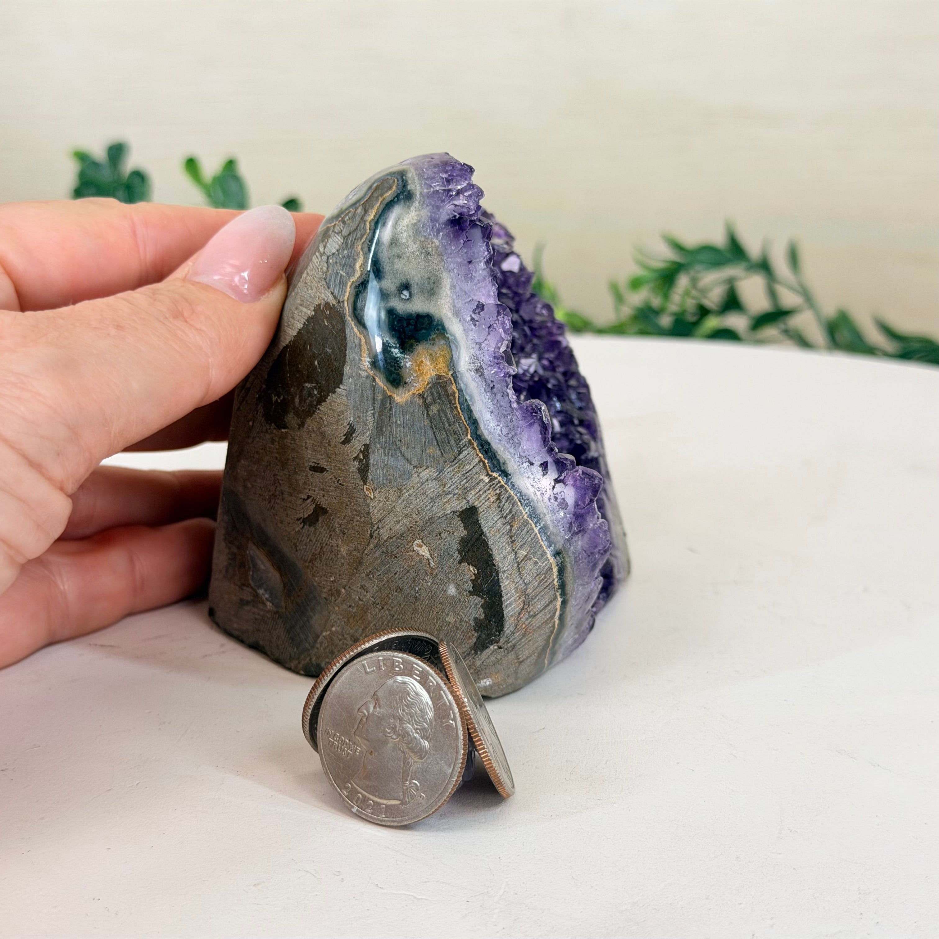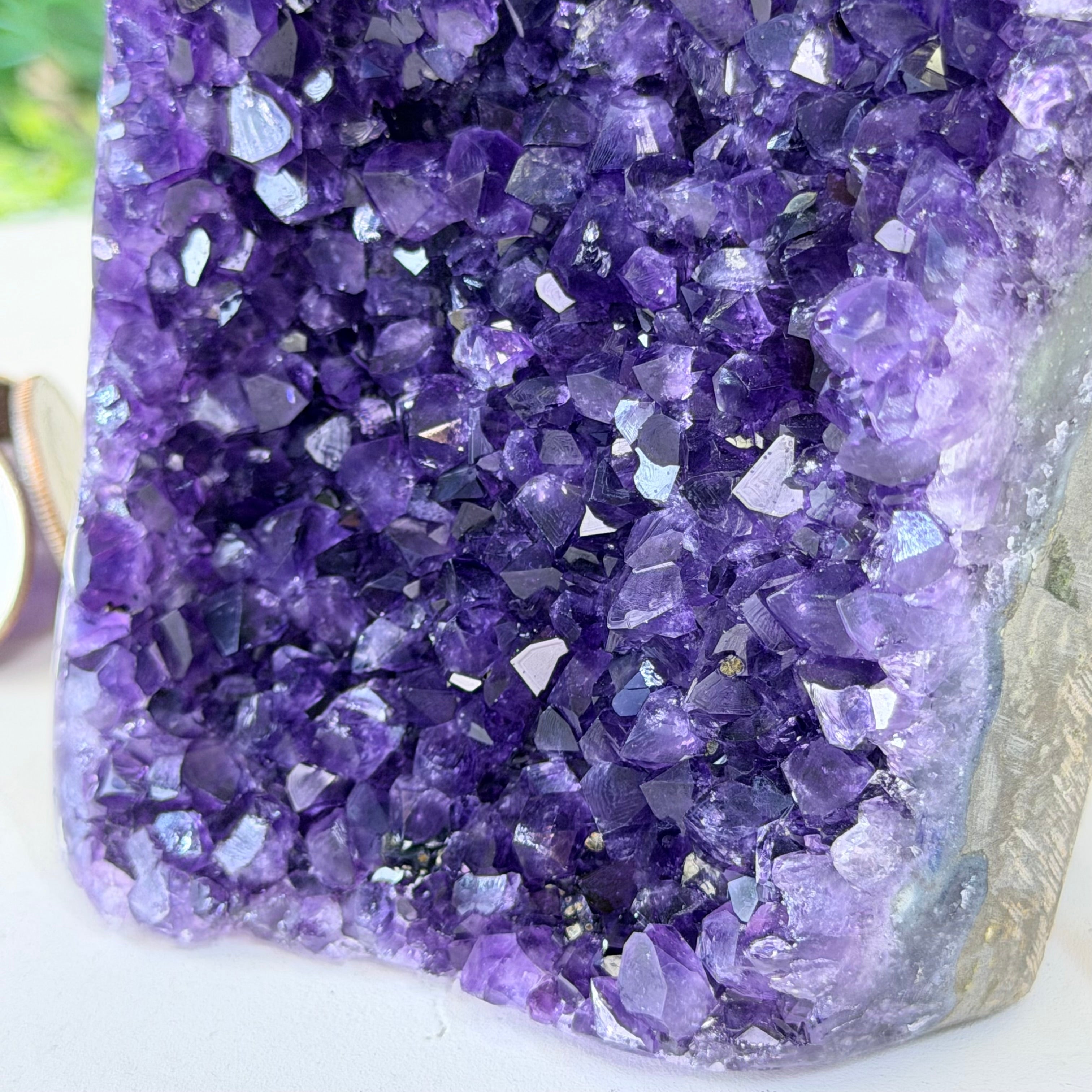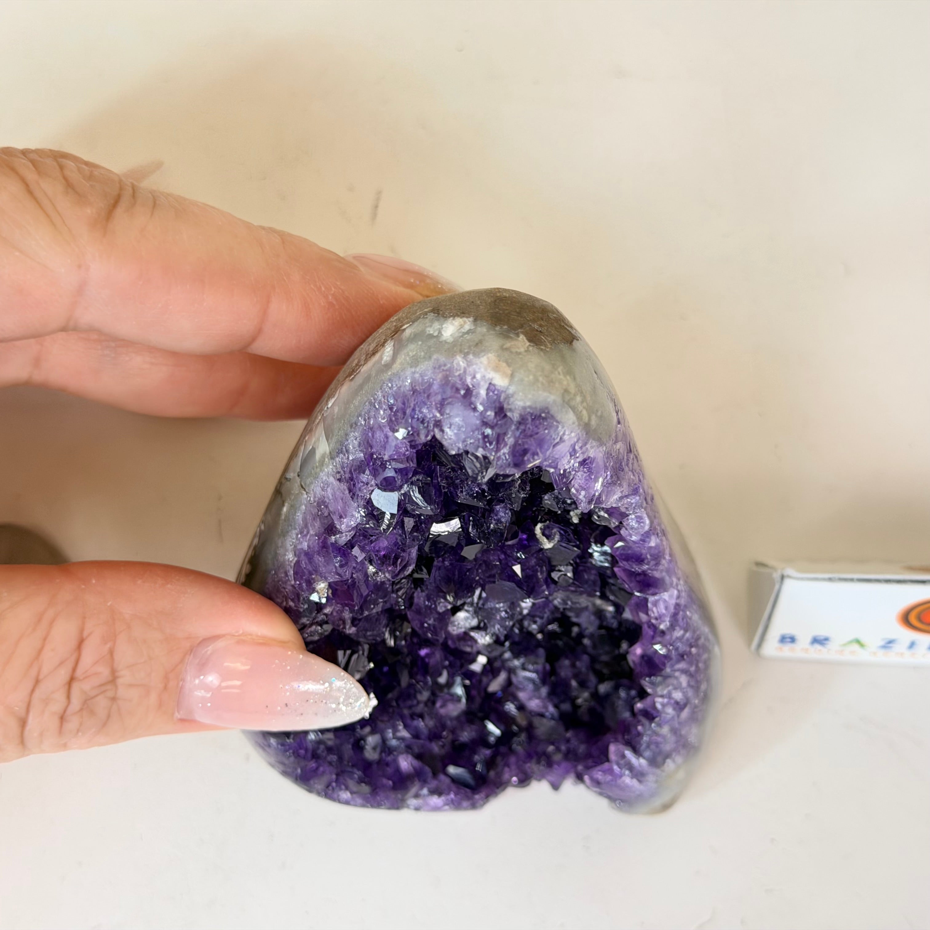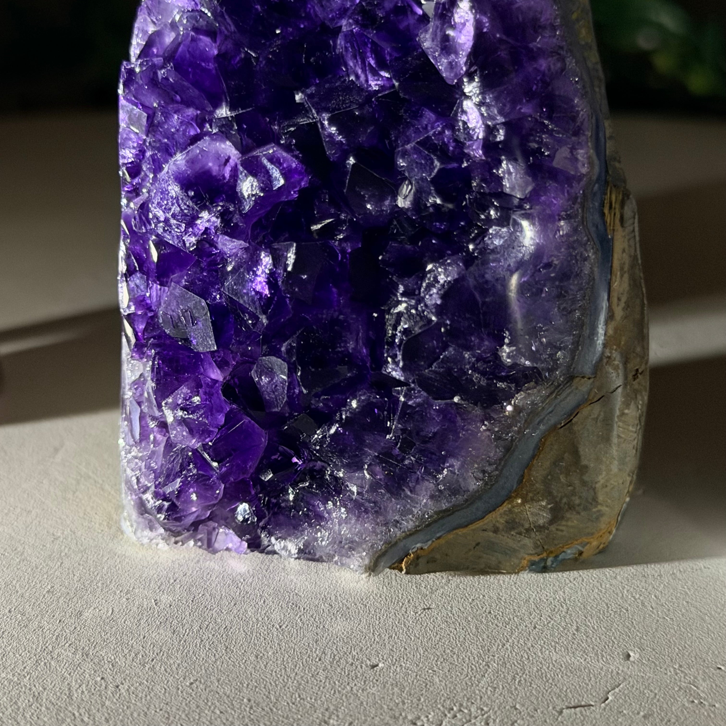These clusters grow inside geodes–where mineral-rich water slowly deposits crystals over time. The result is a captivating arrangement of pointed amethyst crystals that can beautify any space.