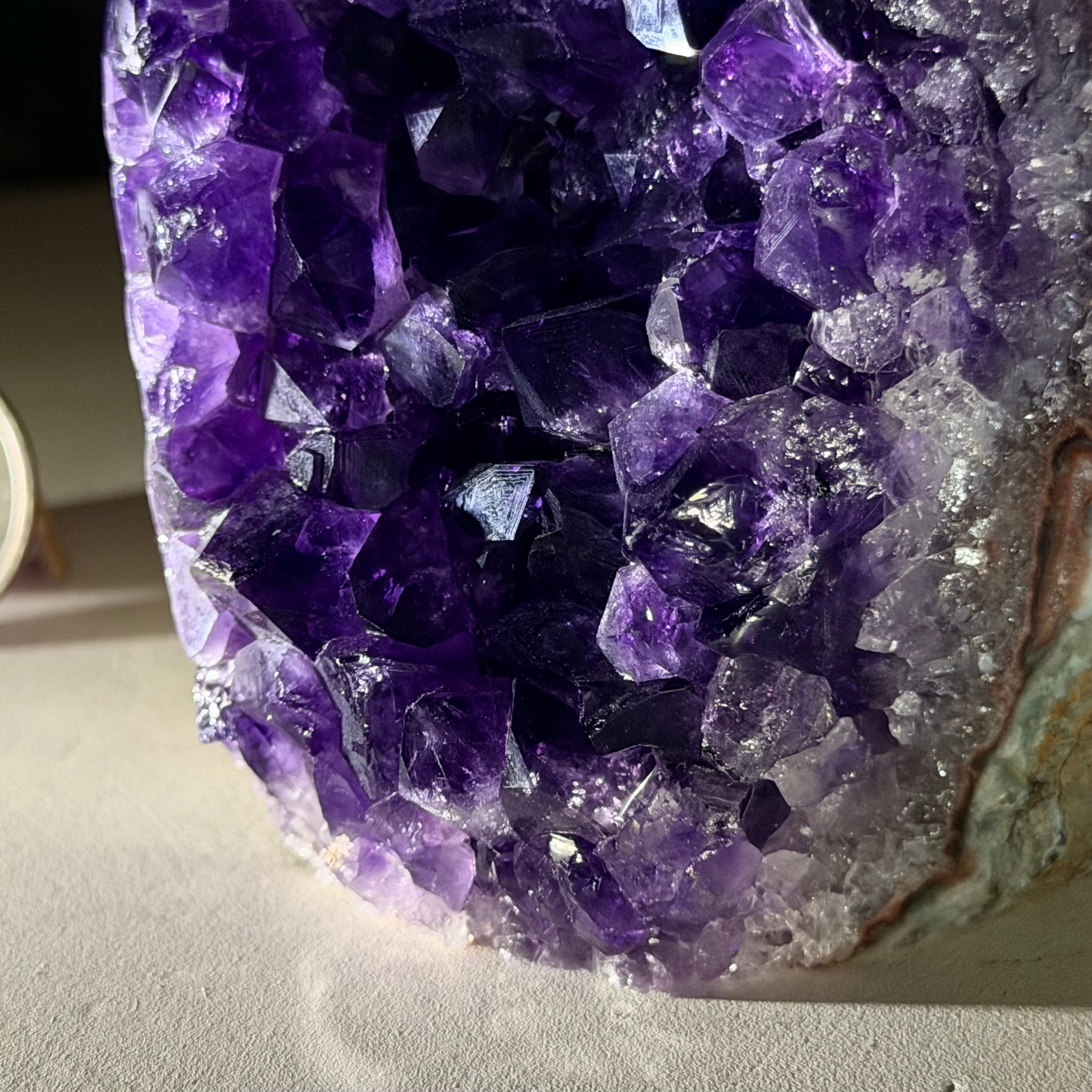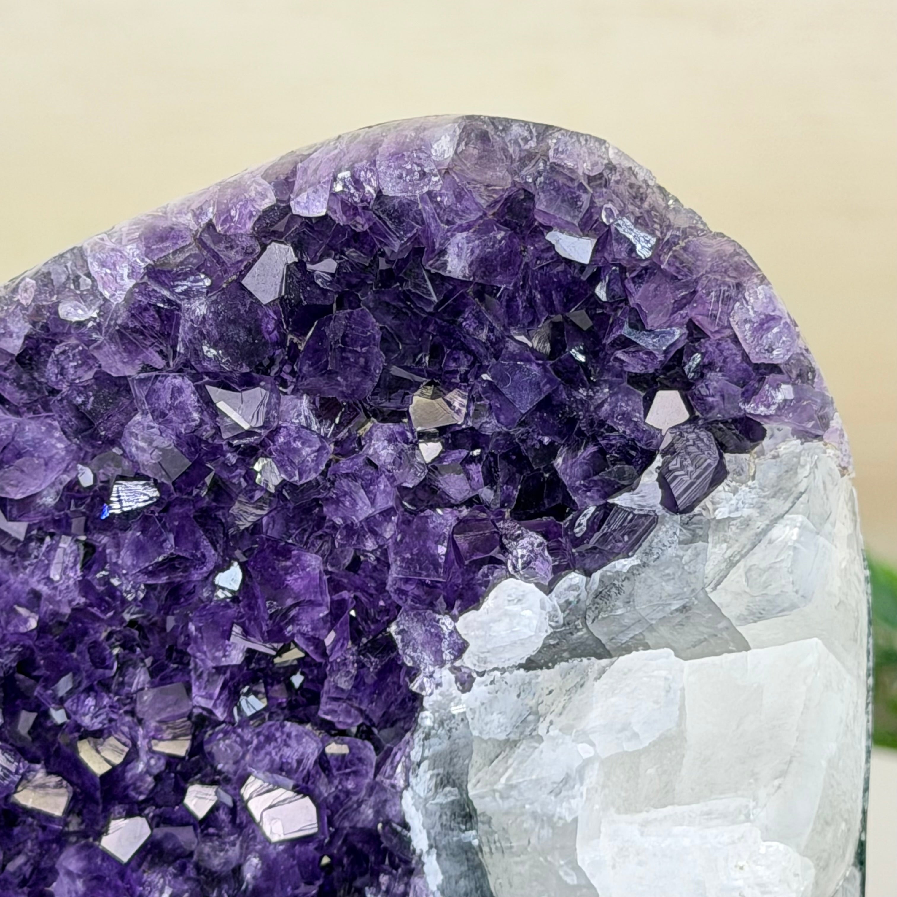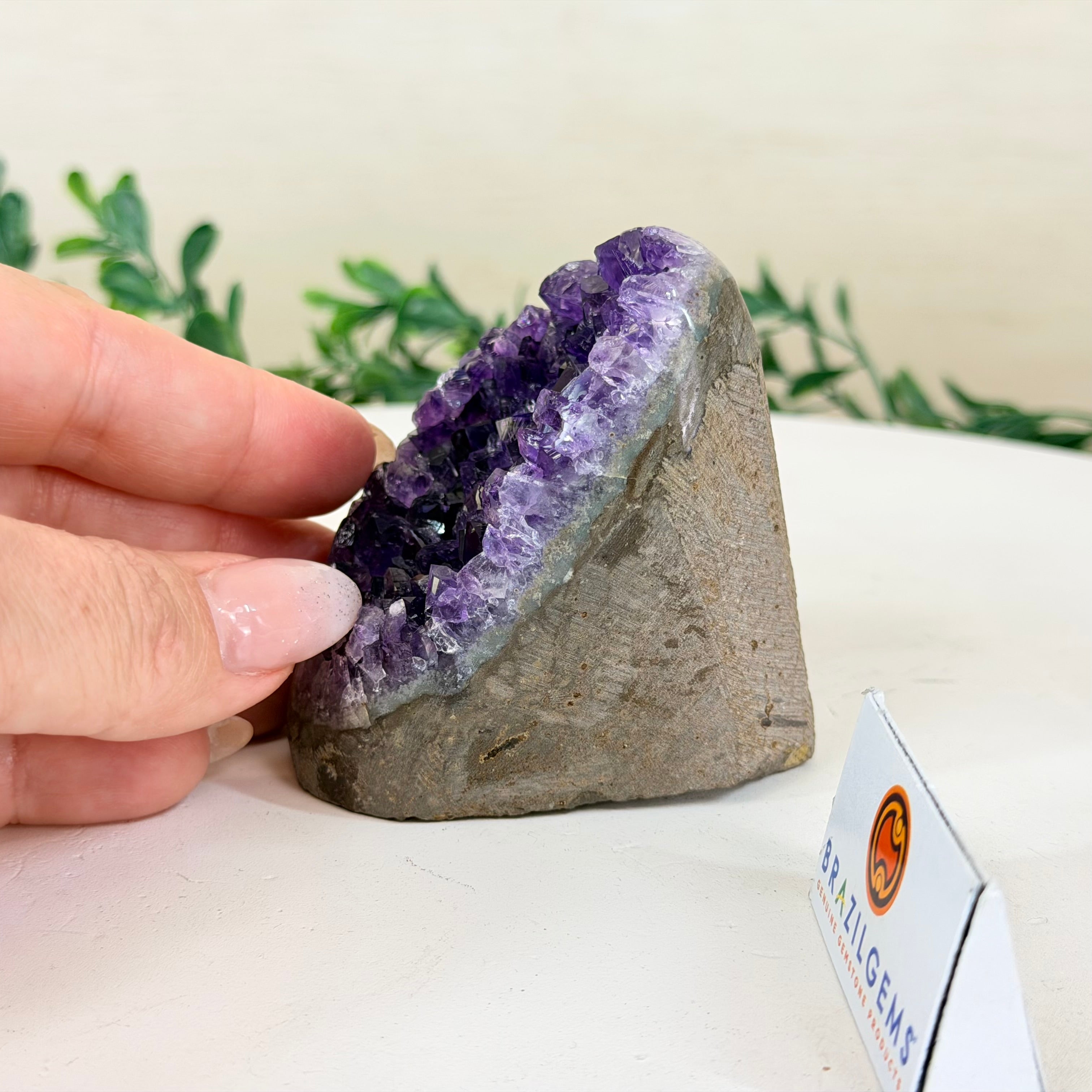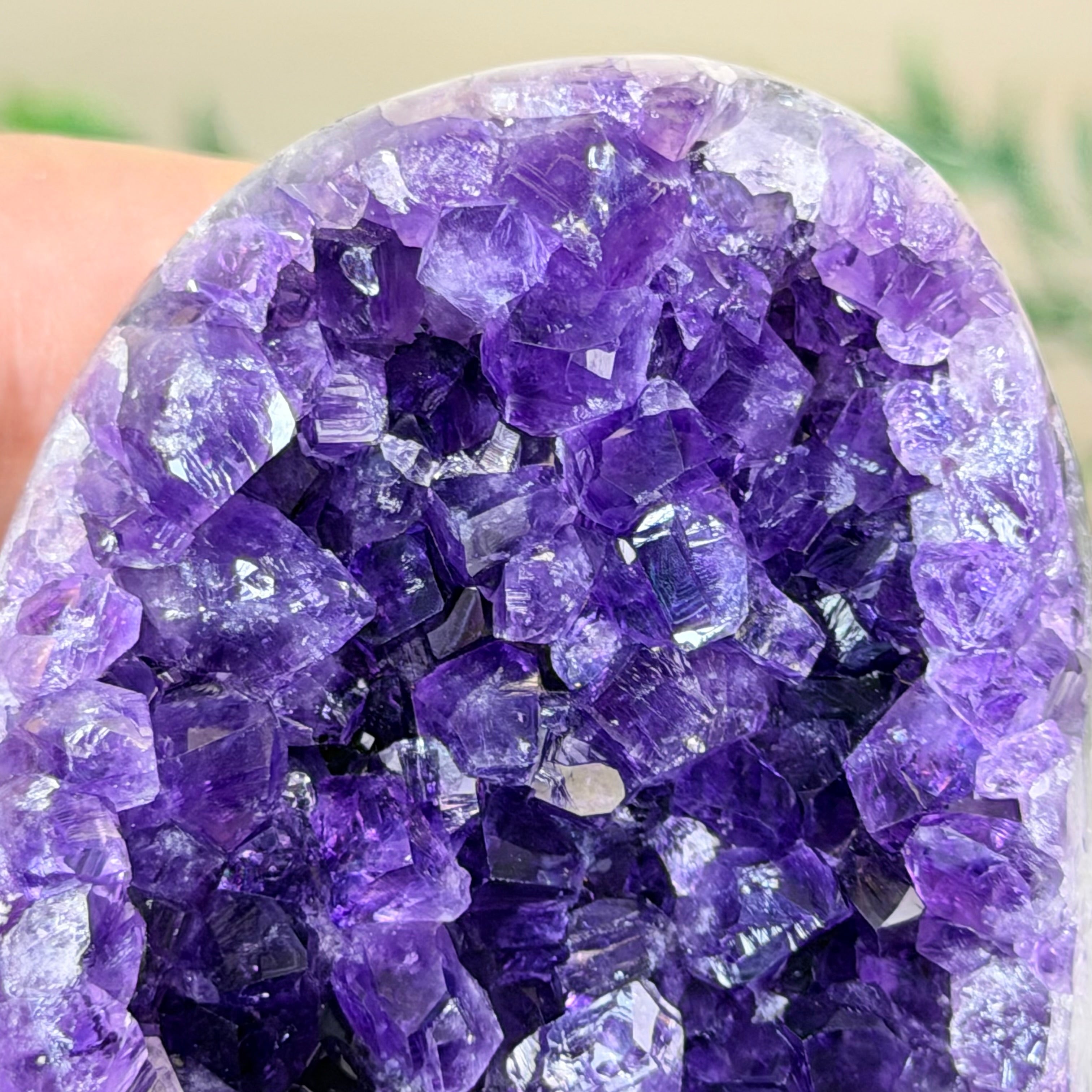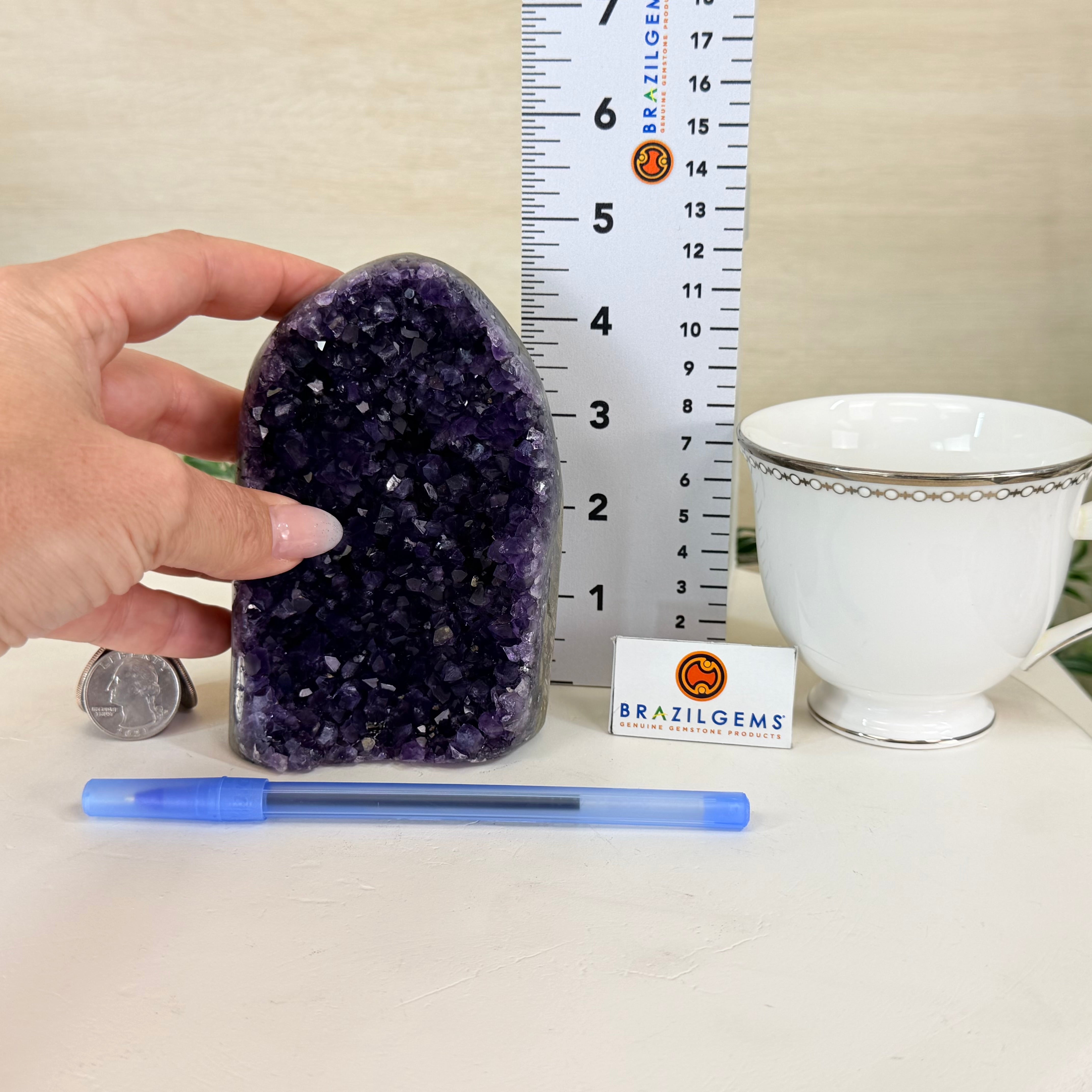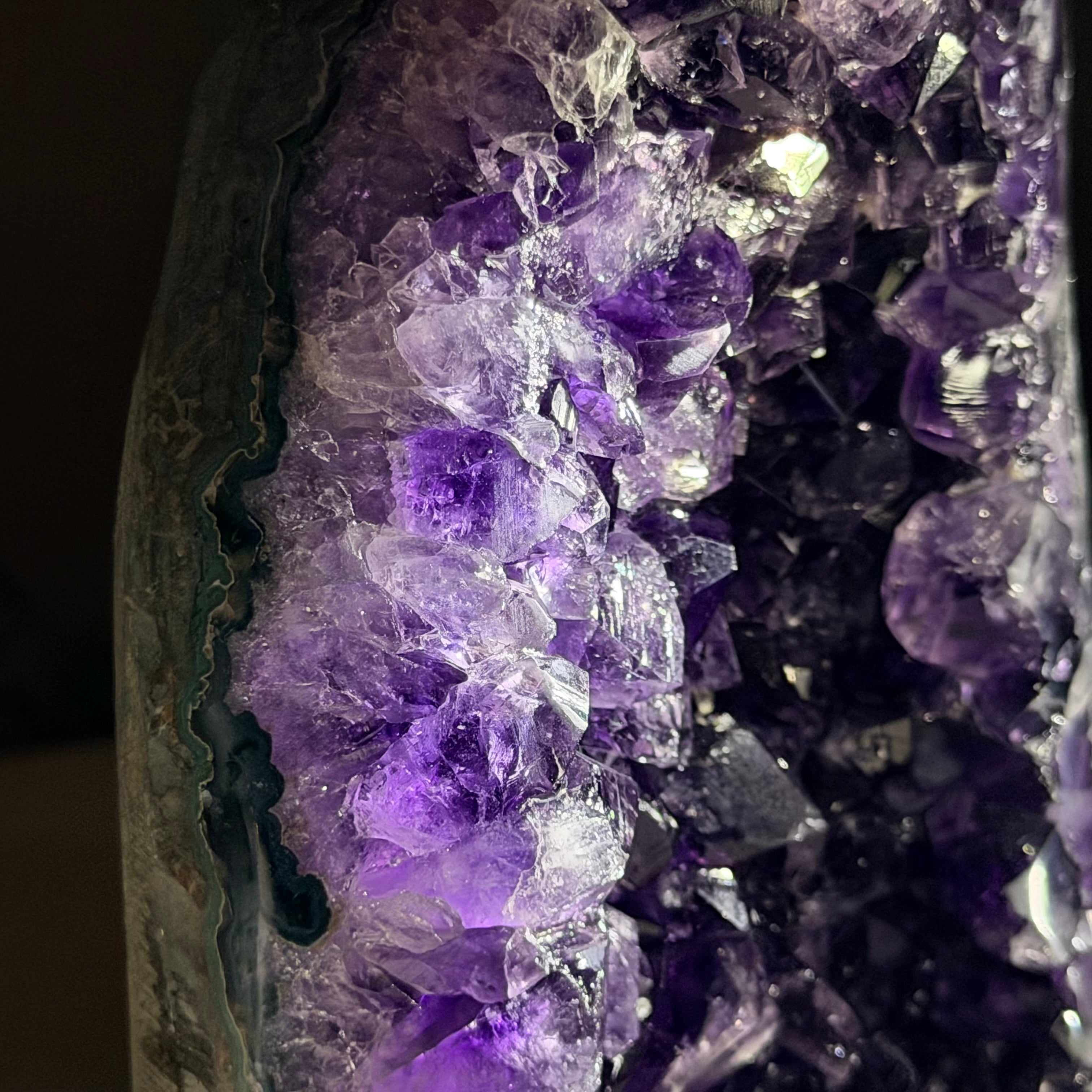 These clusters grow inside geodes–where mineral-rich water slowly deposits crystals over time. The result is a captivating arrangement of pointed amethyst crystals that can beautify any space.