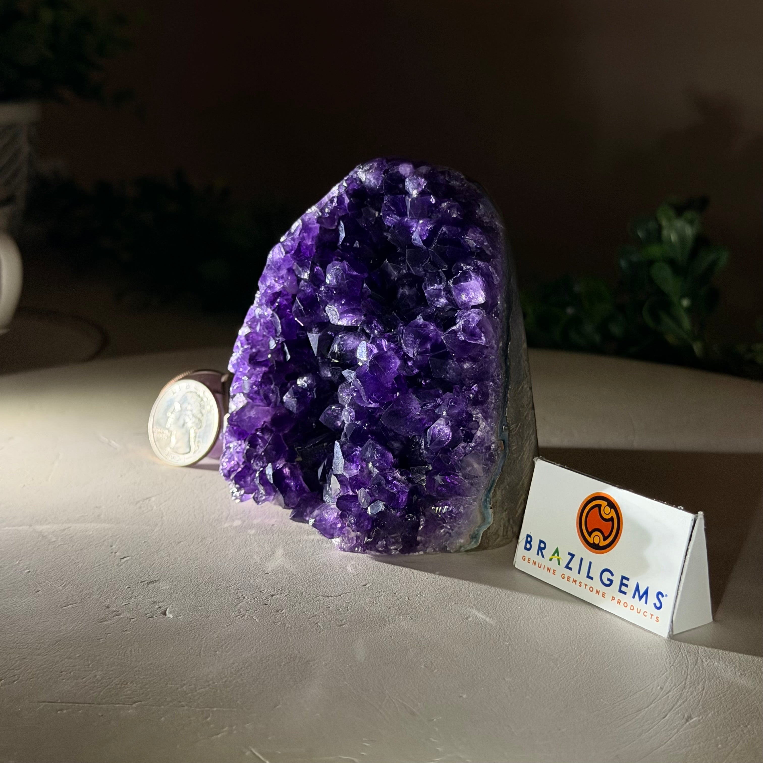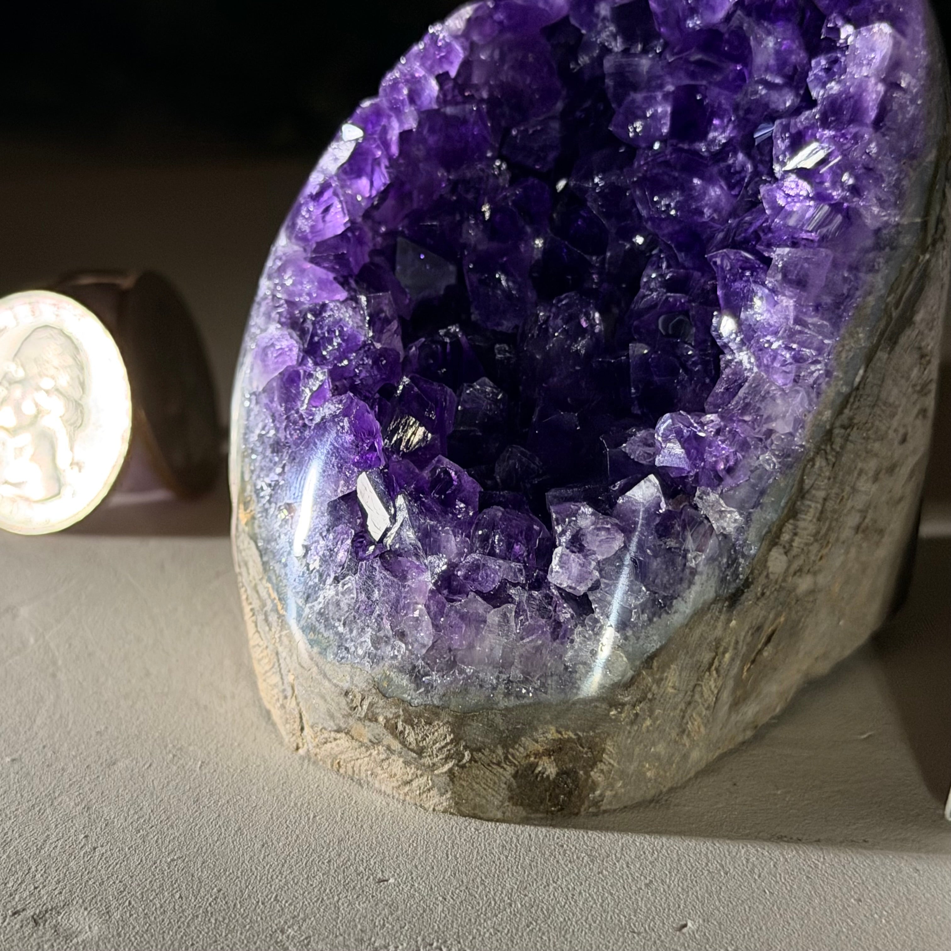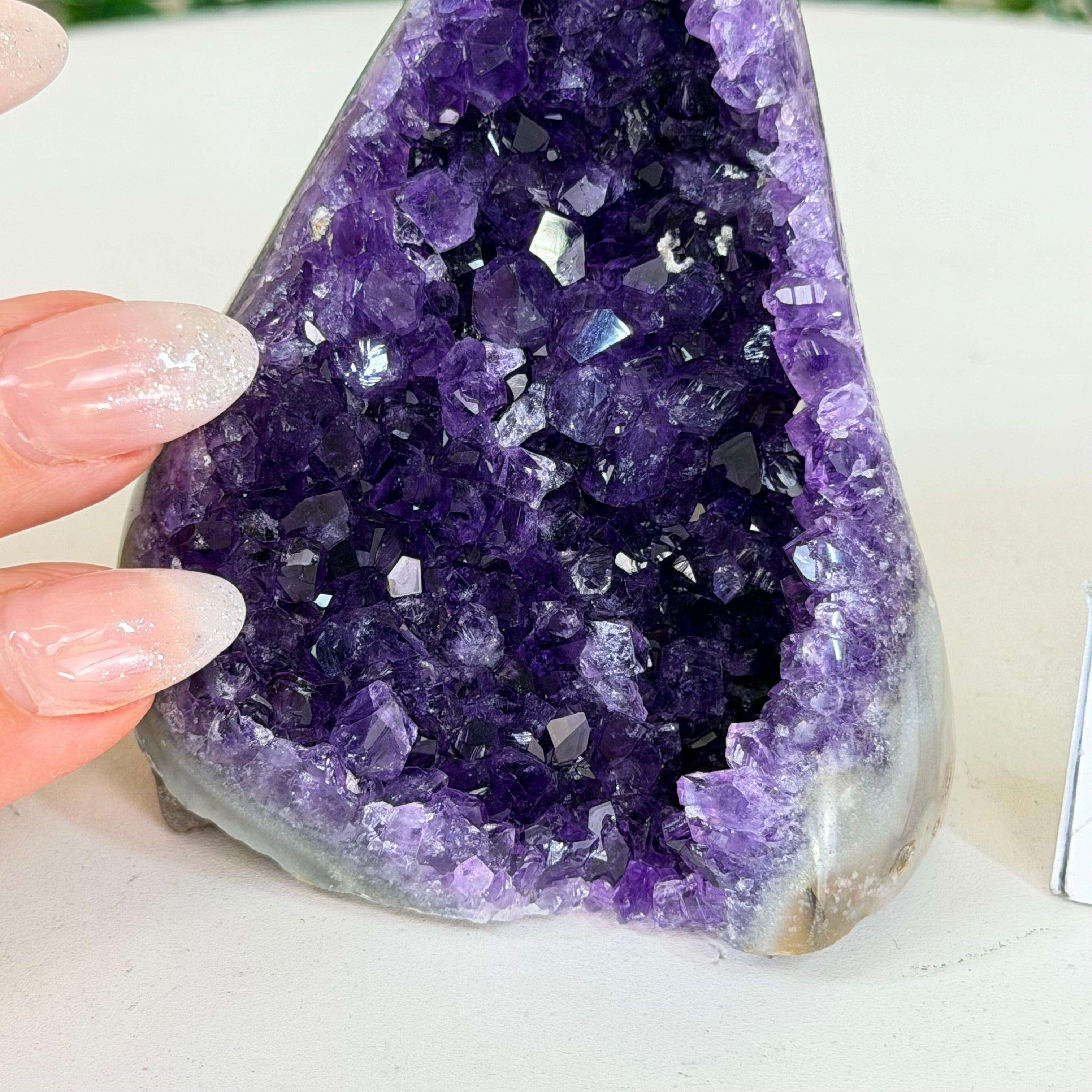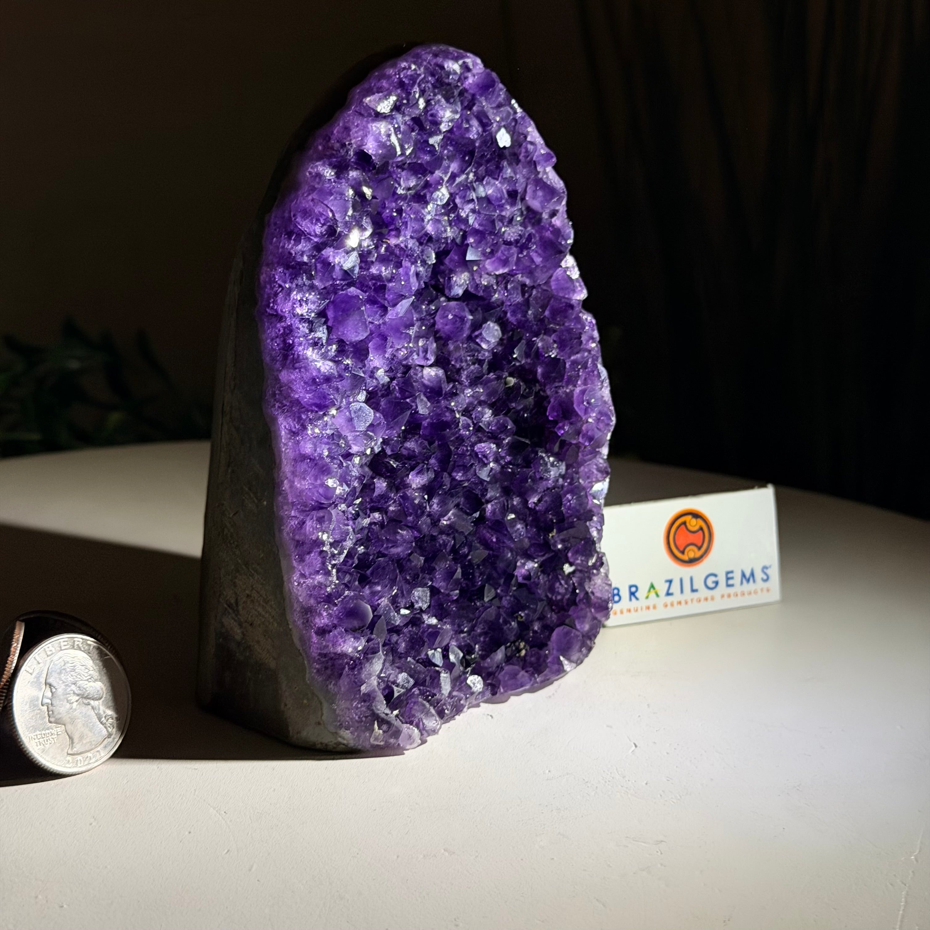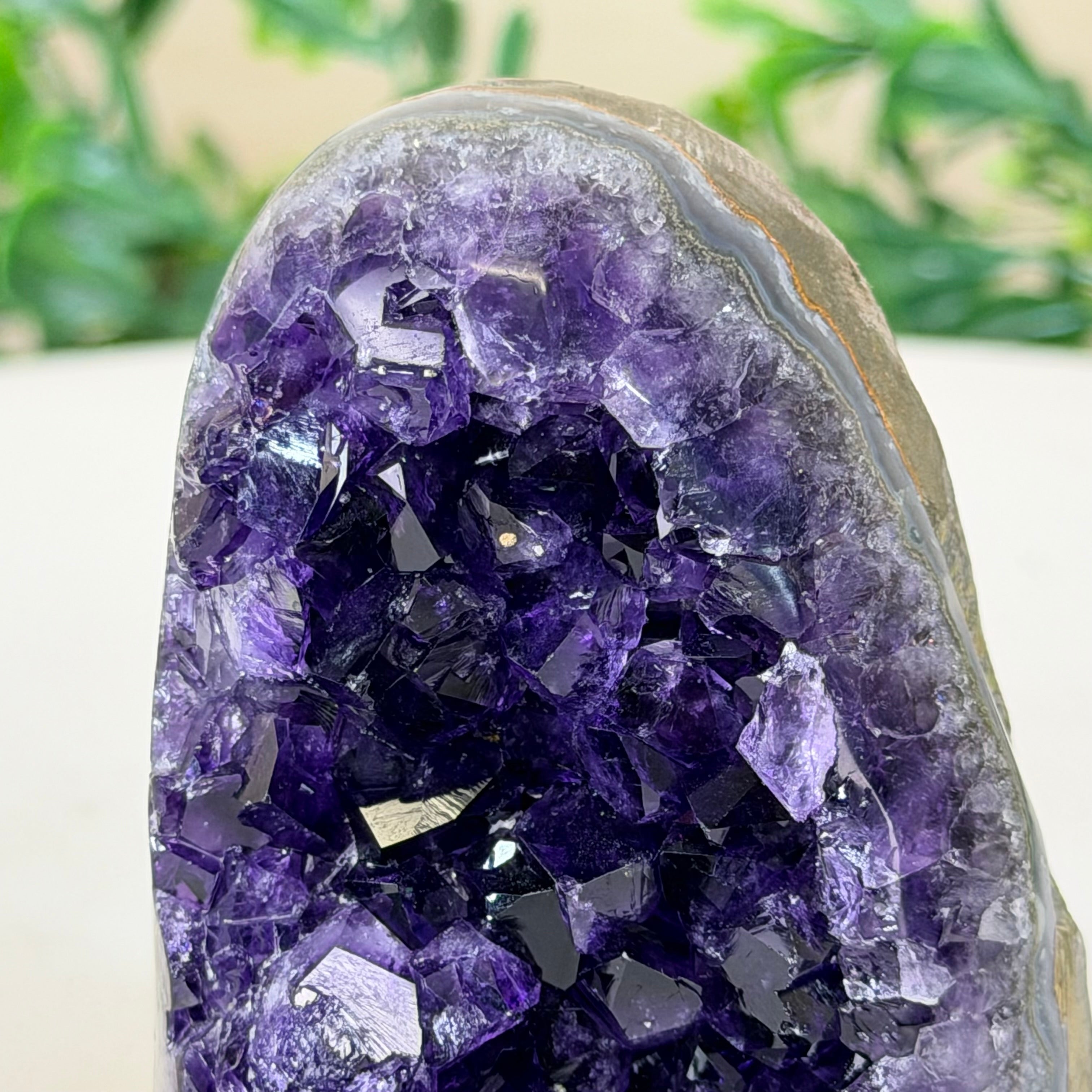 These clusters grow inside geodes–where mineral-rich water slowly deposits crystals over time. The result is a captivating arrangement of pointed amethyst crystals that can beautify any space.