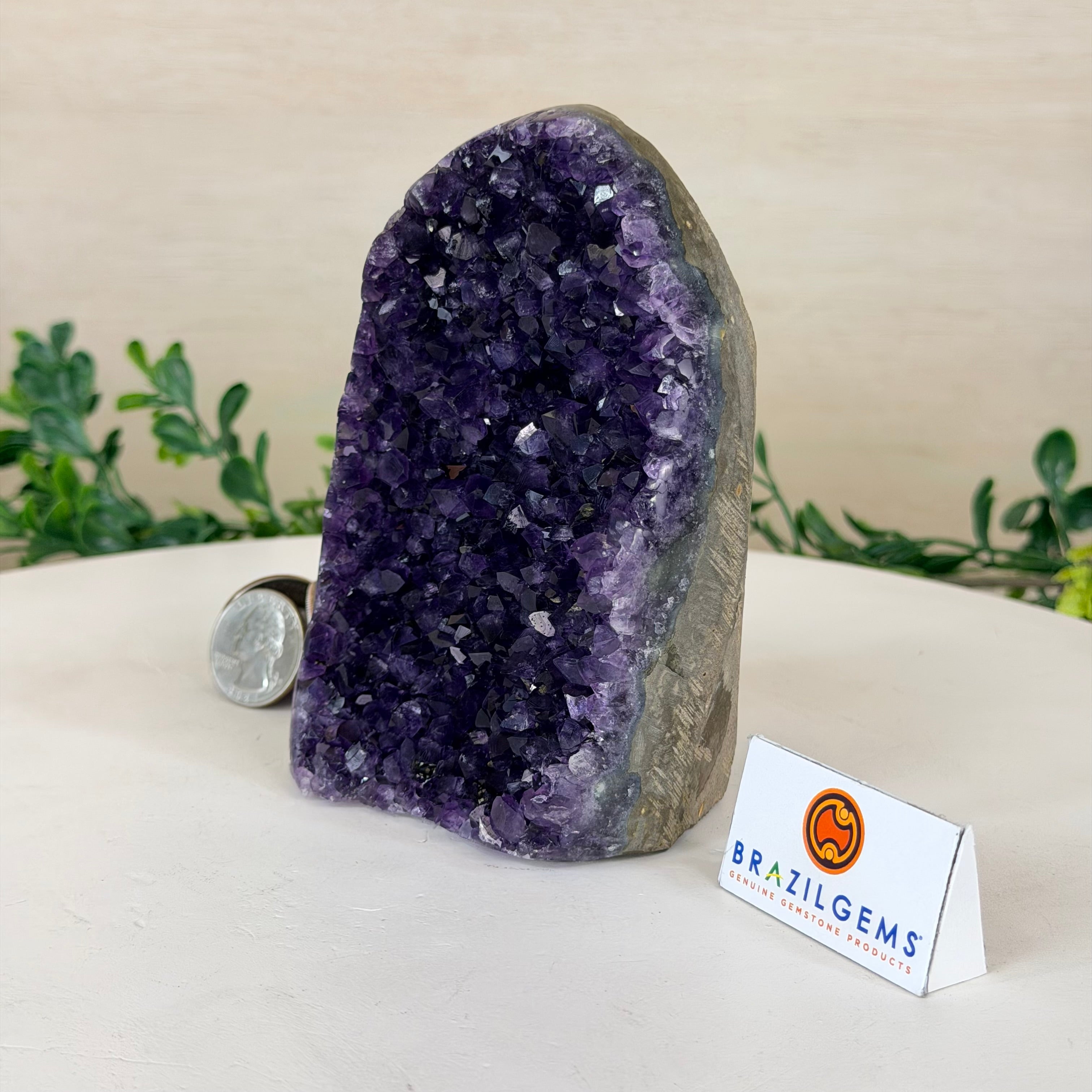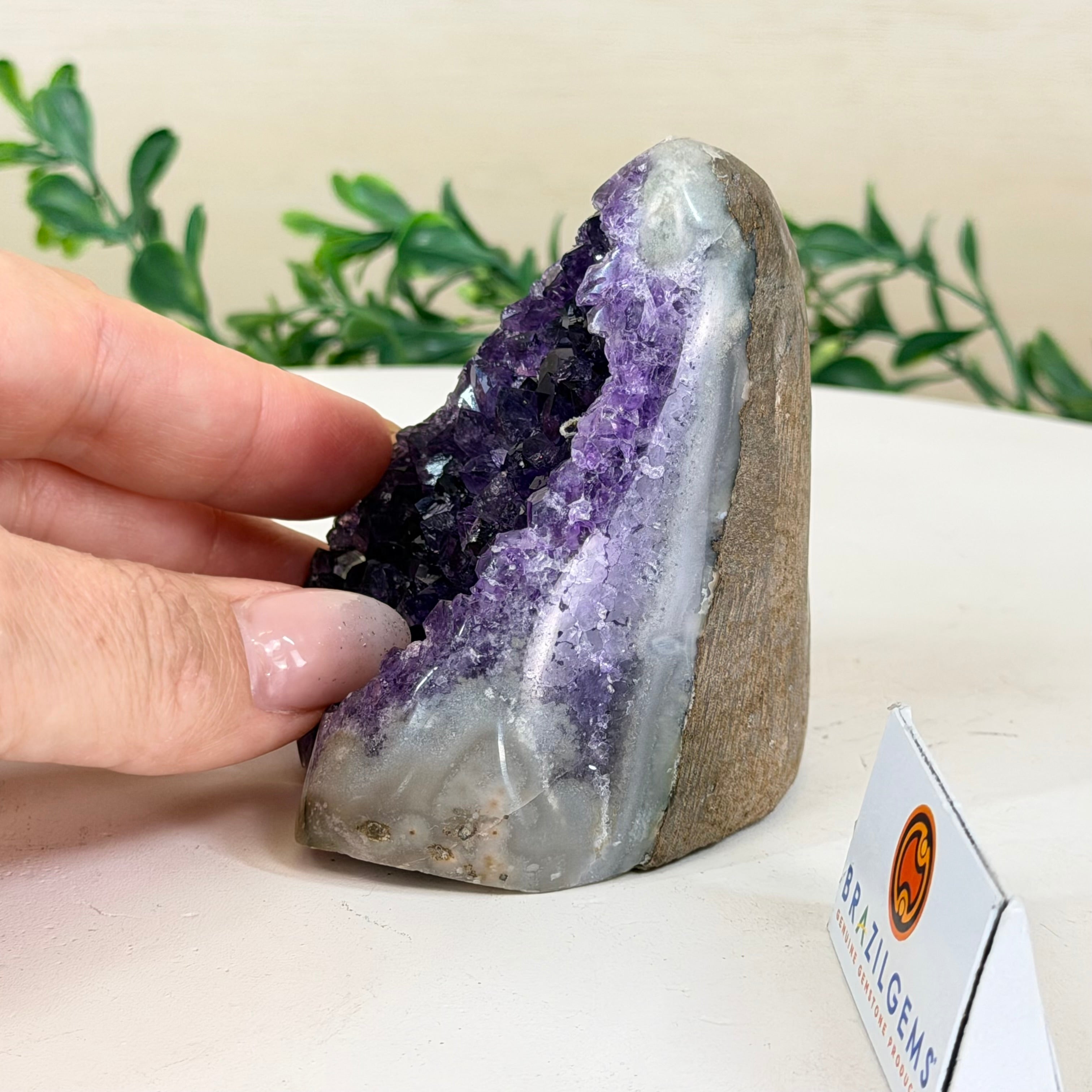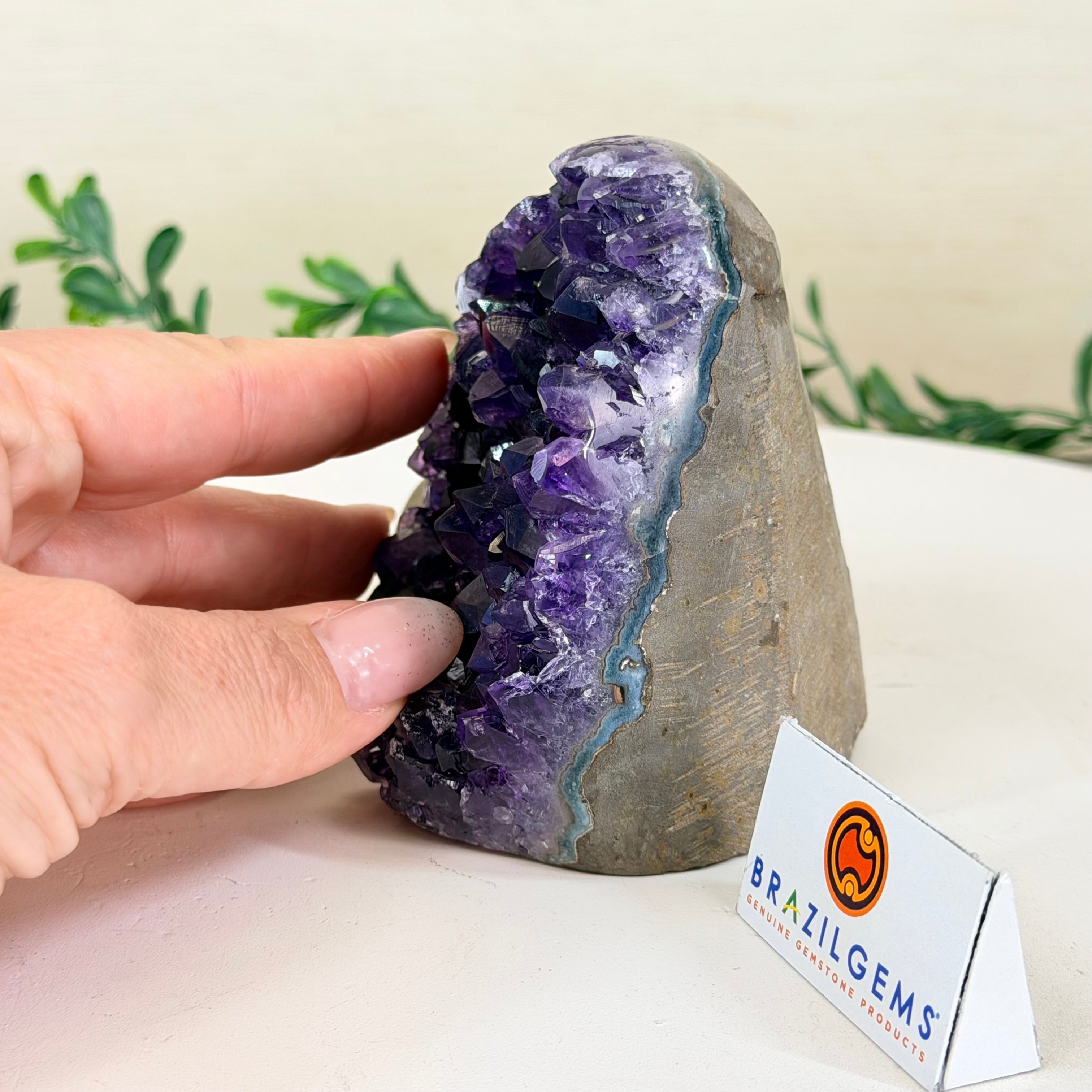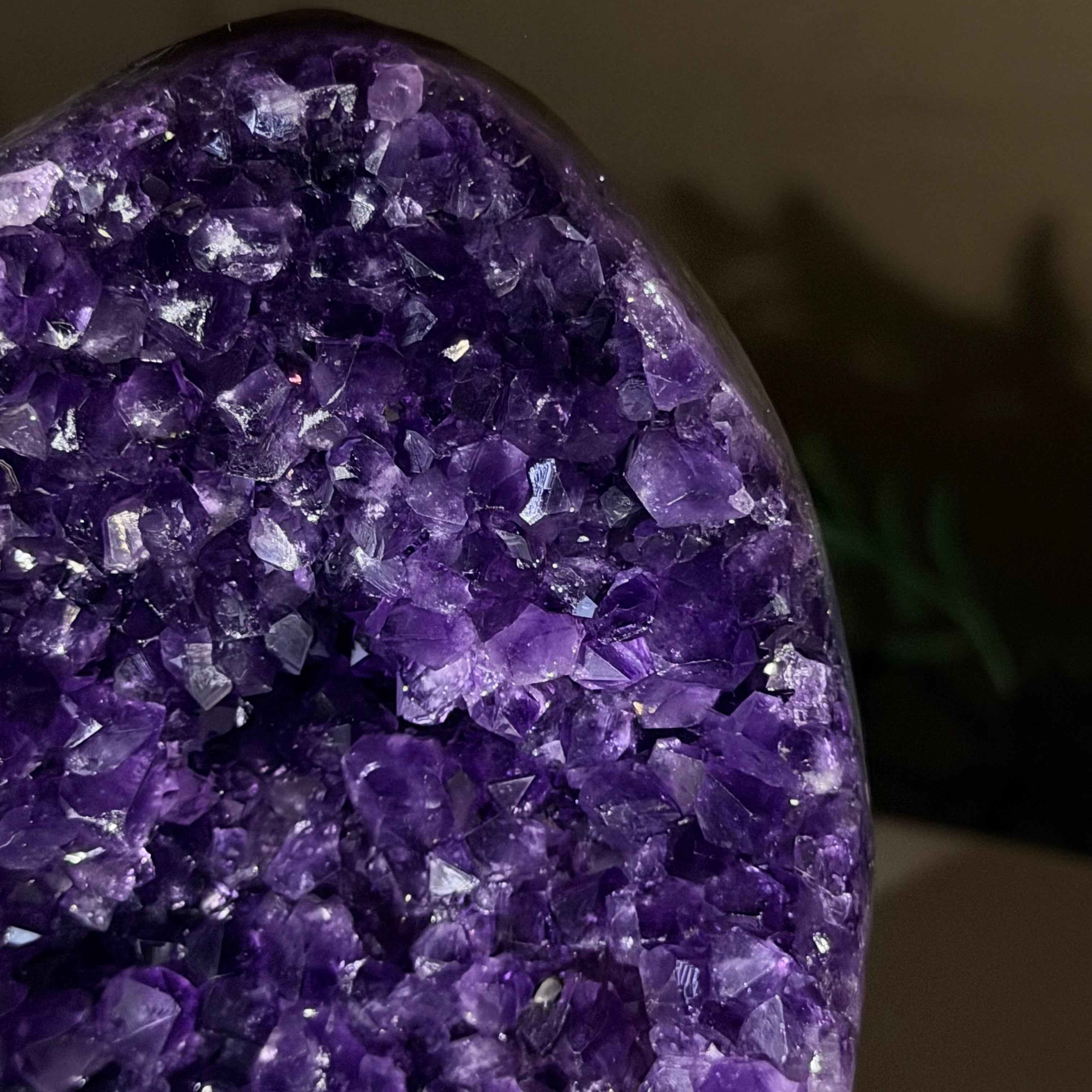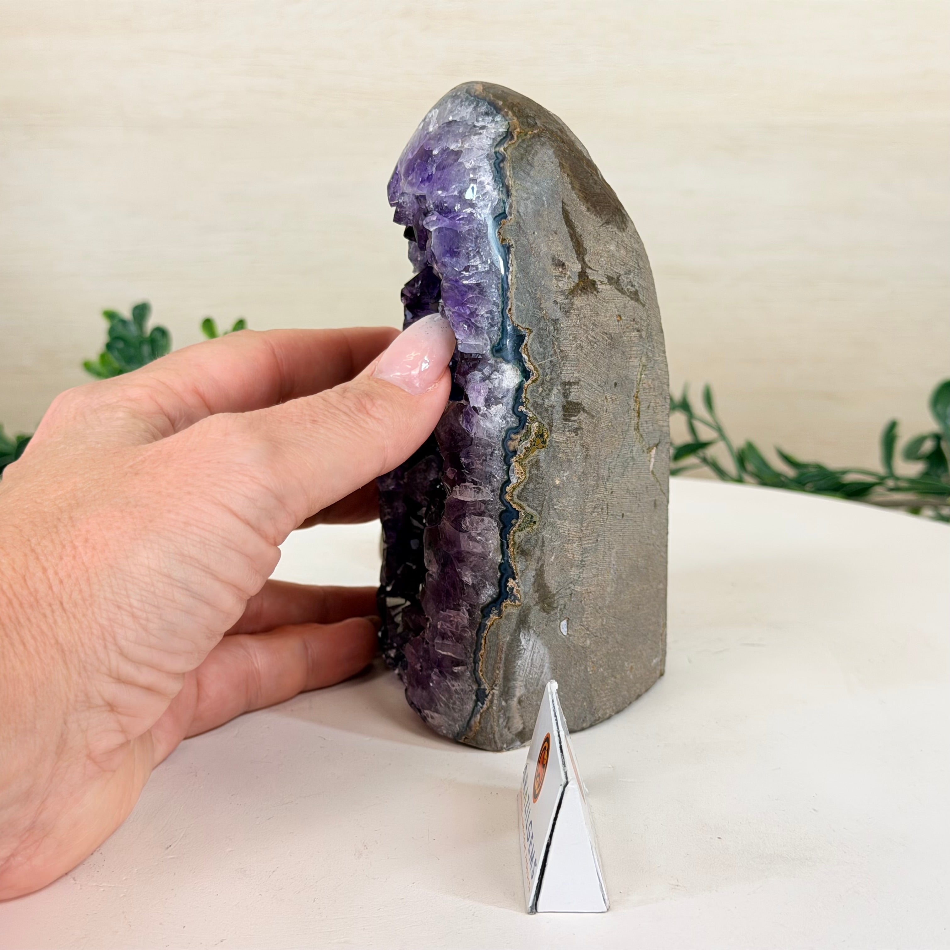 These clusters grow inside geodes–where mineral-rich water slowly deposits crystals over time. The result is a captivating arrangement of pointed amethyst crystals that can beautify any space.