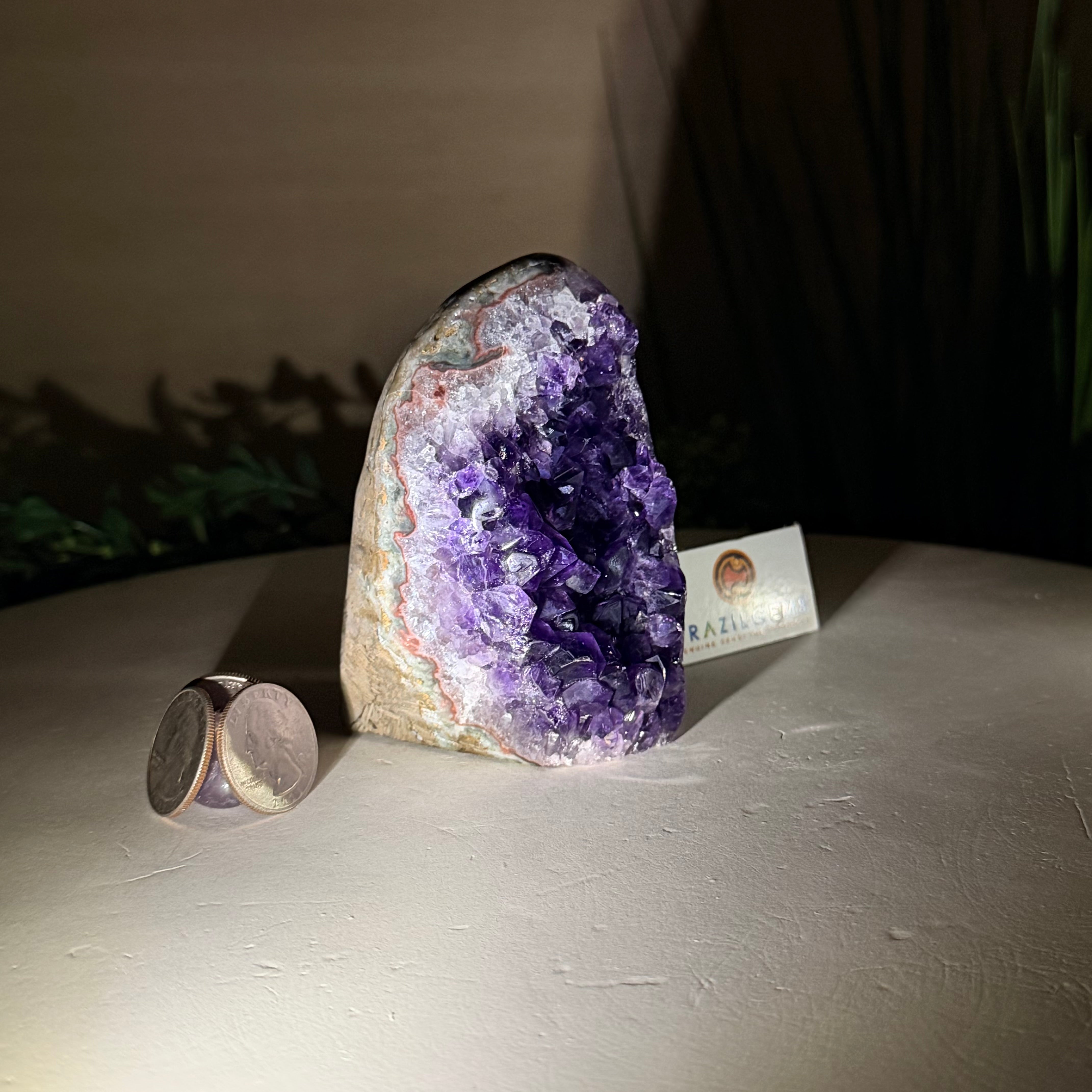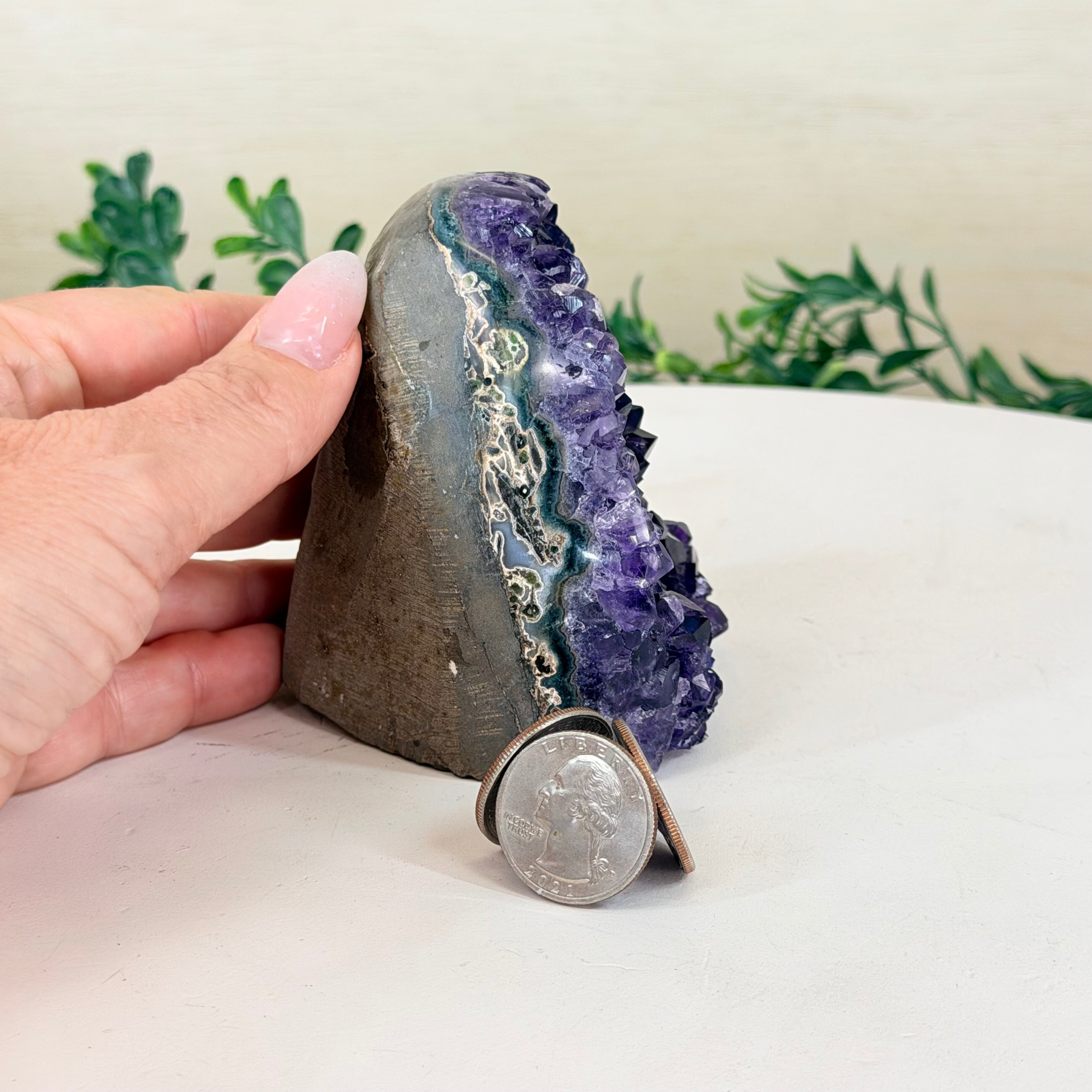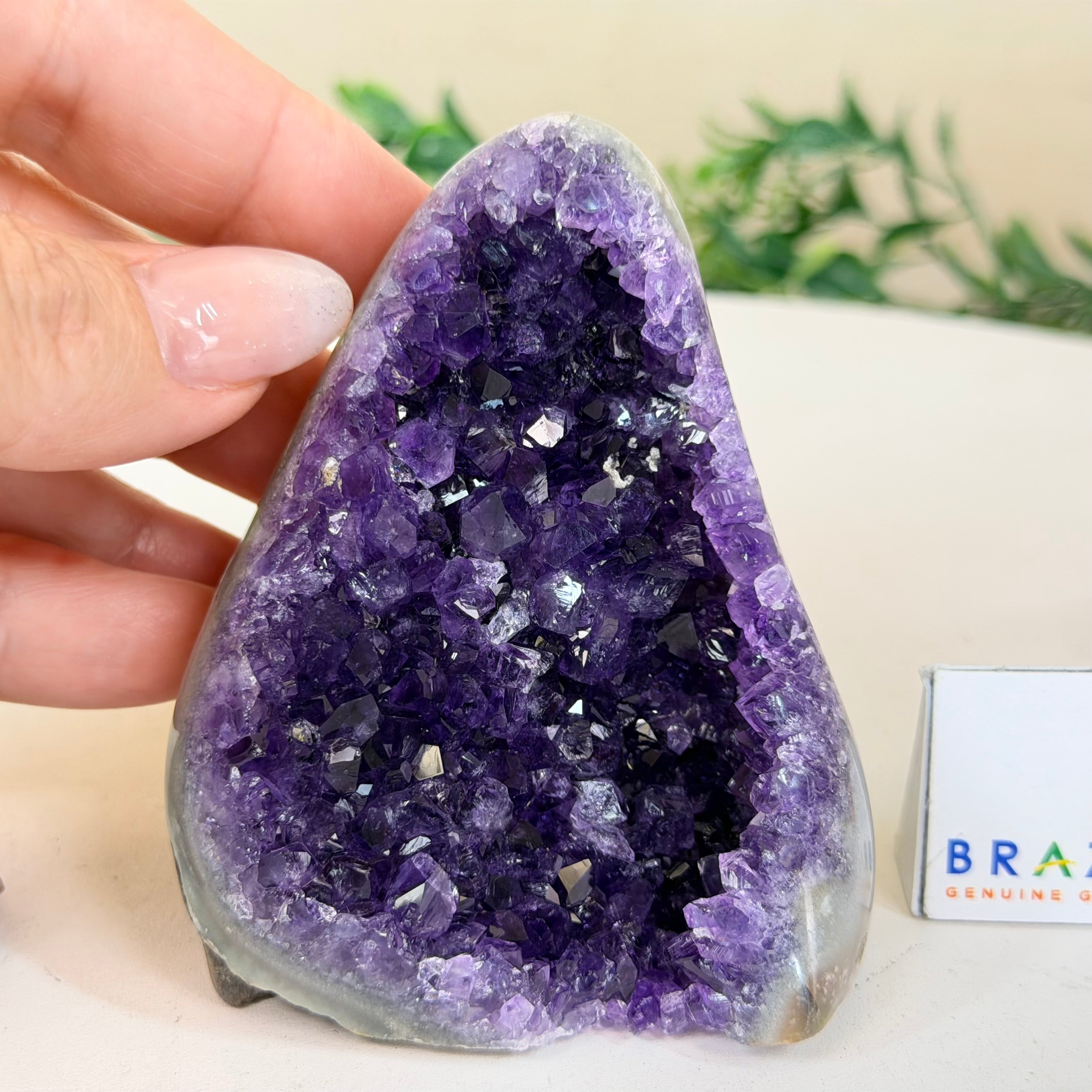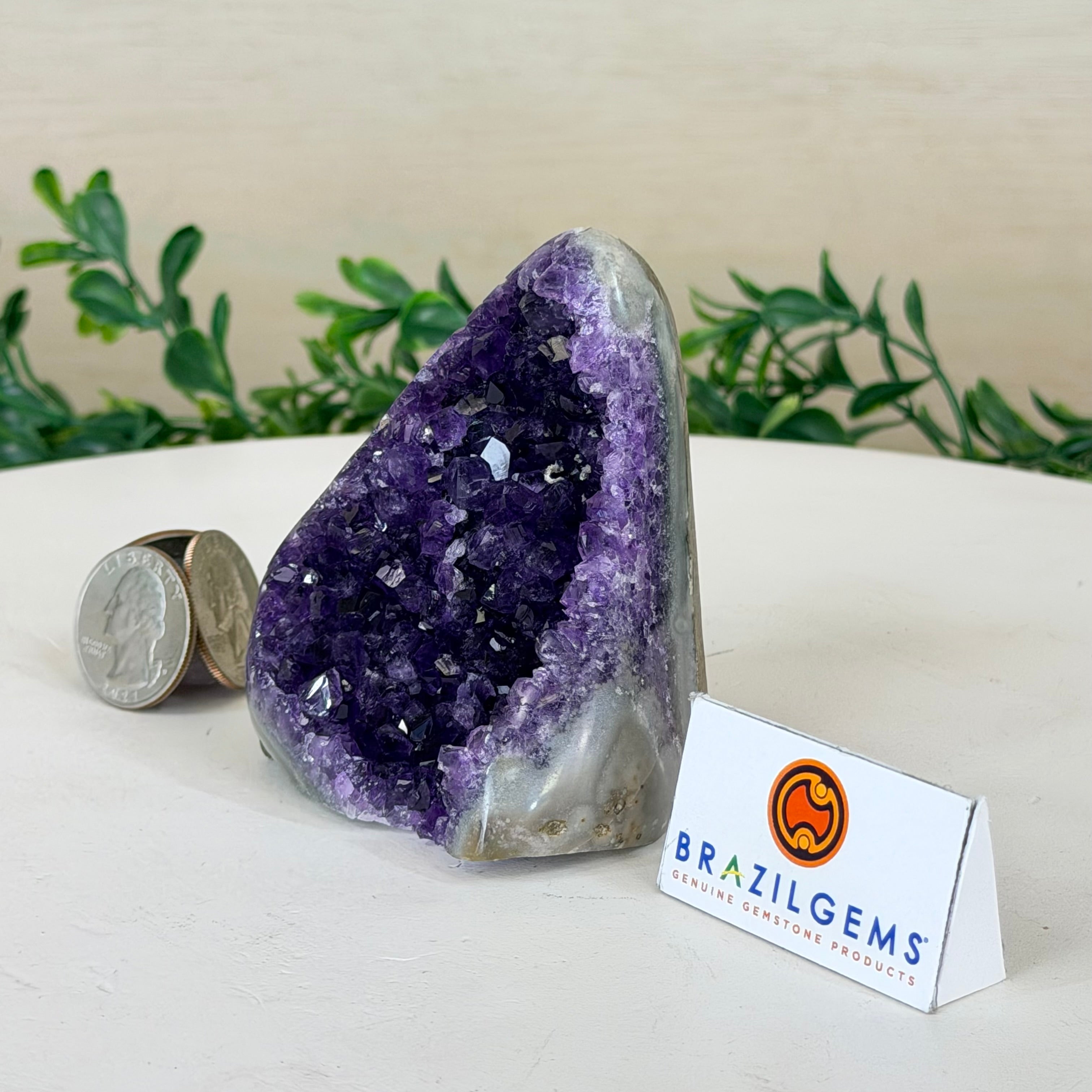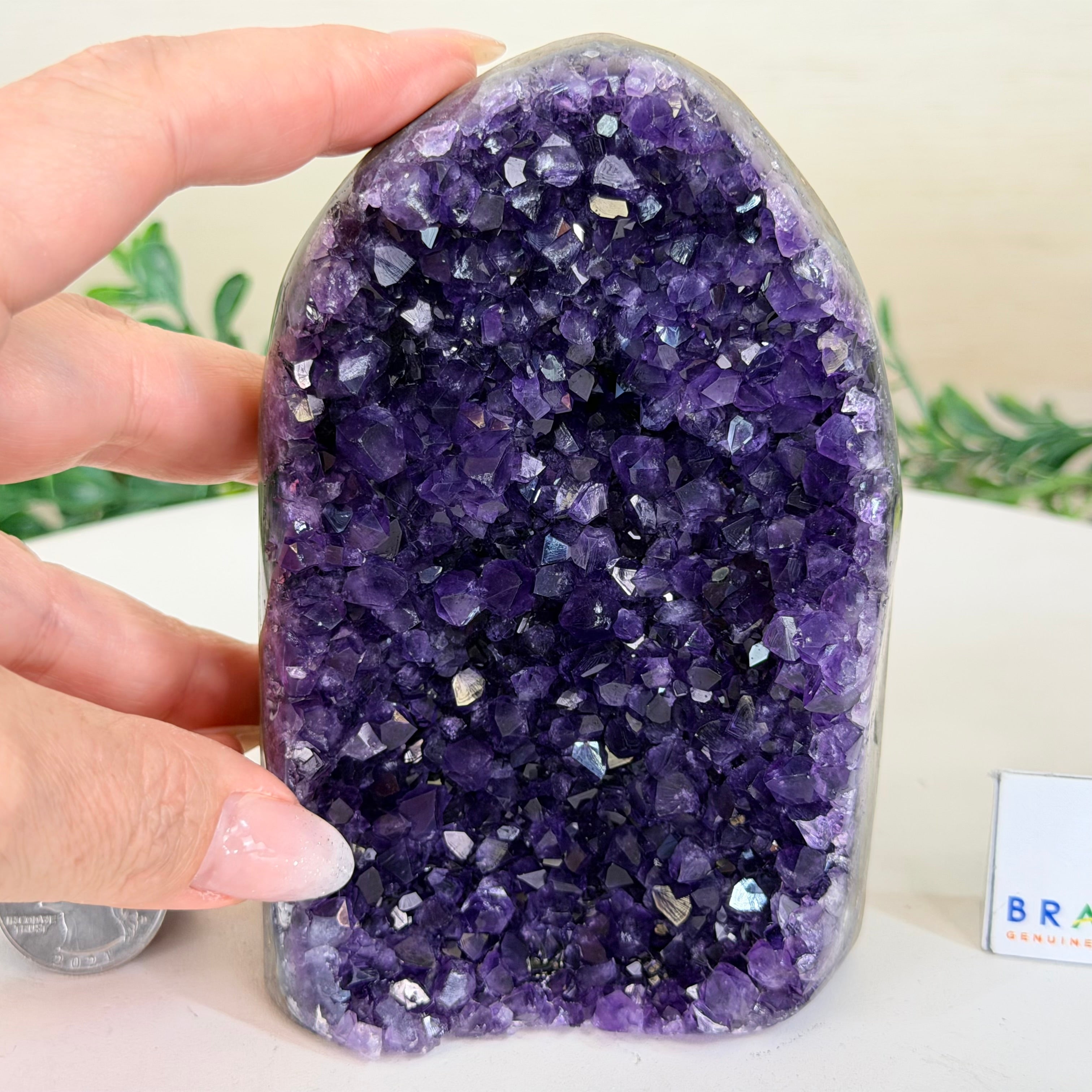 These clusters grow inside geodes–where mineral-rich water slowly deposits crystals over time. The result is a captivating arrangement of pointed amethyst crystals that can beautify any space.