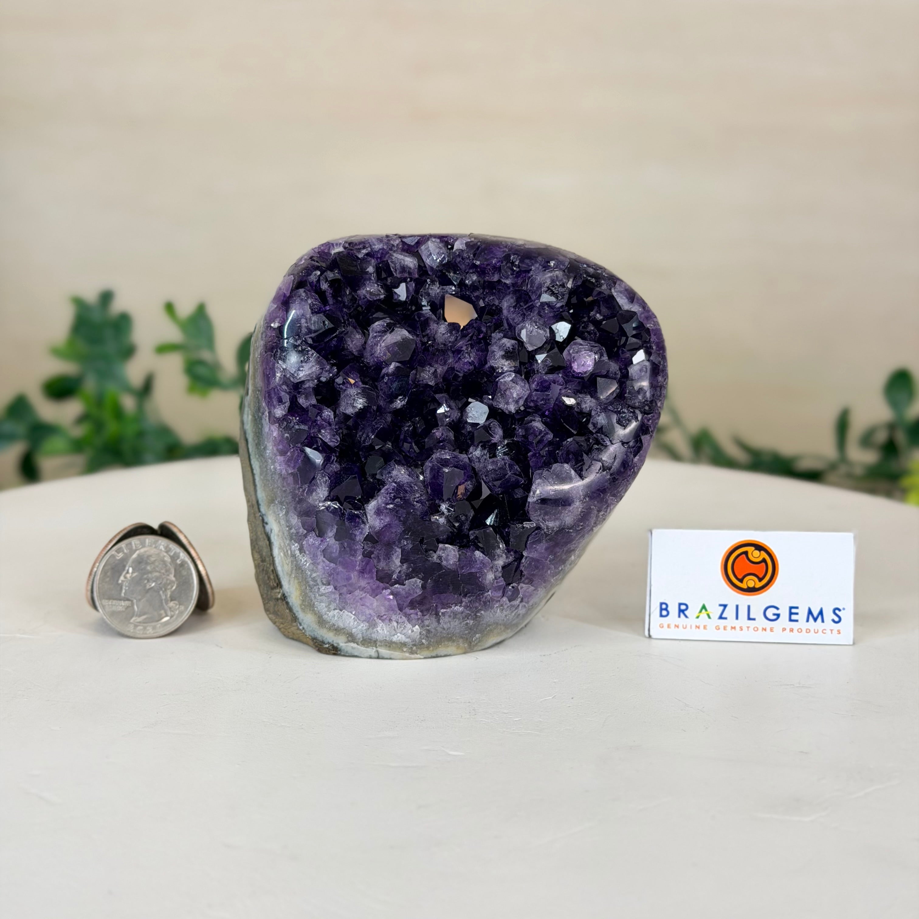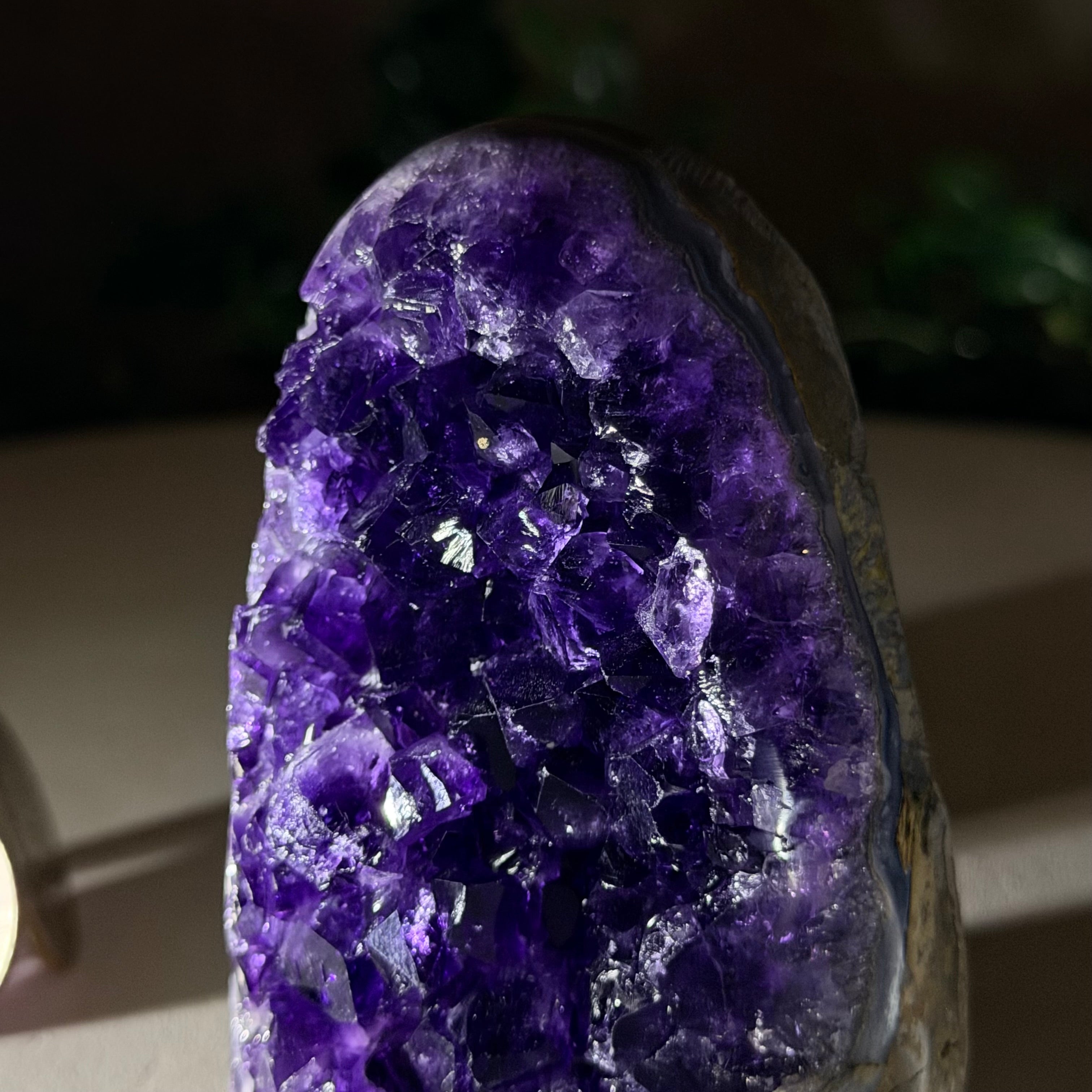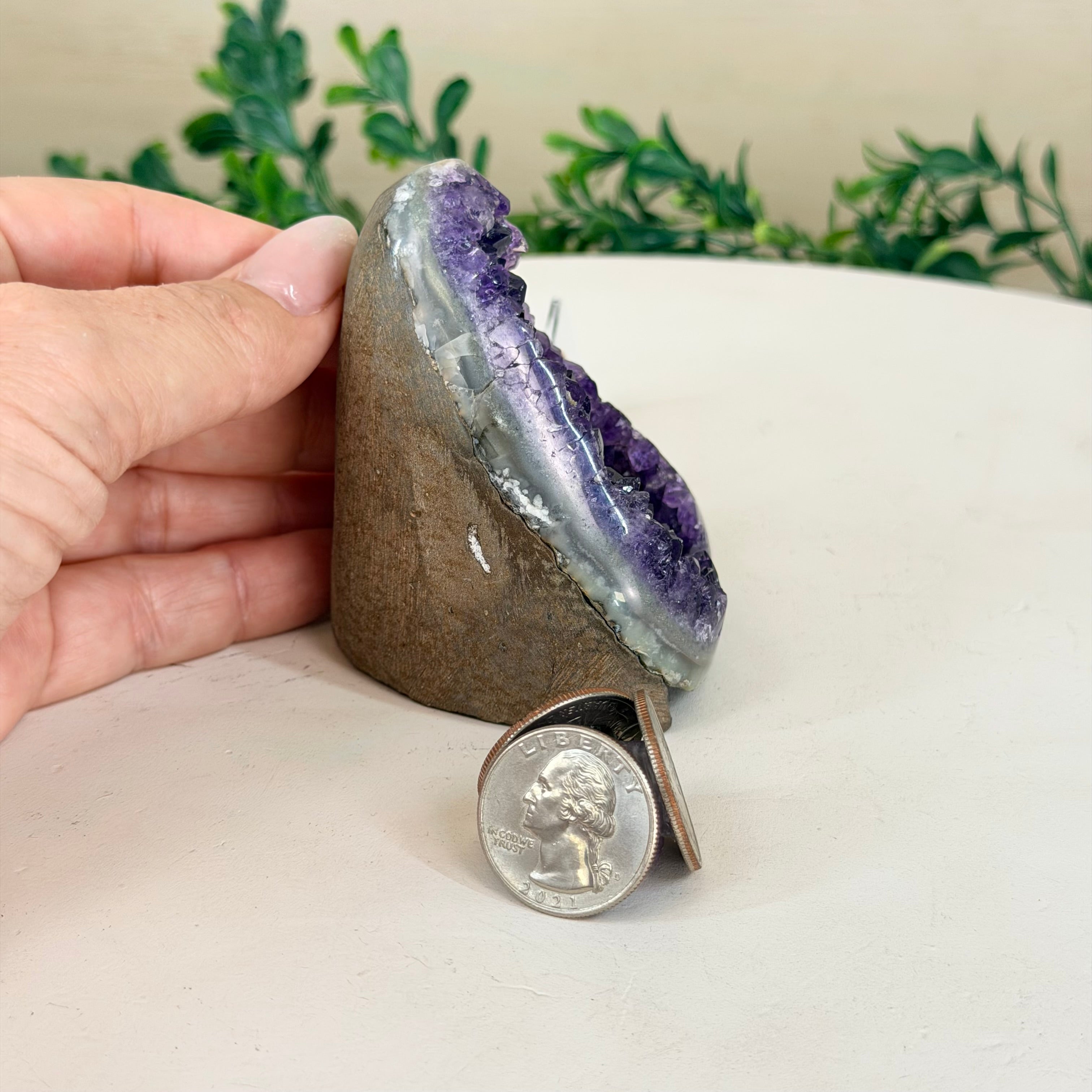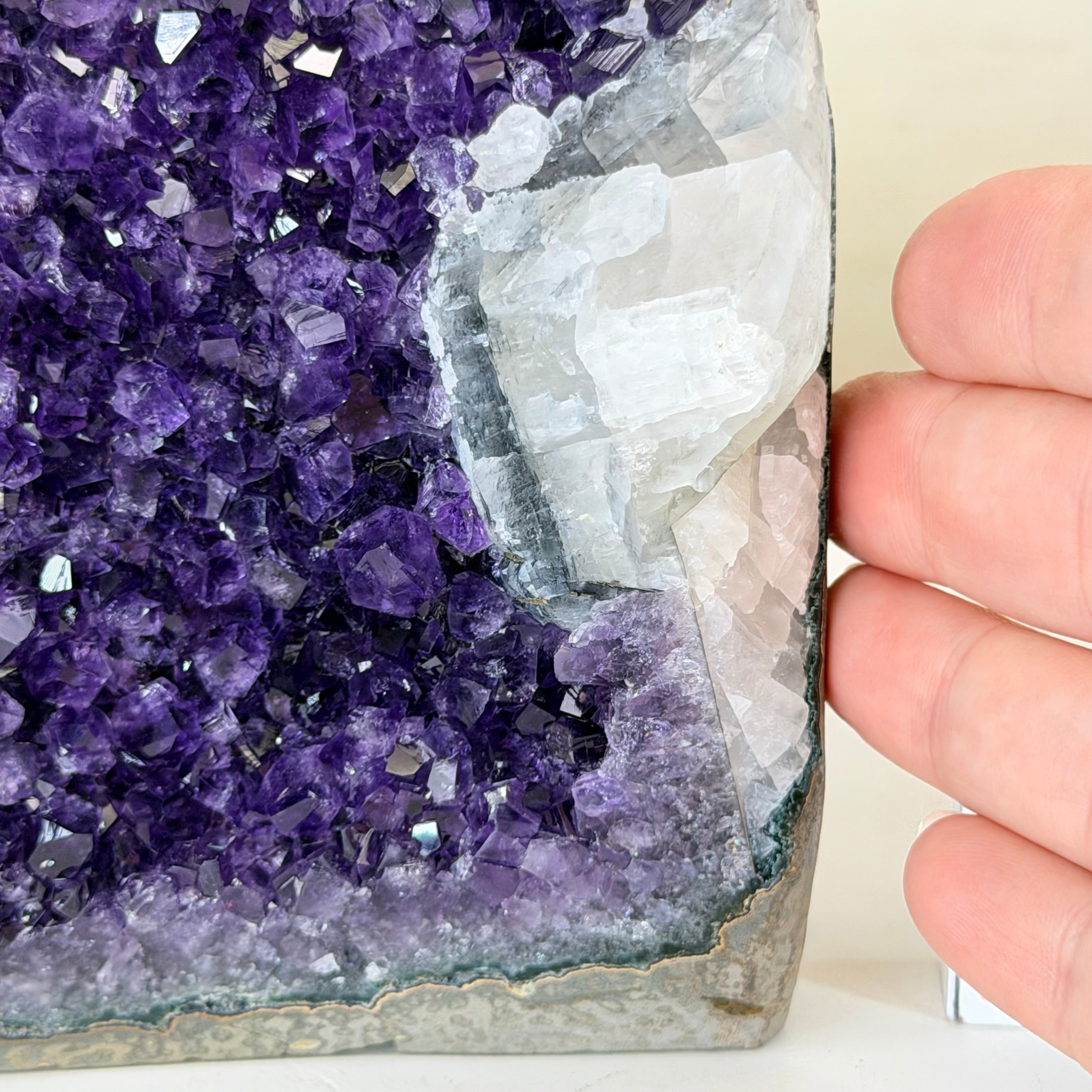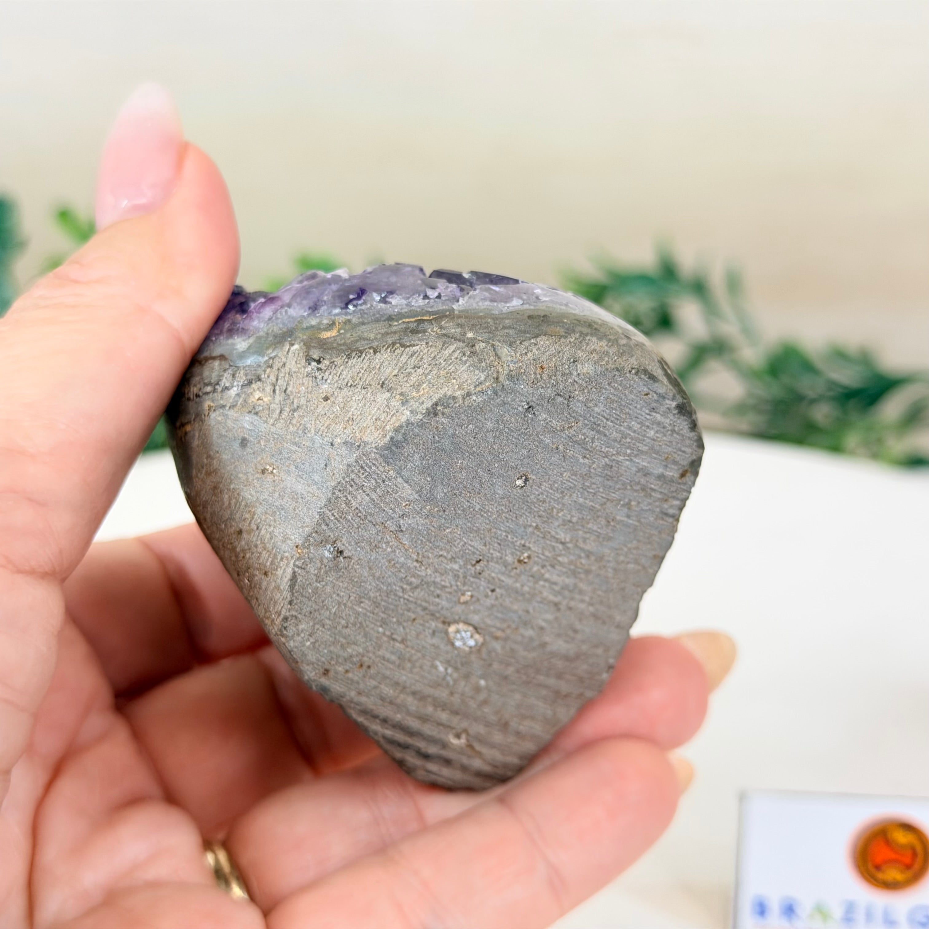 These clusters grow inside geodes–where mineral-rich water slowly deposits crystals over time. The result is a captivating arrangement of pointed amethyst crystals that can beautify any space.