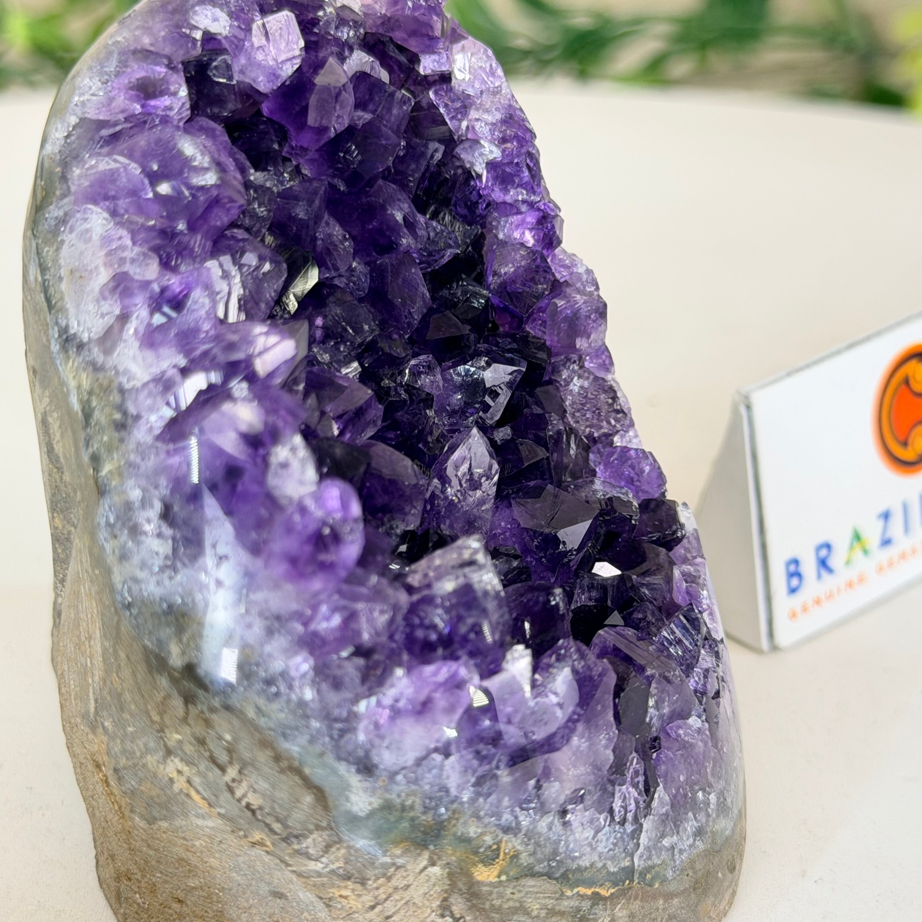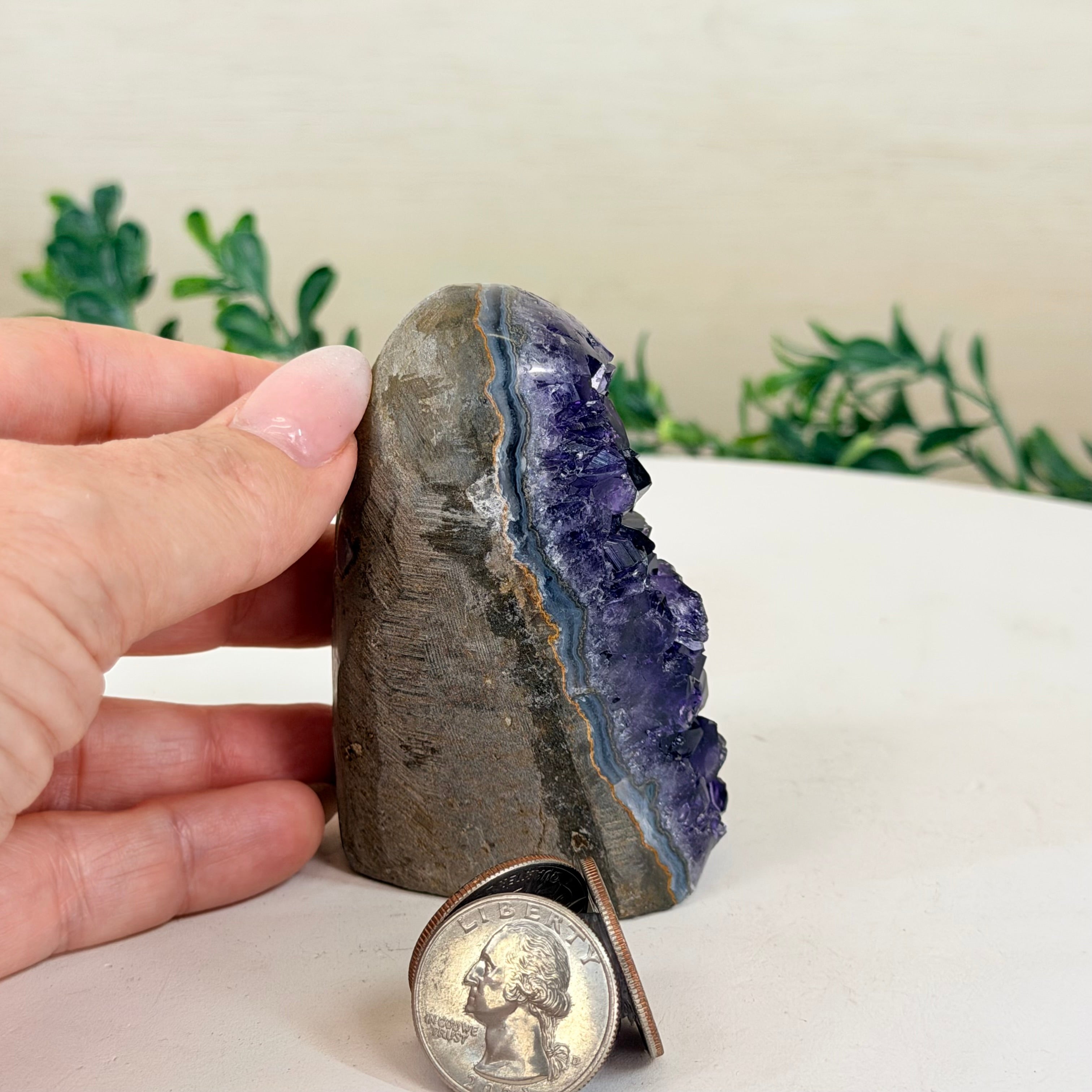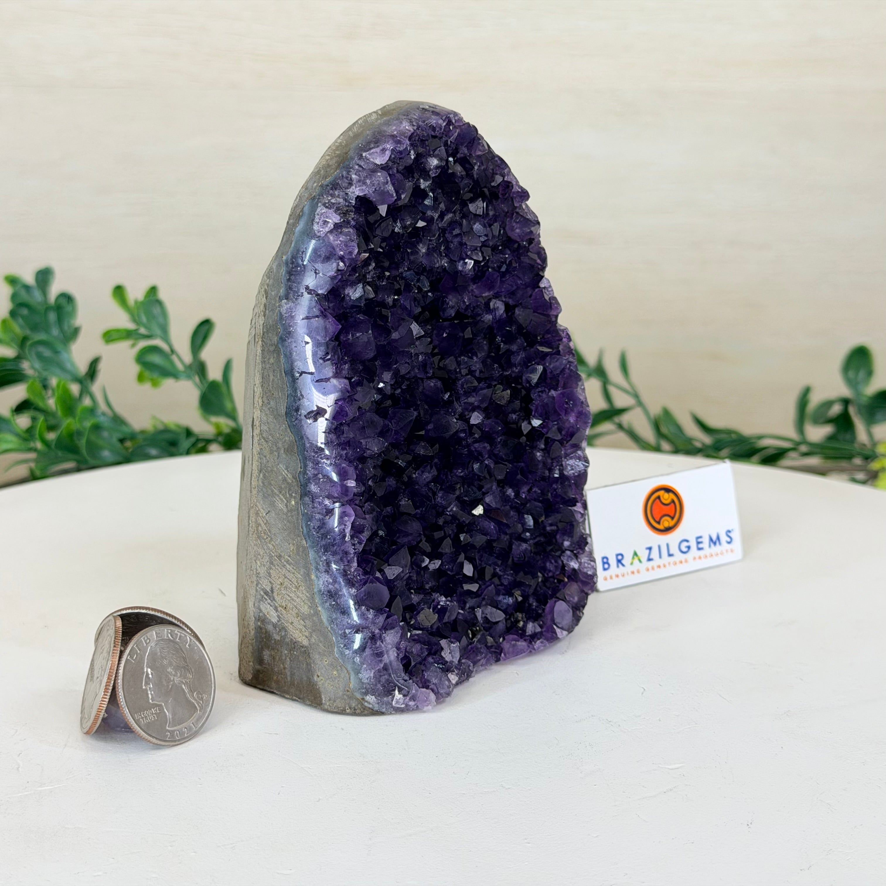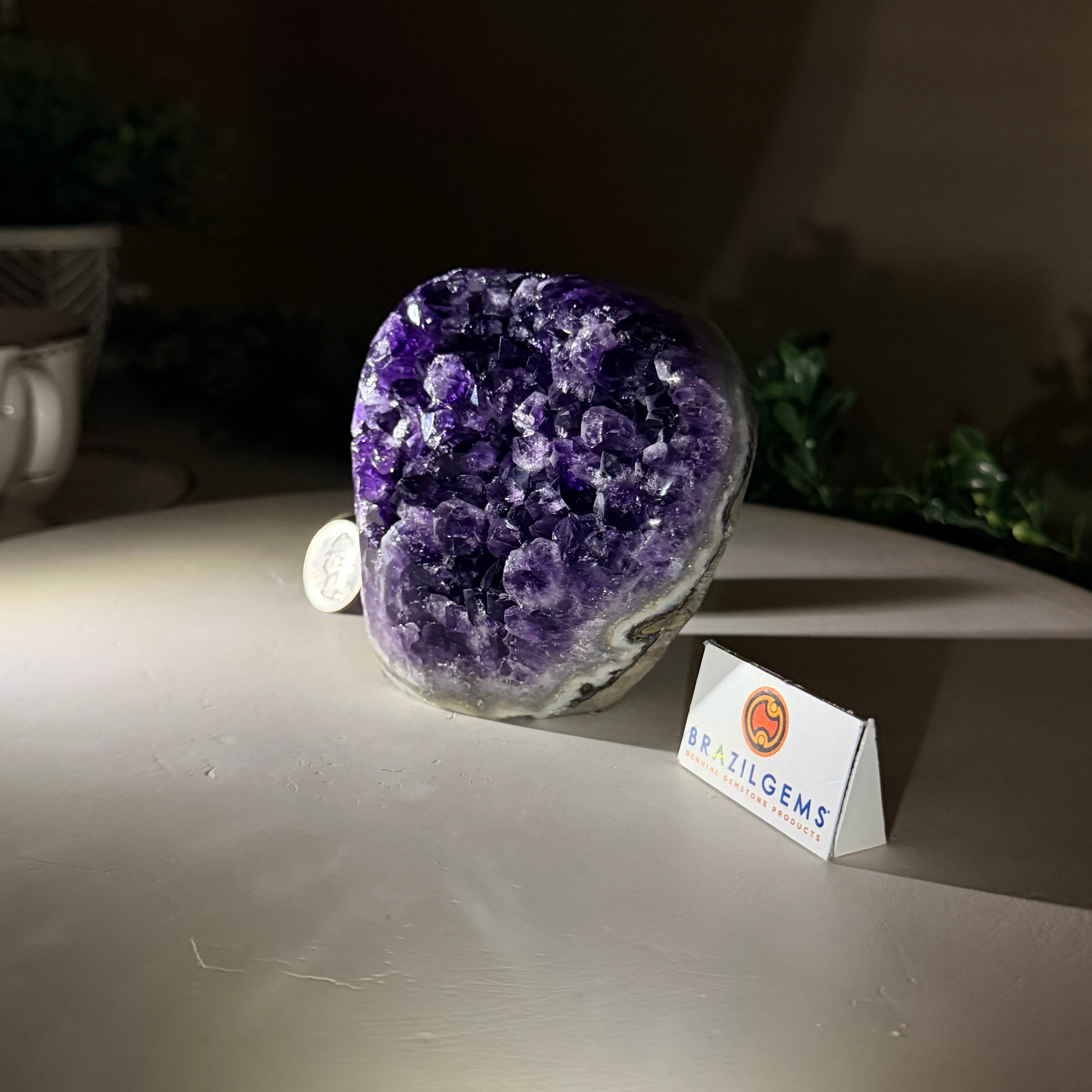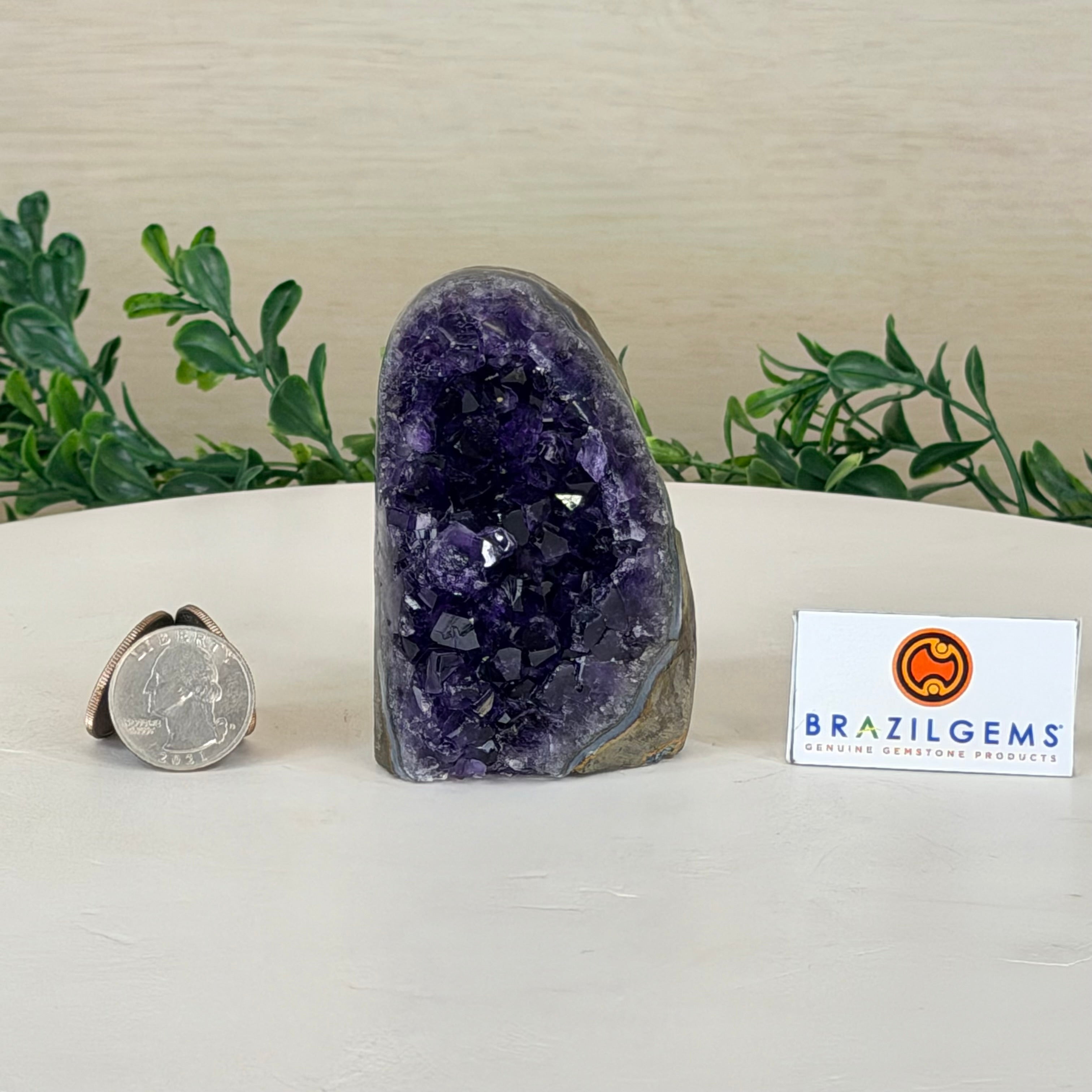 These clusters grow inside geodes–where mineral-rich water slowly deposits crystals over time. The result is a captivating arrangement of pointed amethyst crystals that can beautify any space.