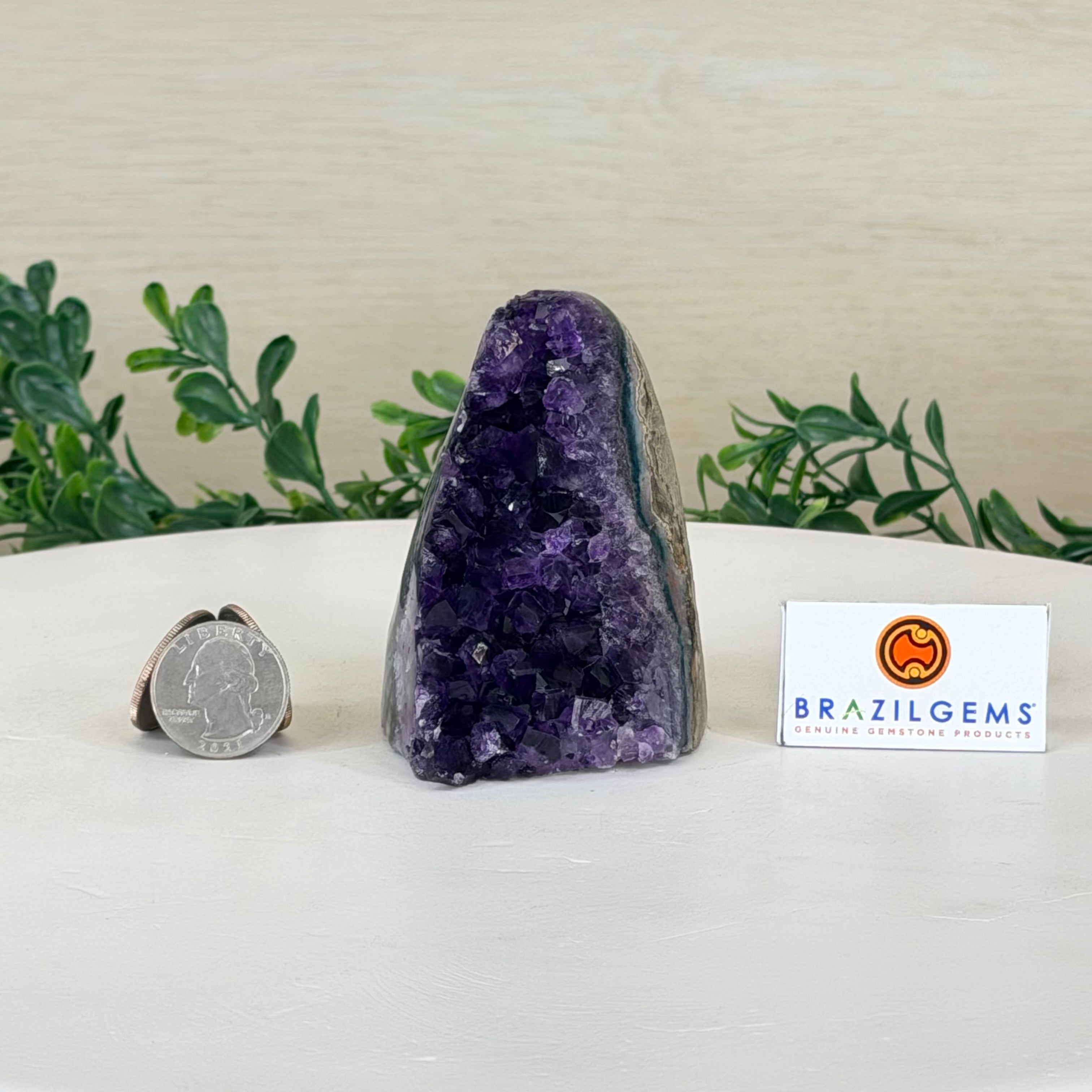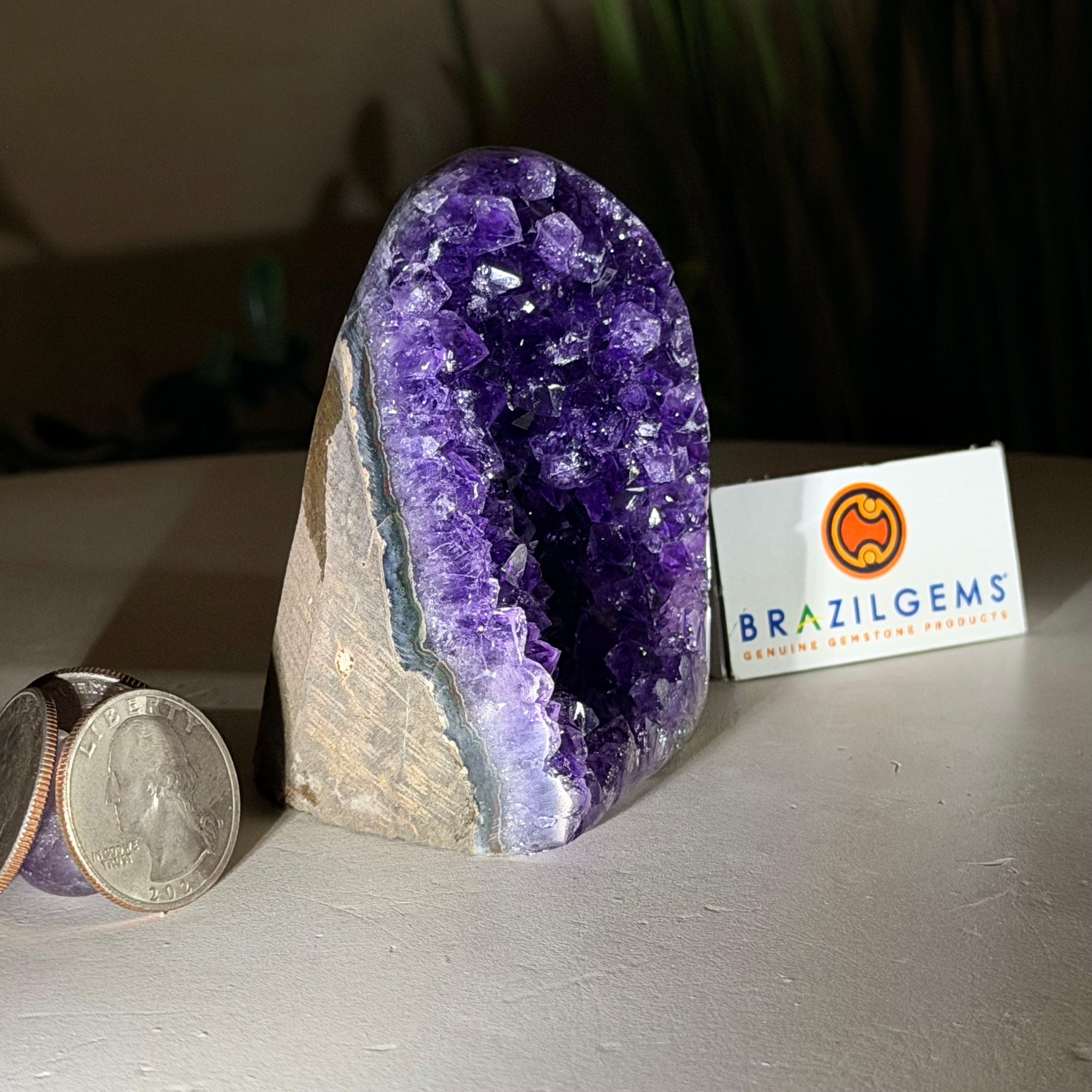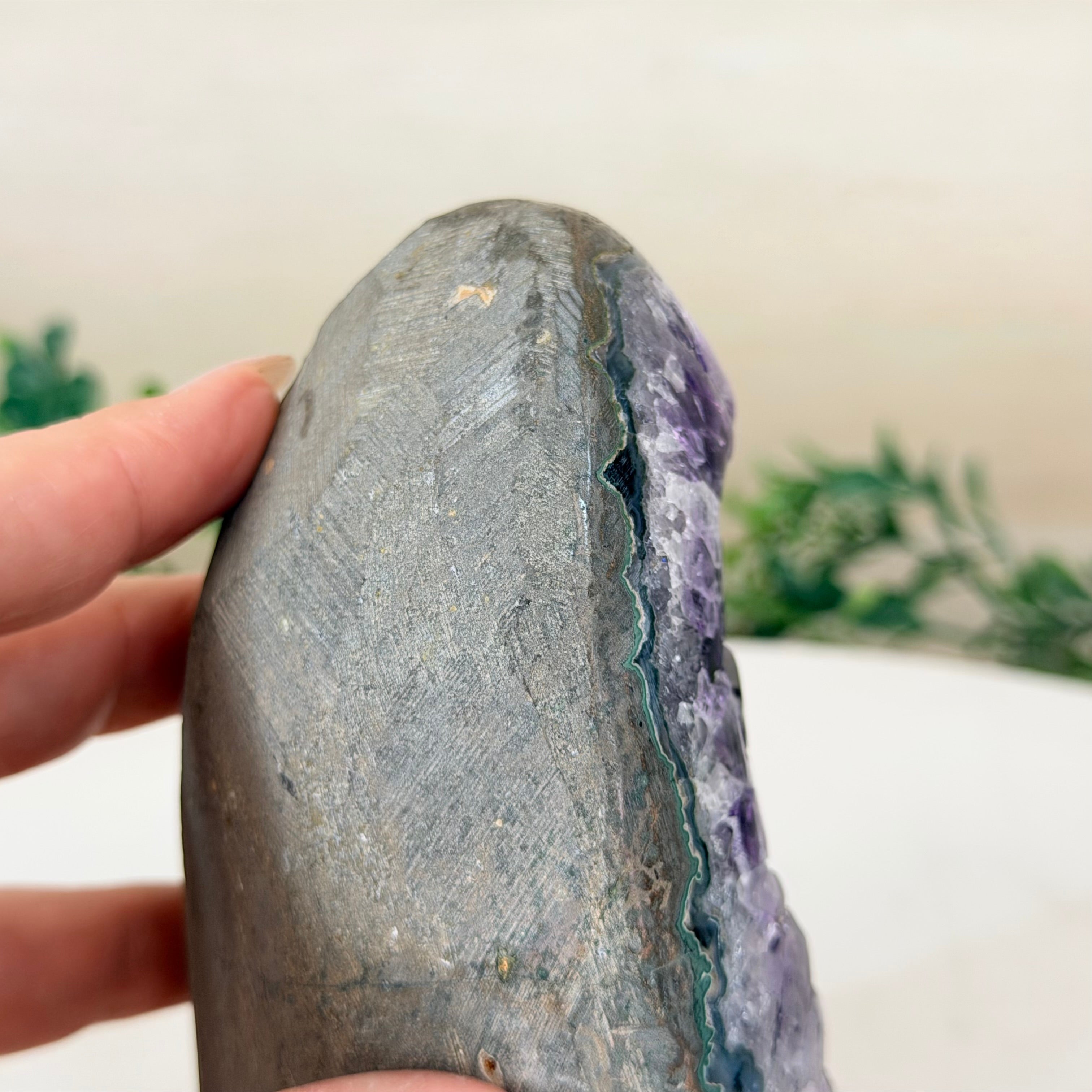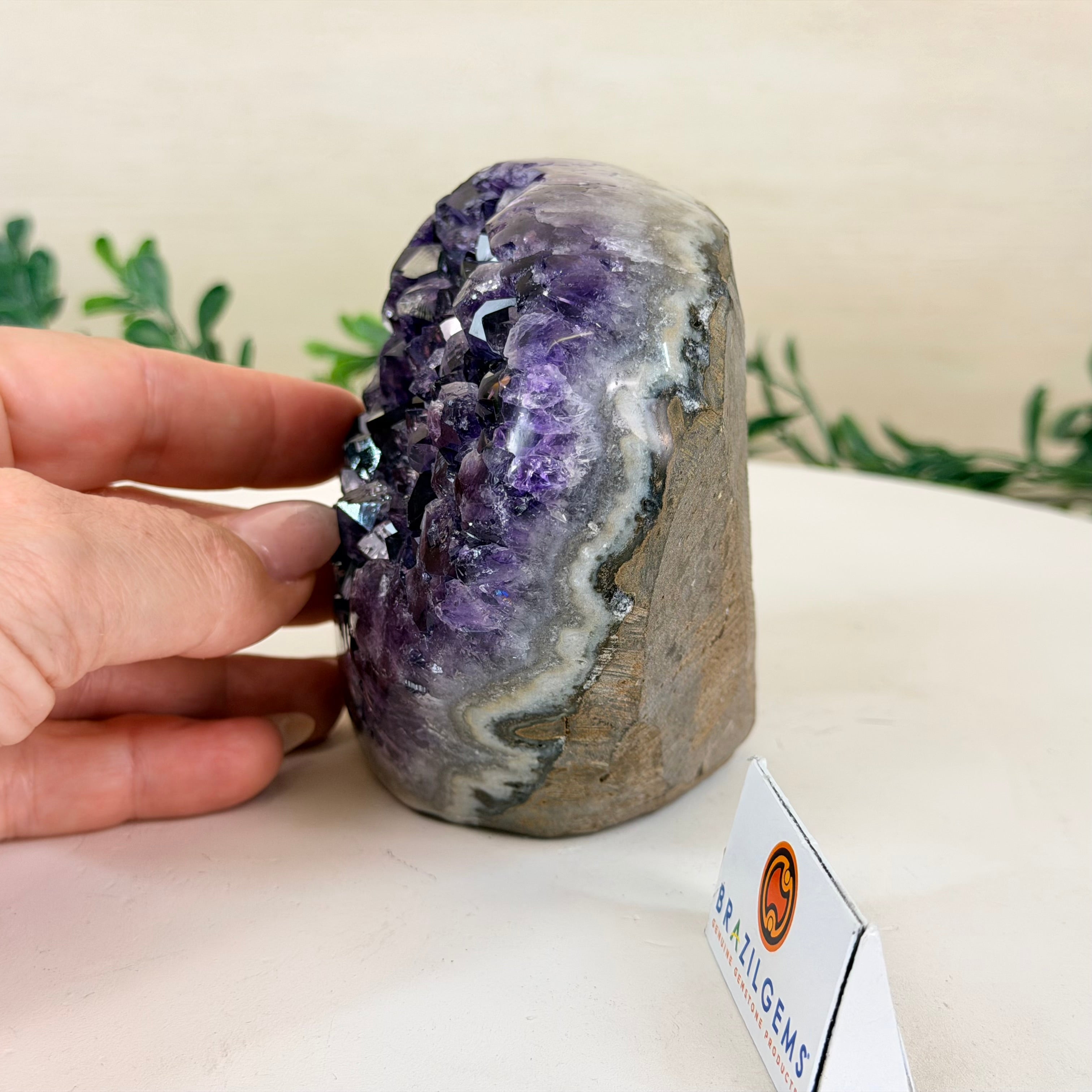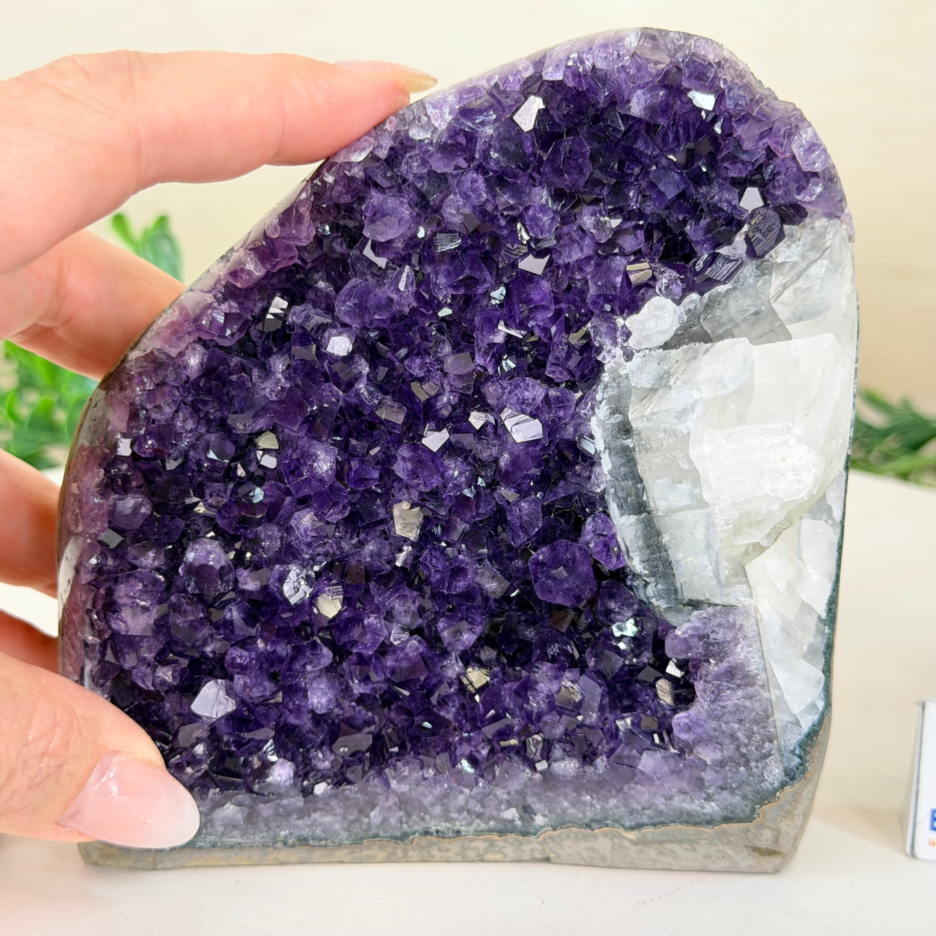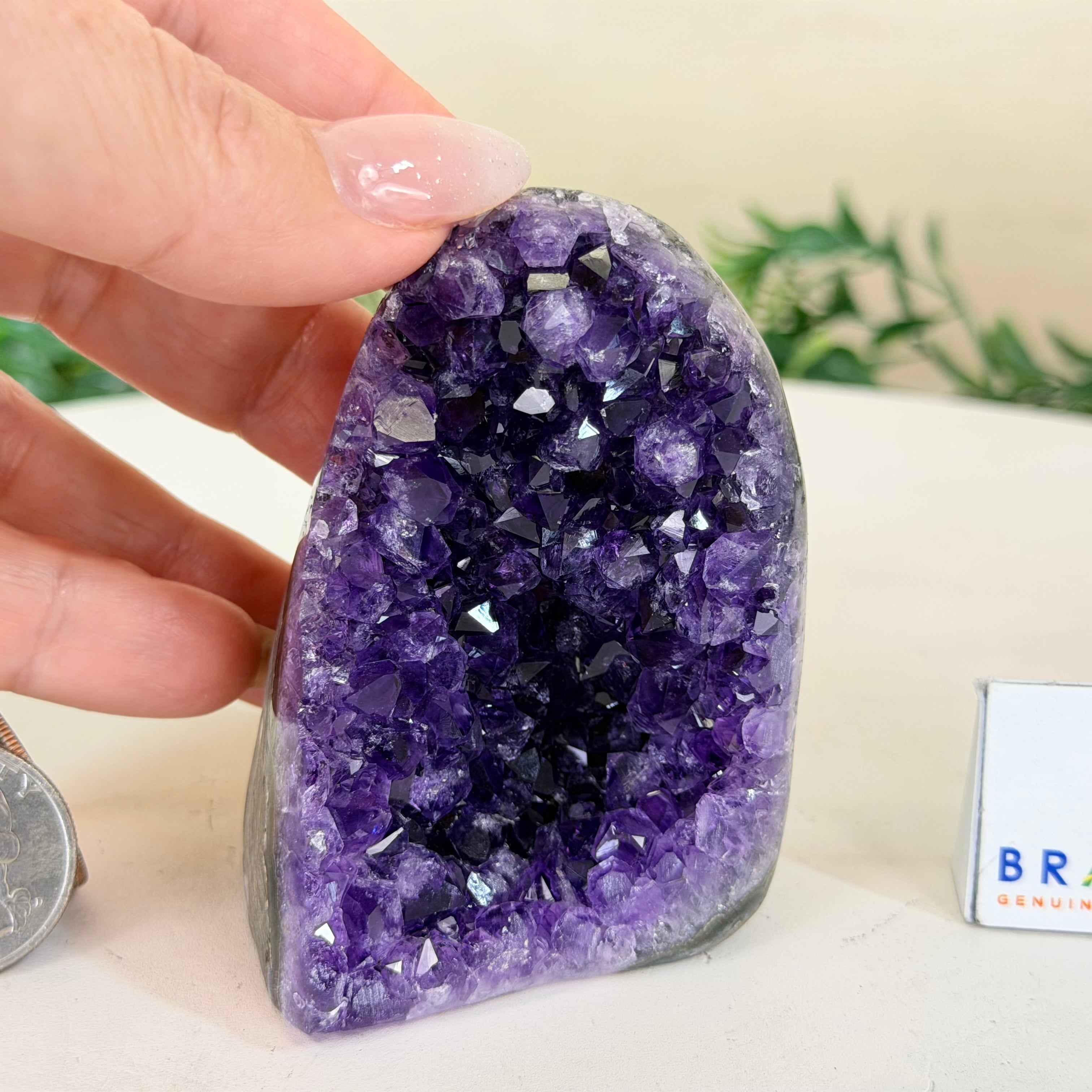 These clusters grow inside geodes–where mineral-rich water slowly deposits crystals over time. The result is a captivating arrangement of pointed amethyst crystals that can beautify any space.