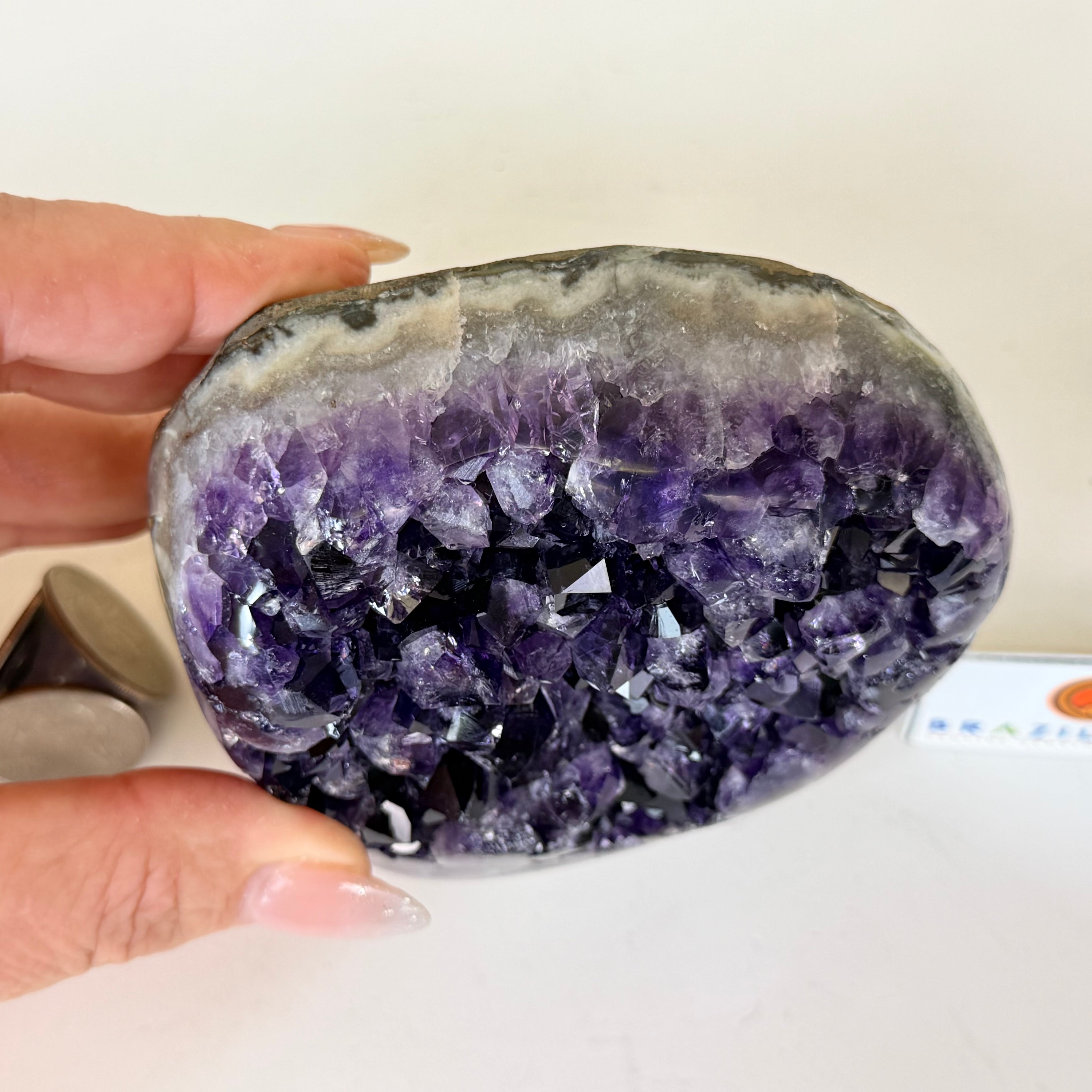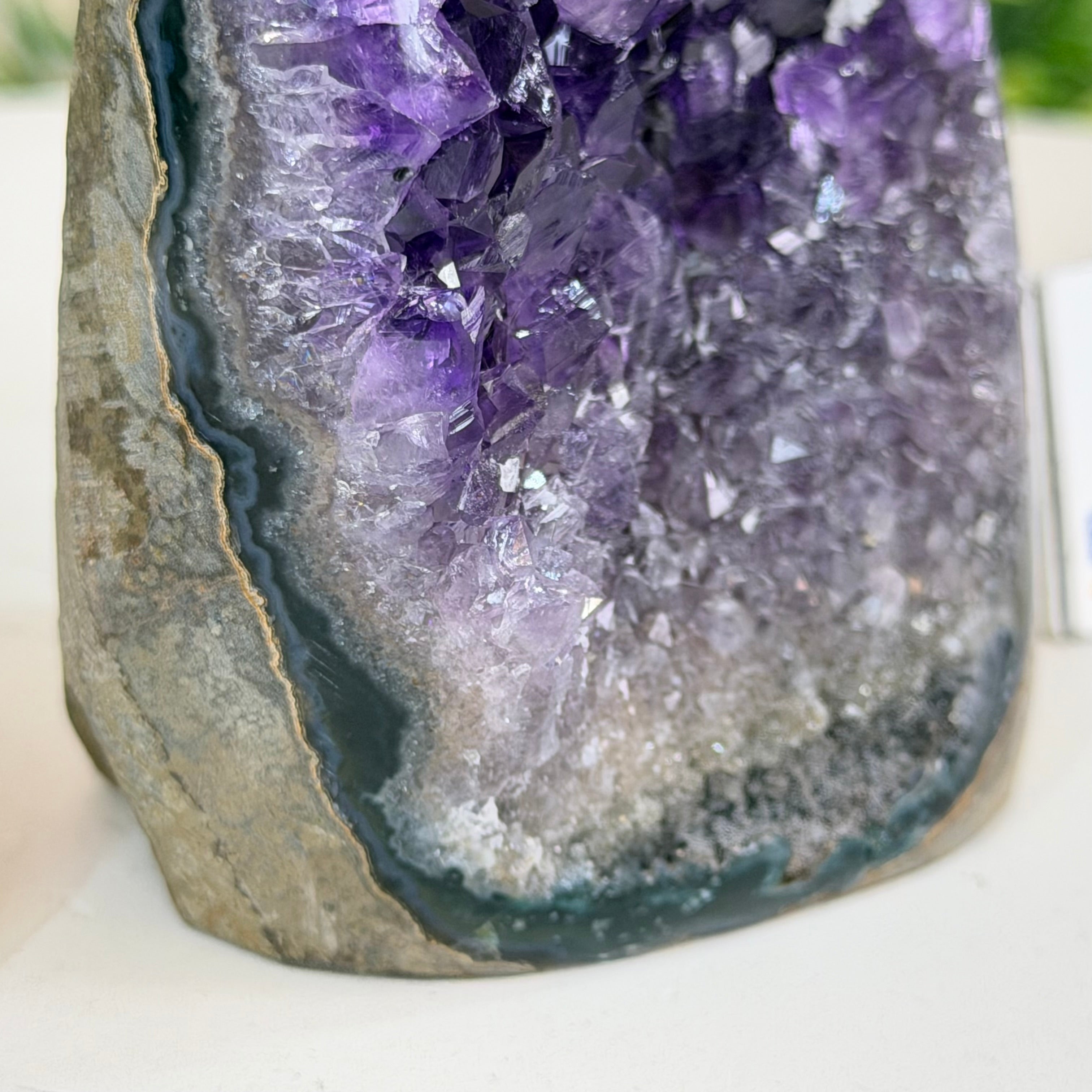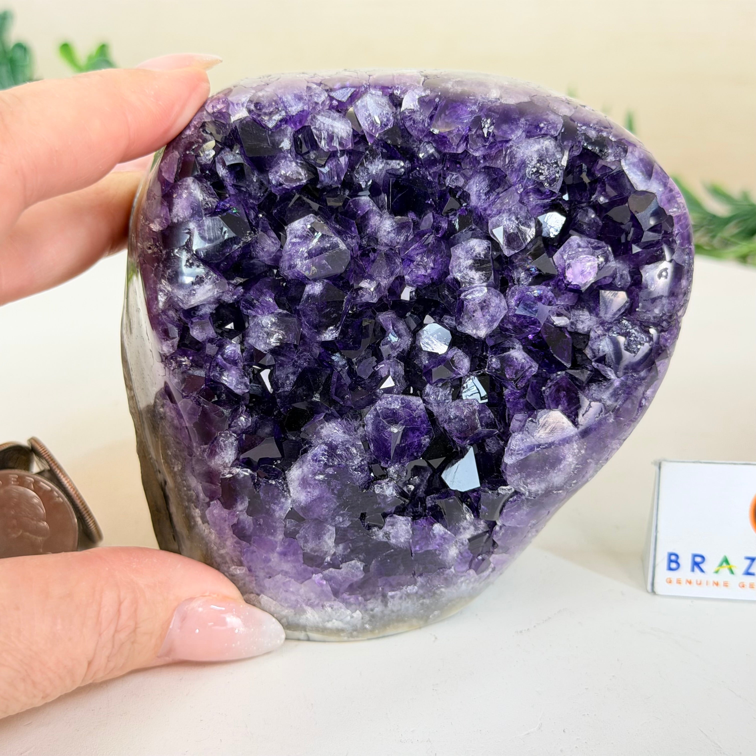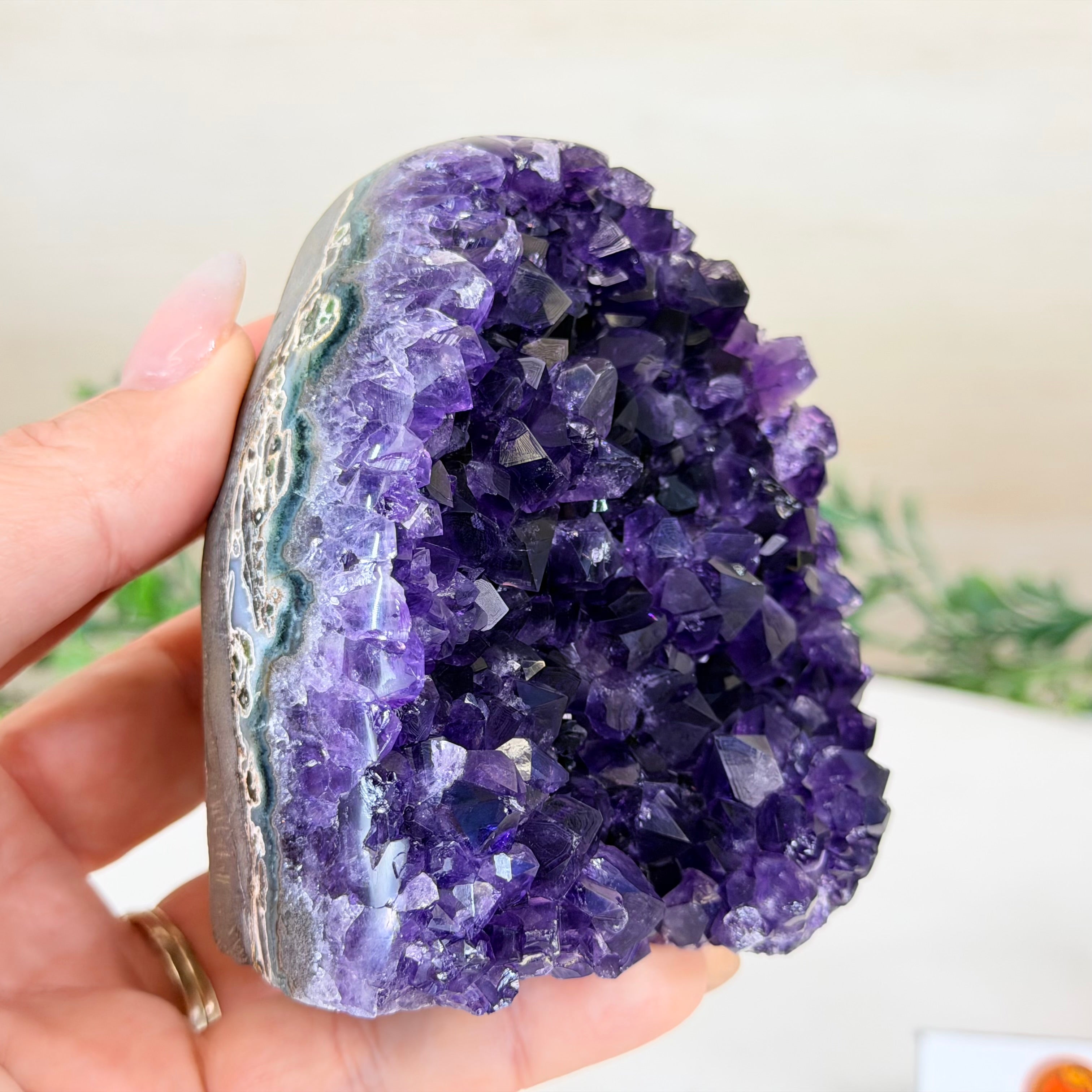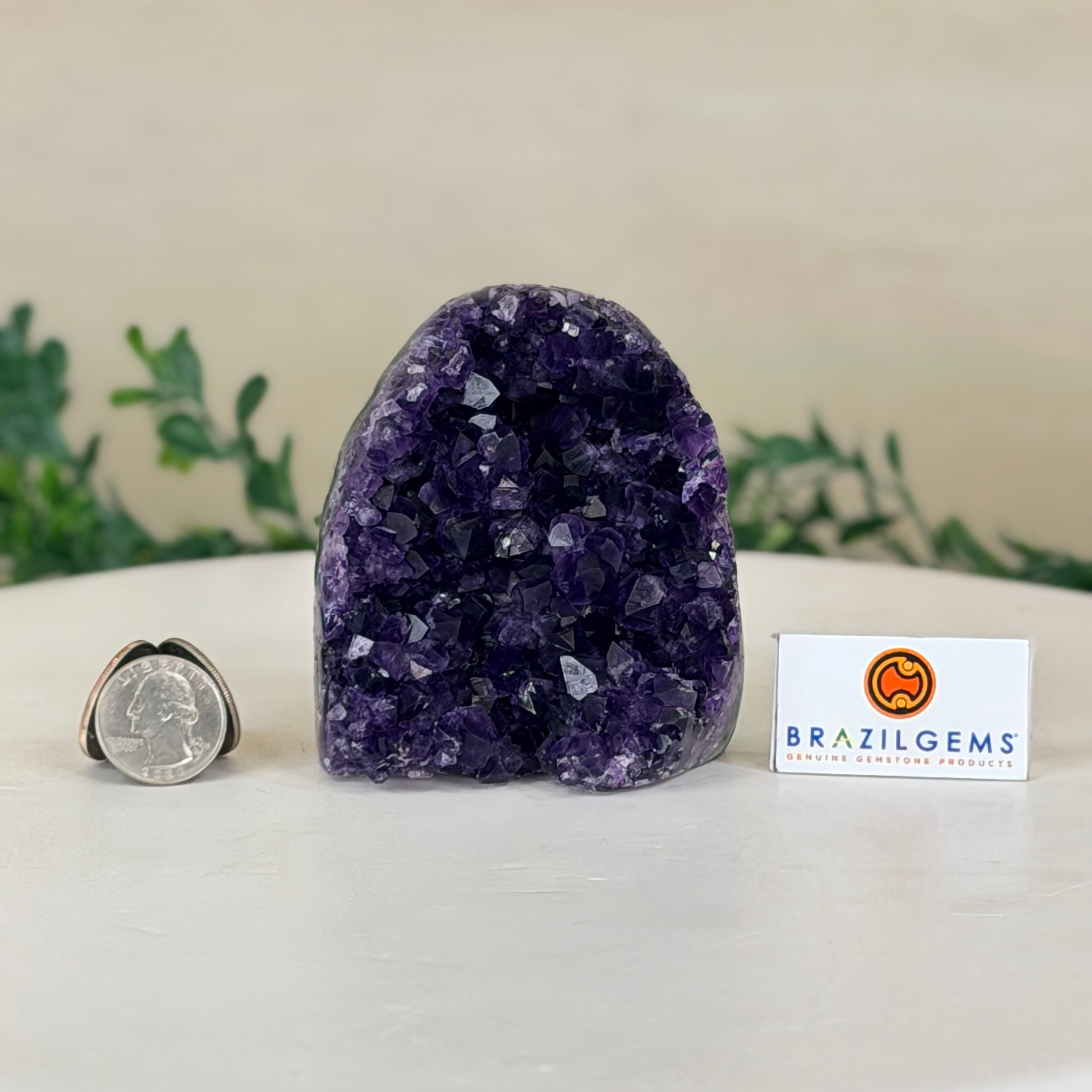 These clusters grow inside geodes–where mineral-rich water slowly deposits crystals over time. The result is a captivating arrangement of pointed amethyst crystals that can beautify any space.