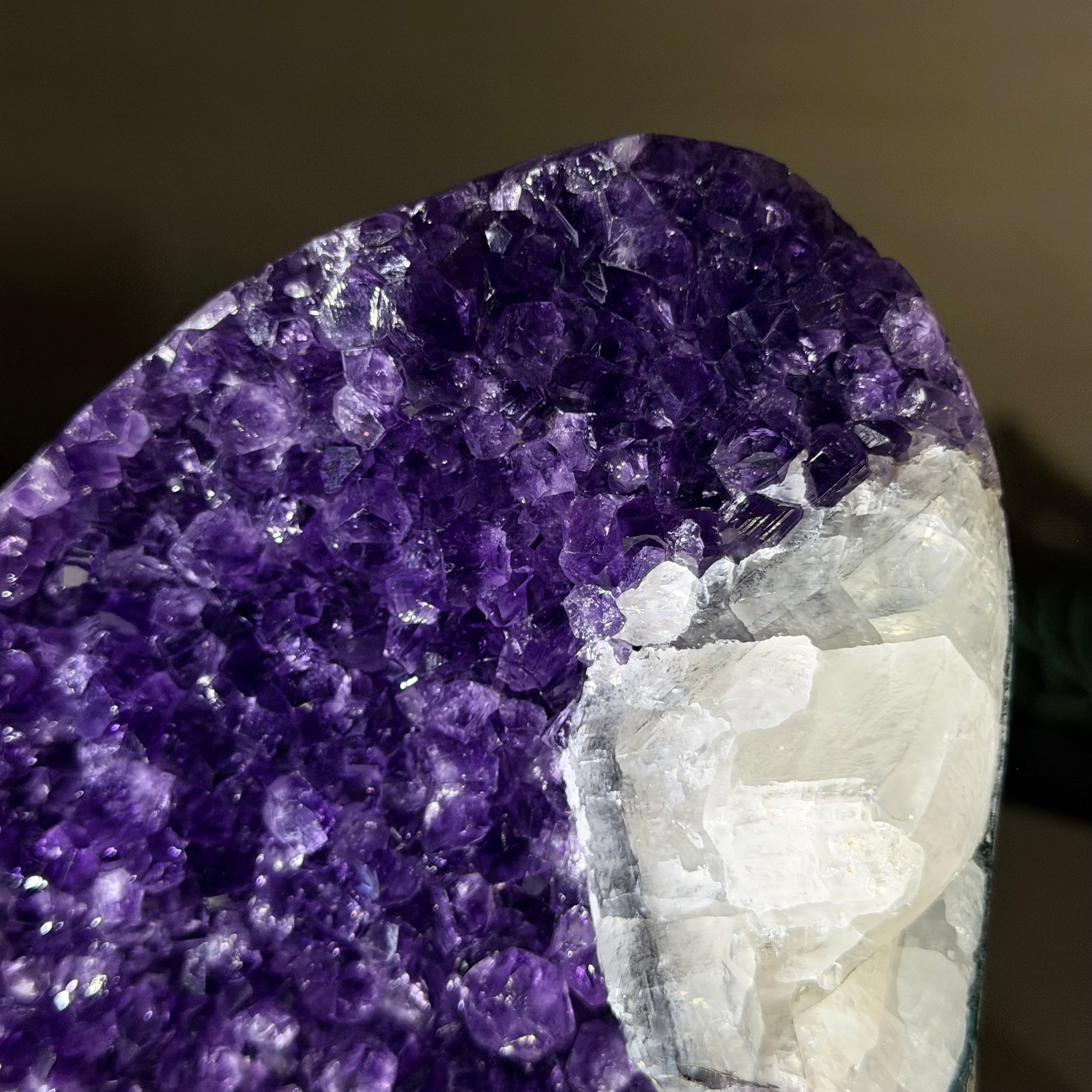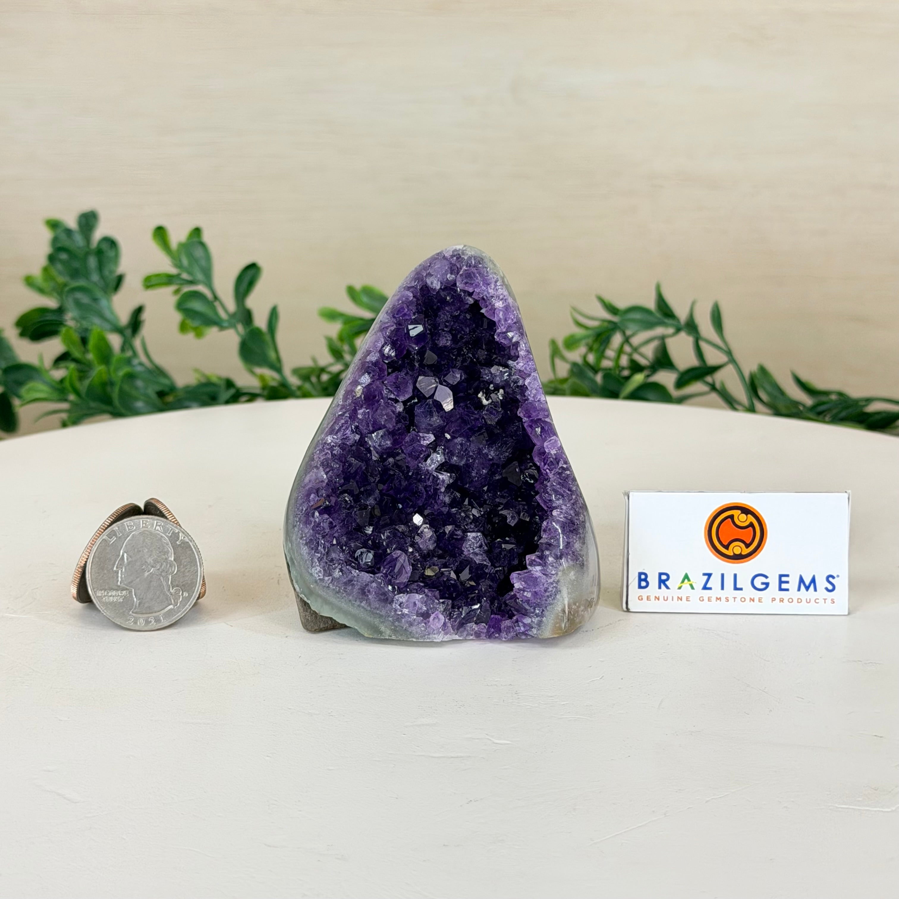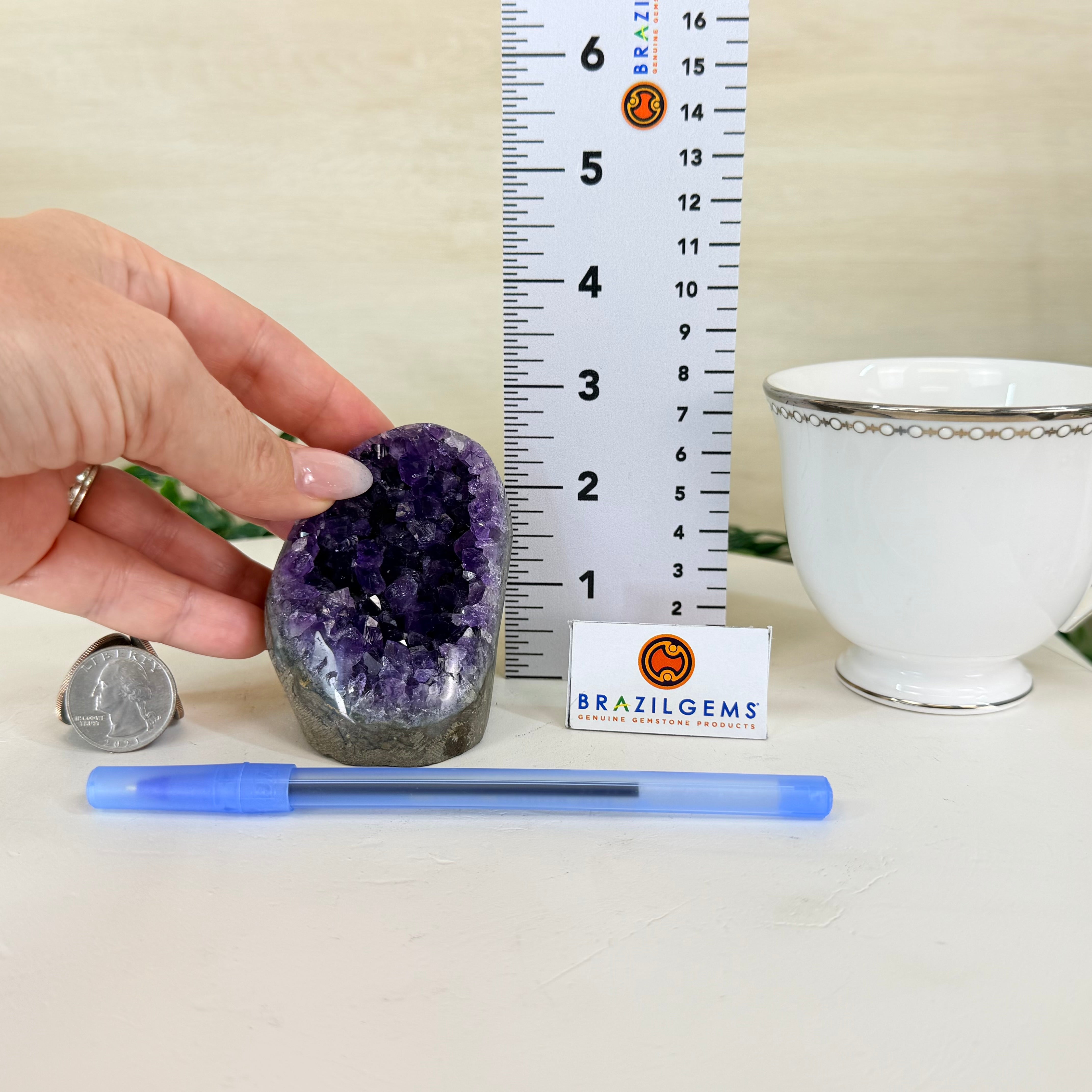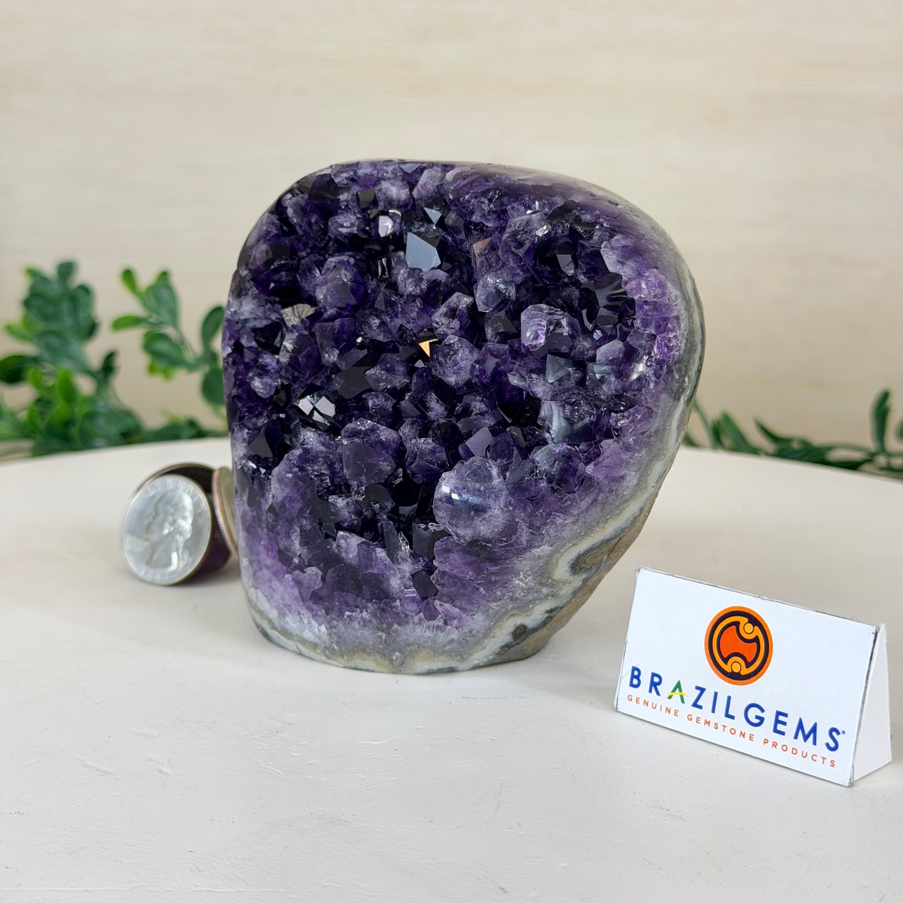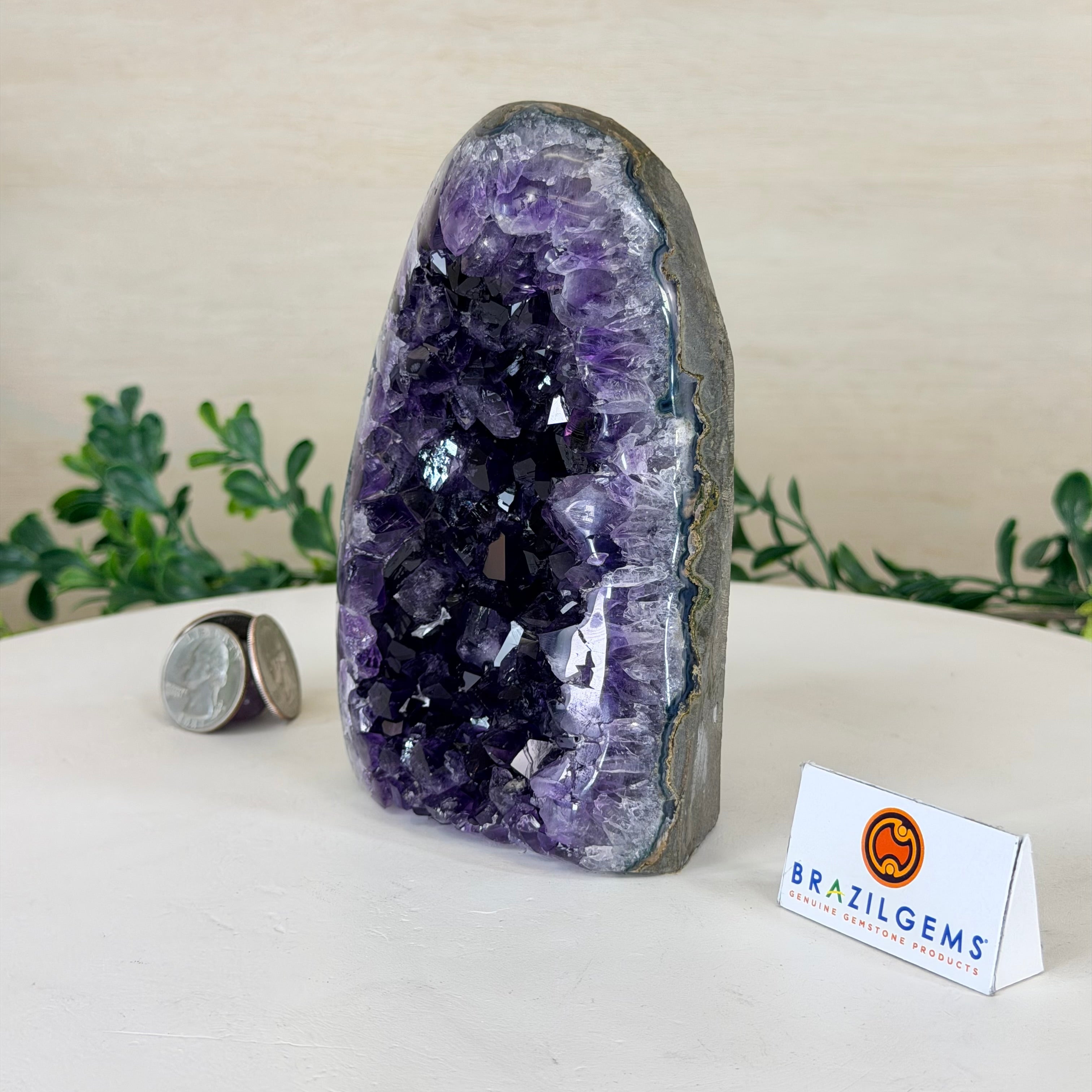 These clusters grow inside geodes–where mineral-rich water slowly deposits crystals over time. The result is a captivating arrangement of pointed amethyst crystals that can beautify any space.