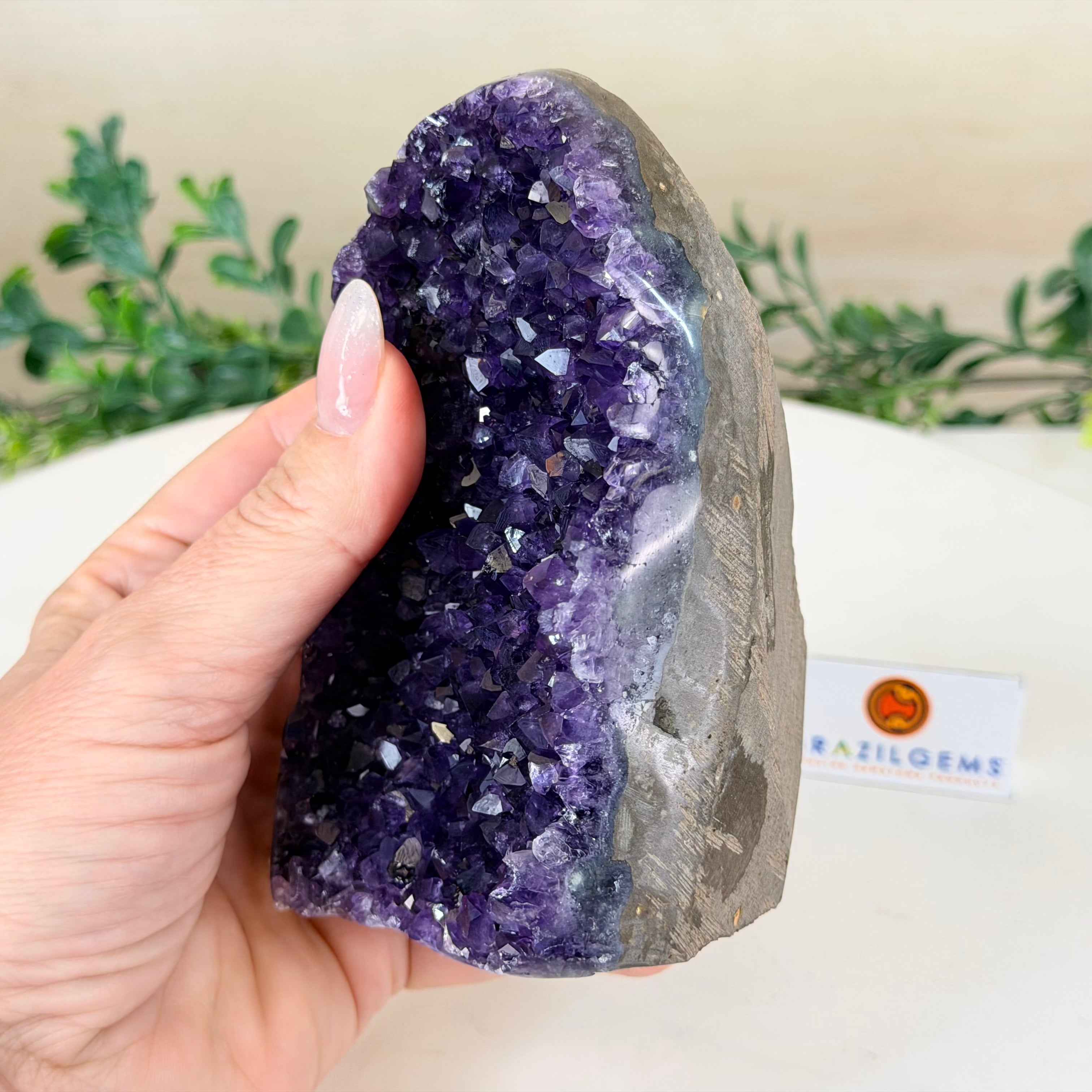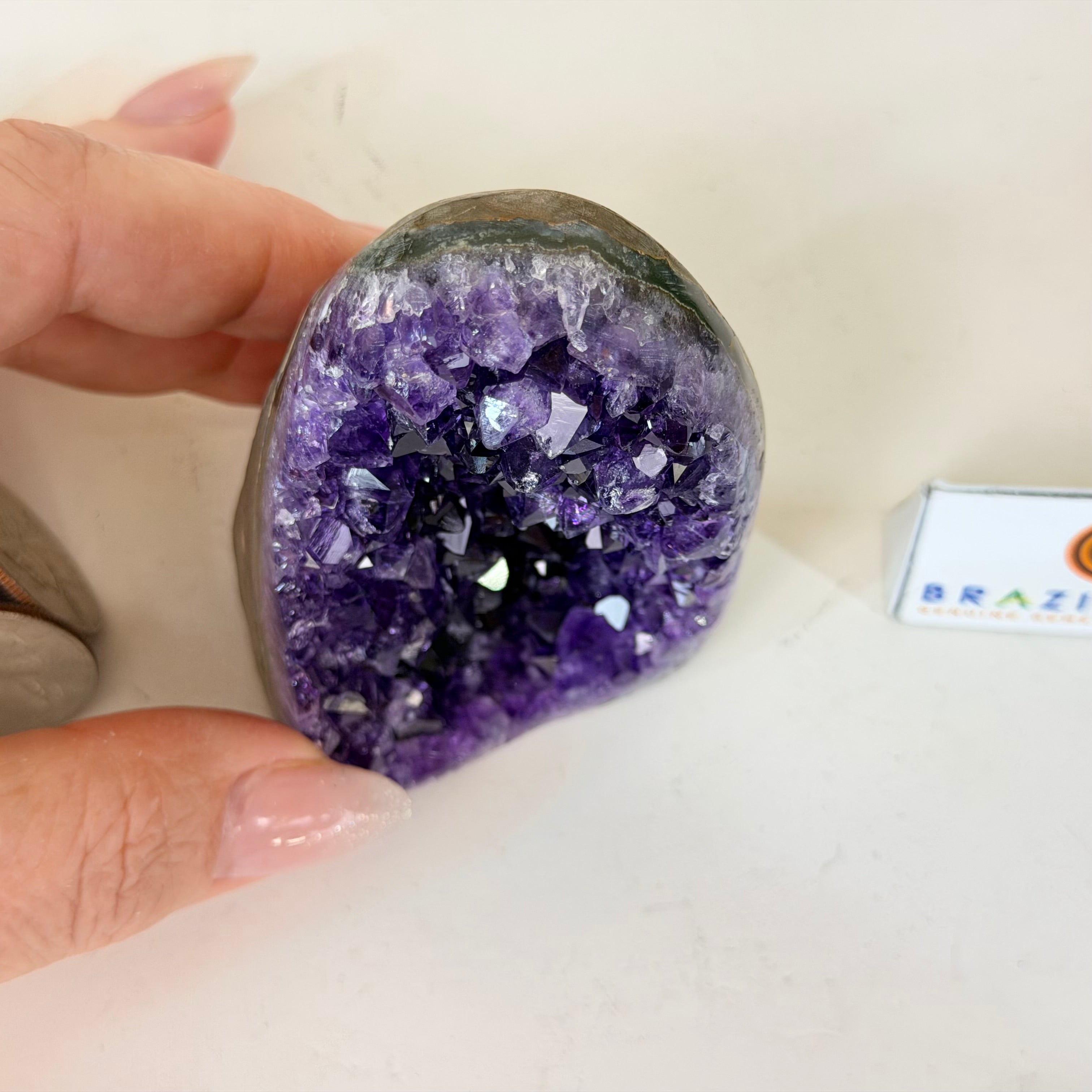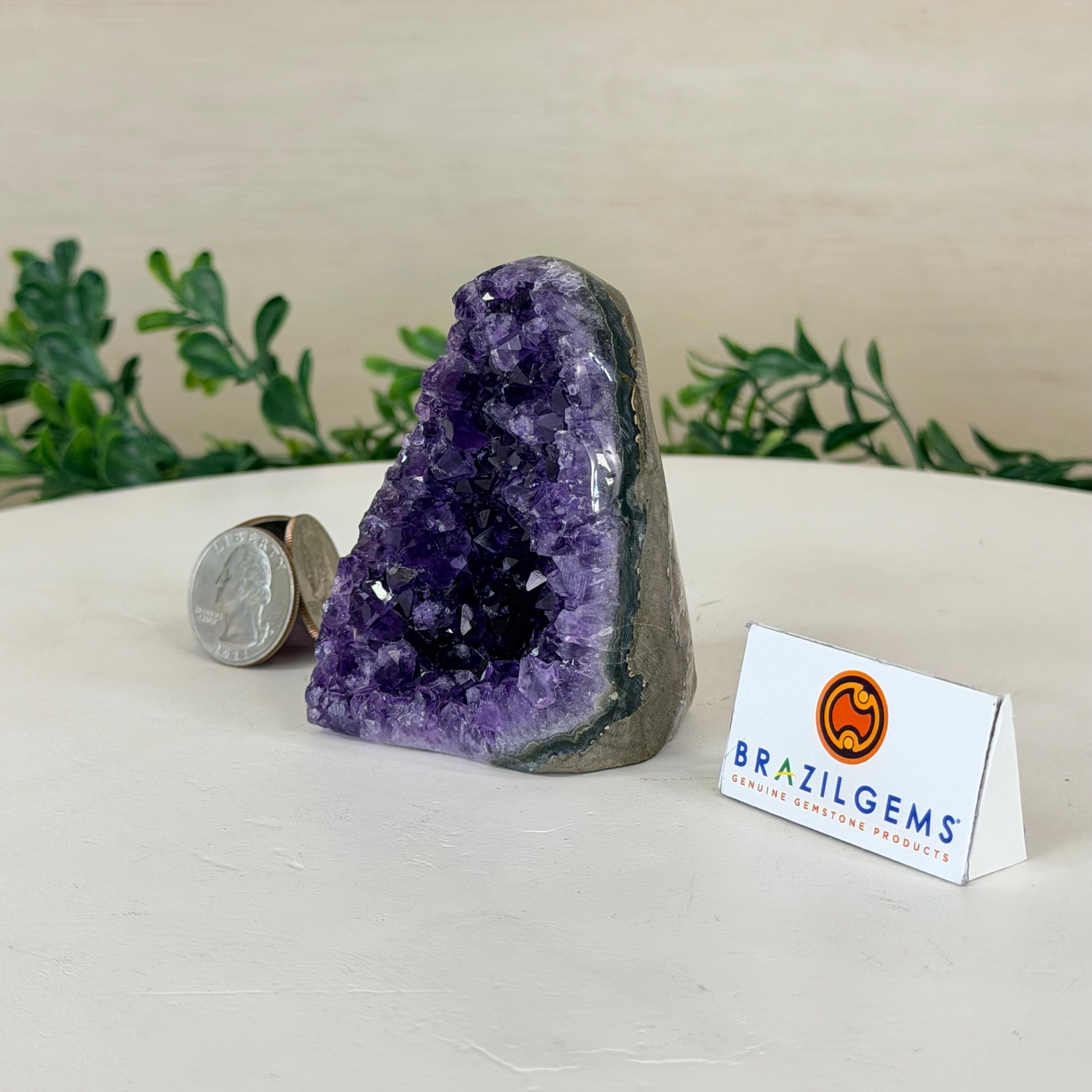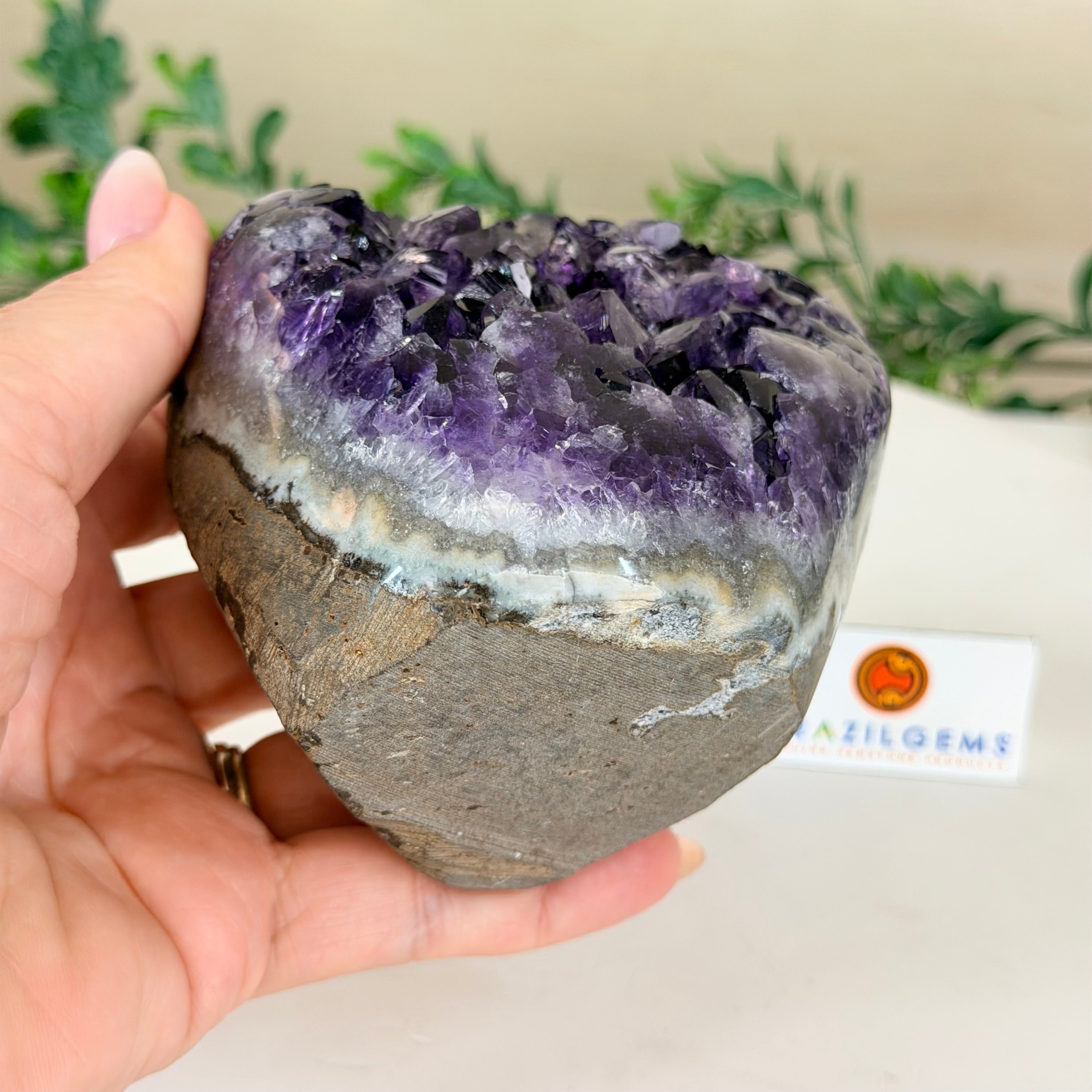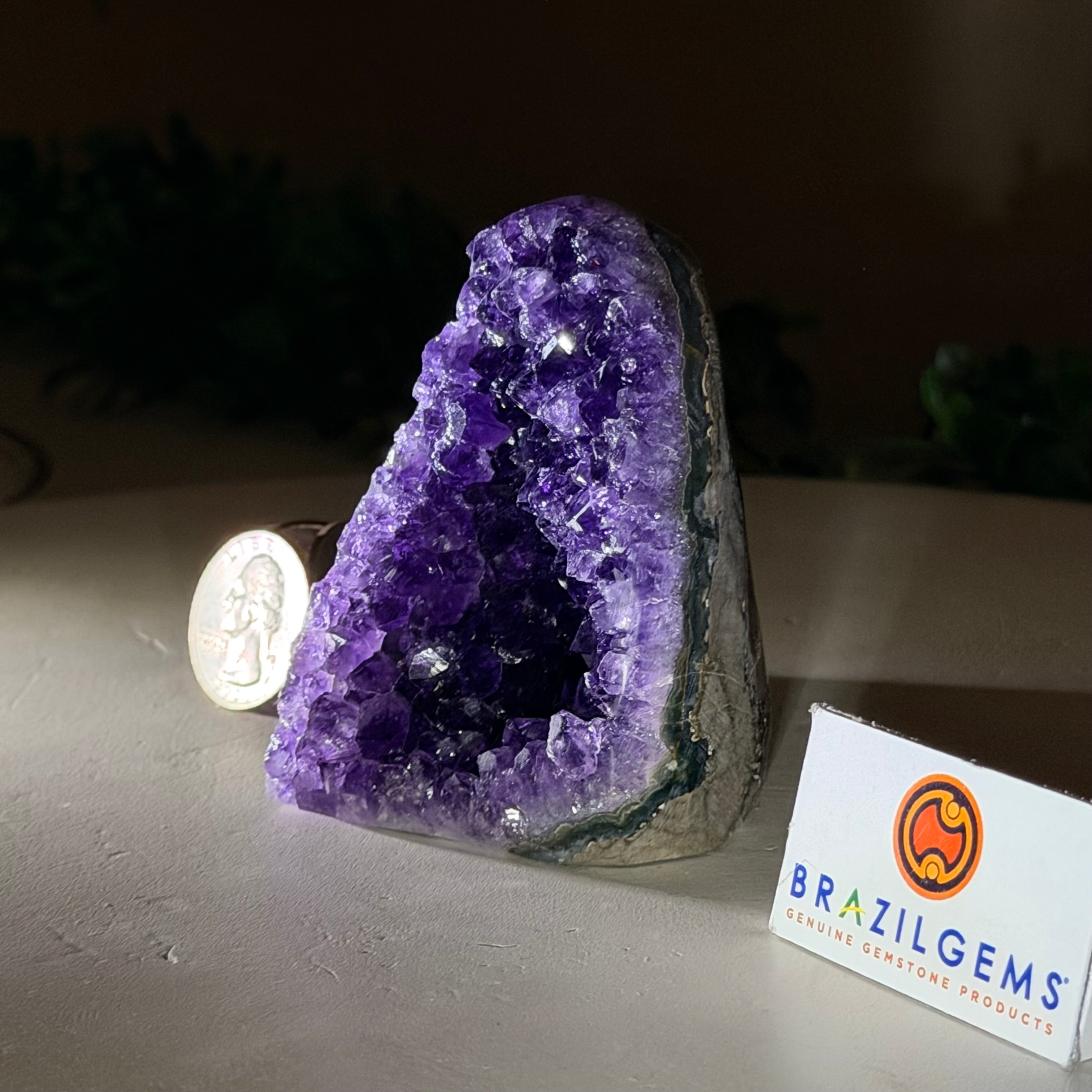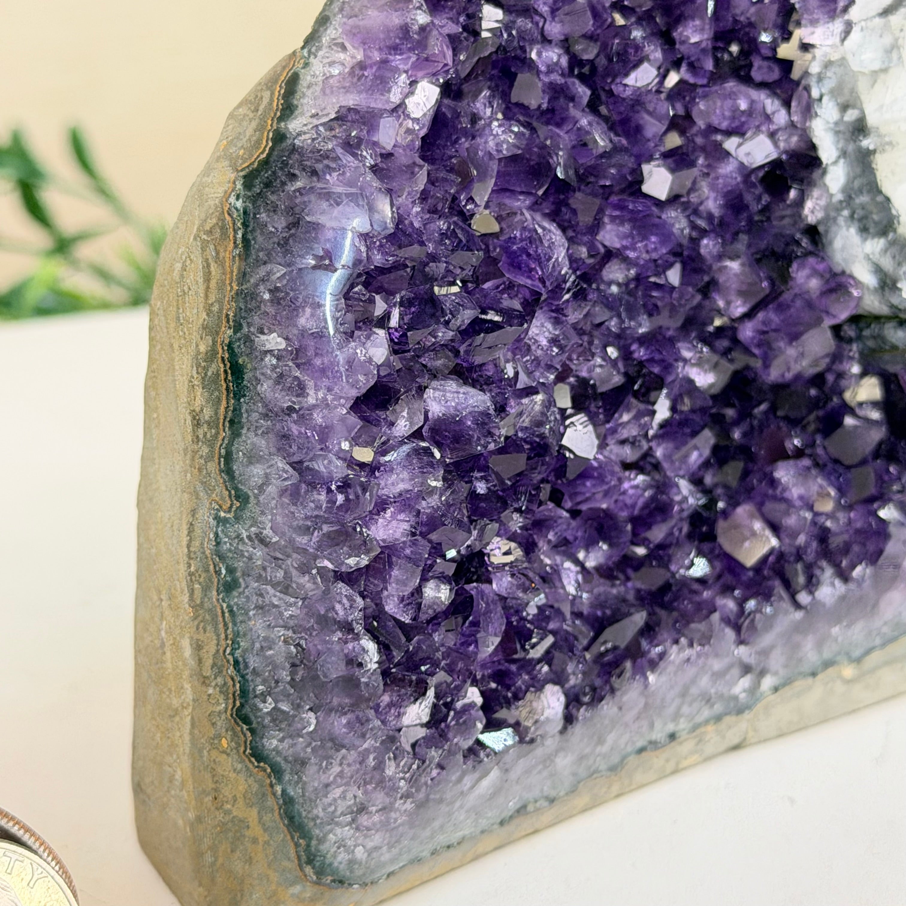 These clusters grow inside geodes–where mineral-rich water slowly deposits crystals over time. The result is a captivating arrangement of pointed amethyst crystals that can beautify any space.