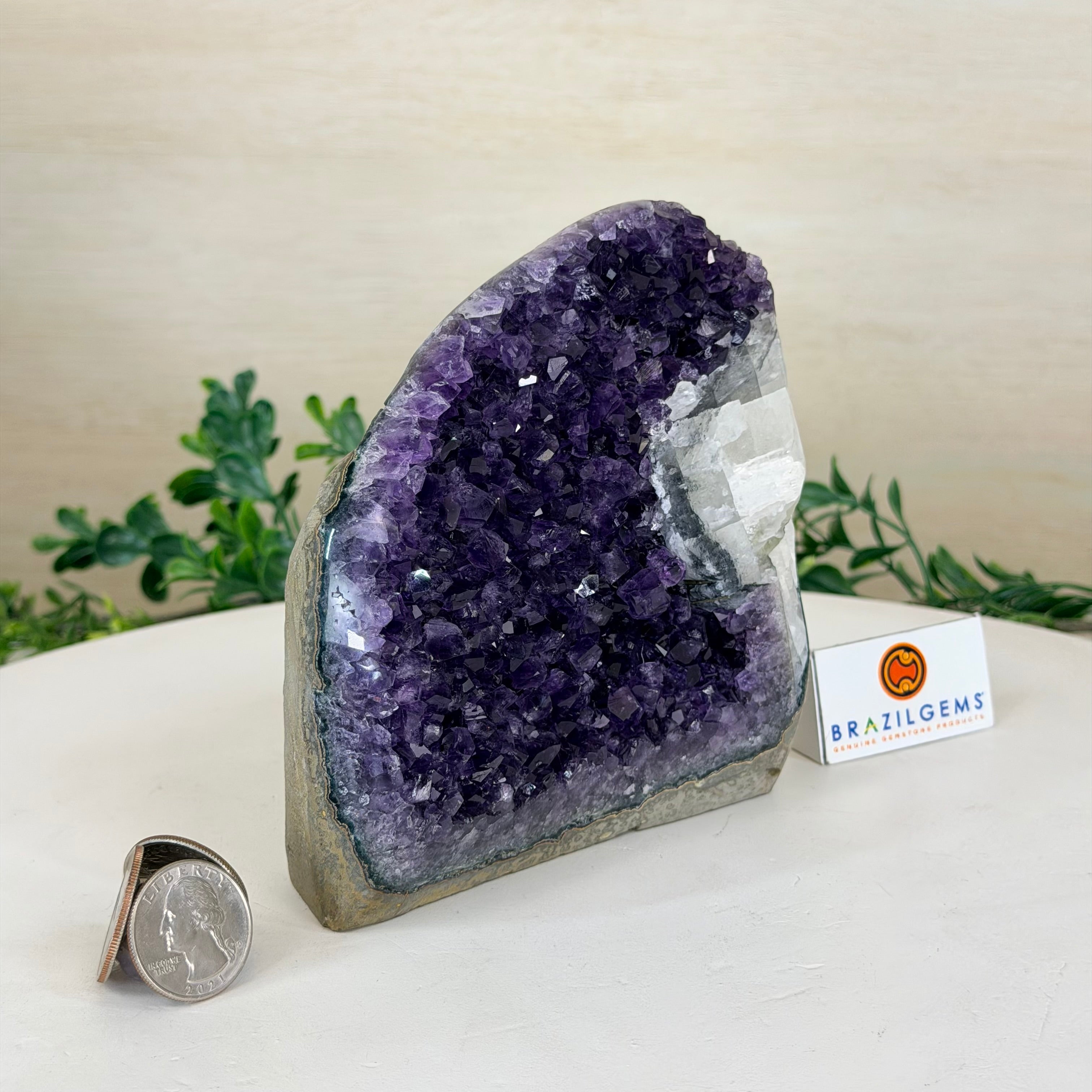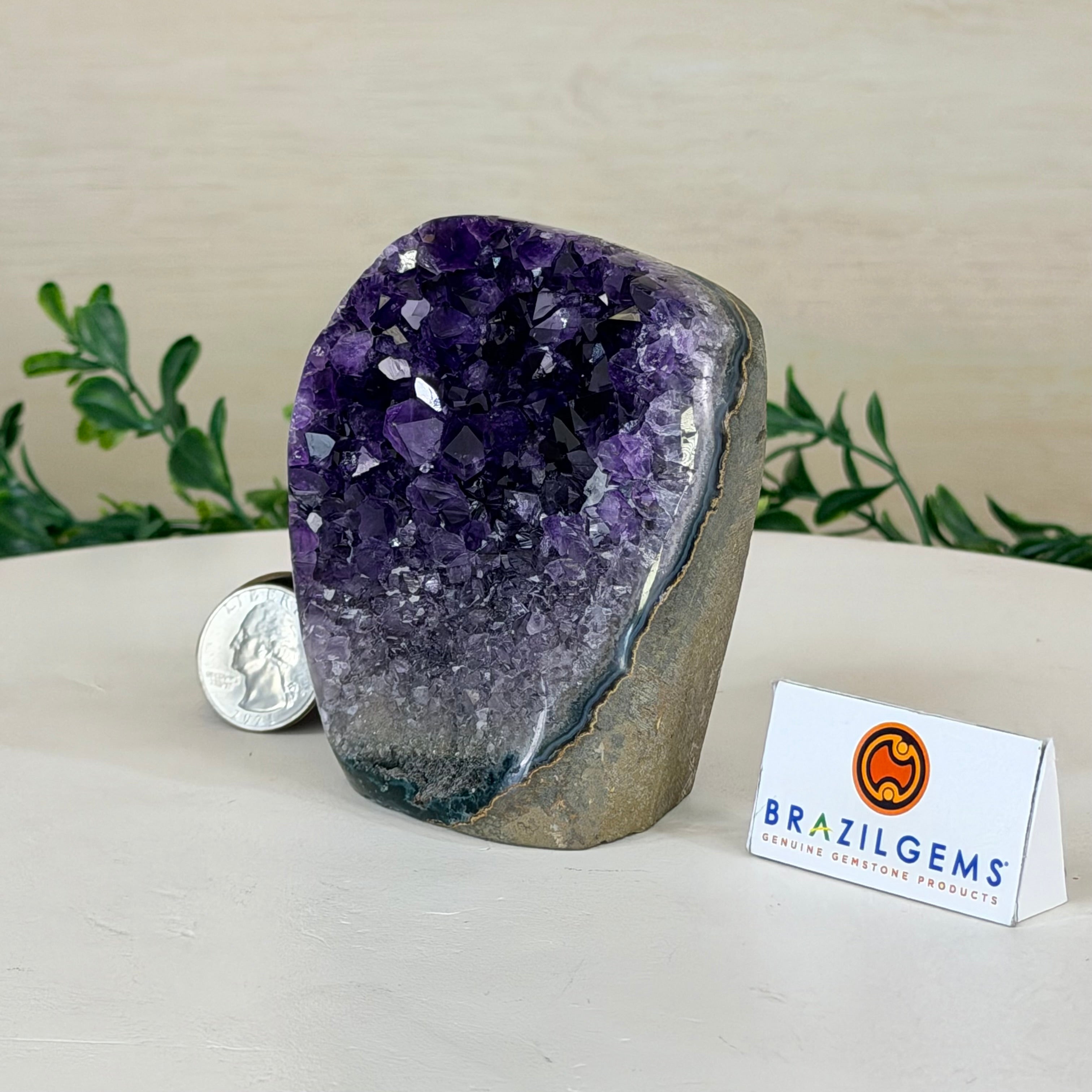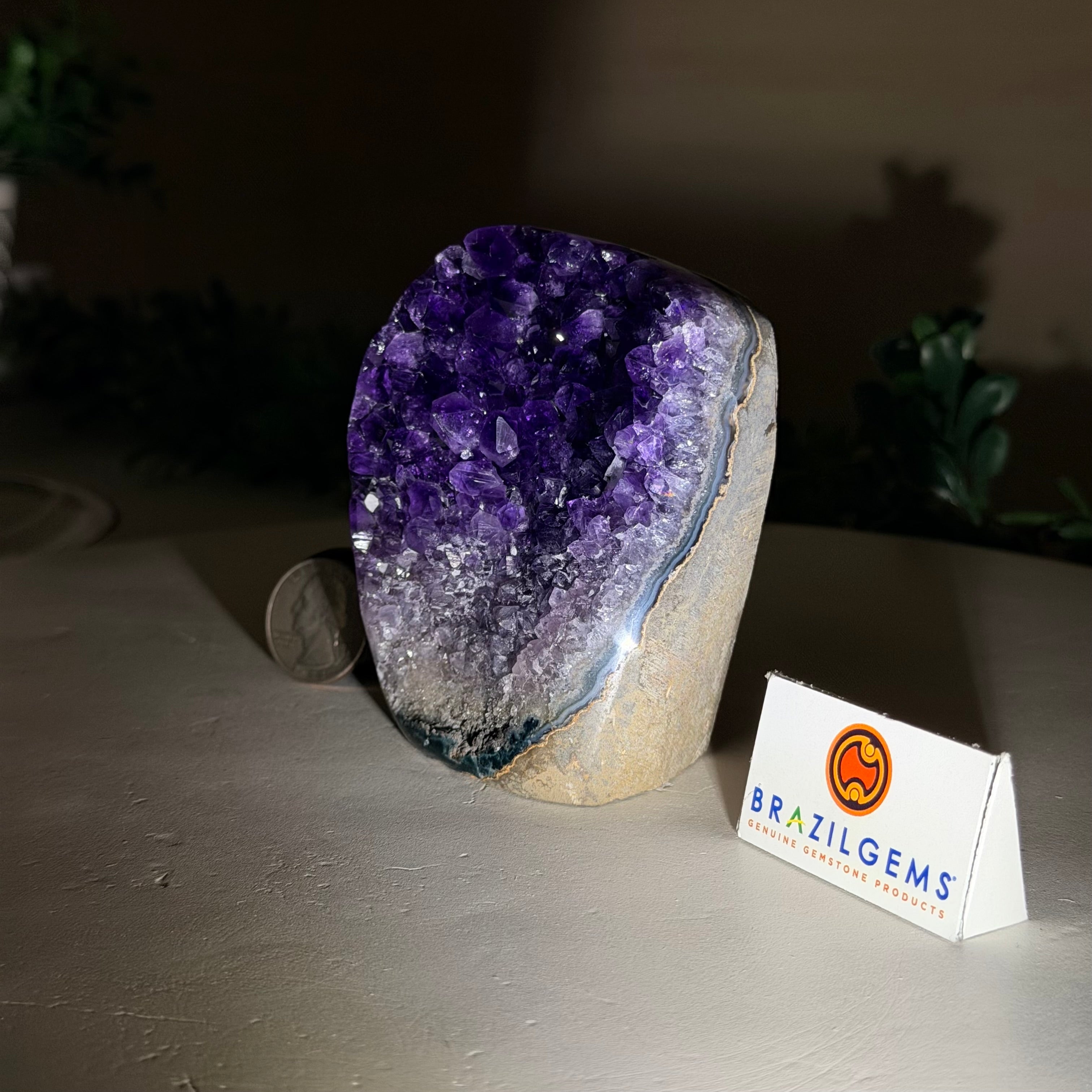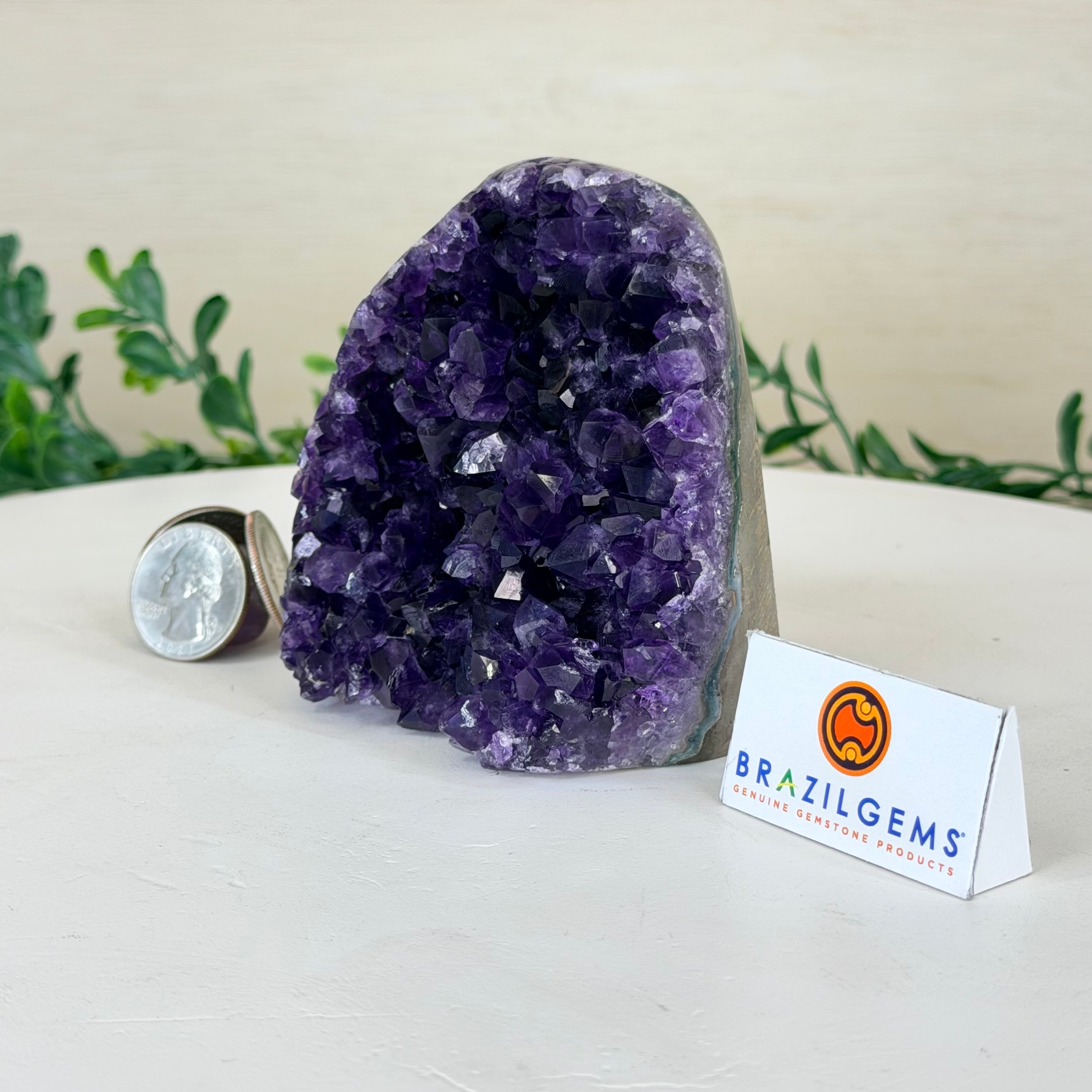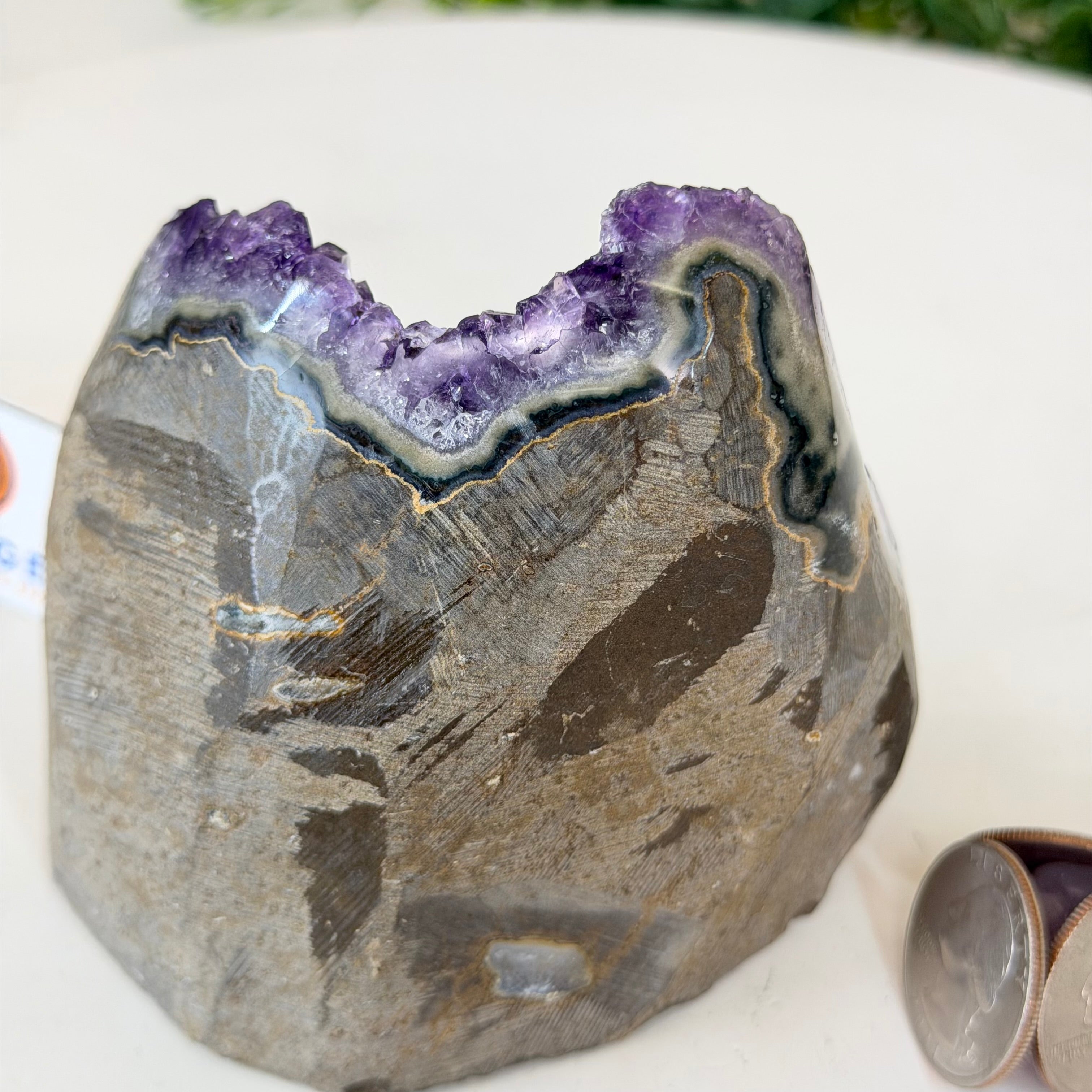 These clusters grow inside geodes–where mineral-rich water slowly deposits crystals over time. The result is a captivating arrangement of pointed amethyst crystals that can beautify any space.